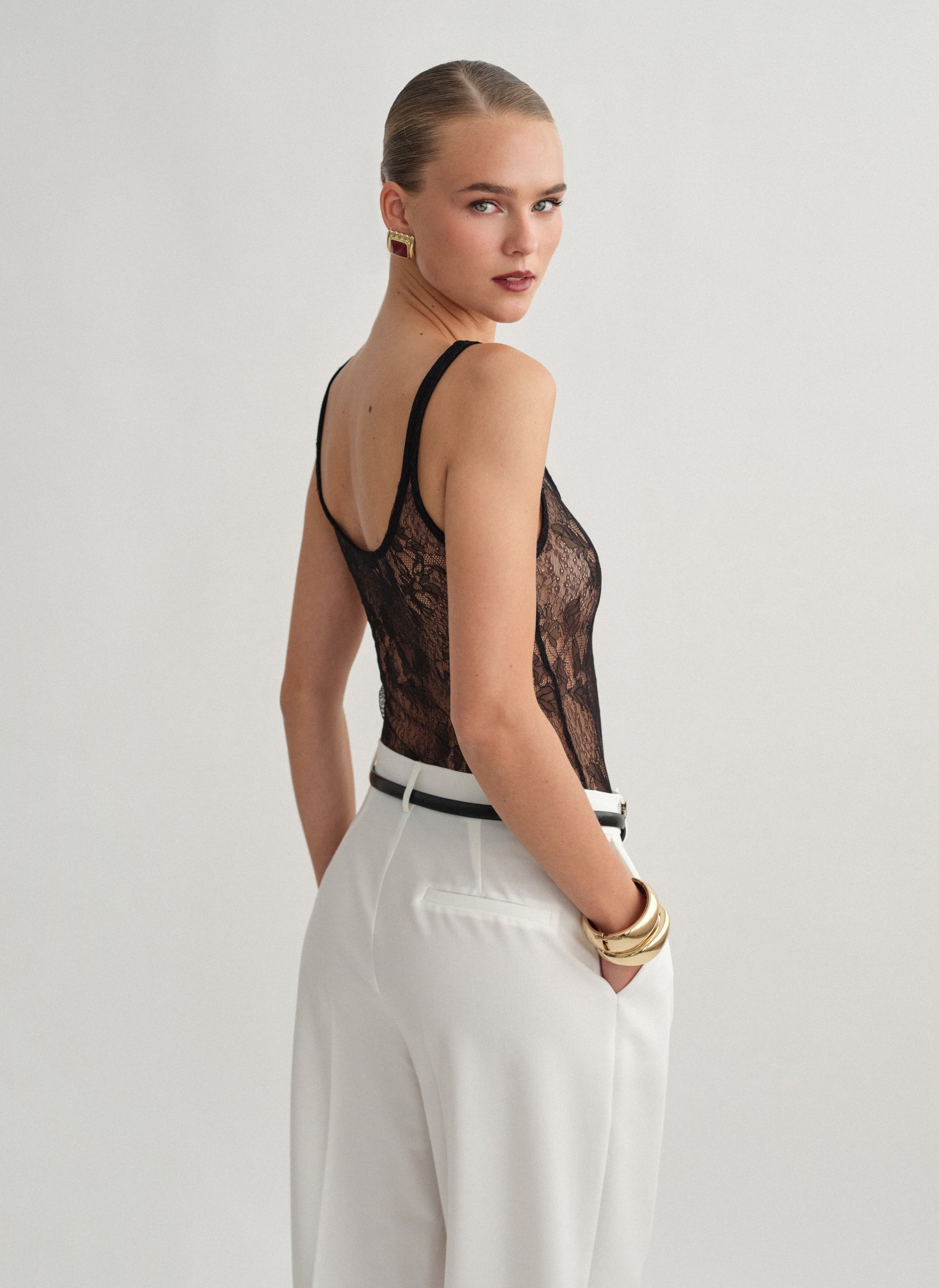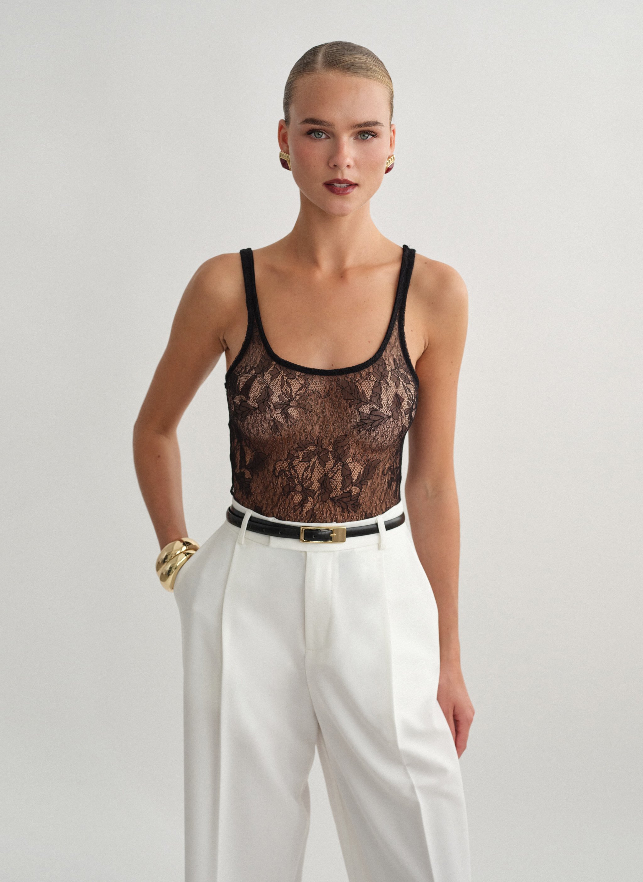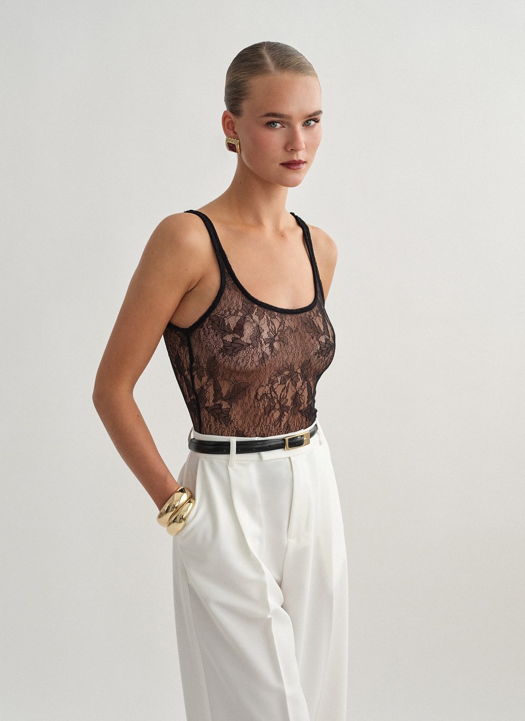 Ελαστική αμάνικη μπλούζα με δαντέλα και στρογγυλή λαιμόκοψη.