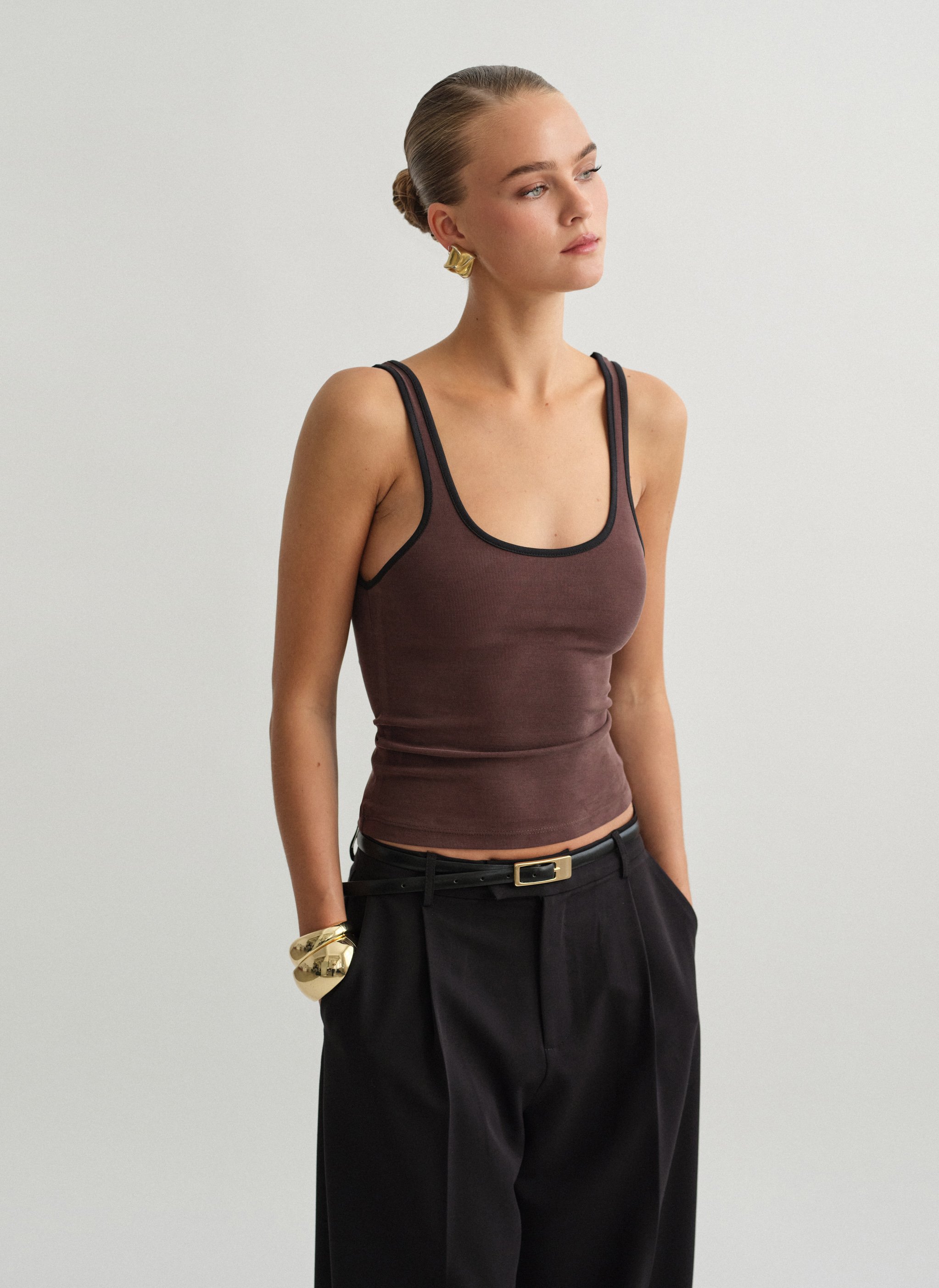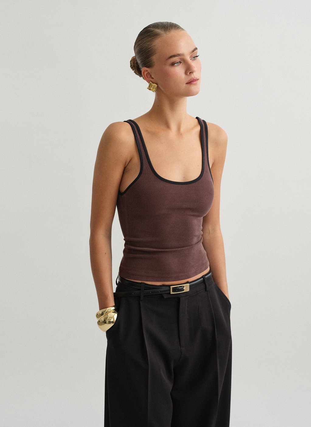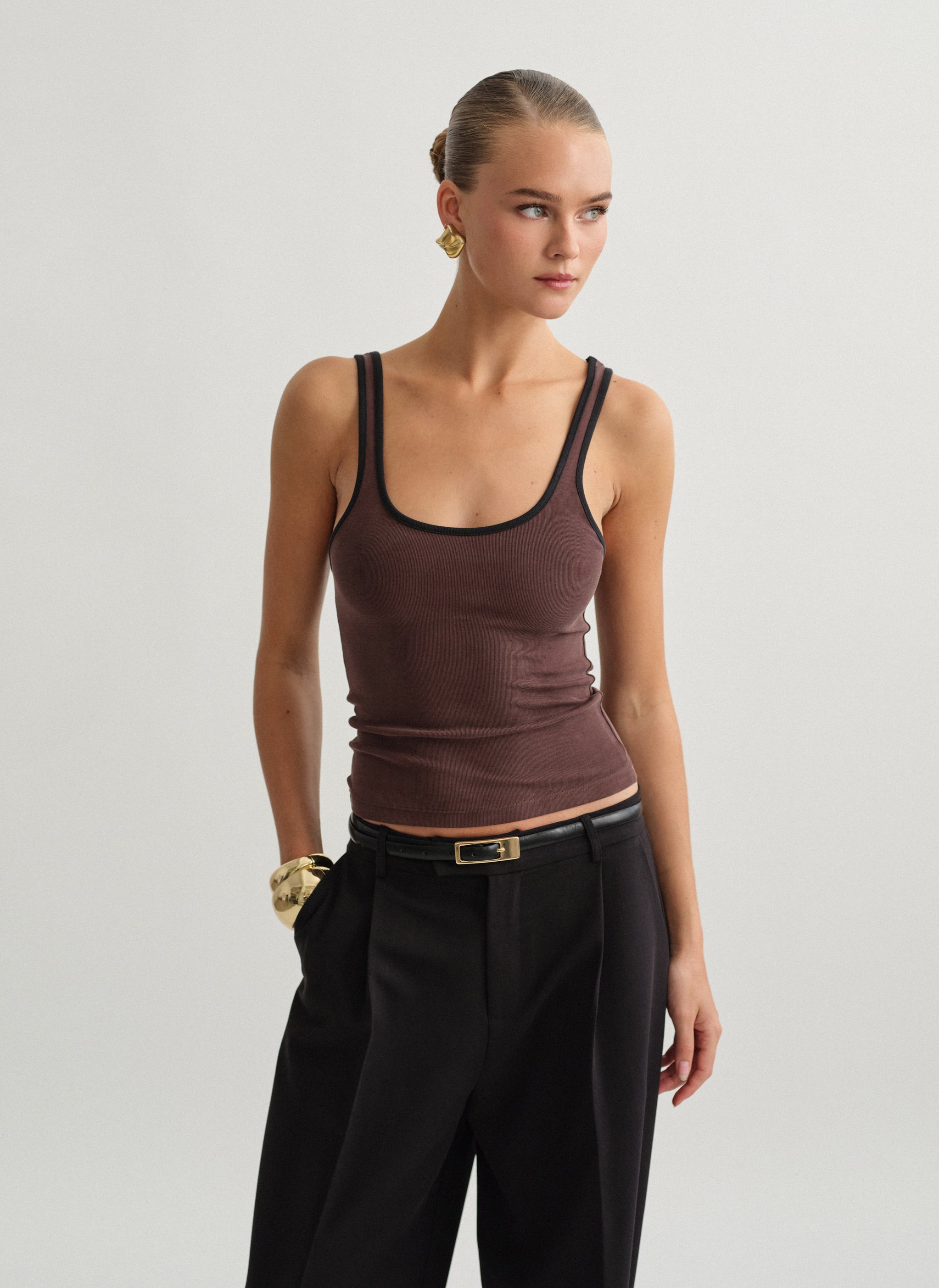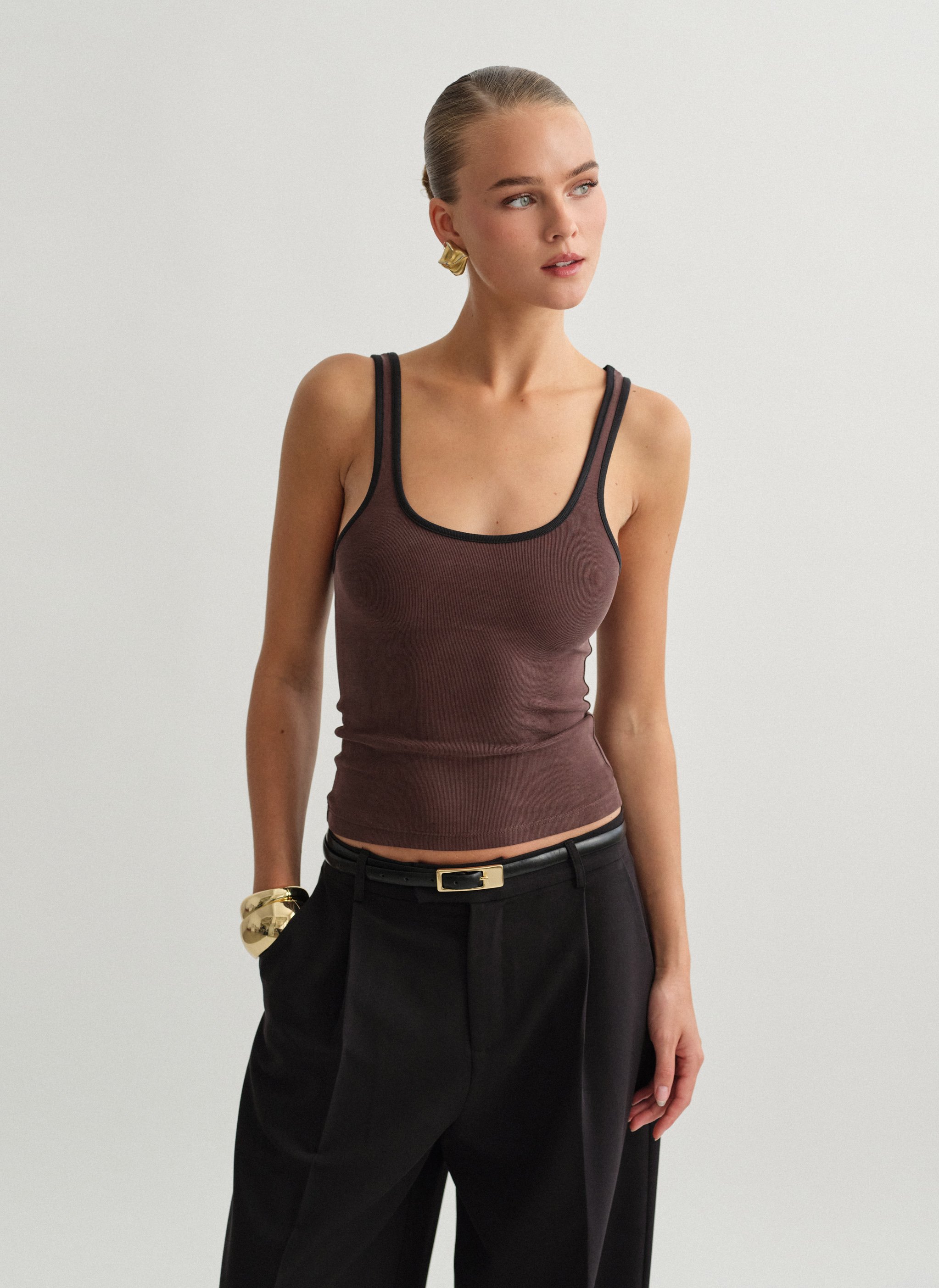 Ελαστικό αμάνικο ριπ τοπ με χρωματική αντίθεση στην λαιμόκοψη.
