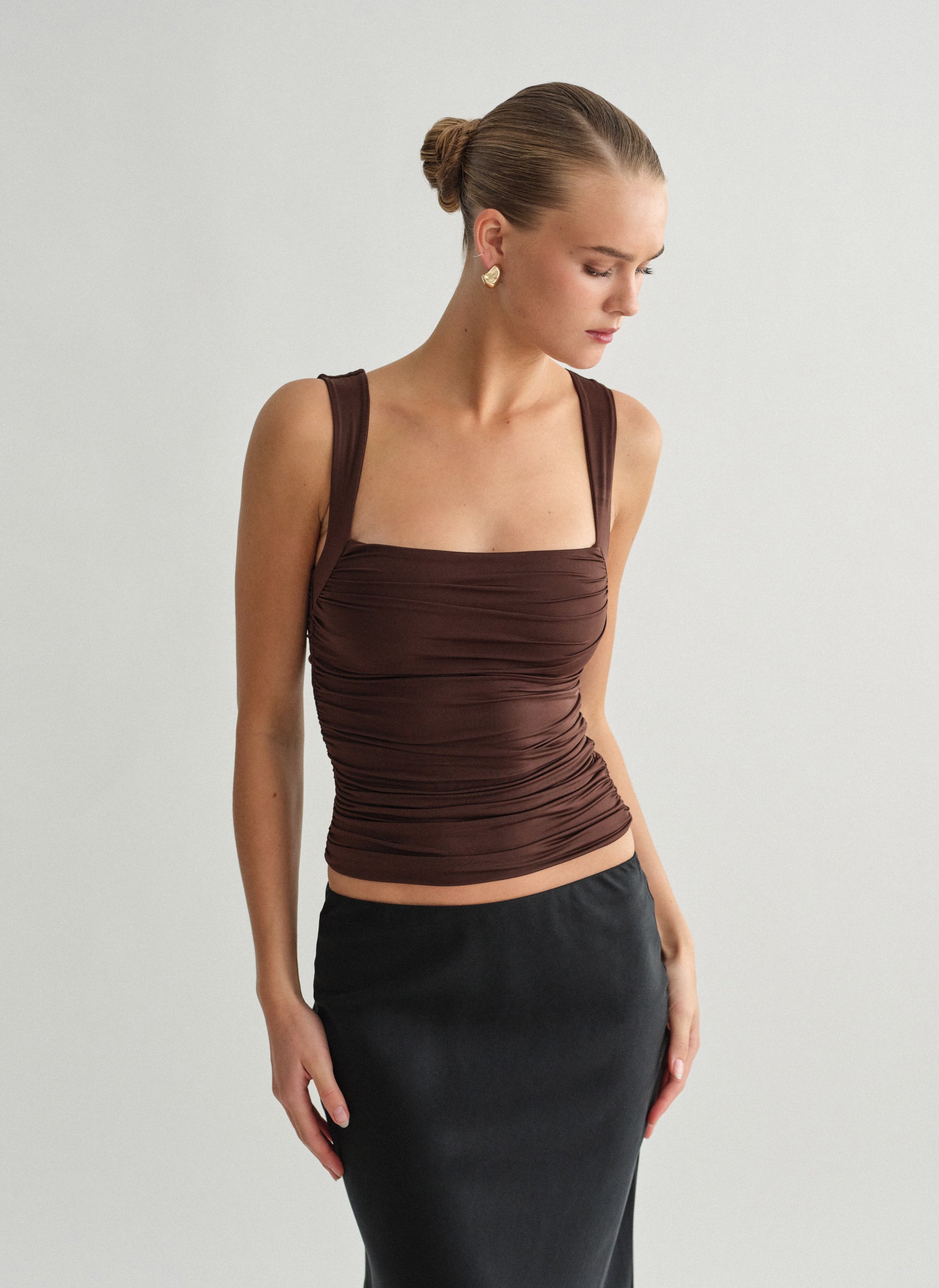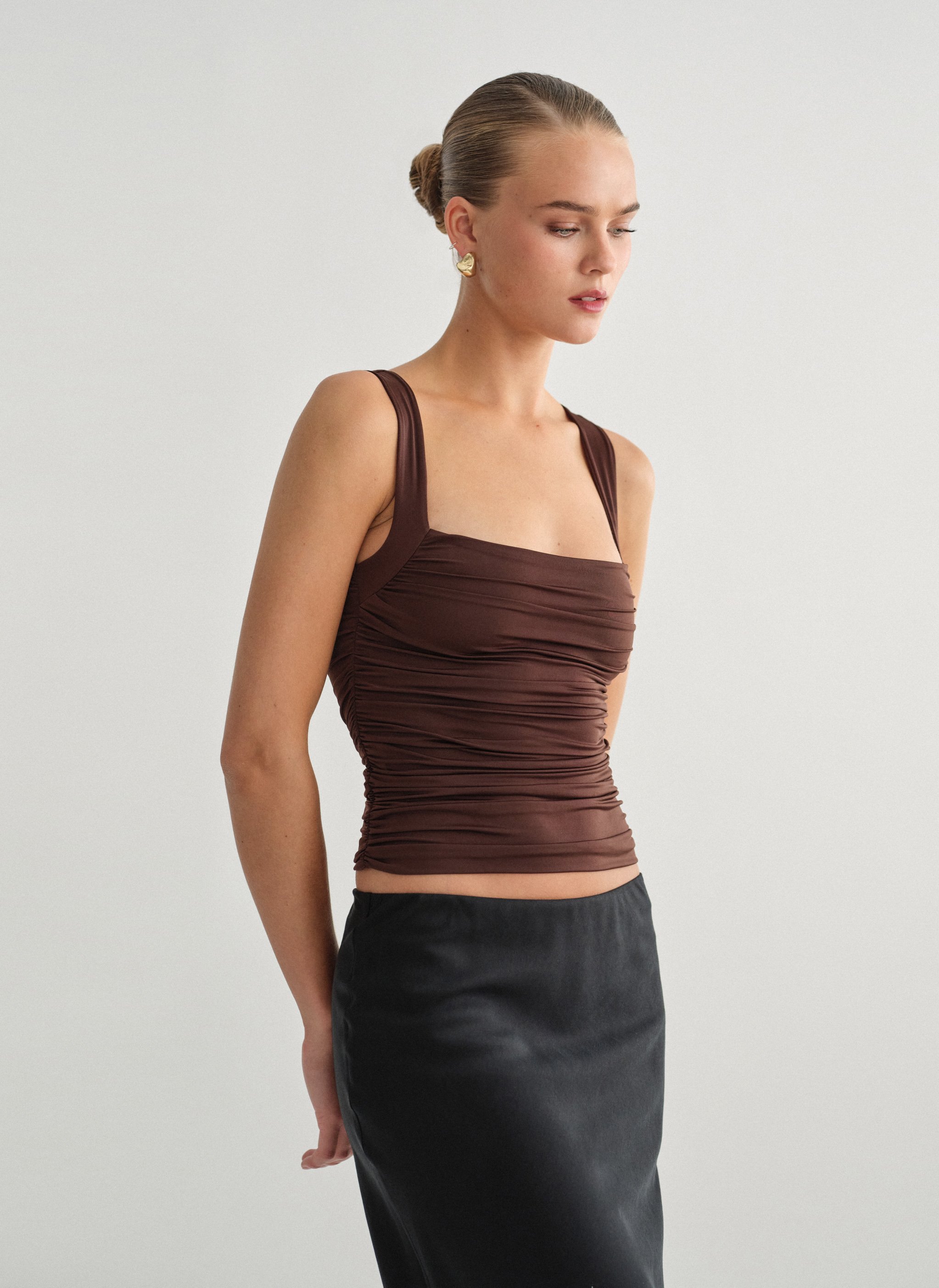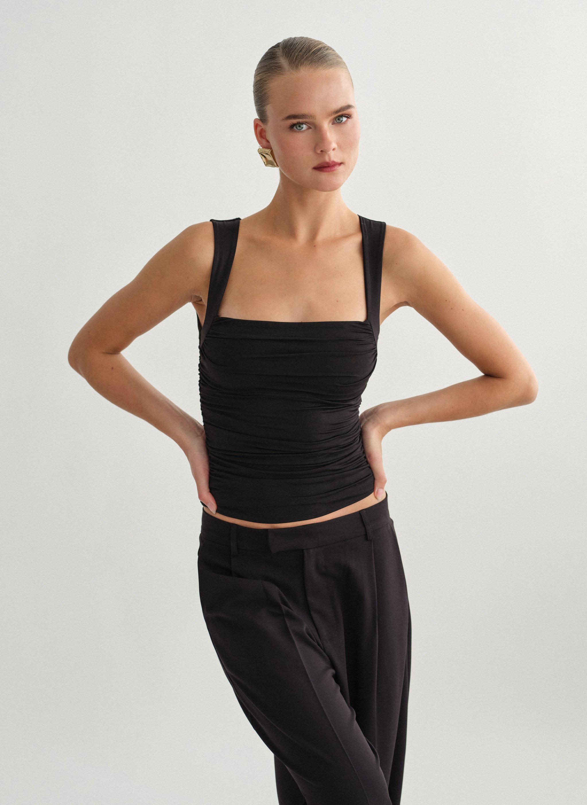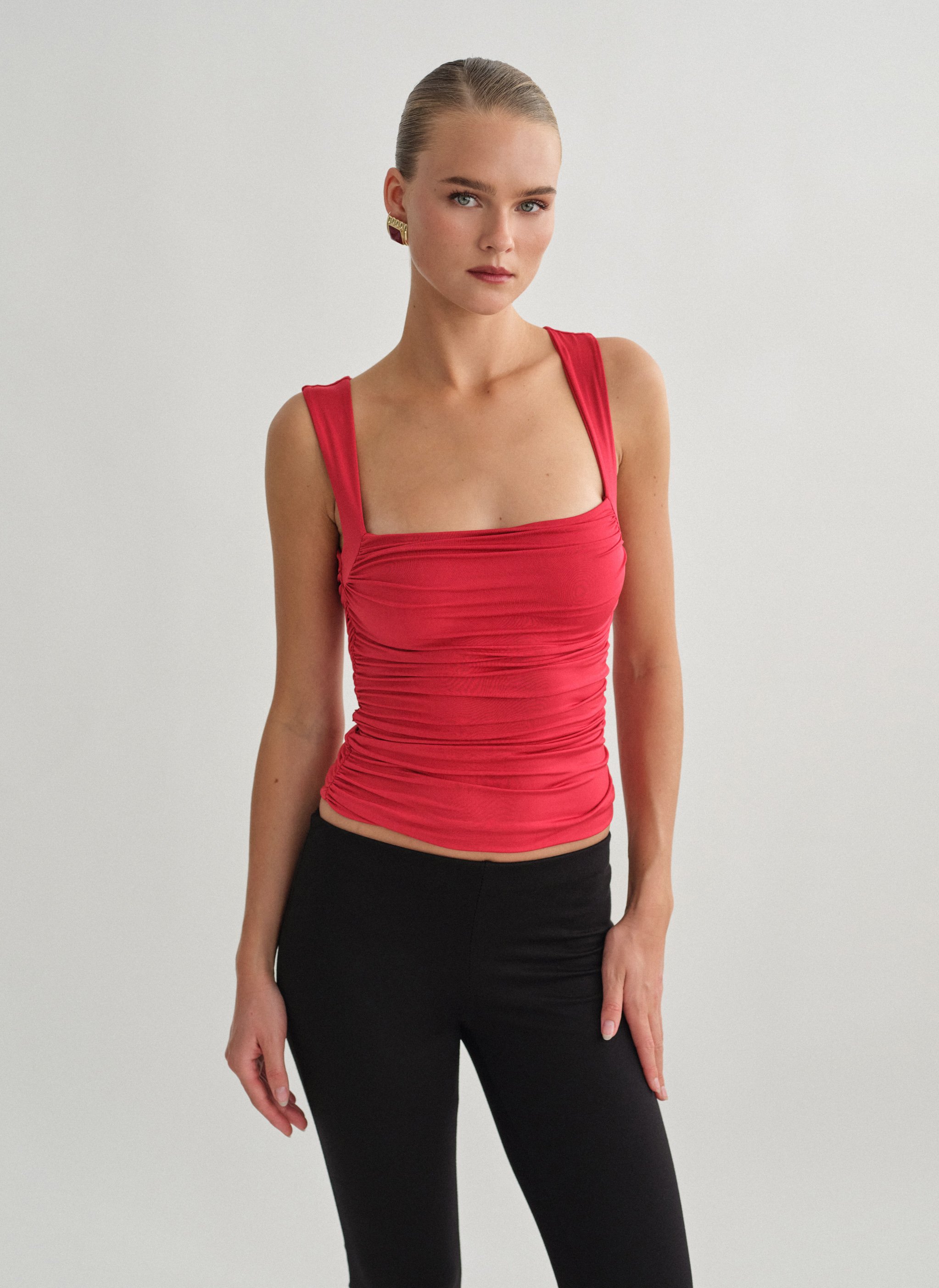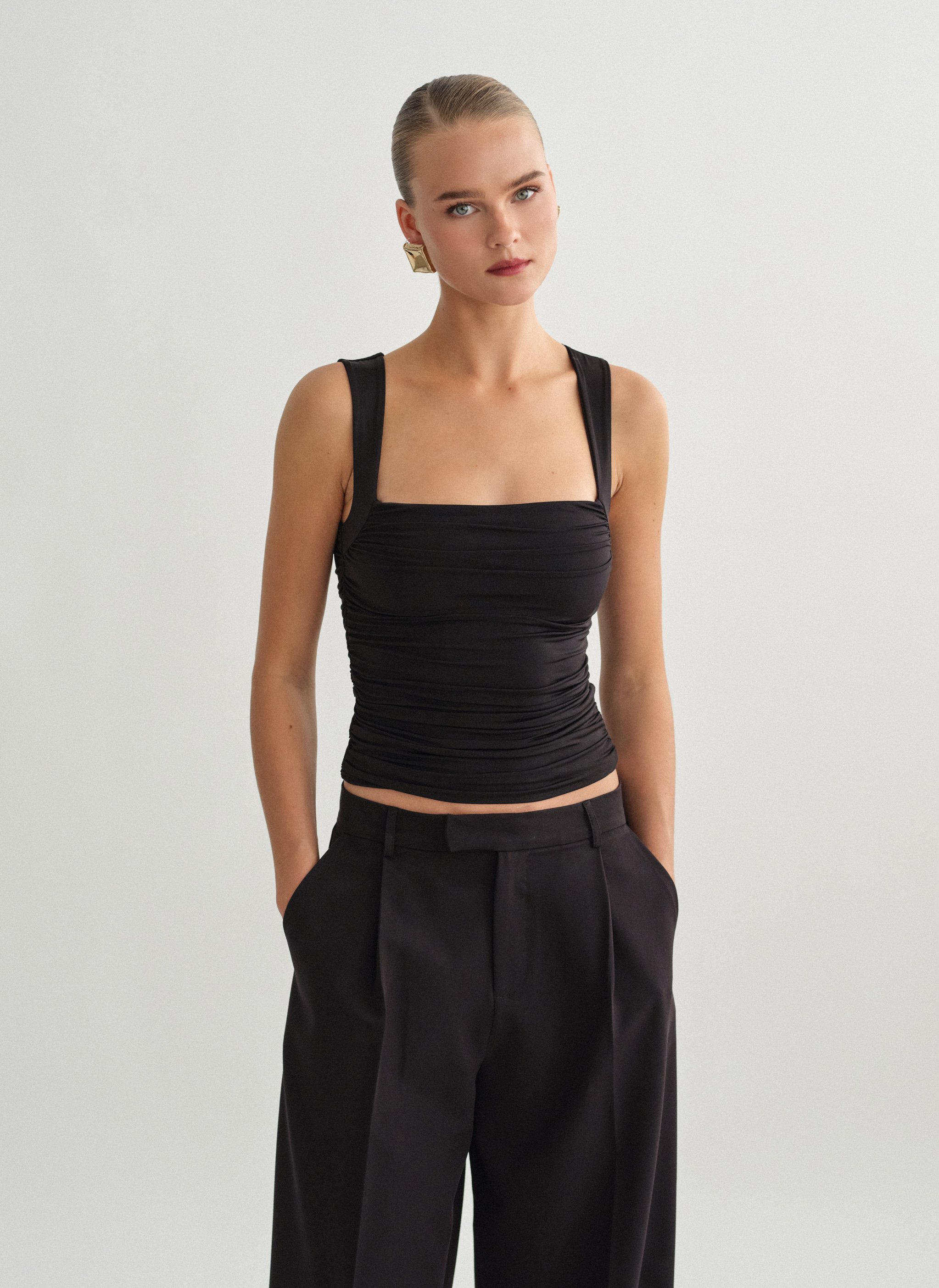 Ελαστικό αμάνικο τοπ με σούρες και τετράγωνο ντεκολτέ.