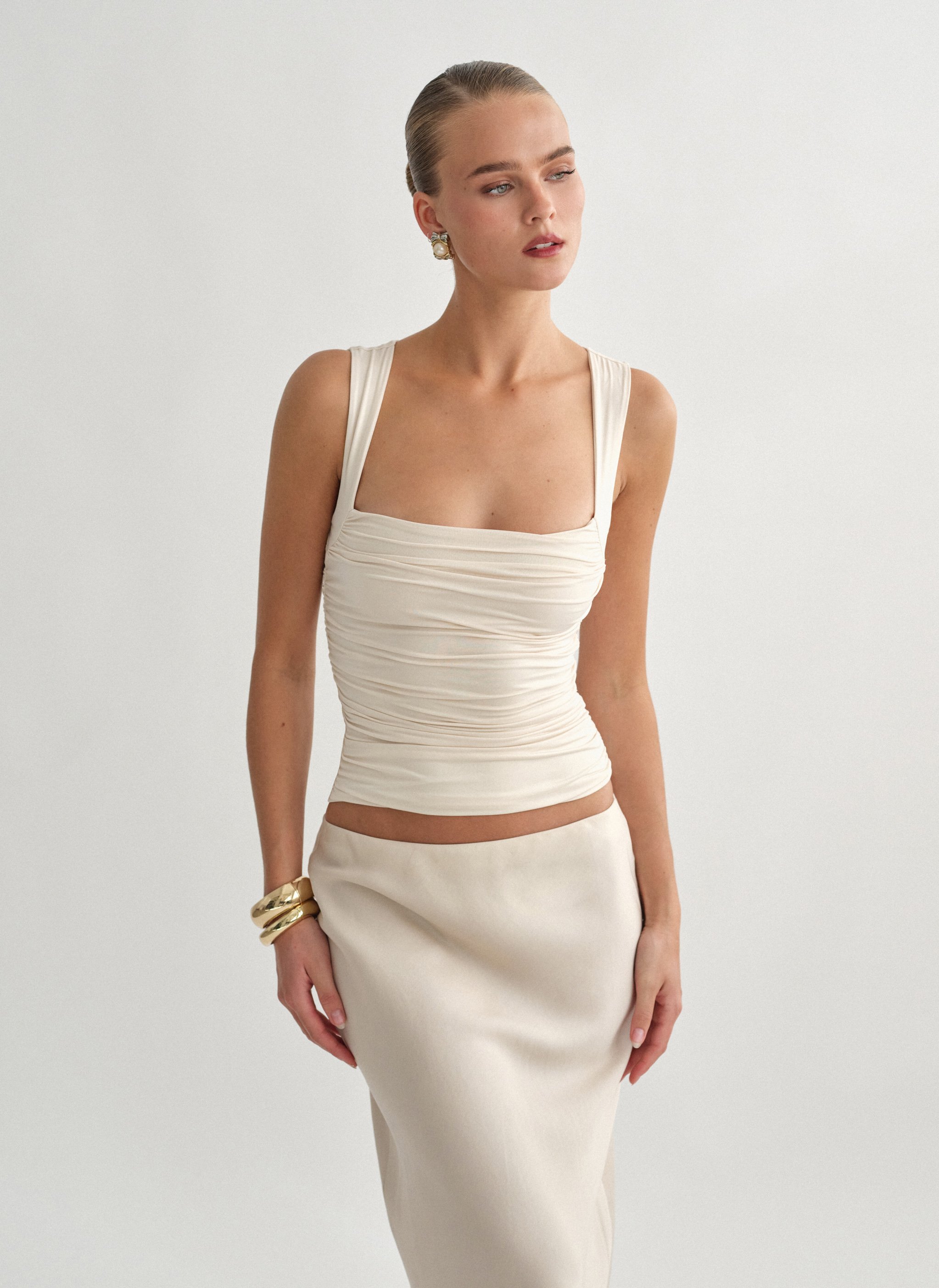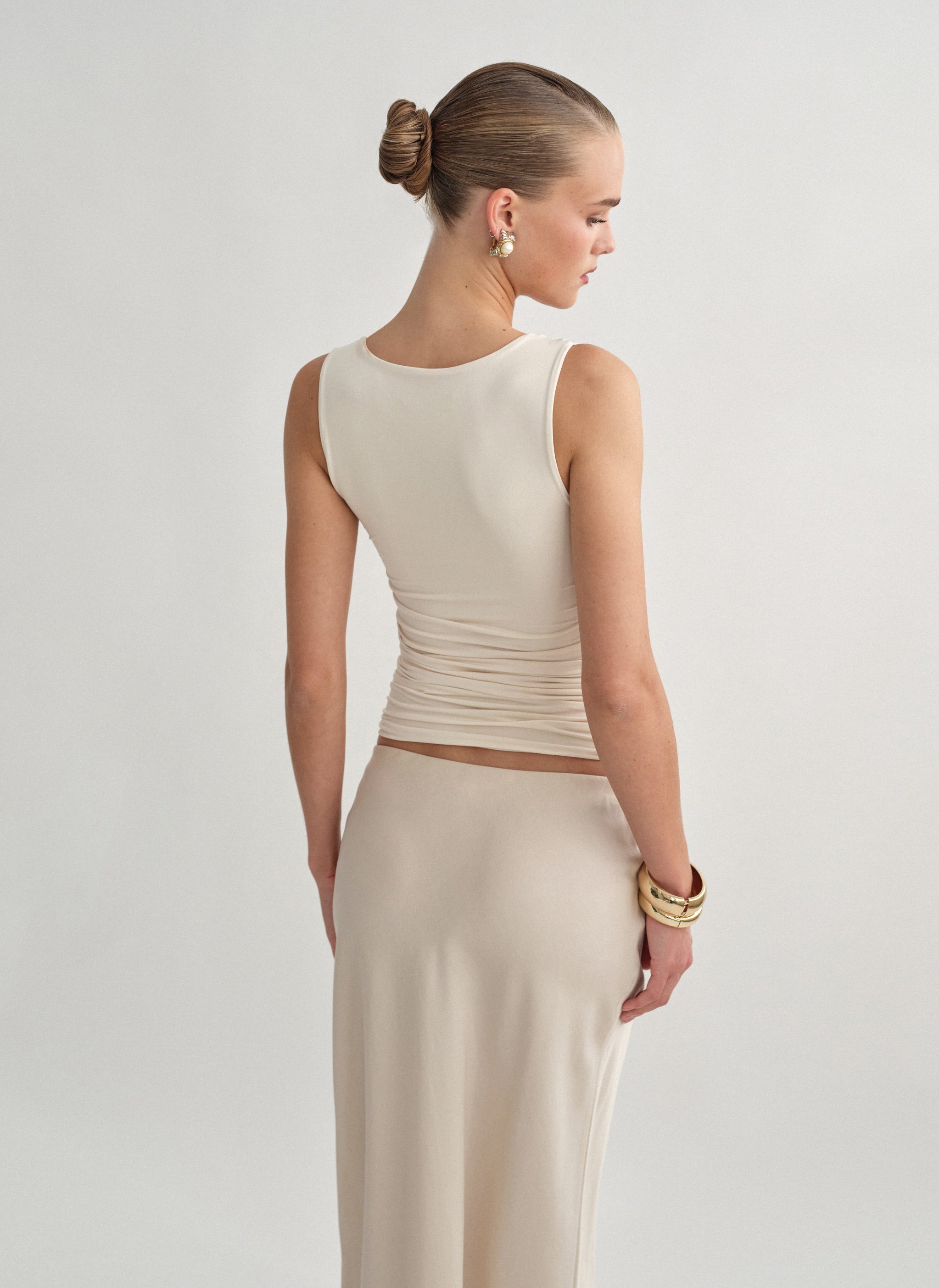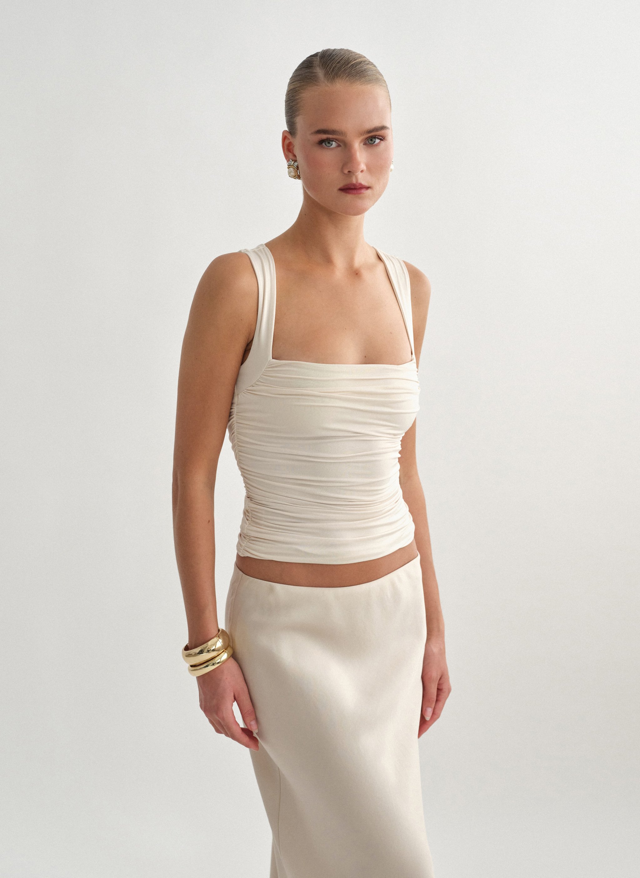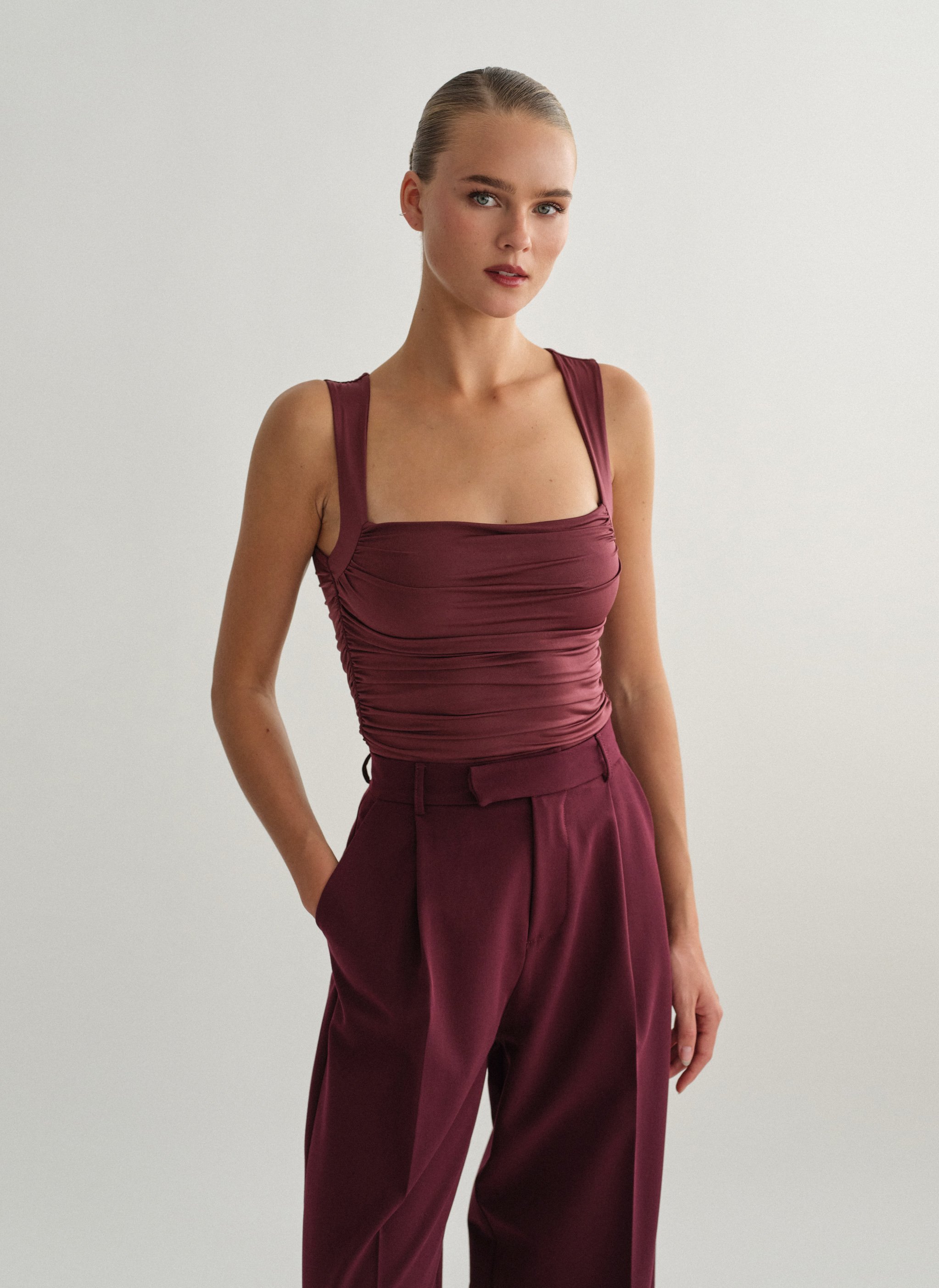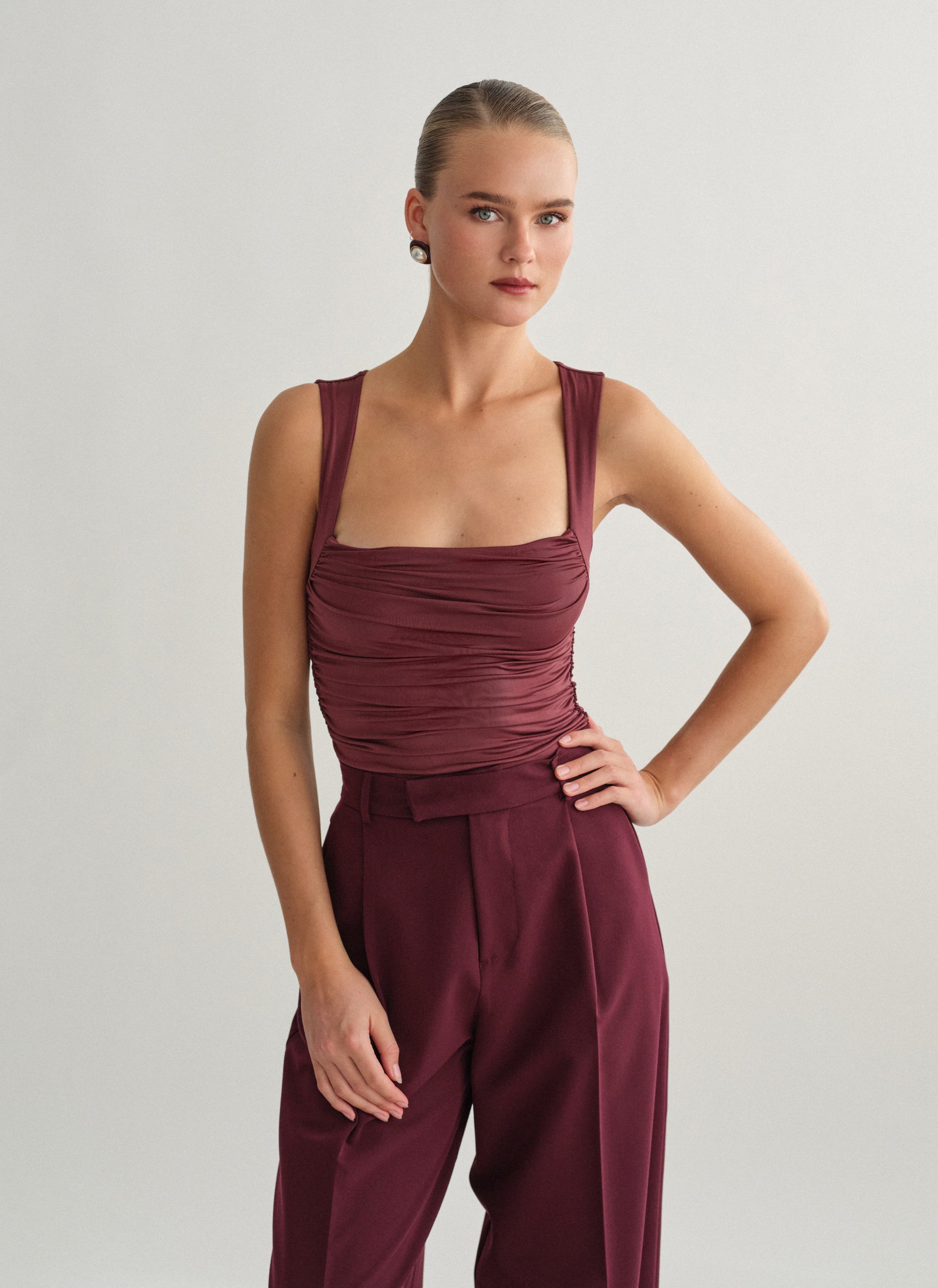 Ελαστικό αμάνικο τοπ με σούρες και τετράγωνο ντεκολτέ.