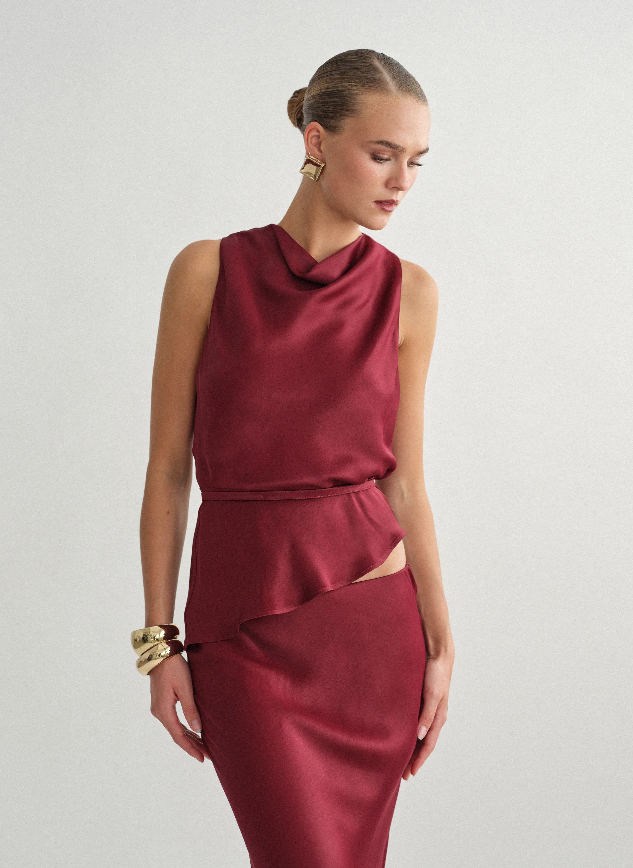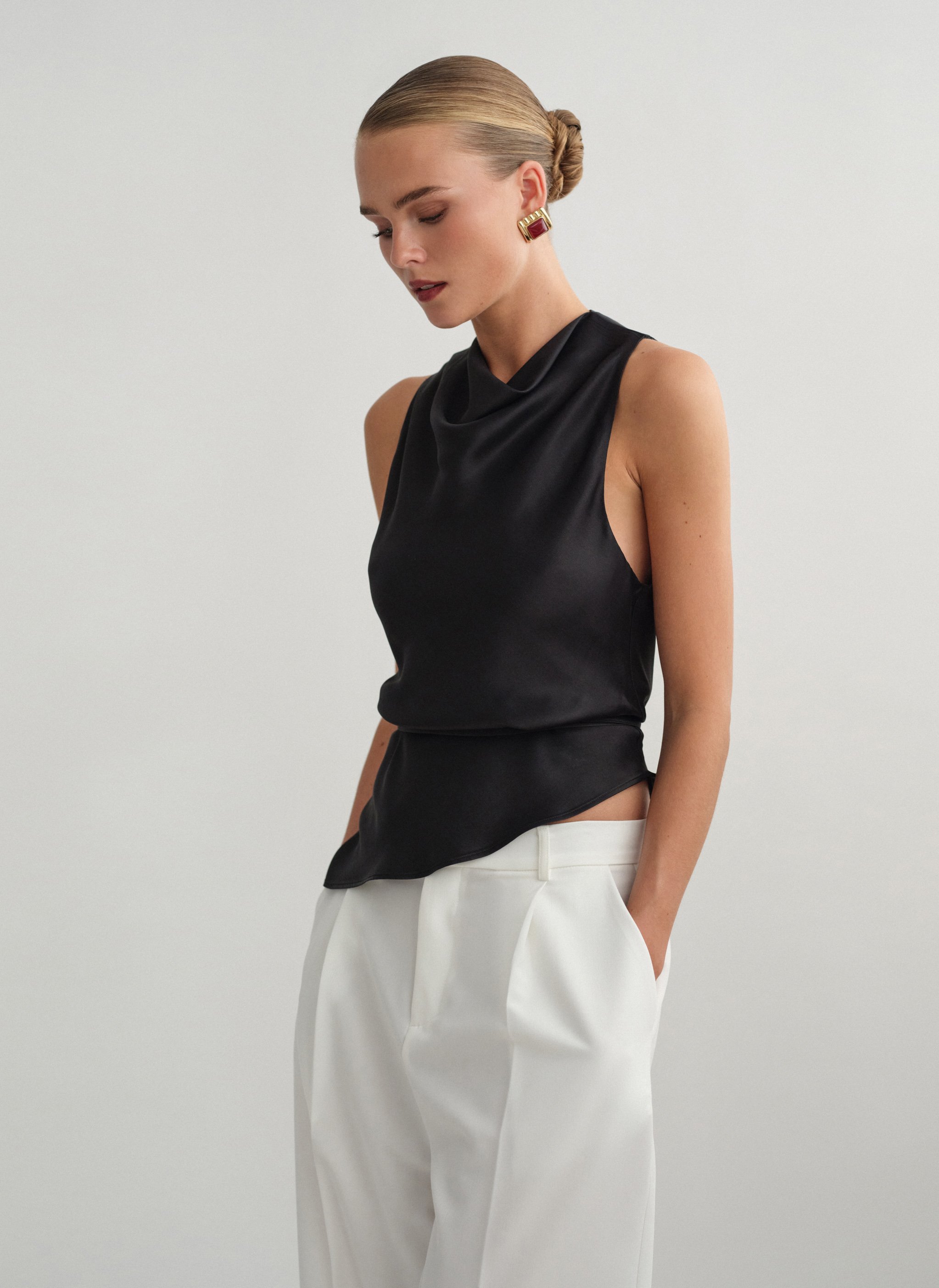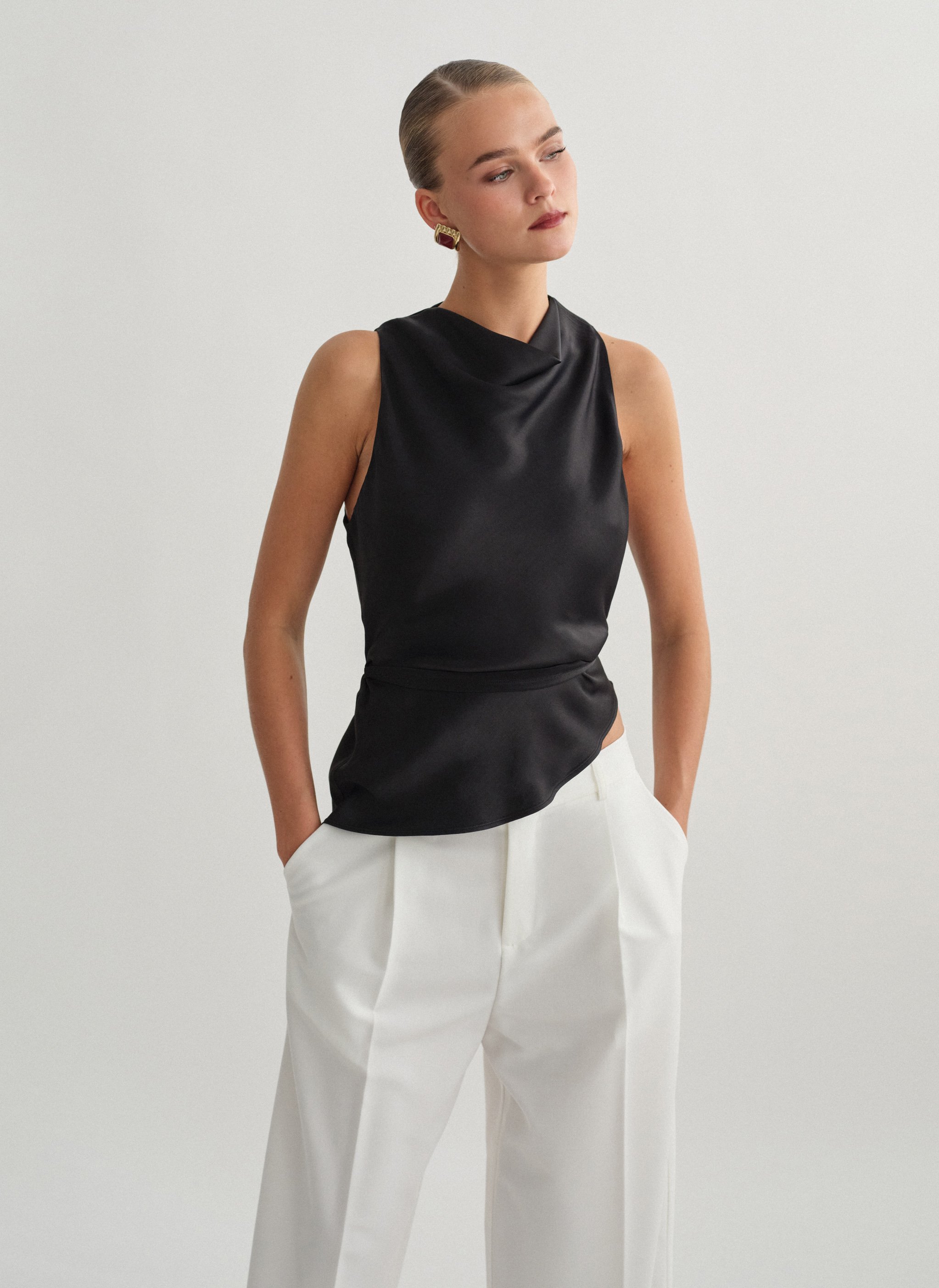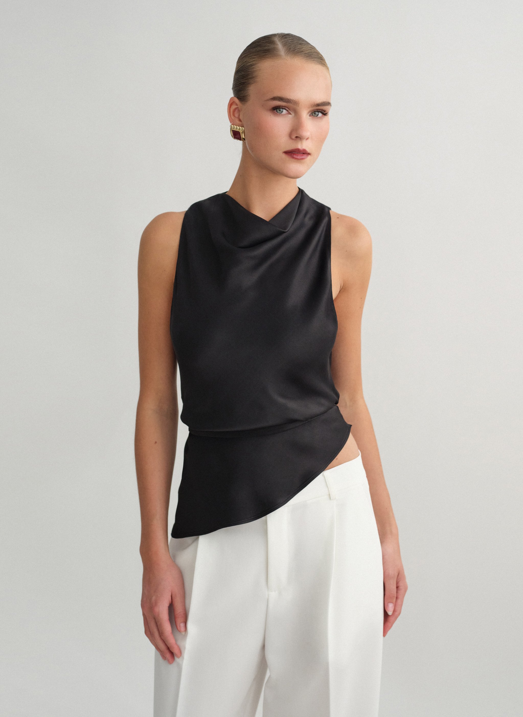 Ασύμμετρο σατέν τοπ με ντραπέ λαιμόκοψη και δέσιμο.