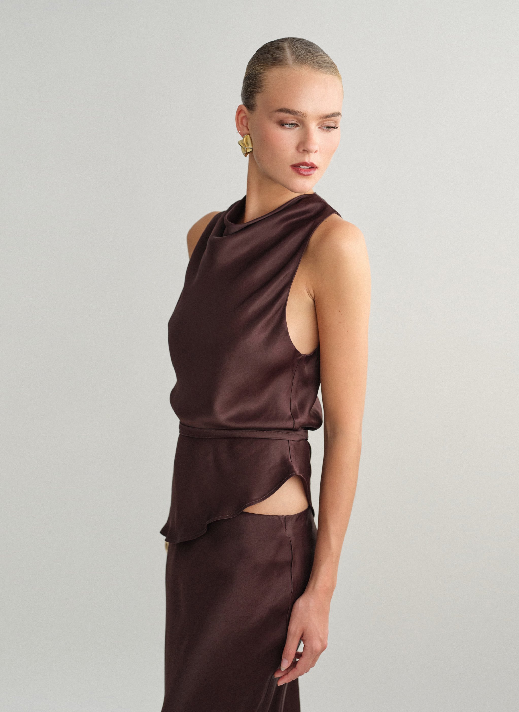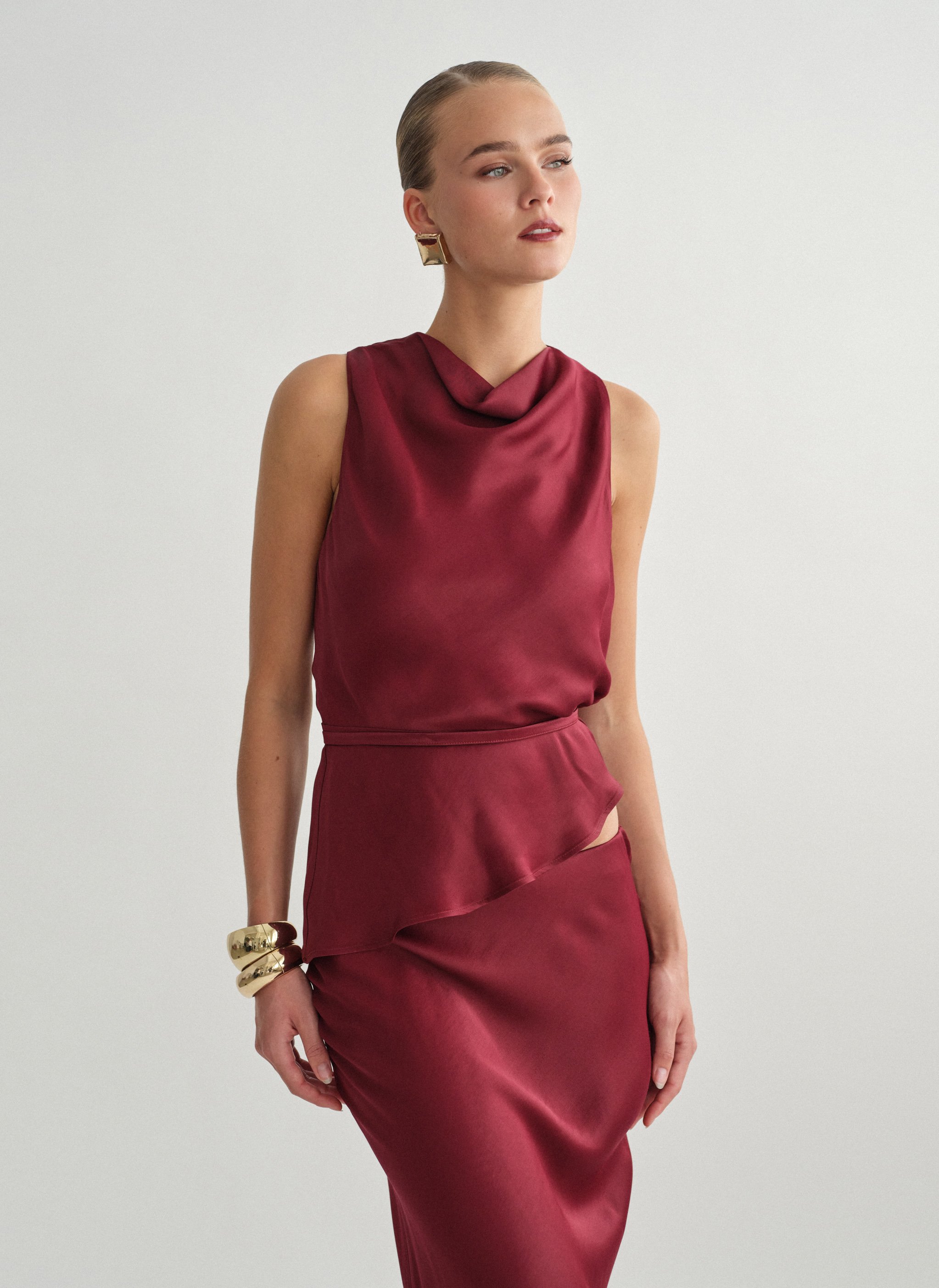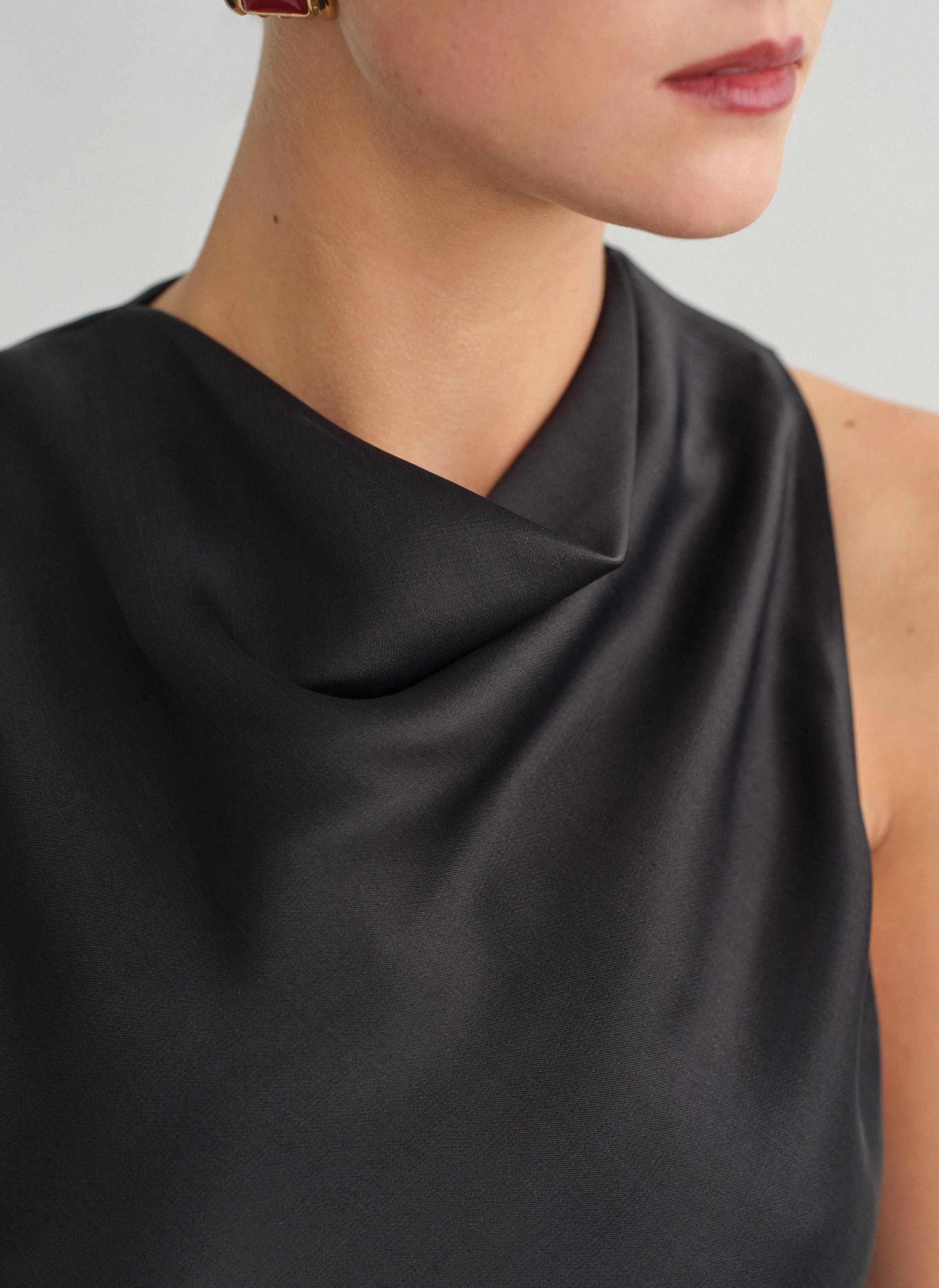 Ασύμμετρο σατέν τοπ με ντραπέ λαιμόκοψη και δέσιμο.