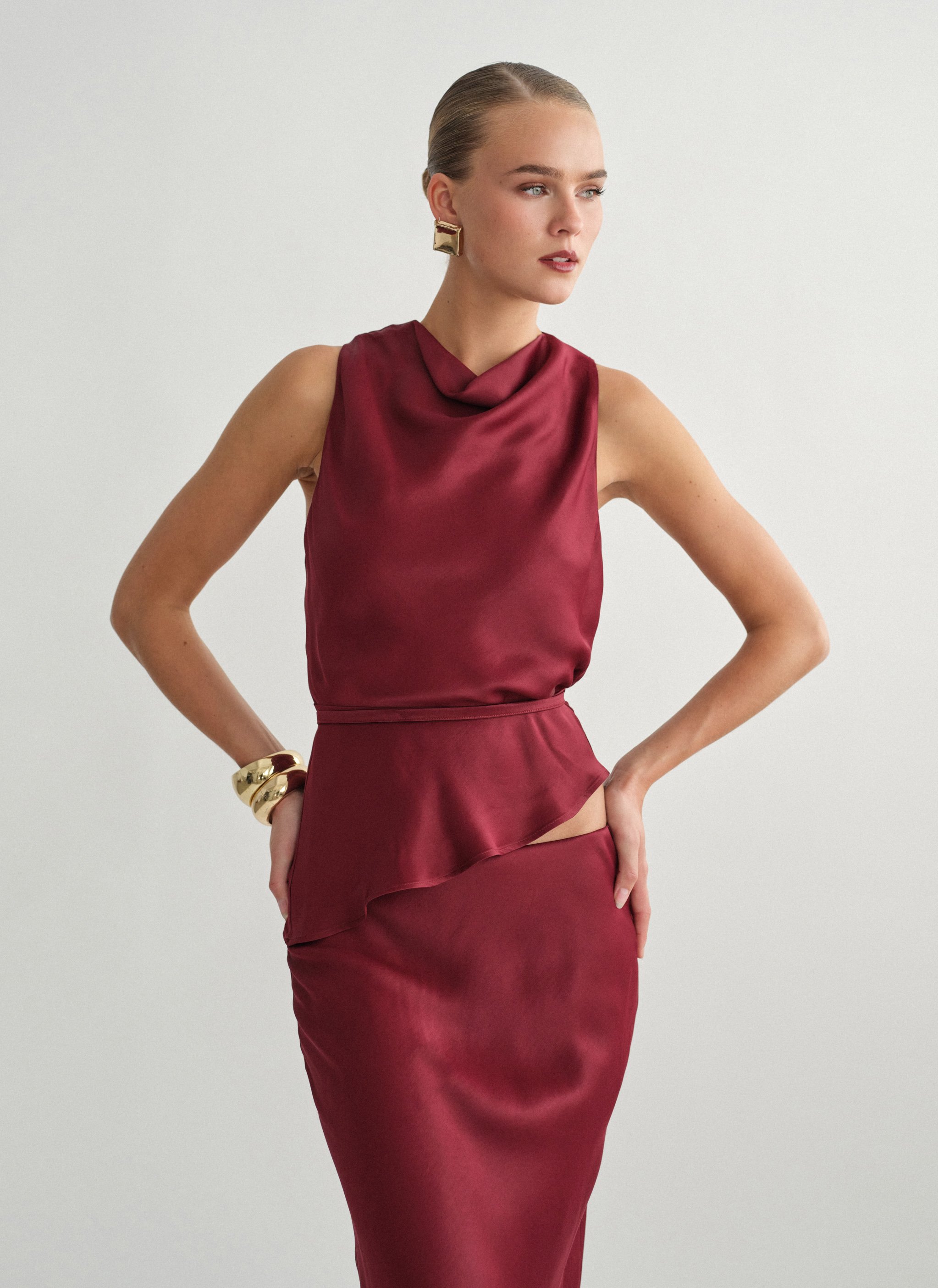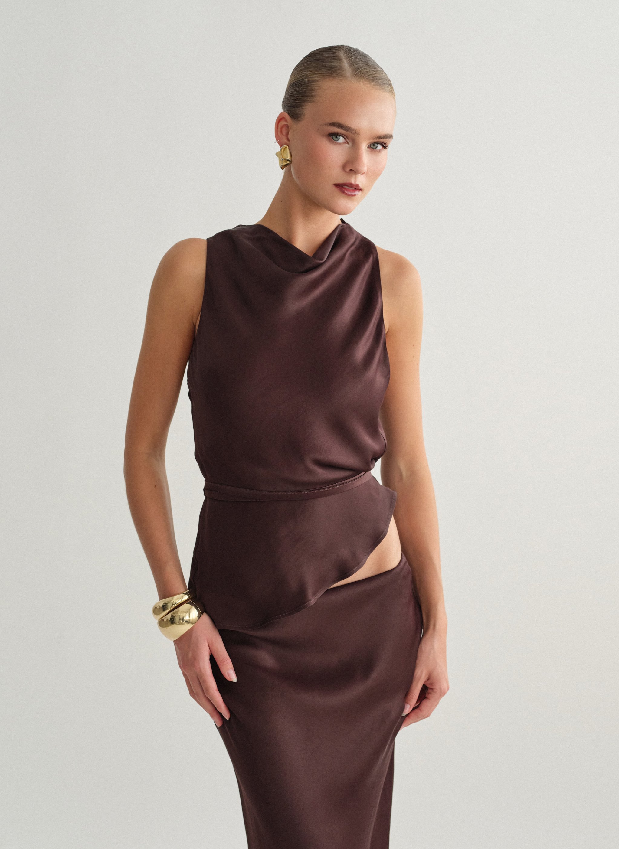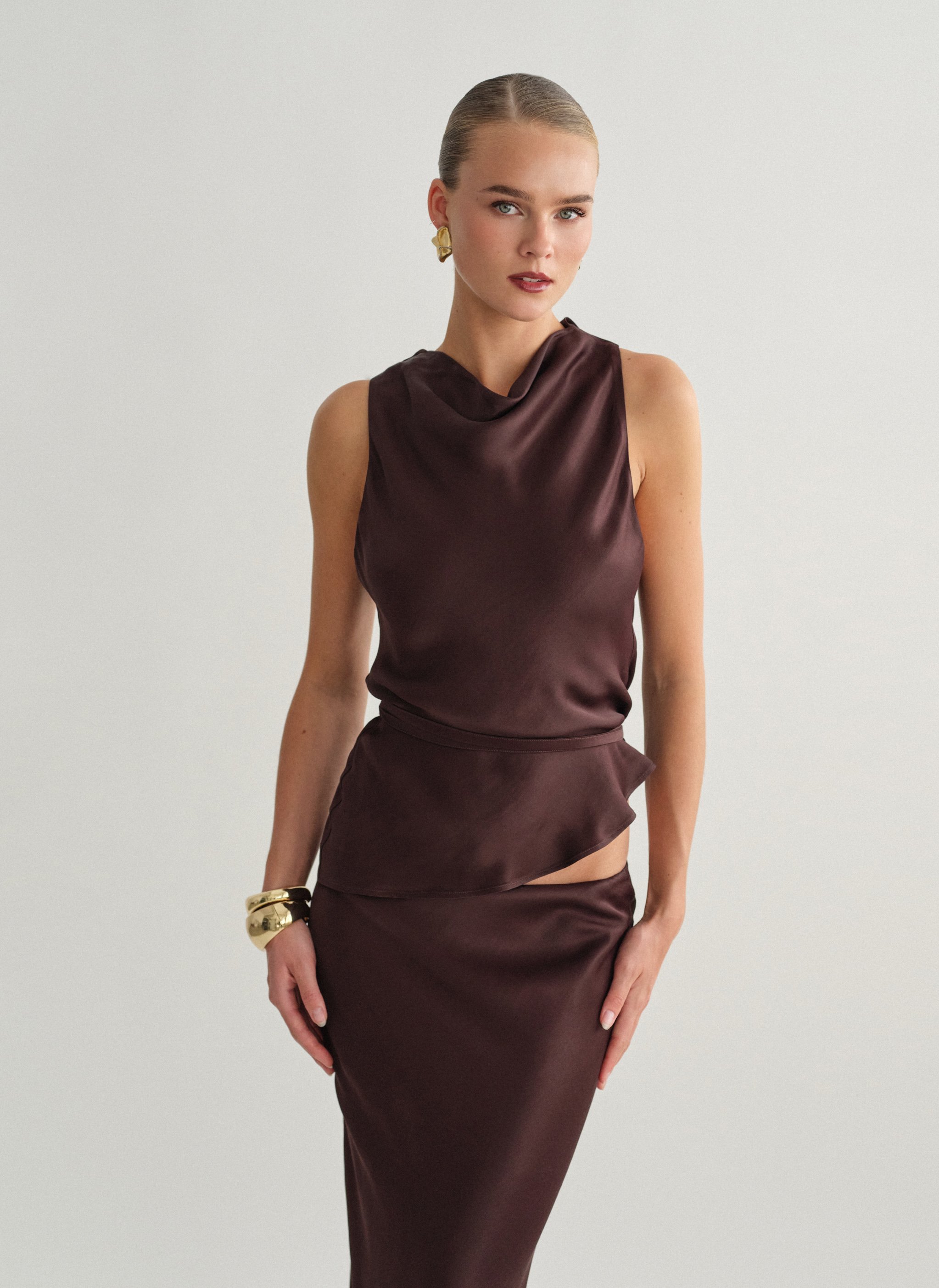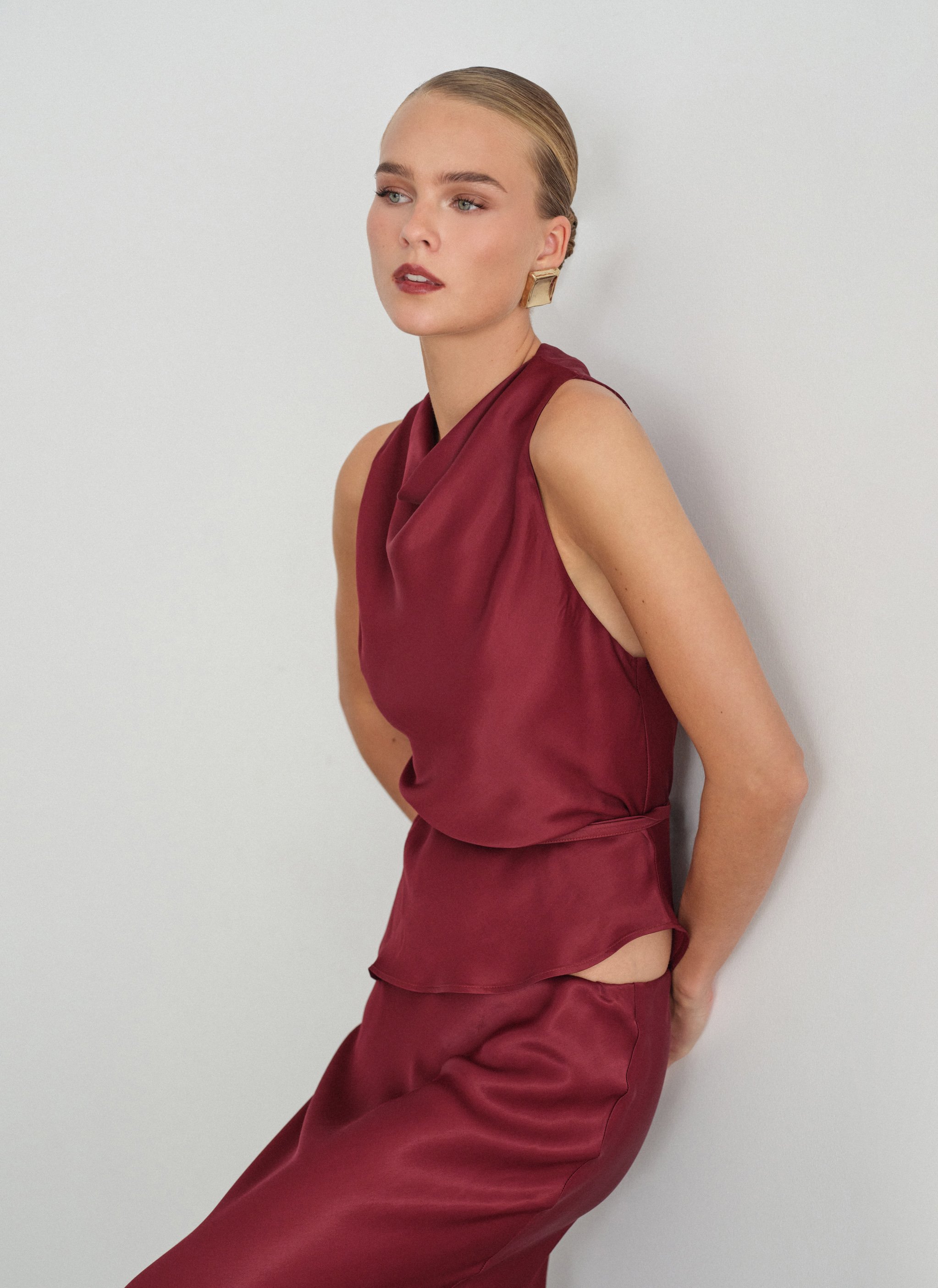 Ασύμμετρο σατέν τοπ με ντραπέ λαιμόκοψη και δέσιμο.