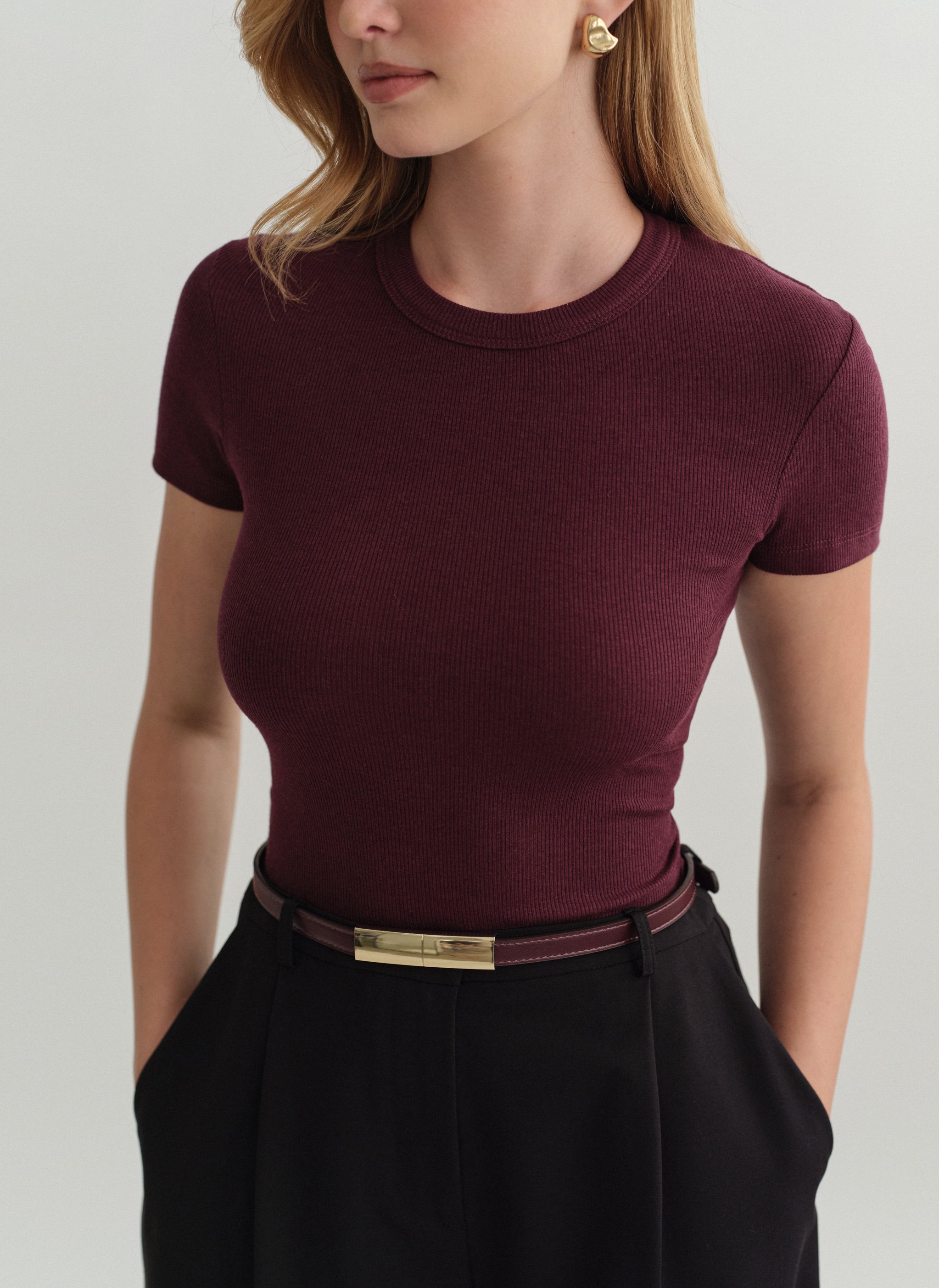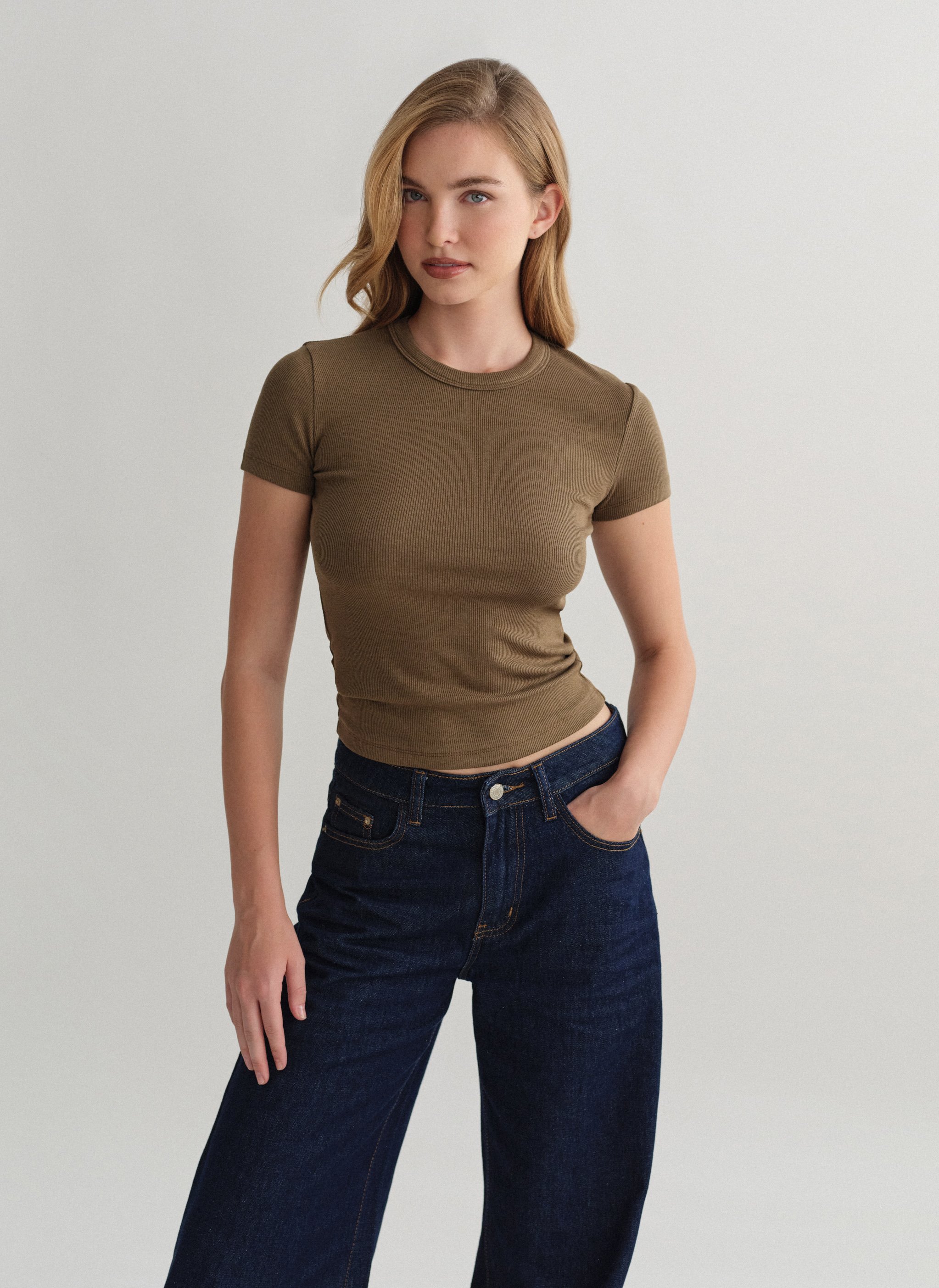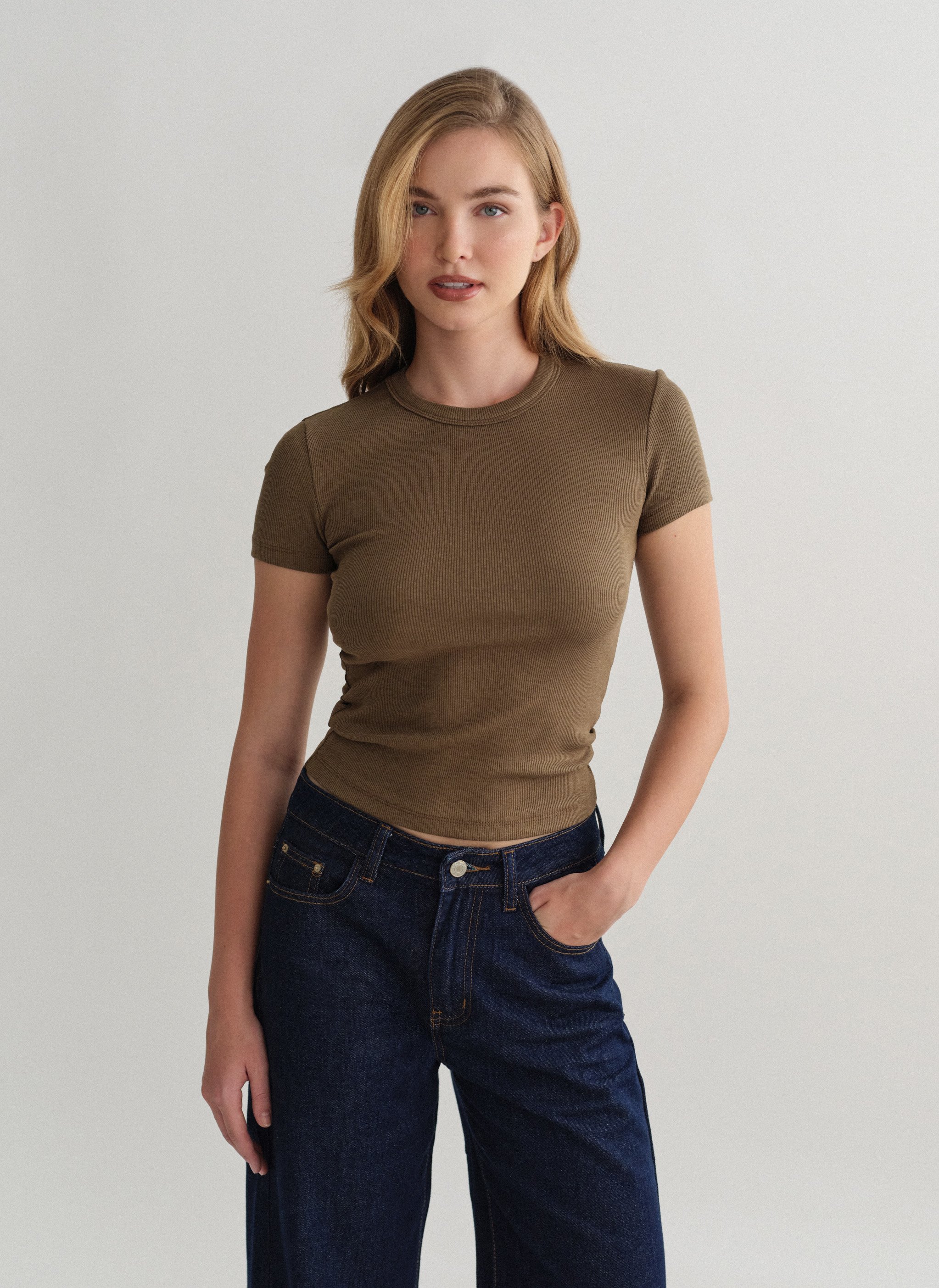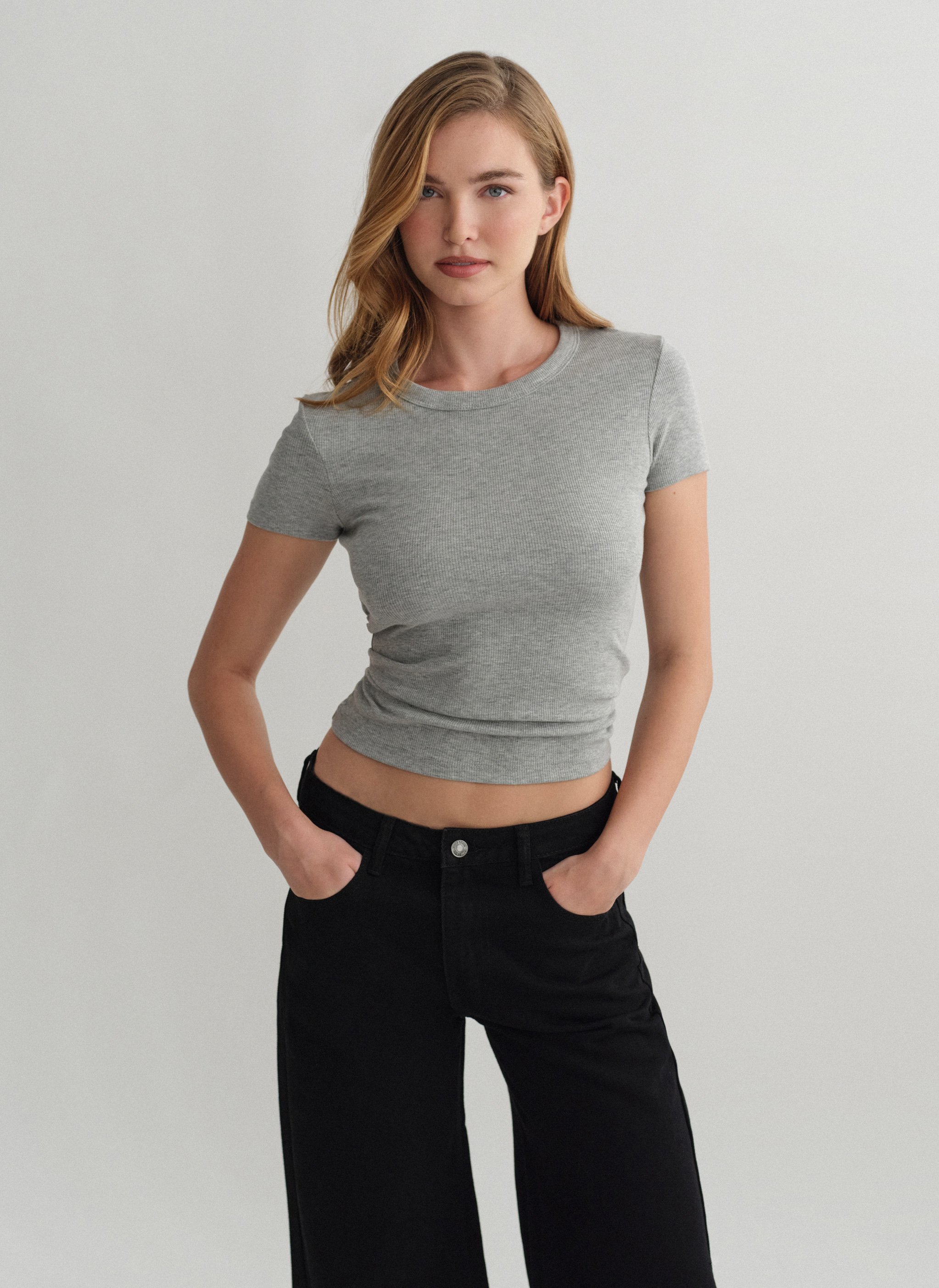 Ελαστικό ριπ τοπ με κοντό μανίκι και στρογγυλή λαιμόκοψη.