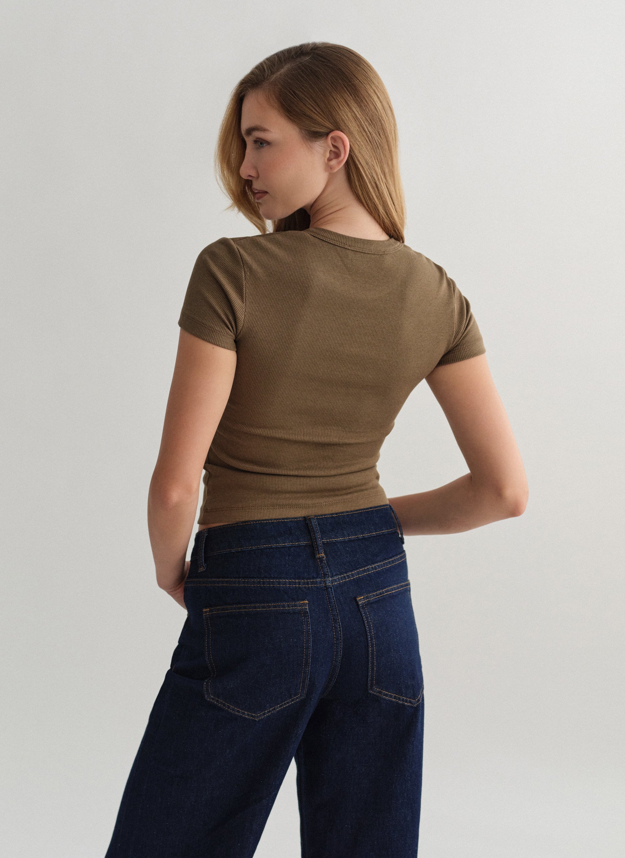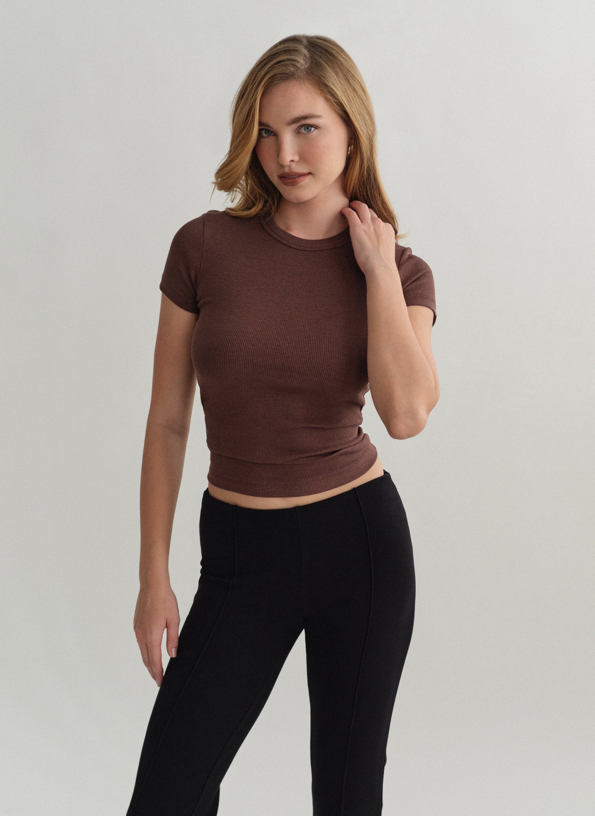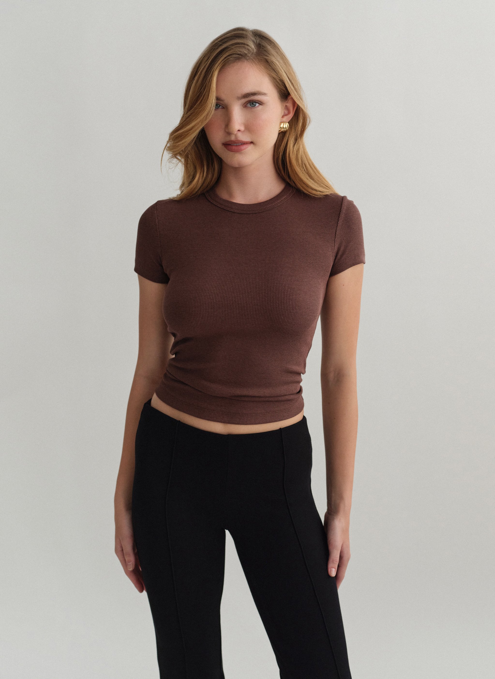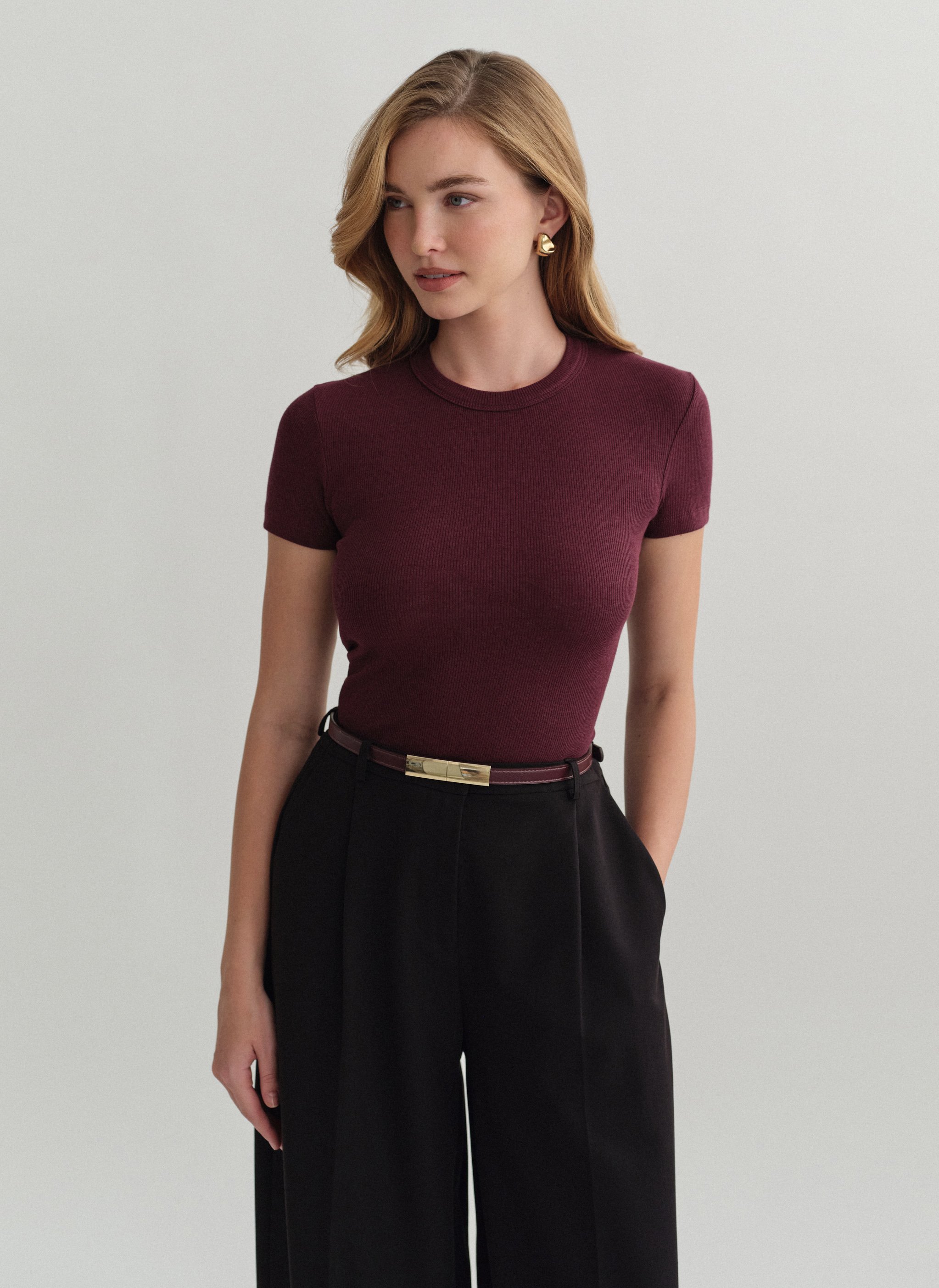Ελαστικό ριπ τοπ με κοντό μανίκι και στρογγυλή λαιμόκοψη.