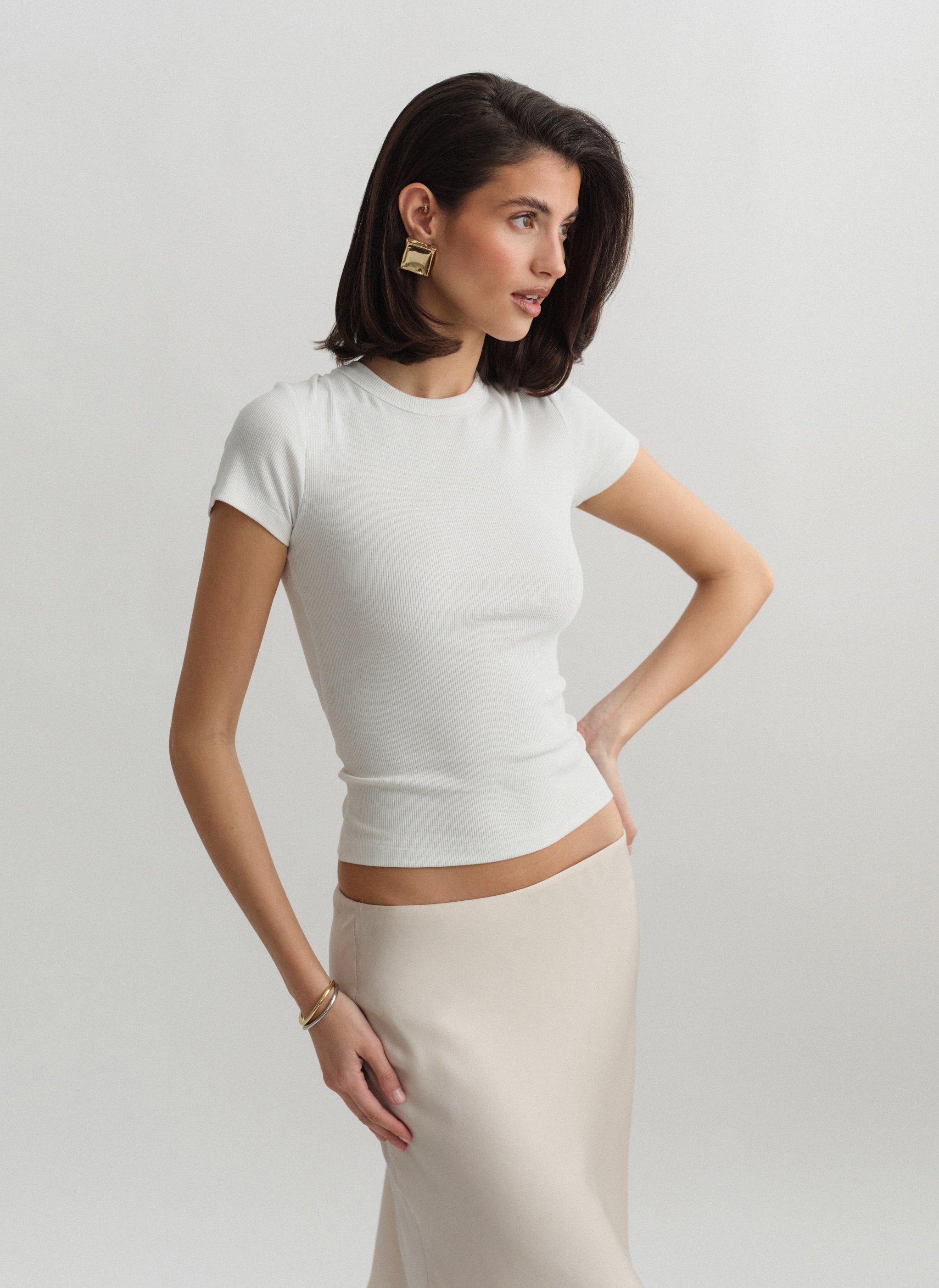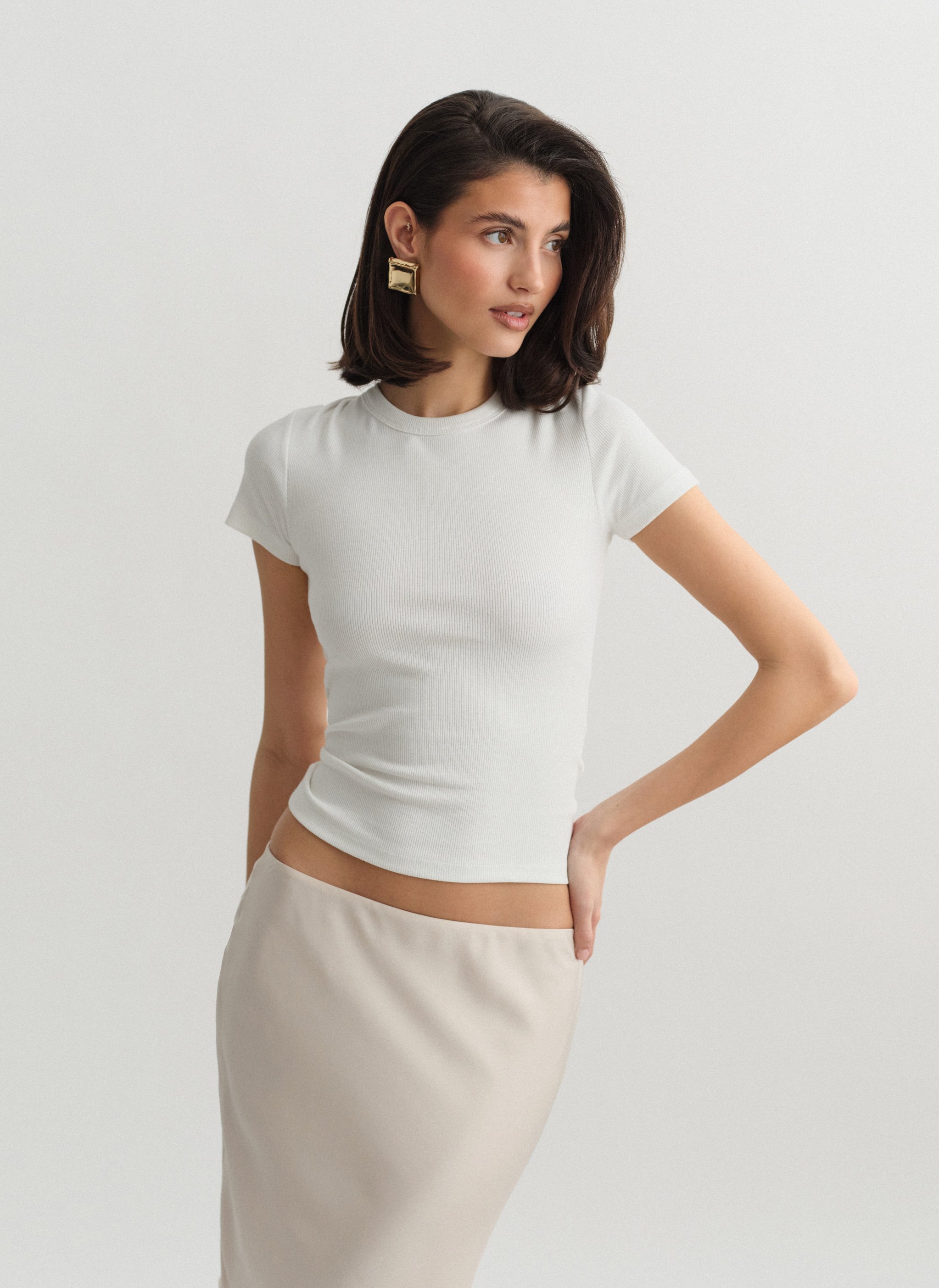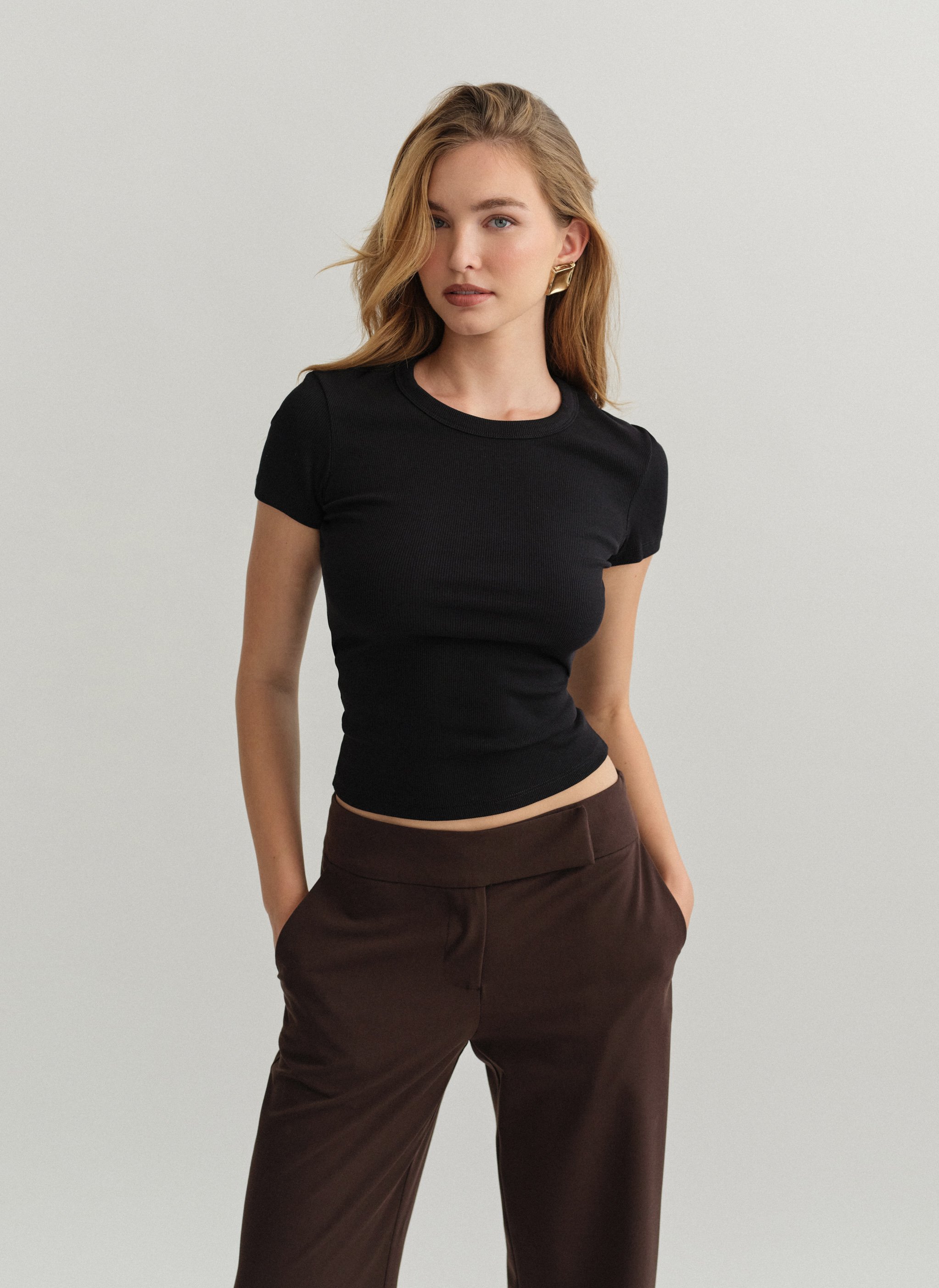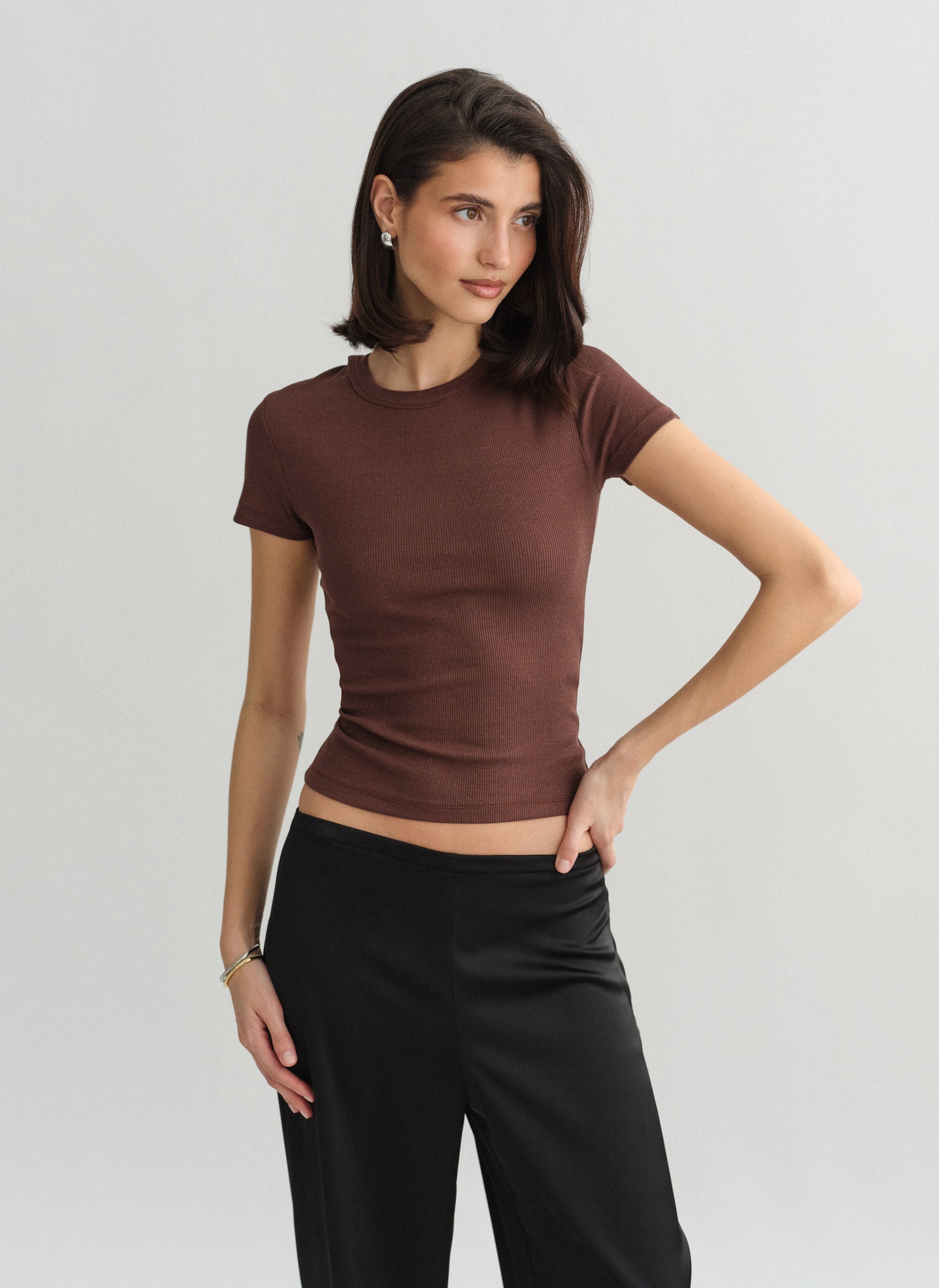 Ελαστικό ριπ τοπ με κοντό μανίκι και στρογγυλή λαιμόκοψη.