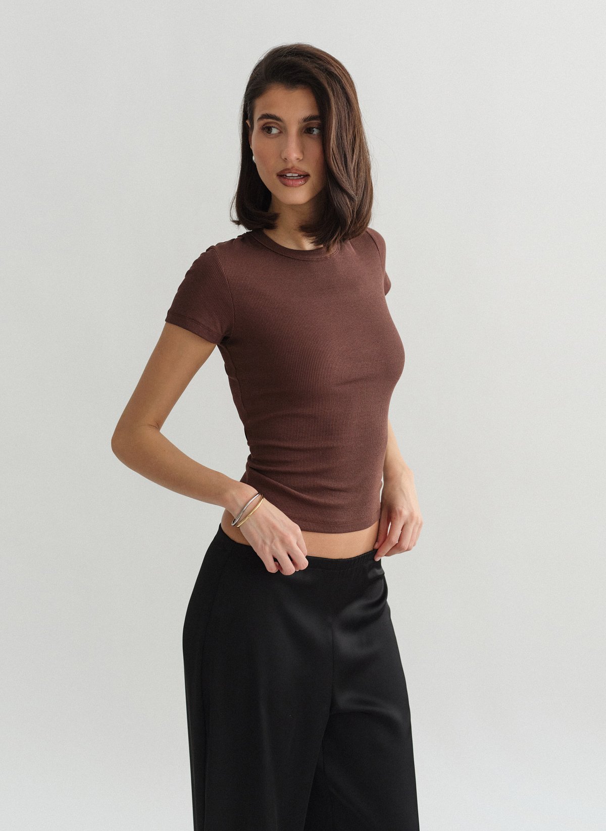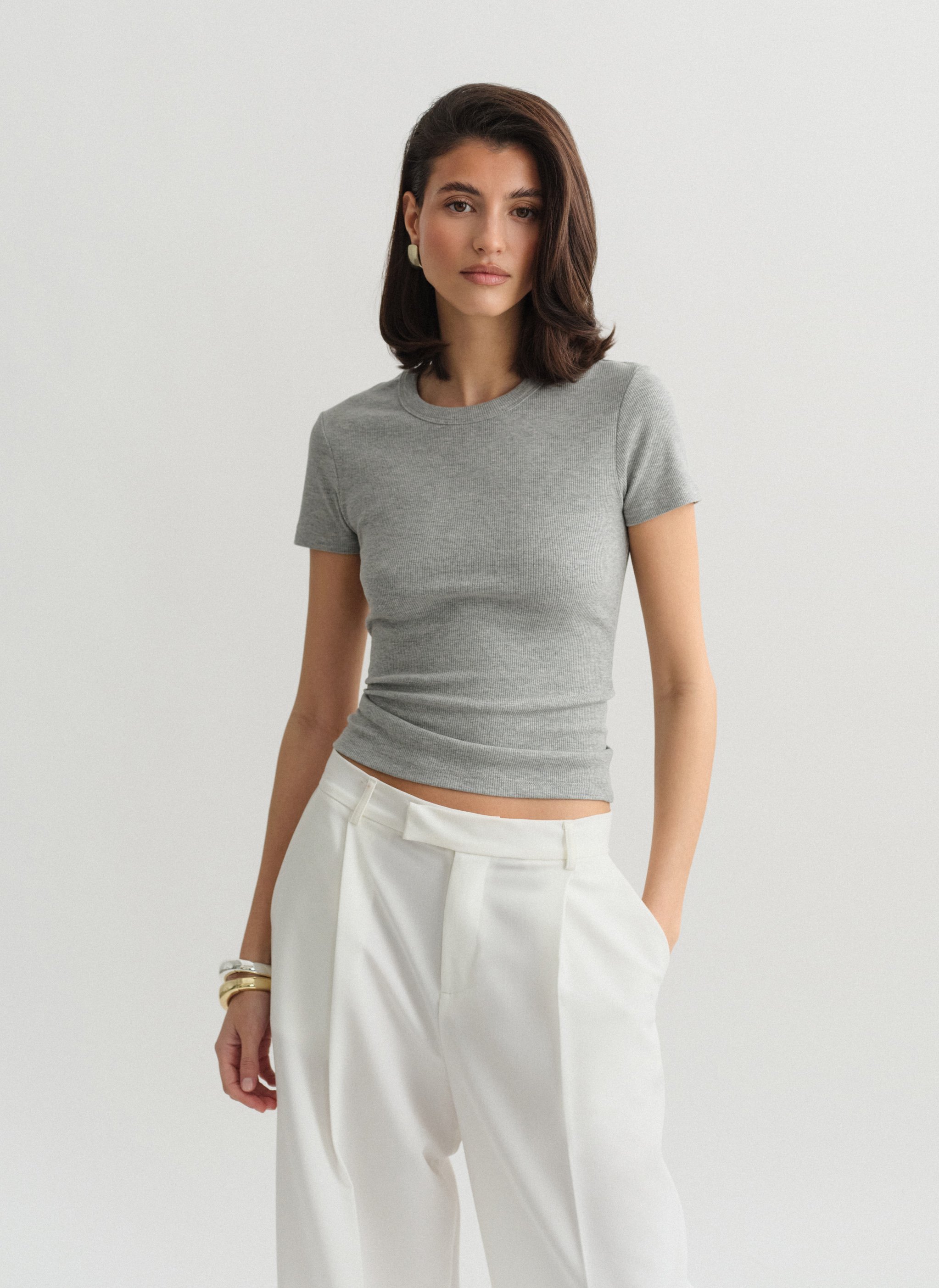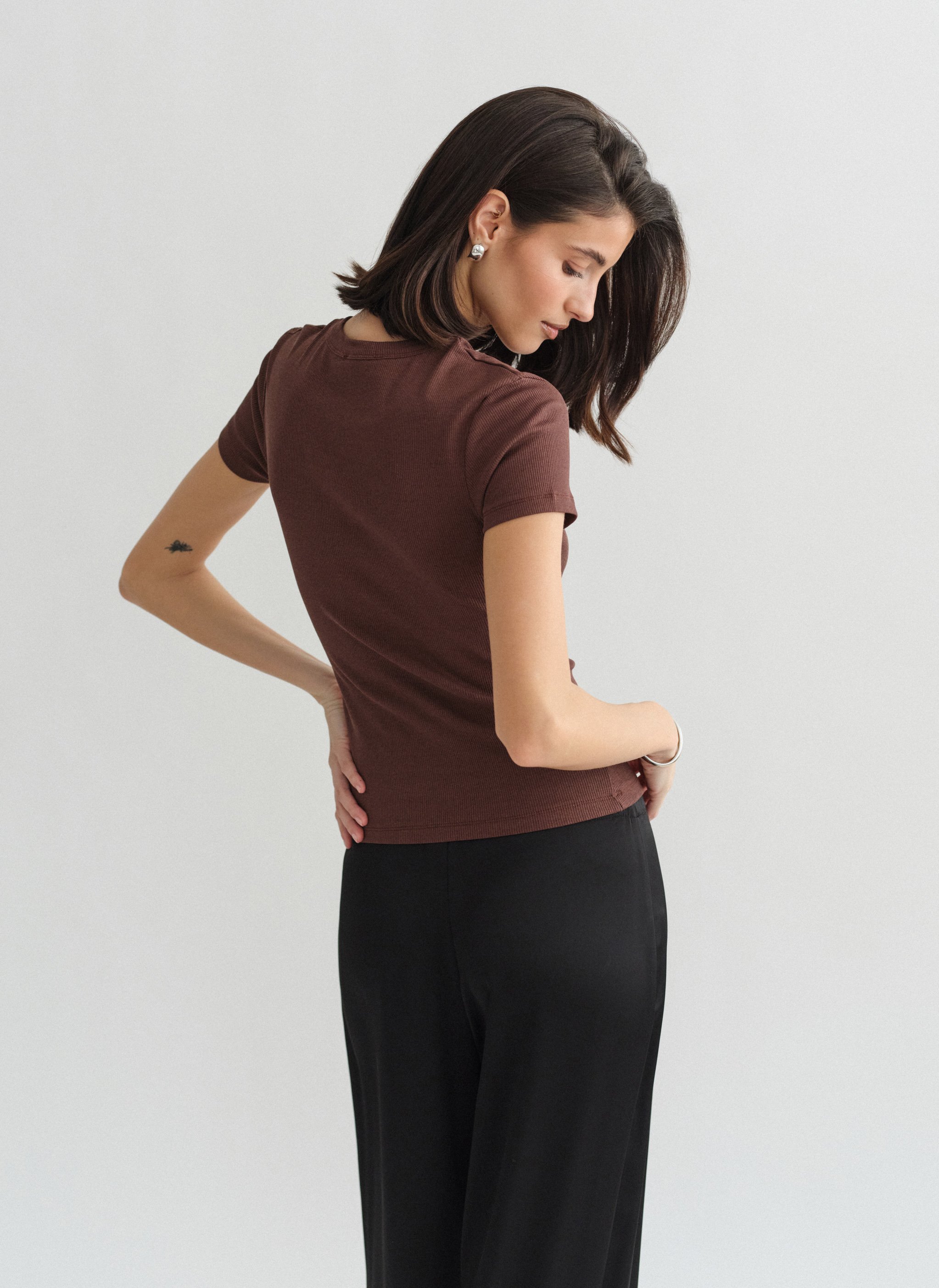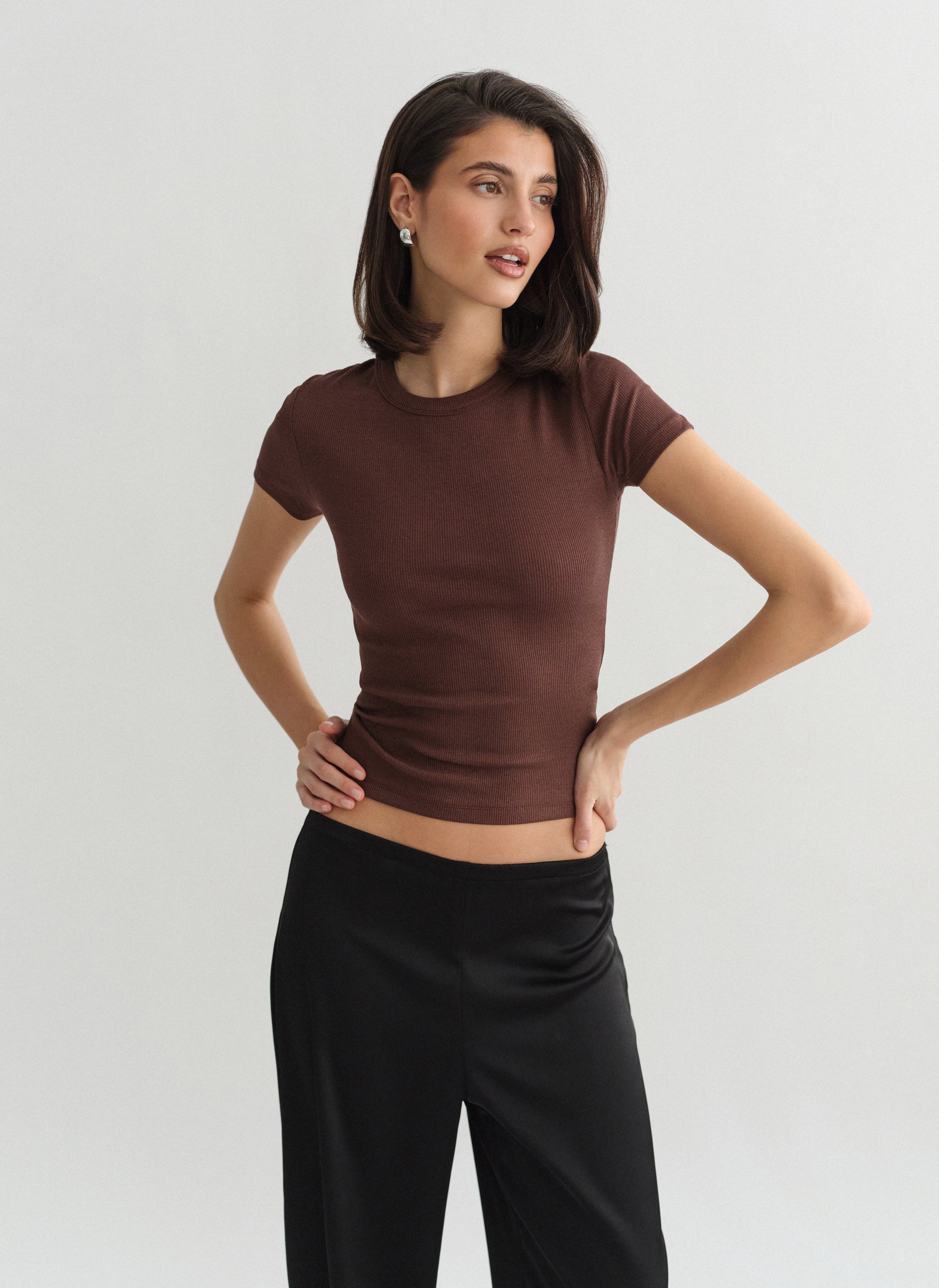 Ελαστικό ριπ τοπ με κοντό μανίκι και στρογγυλή λαιμόκοψη.