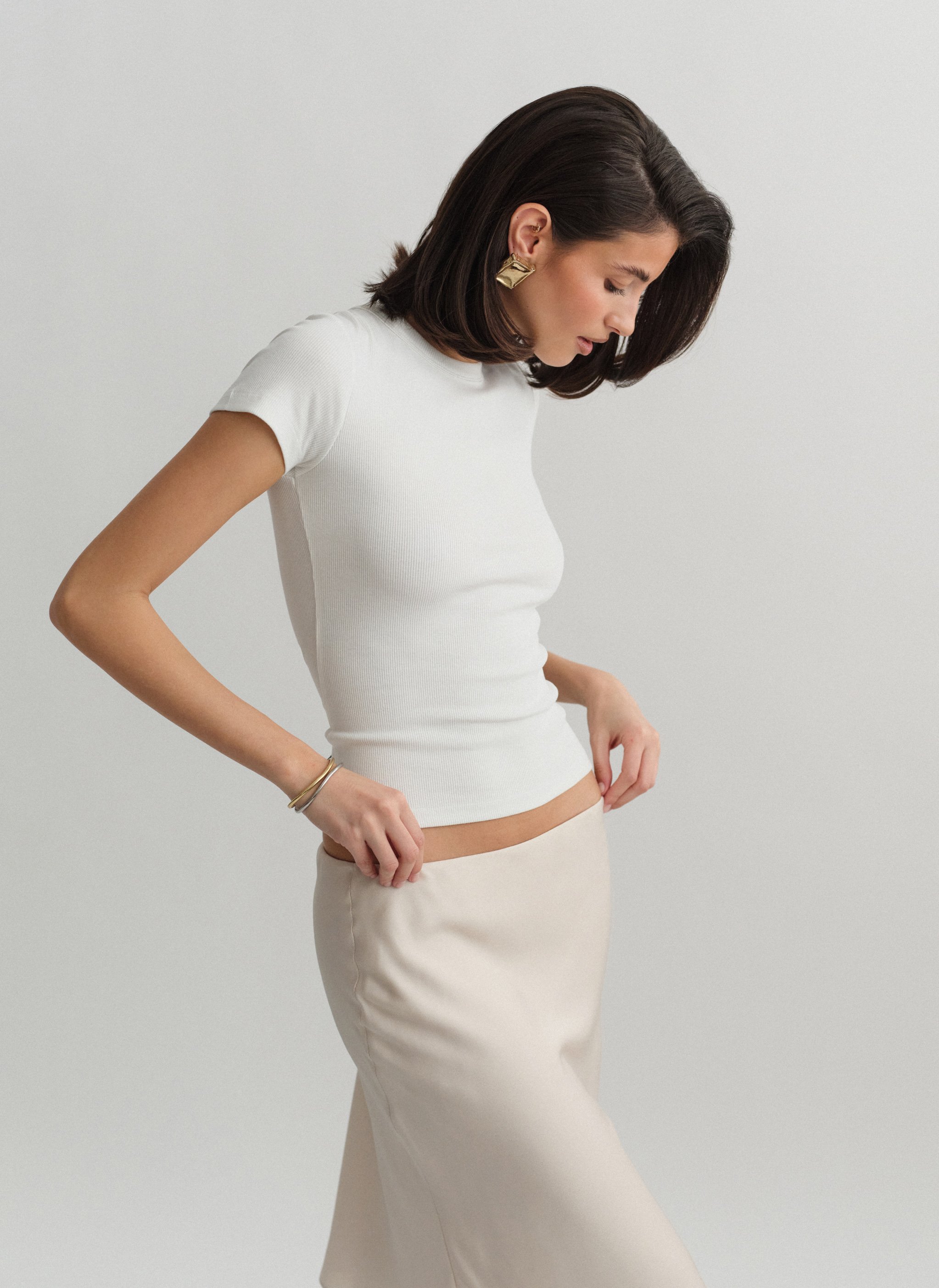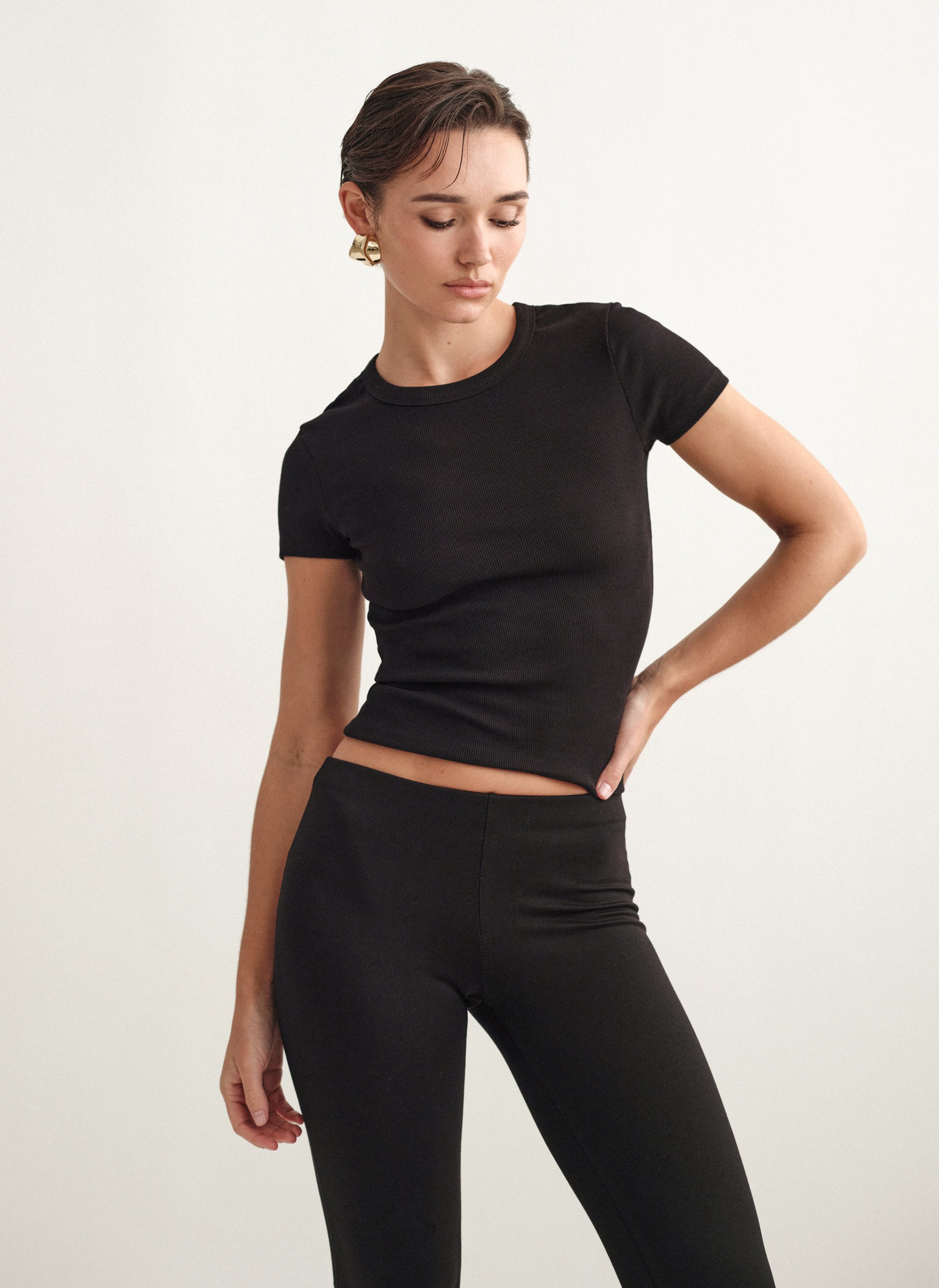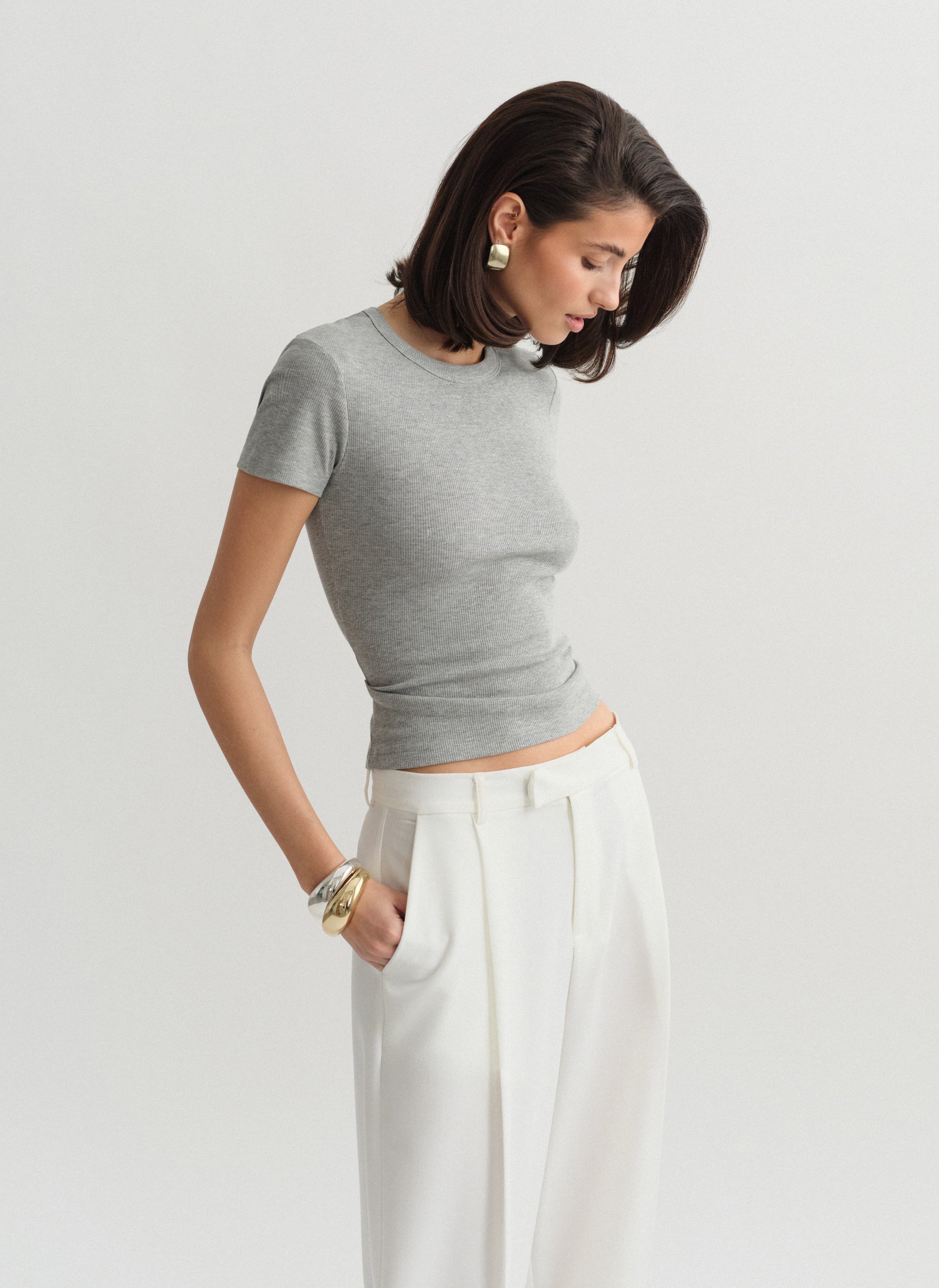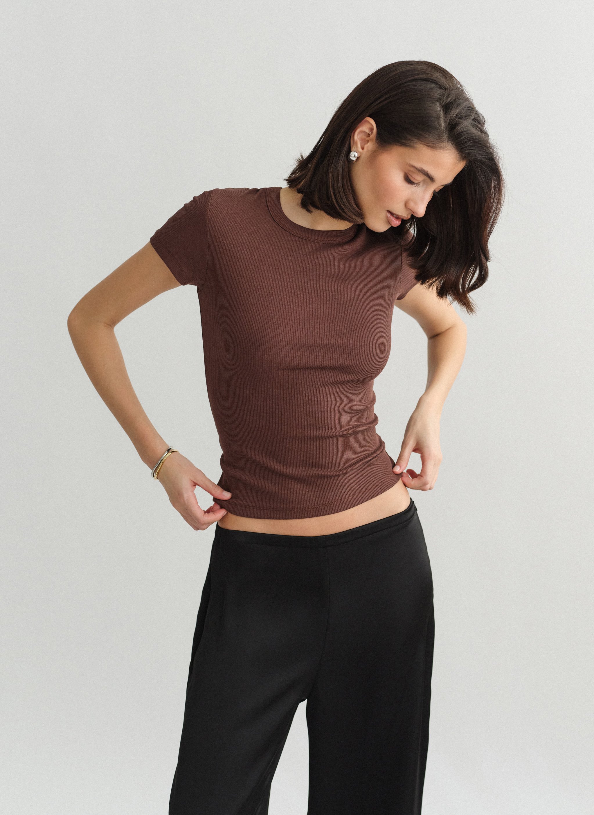 Ελαστικό ριπ τοπ με κοντό μανίκι και στρογγυλή λαιμόκοψη.