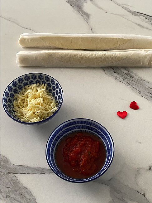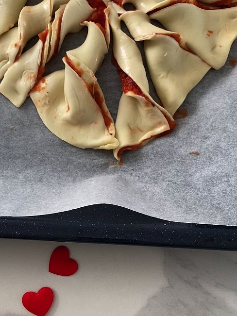 Τοποθέτησε τη μία καρδιά σε ταψί στρωμένο με λαδόκολλα. Με μια σπάτουλα άπλωσε τη σάλτσα ντομάτας σε όλη την επιφάνεια, αφήνοντας περιθώριο περίπου 1,5 εκ. γύρω-γύρω. Σκέπασε με τη δεύτερη καρδιά.
