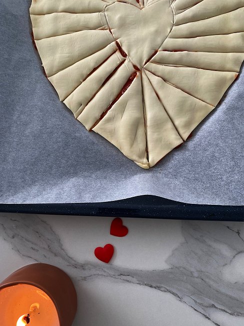 Πίεσε ένα φόρμα κοπής μπισκότου σε σχήμα καρδιάς στο κέντρο, ώστε να δημιουργηθεί εσοχή χωρίς να κόψεις τελείως τη ζύμη (ή χρησιμοποίησε μαχαίρι). Με ένα μικρό μαχαίρι, κόψε λεπτές λωρίδες ξεκινώντας από το περίγραμμα της εσοχής και φτάνοντας μέχρι την εξωτερική άκρη της καρδιάς. Οι λωρίδες θα έχουν πλάτος περίπου 0,5 εκ. στη βάση και 1 εκ. στην κορυφή και θα είναι συνολικά γύρω στις 24.