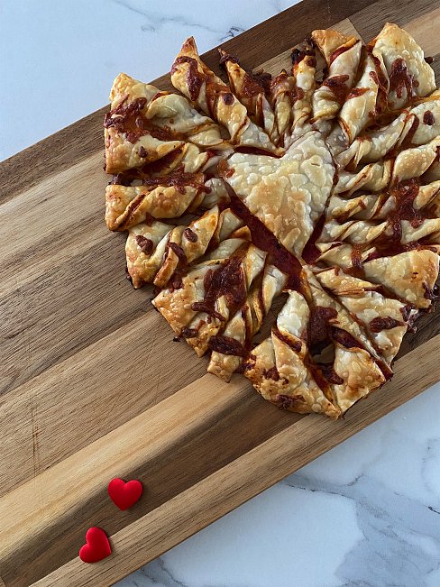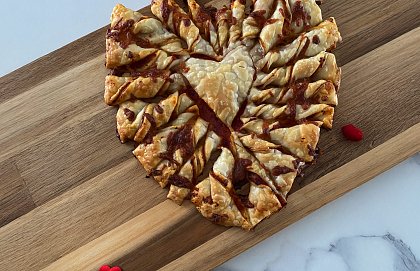 Τοποθέτησε μια σχάρα στο κέντρο του φούρνου και προθέρμανε στους 200°C. Πάνω σε επιφάνεια στρωμένη με λαδόκολλα, άνοιξε το ένα φύλλο ζύμης σε ορθογώνιο 30 x 25 εκ. Επανάλαβε με το δεύτερο φύλλο. Με ένα μικρό μαχαίρι (και, αν χρειαστεί, ένα κομμάτι λαδόκολλας κομμένο σε σχήμα καρδιάς), κόψε ένα μεγάλο σχήμα καρδιάς και από τα δύο ορθογώνια, φροντίζοντας να έχουν περίπου το ίδιο μέγεθος. Πέτα τα περισσεύματα ή κράτησέ τα για άλλη χρήση.
