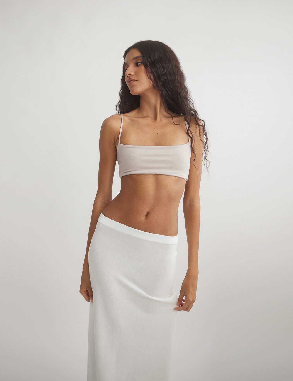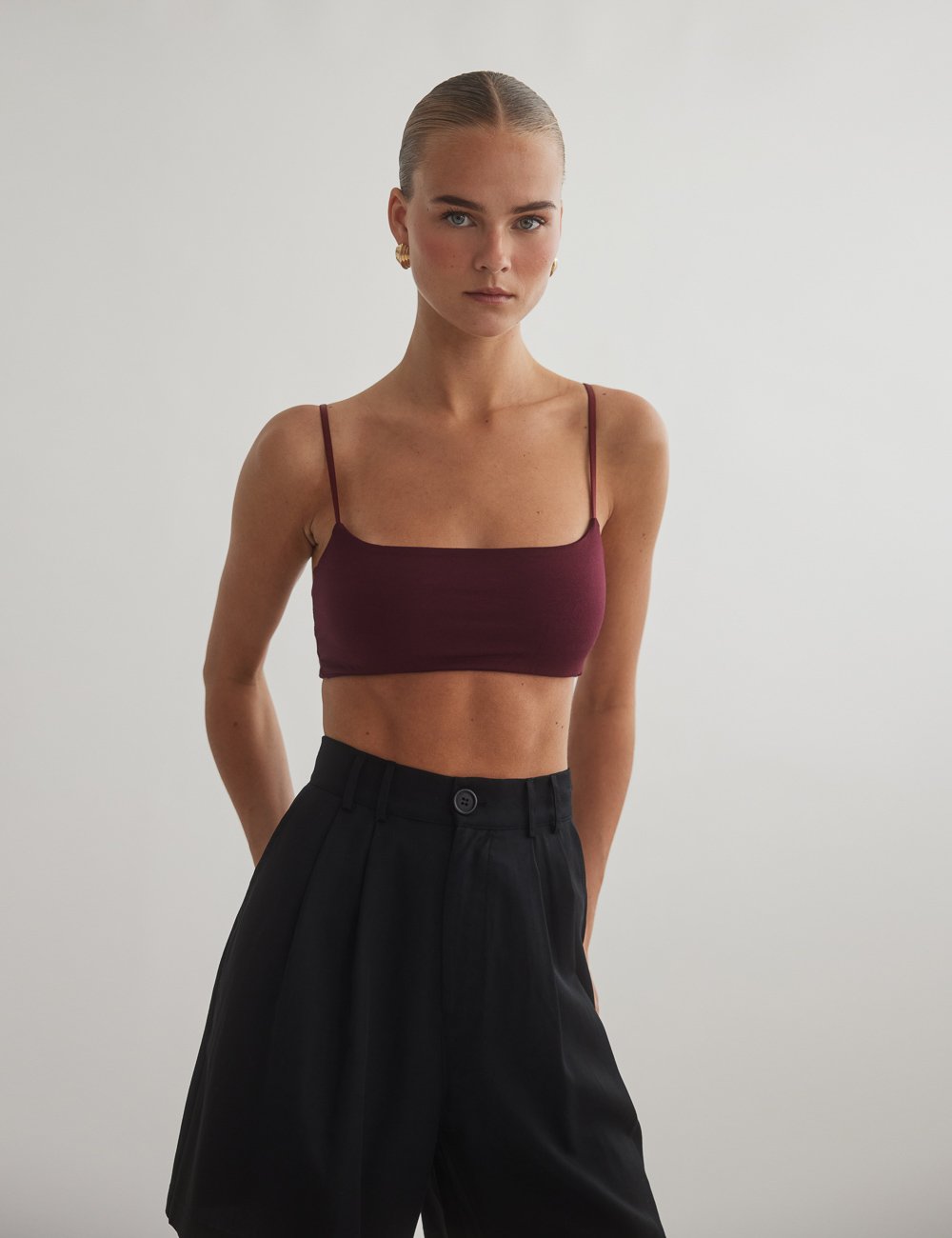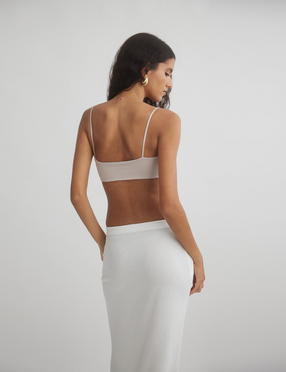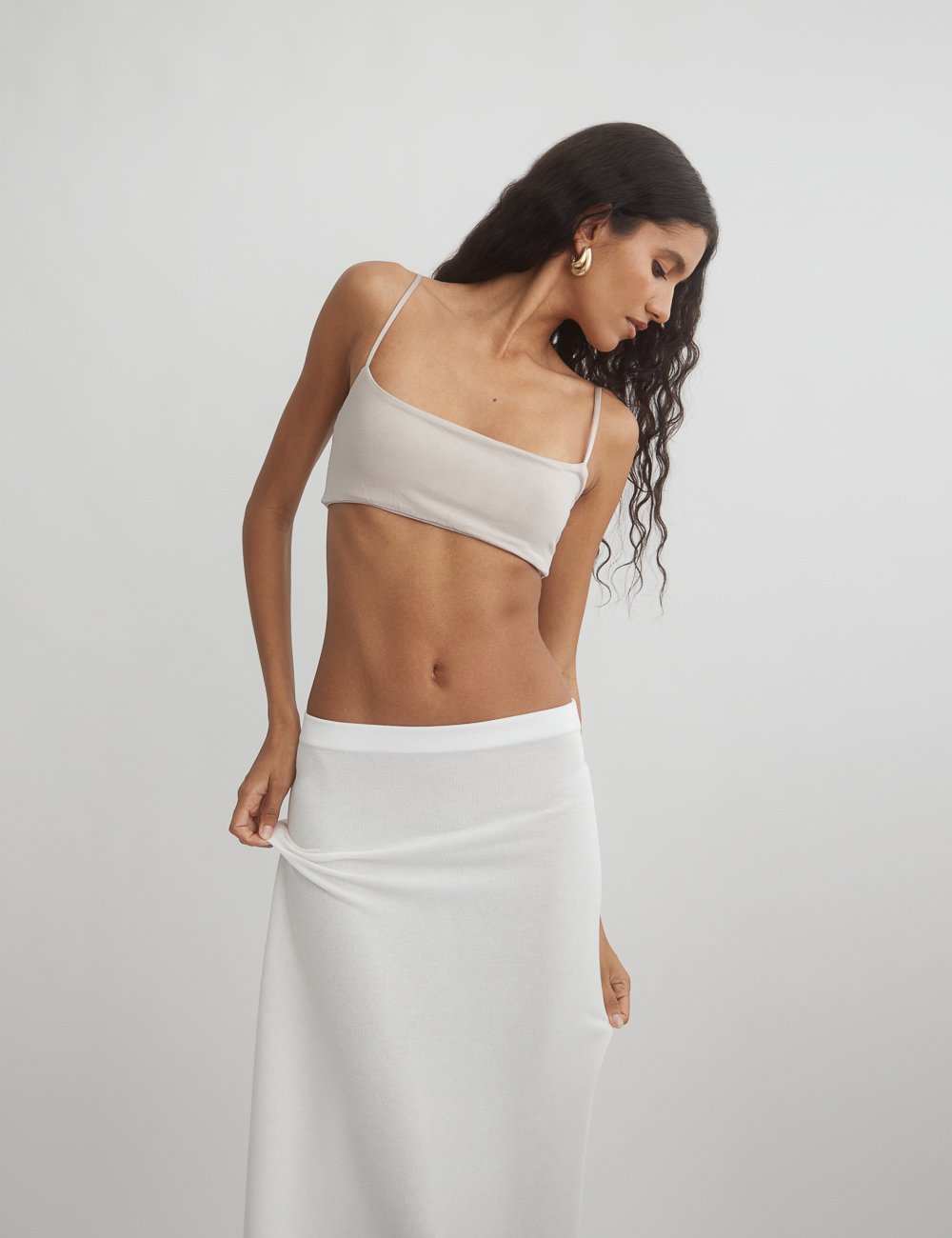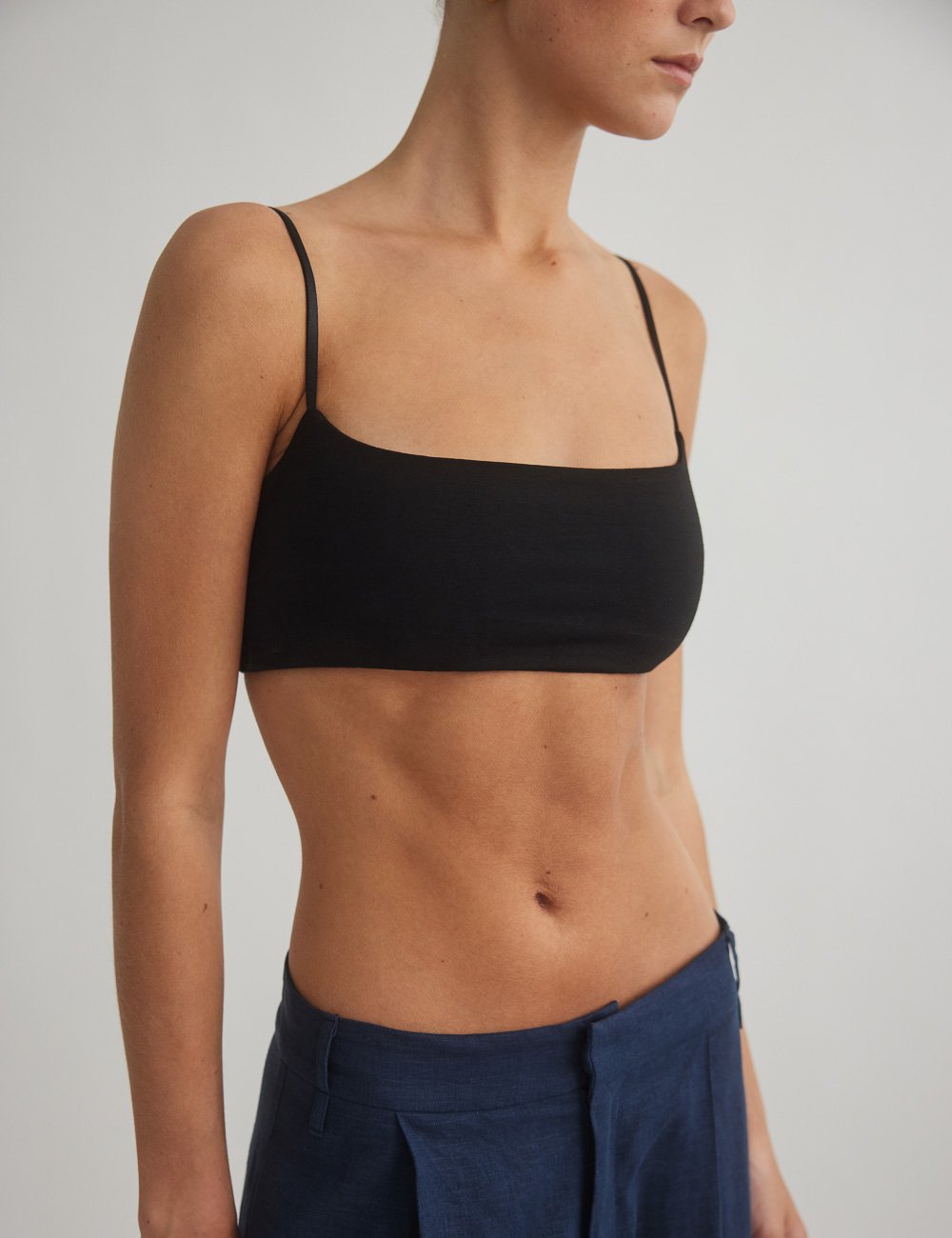 Ελαστικό crop τοπ με λεπτά τιραντάκια και ίσια λαιμόκοψη.