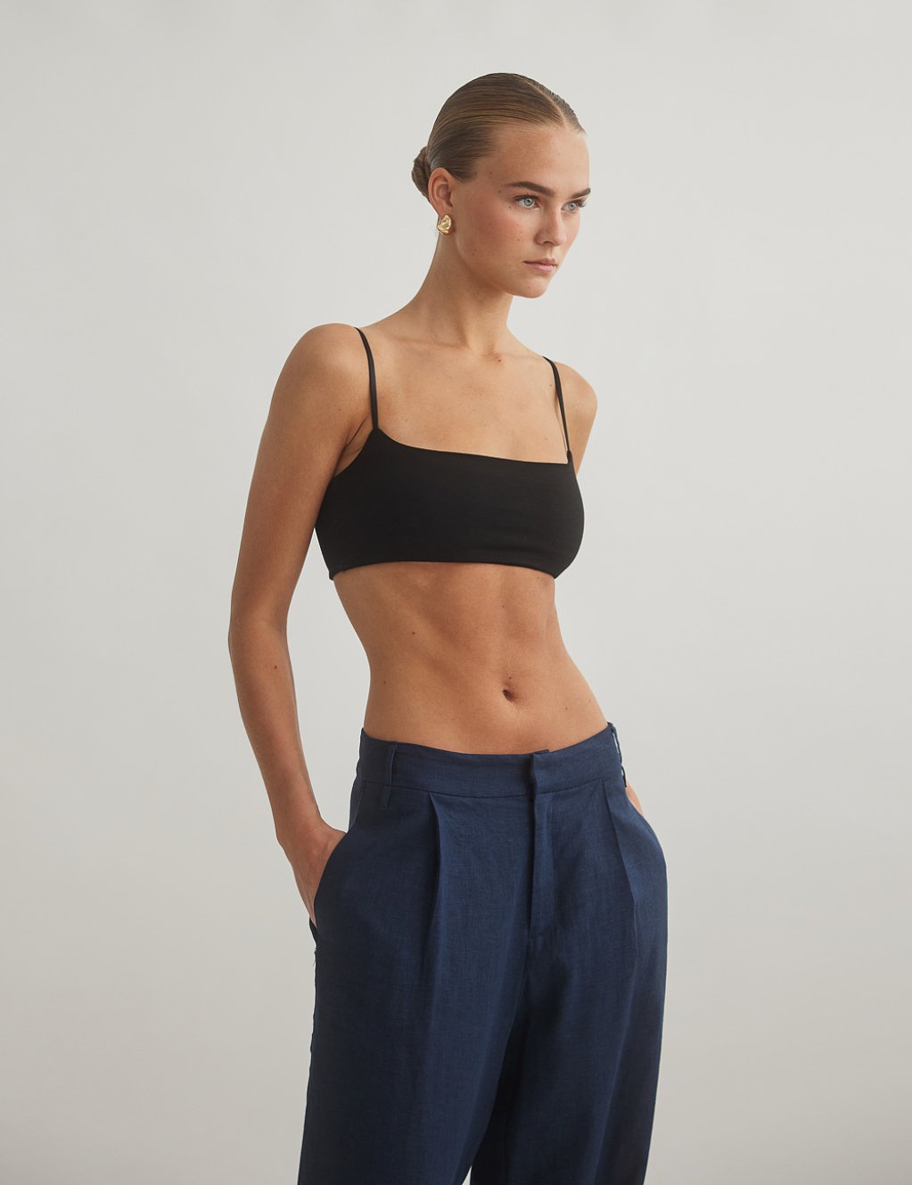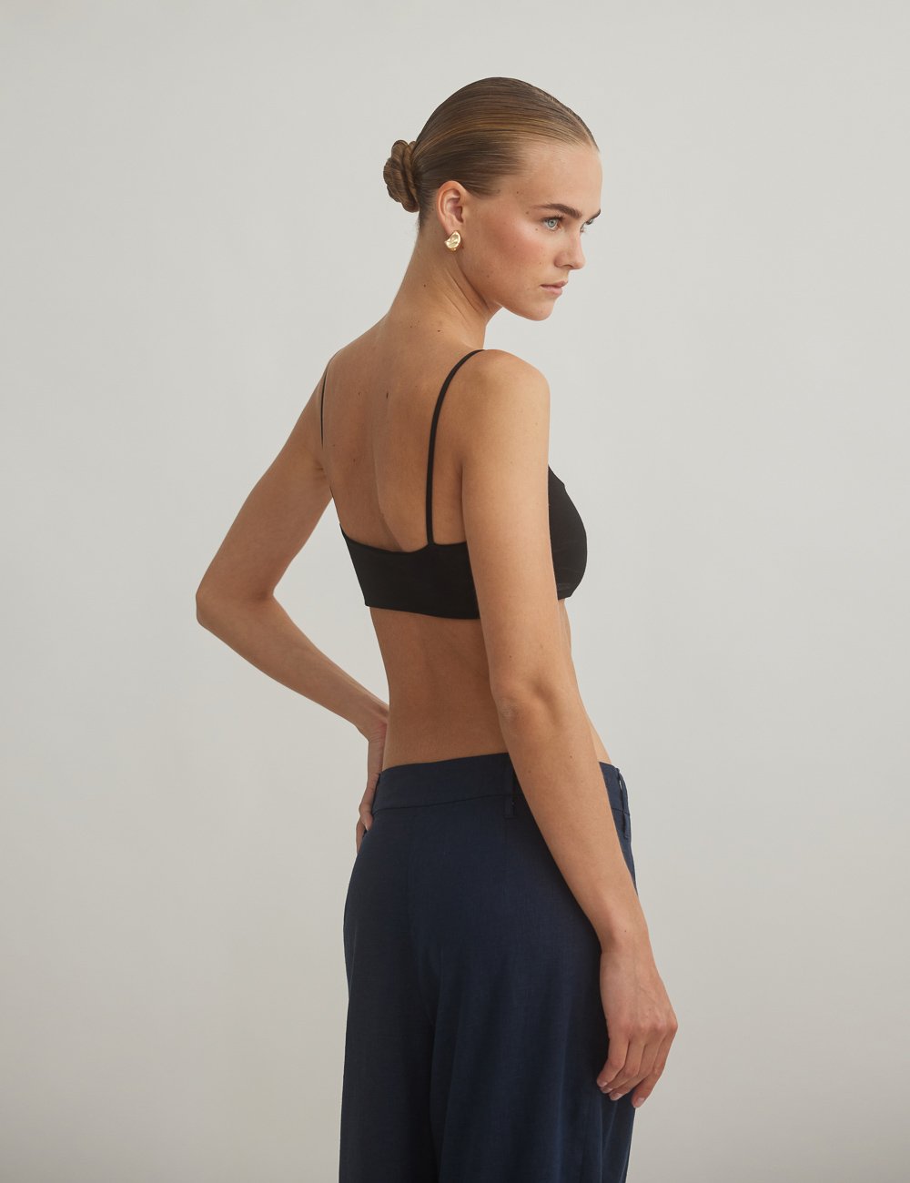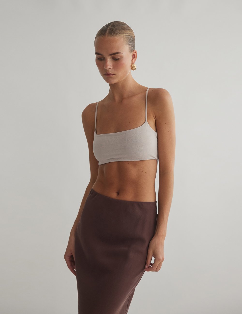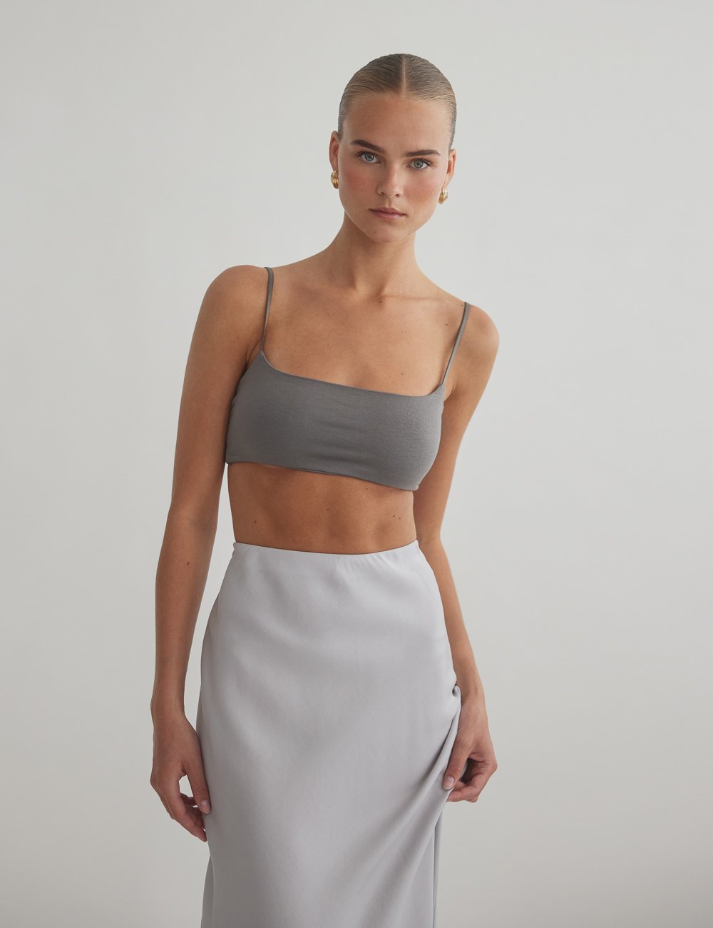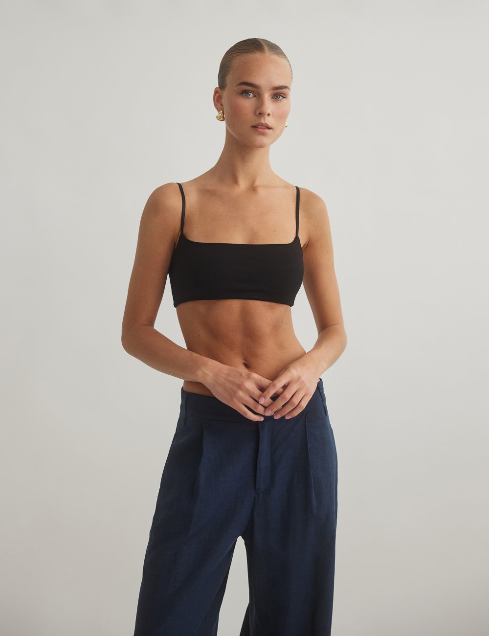 Ελαστικό crop τοπ με λεπτά τιραντάκια και ίσια λαιμόκοψη.