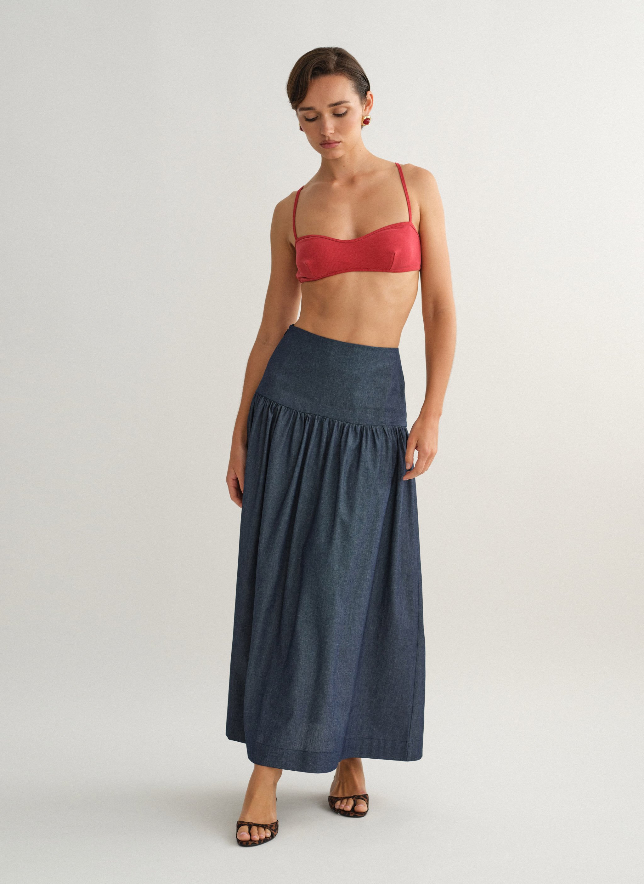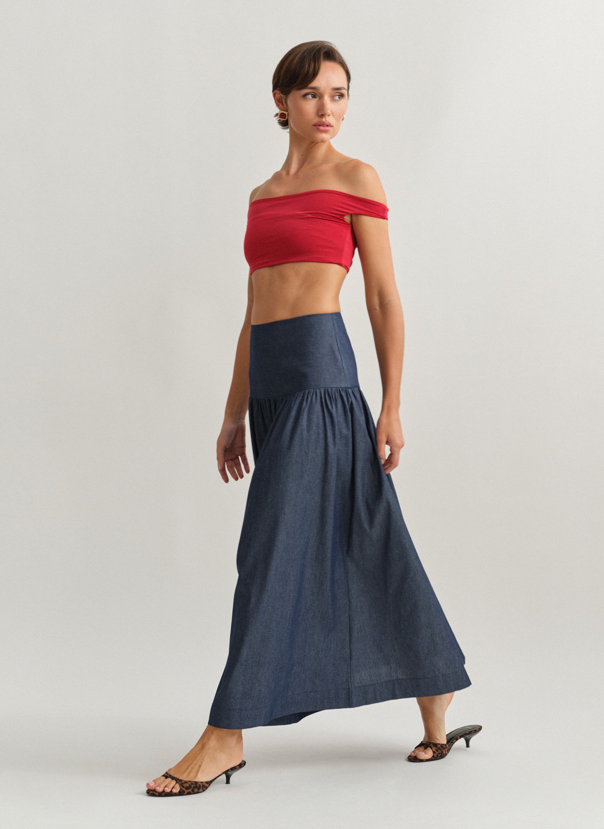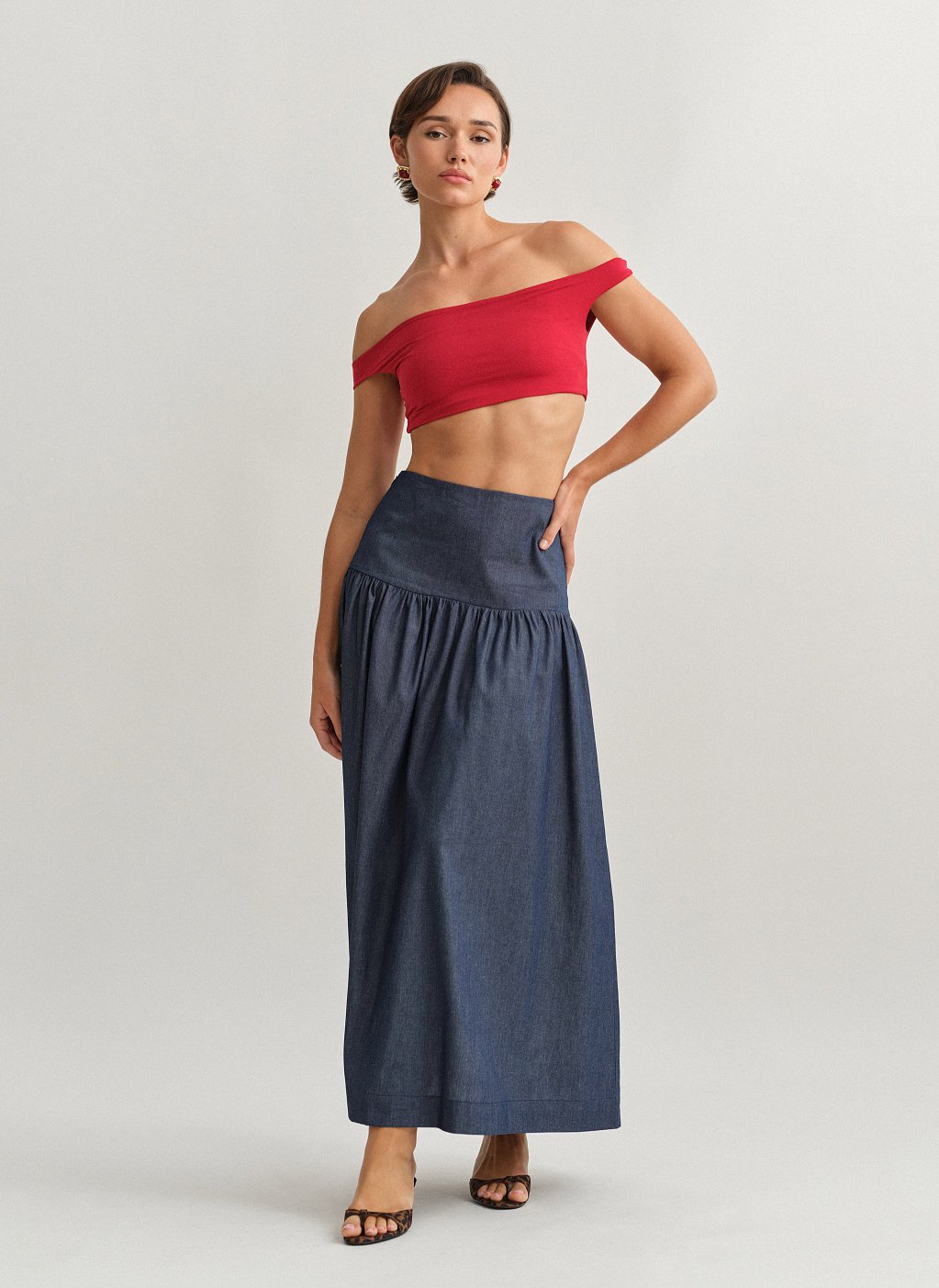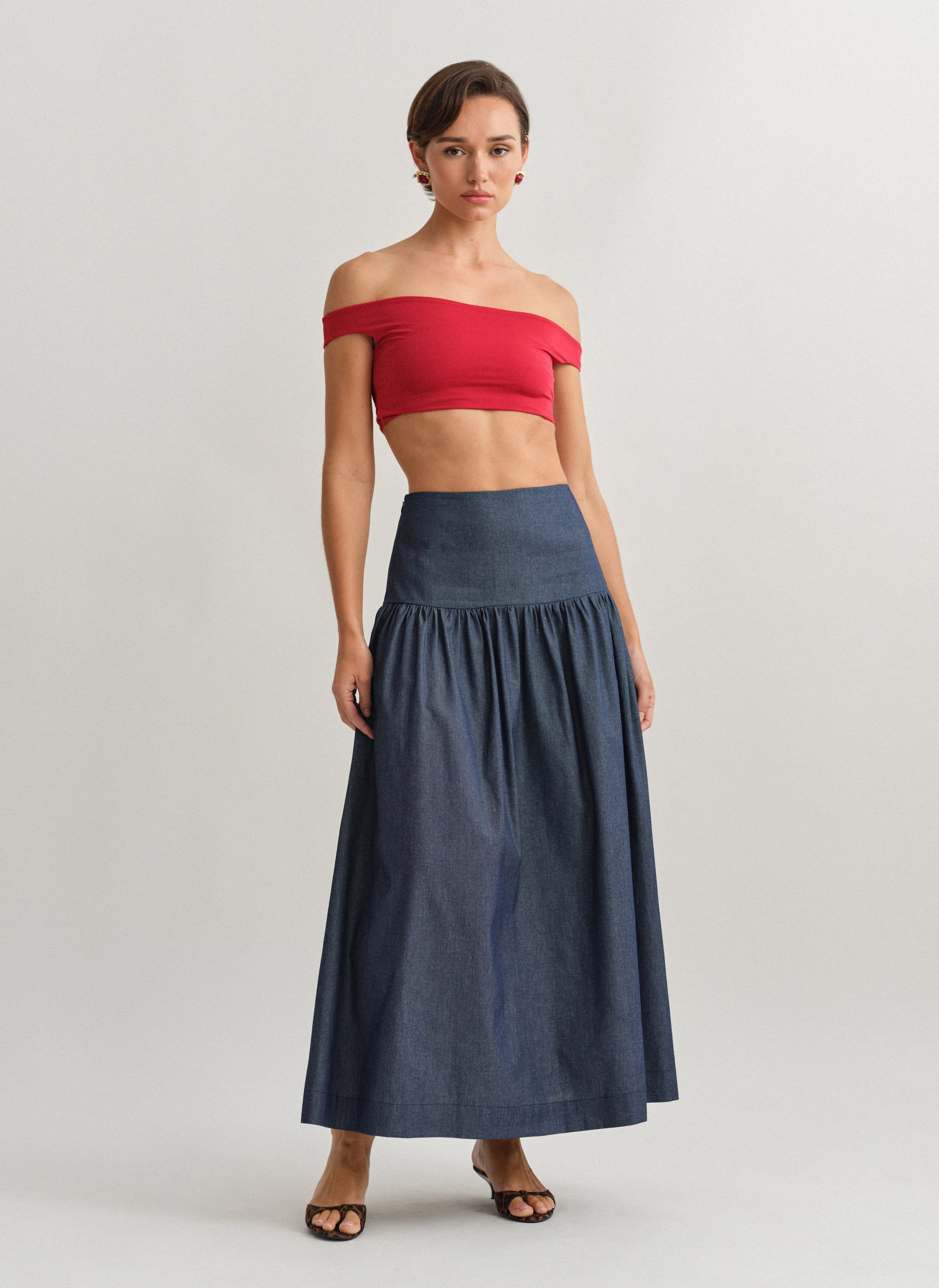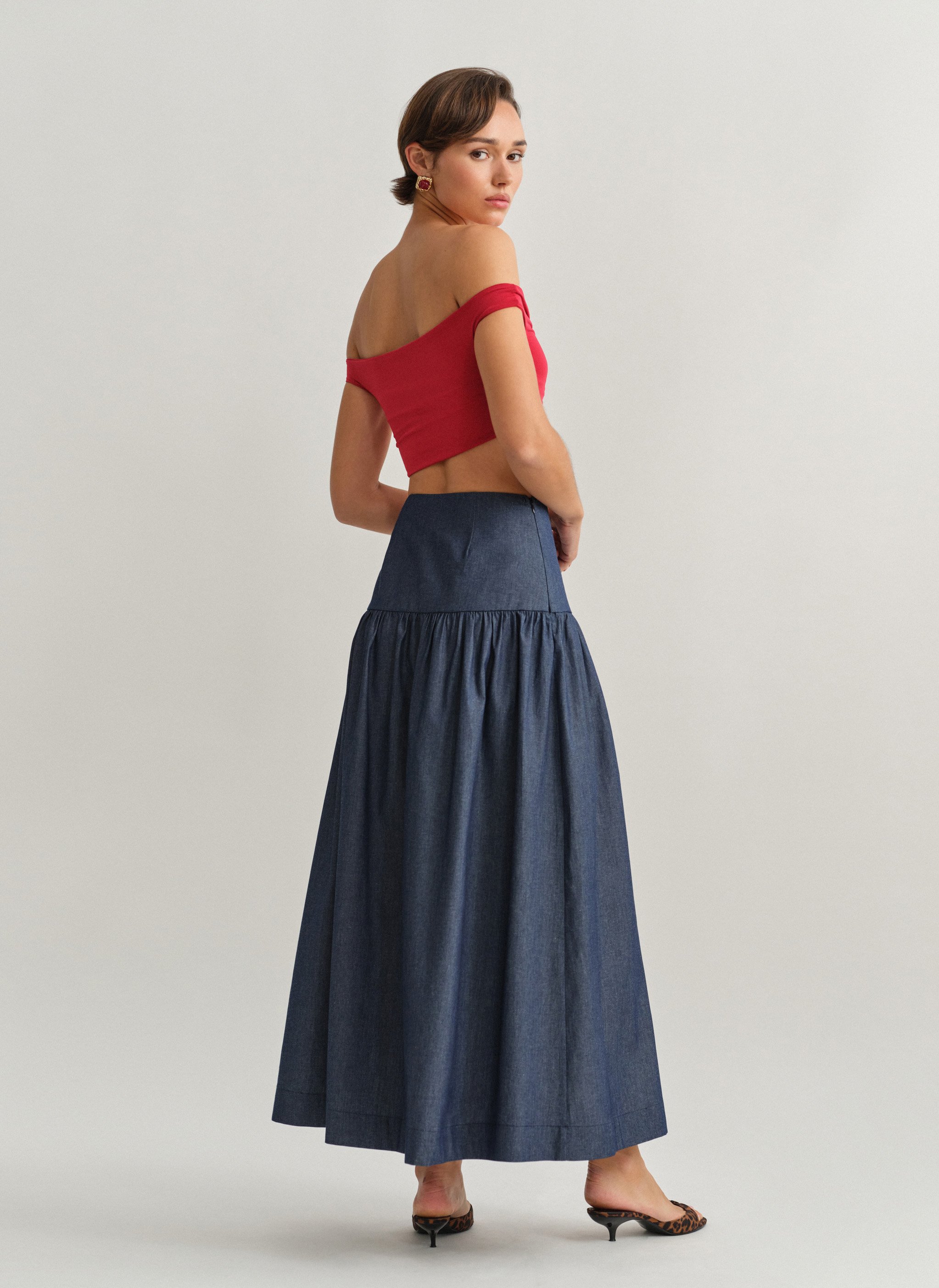 Denim μακριά φούστα με φαρδιά μπάσκα και σούρες.