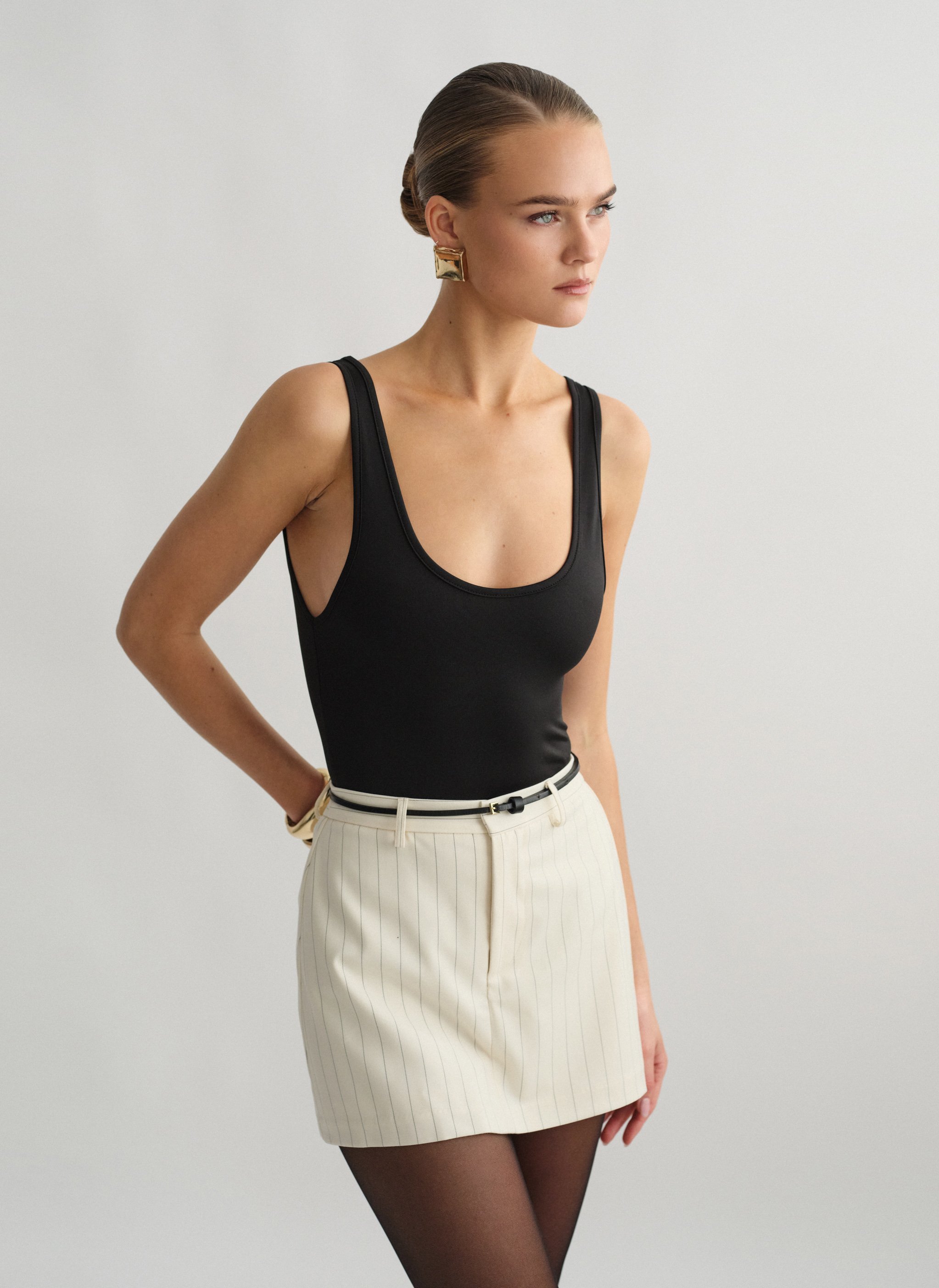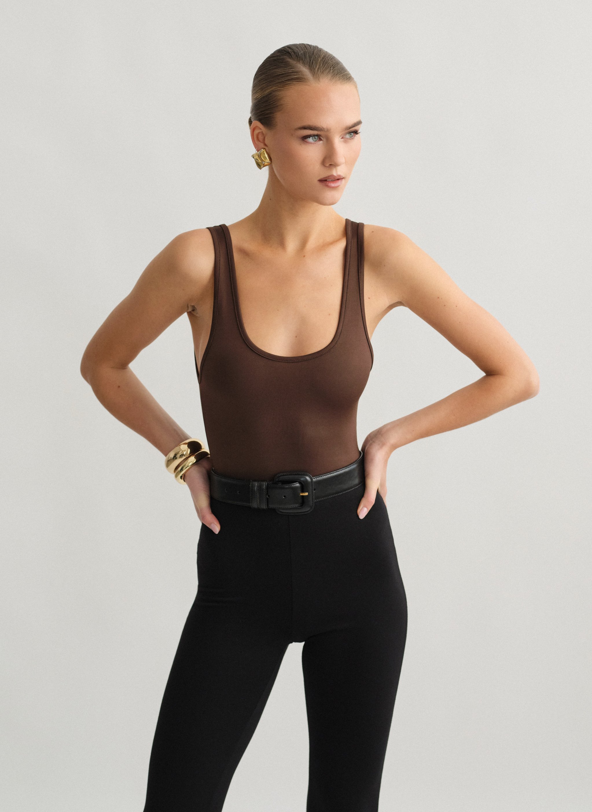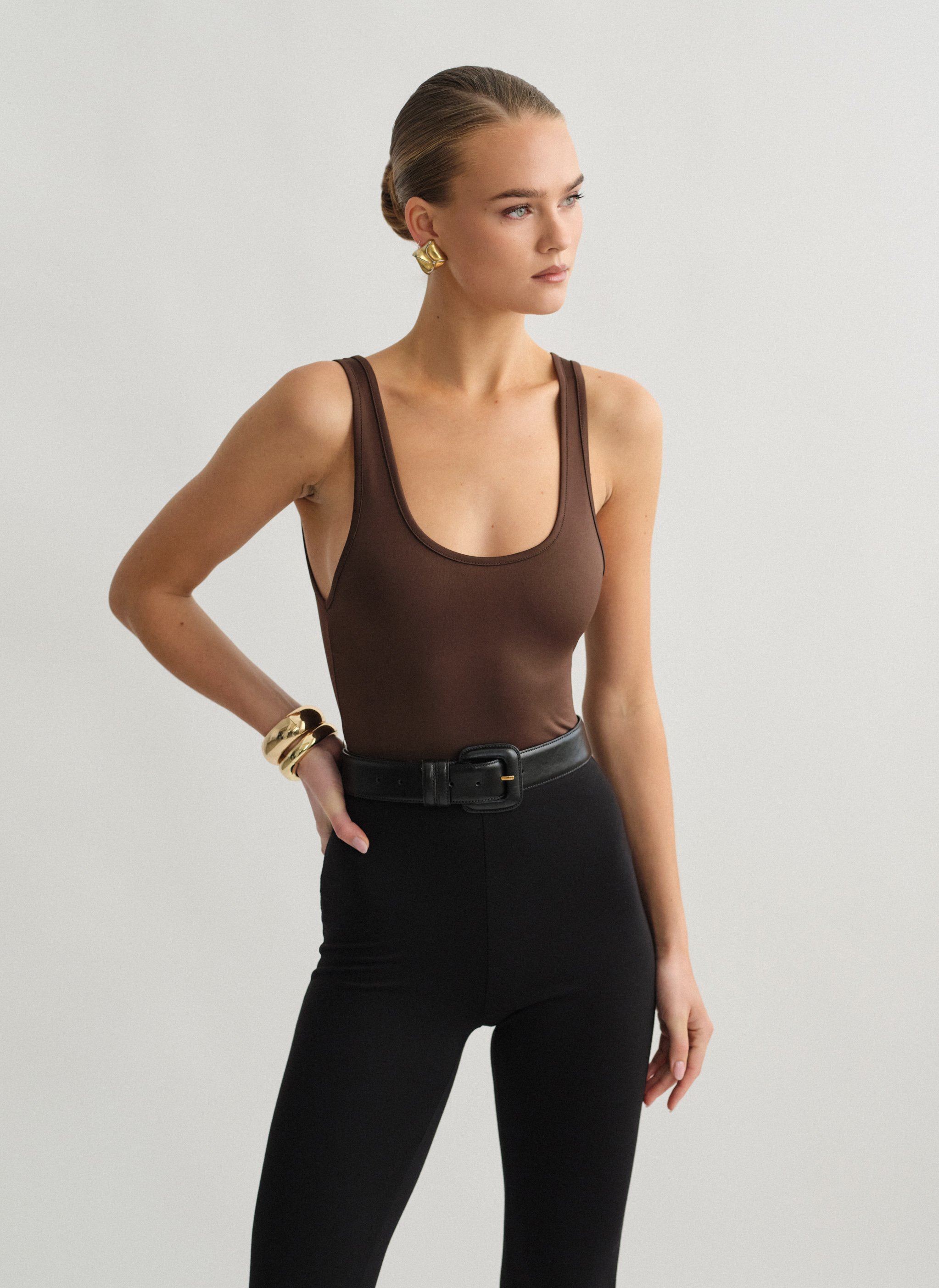 Ελαστικό αμάνικο κορμάκι με στρογγυλή λαιμόκοψη και χαμηλή πλάτη.