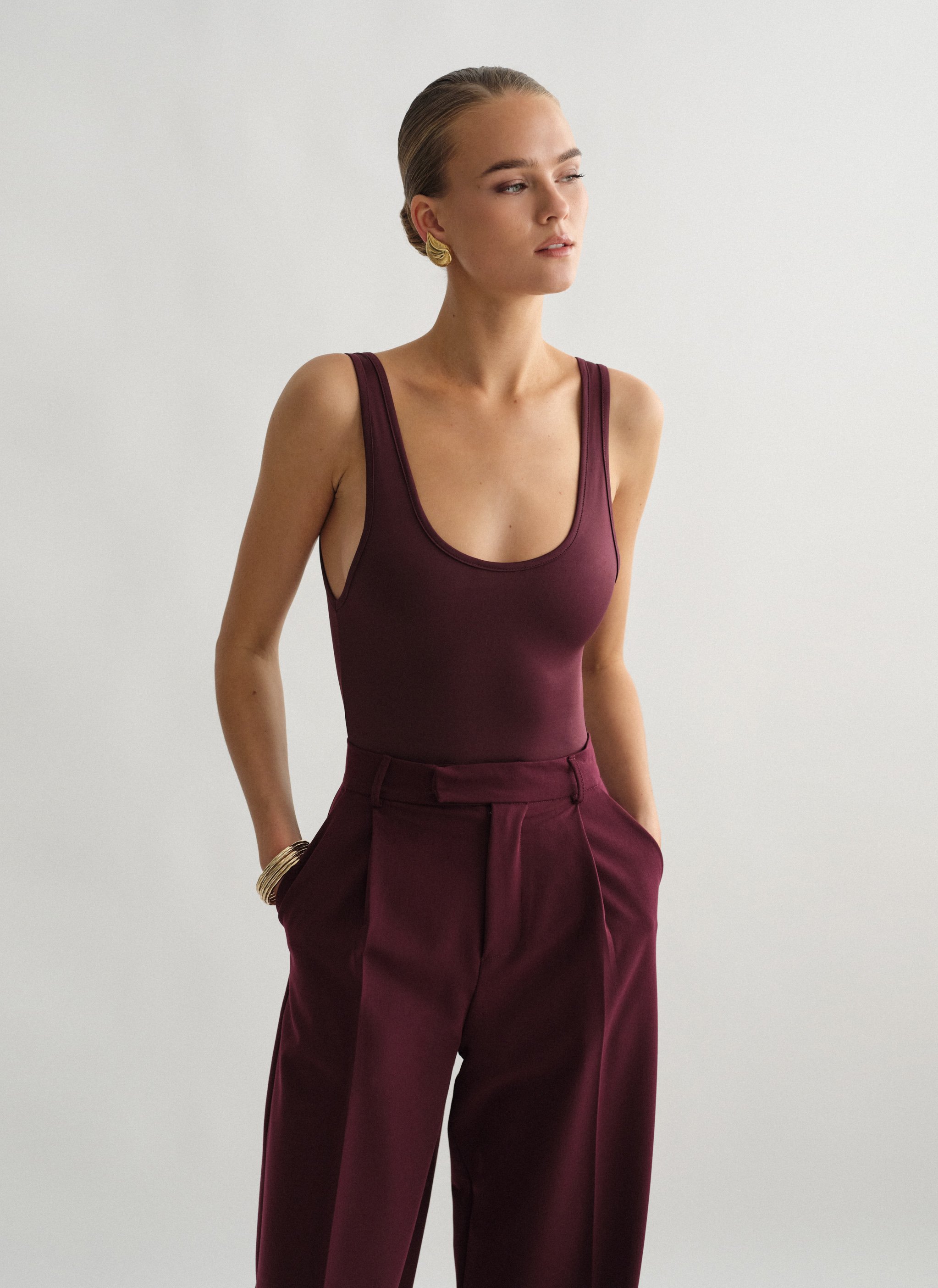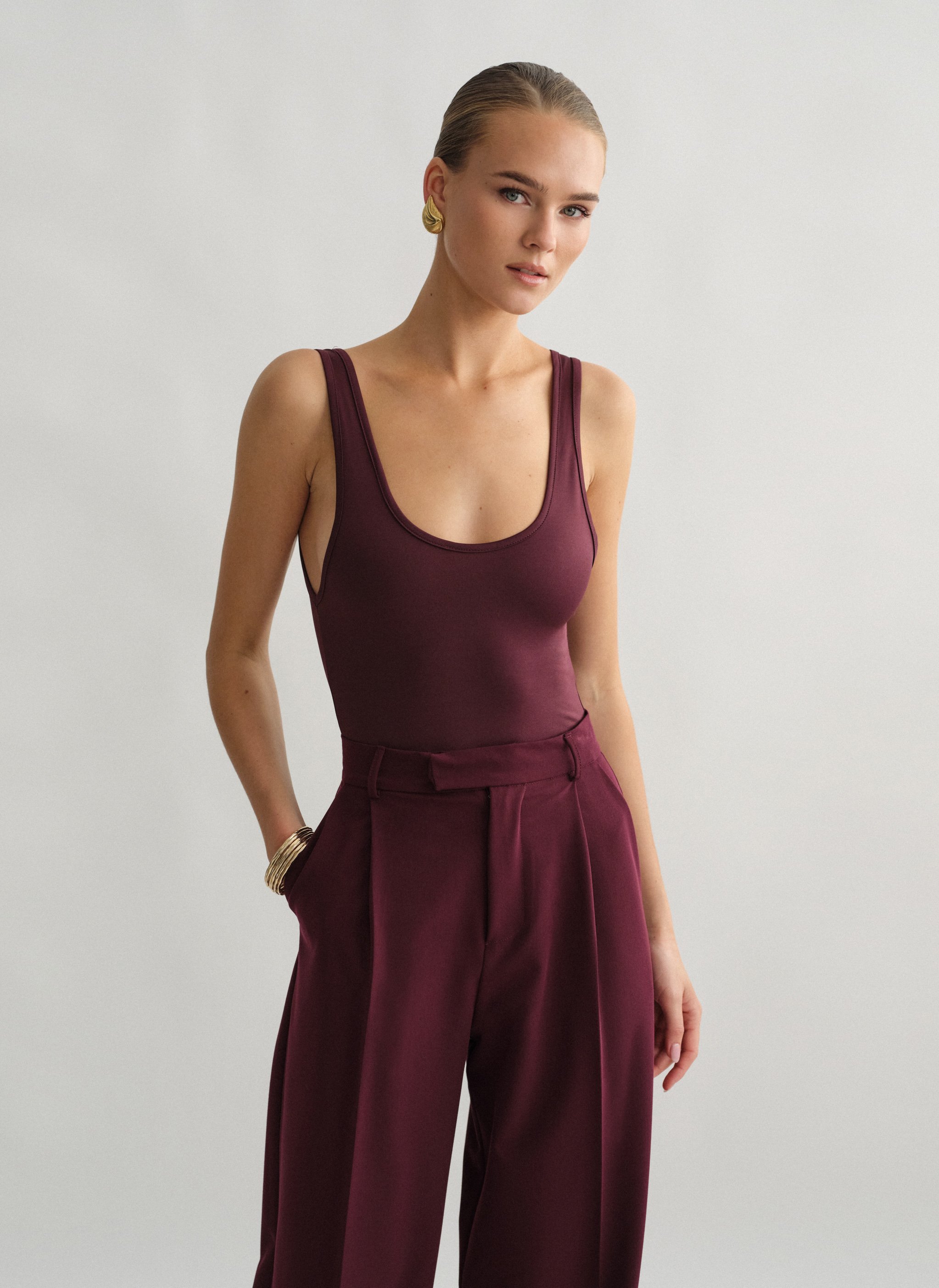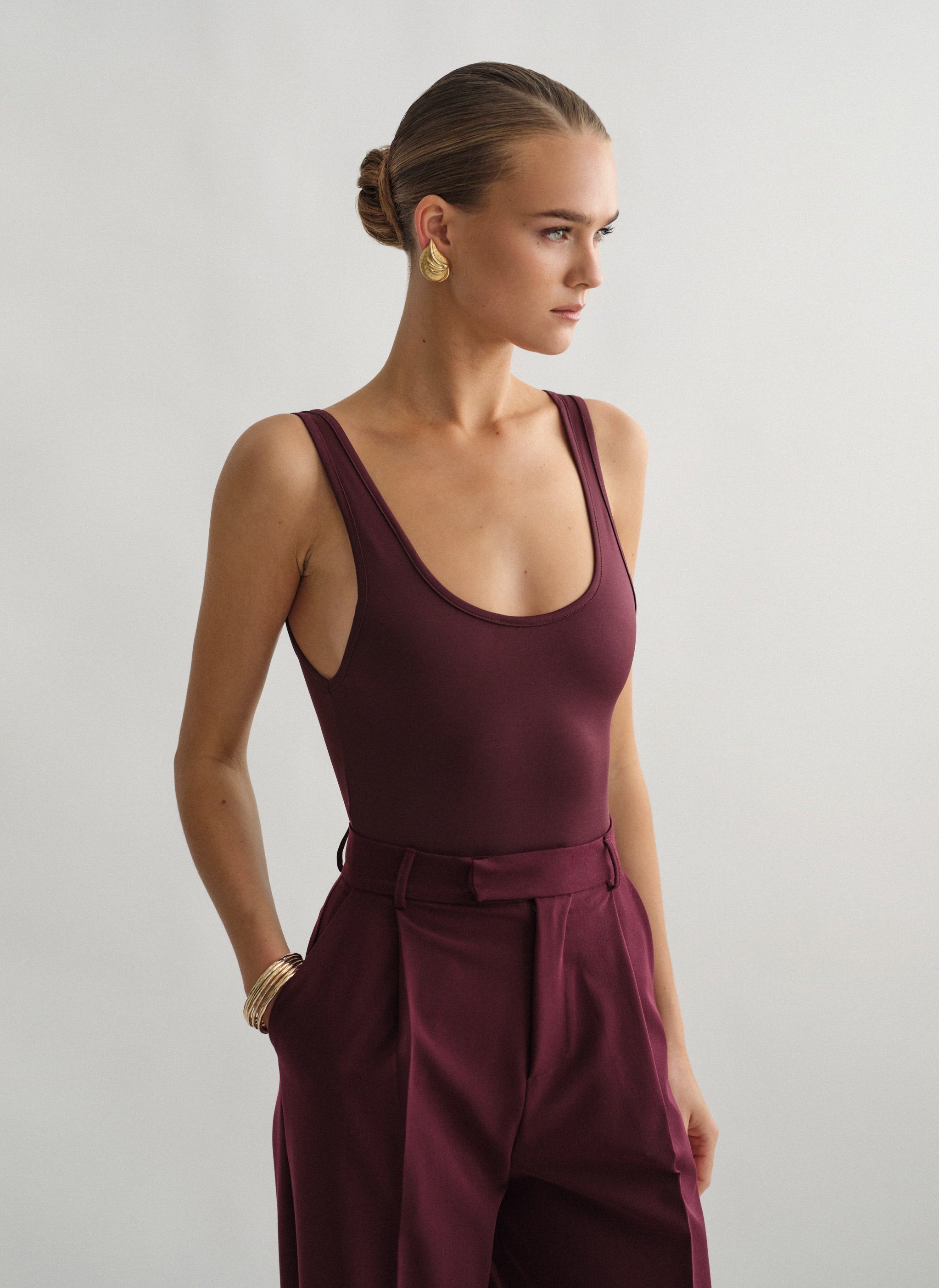 Ελαστικό αμάνικο κορμάκι με στρογγυλή λαιμόκοψη και χαμηλή πλάτη.