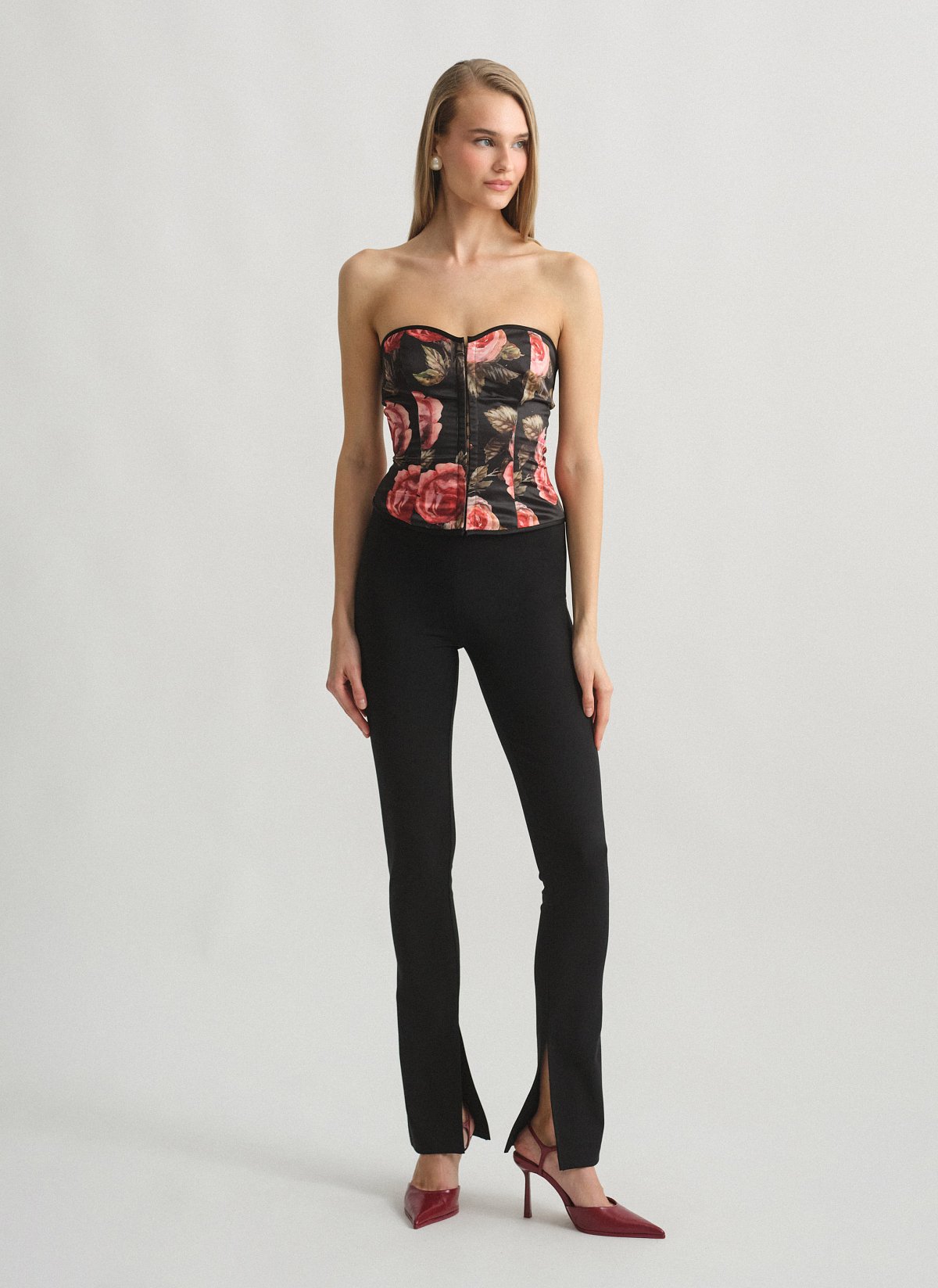 Ελαστικό εφαρμοστό ψηλόμεσο παντελόνι με σκίσιμο εσωτερικά στο μπατζάκι και κλείσιμο με κρυφό φερμουάρ στο πλάι.