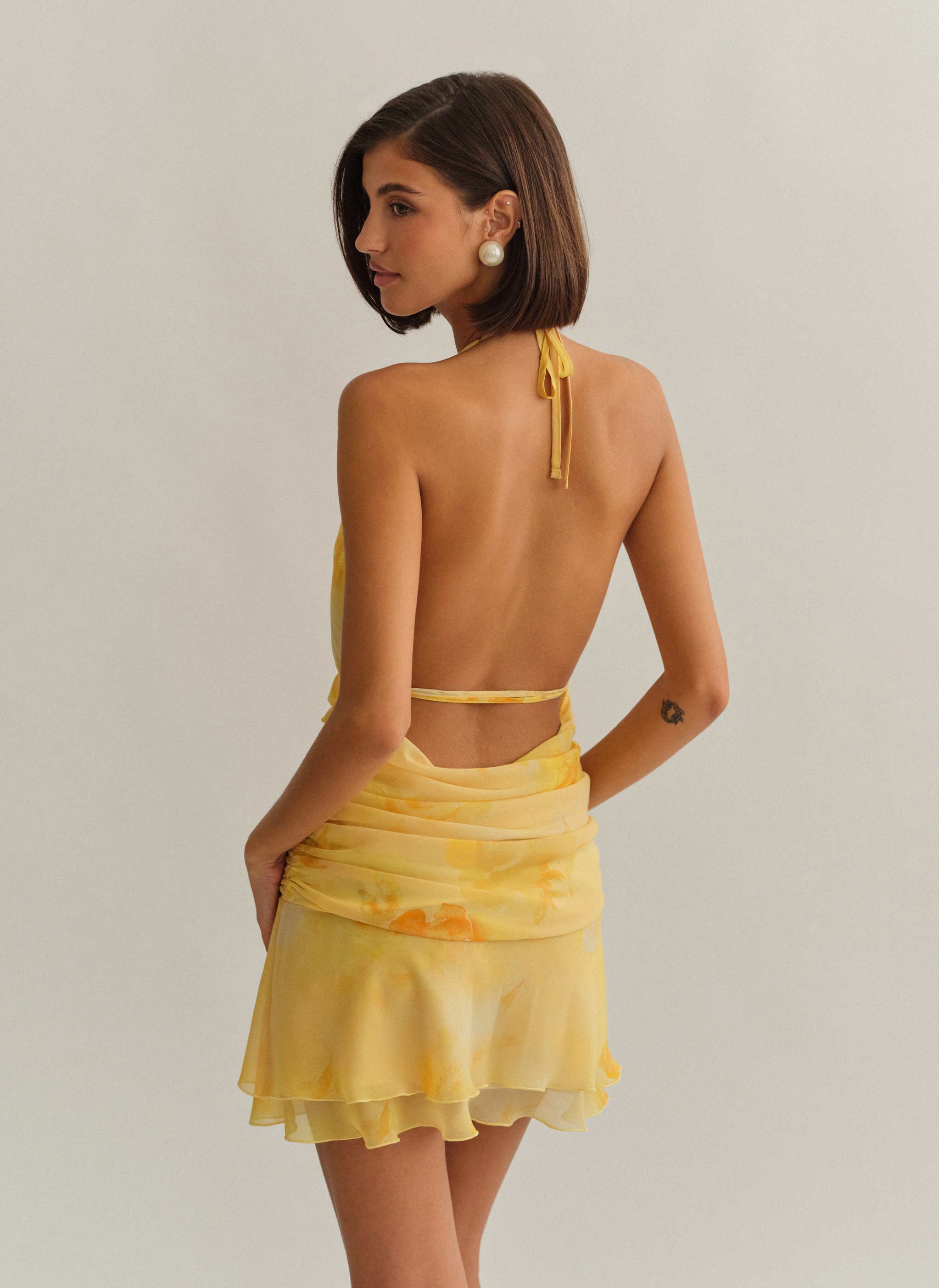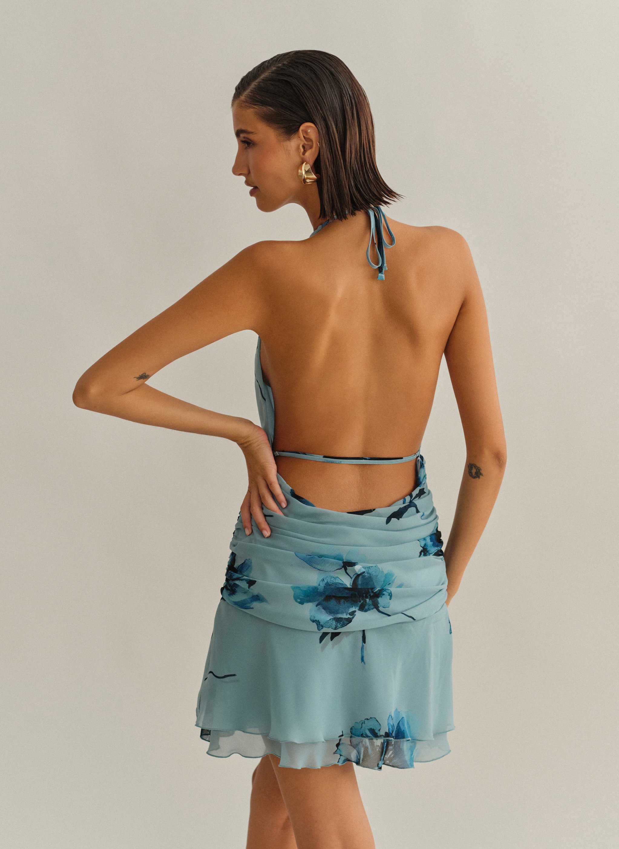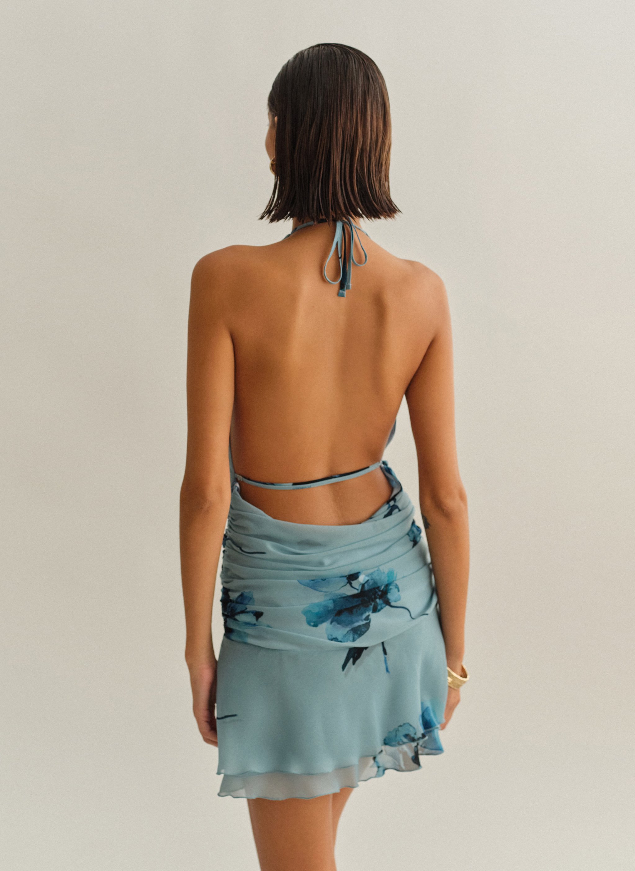 Εμπριμέ halter μίνι φόρεμα με σούρες και βαθύ V ντεκολτέ.