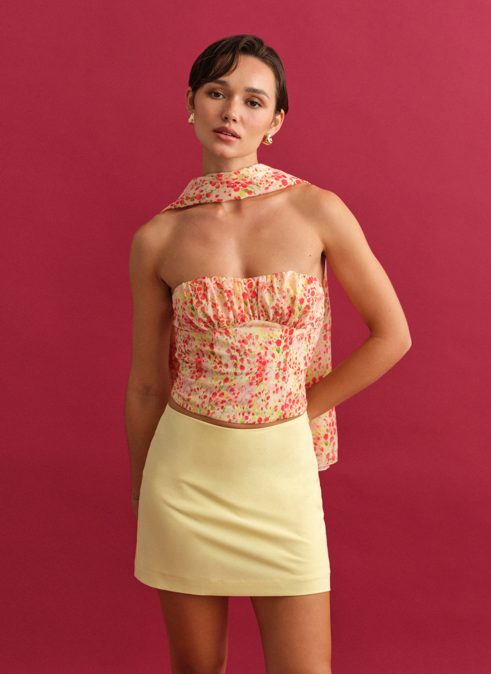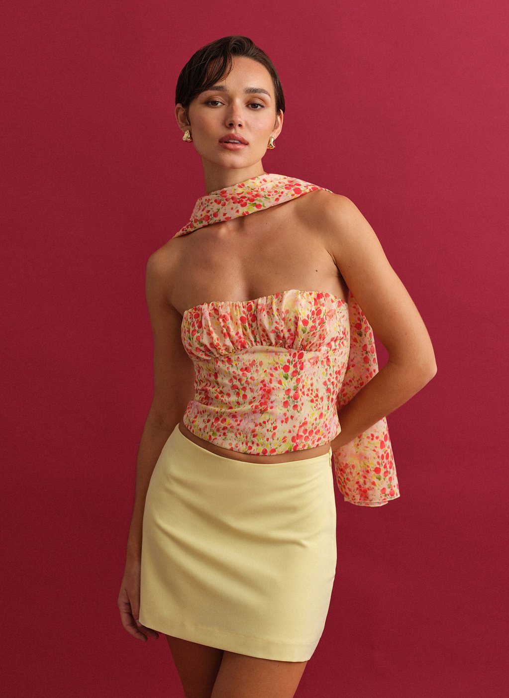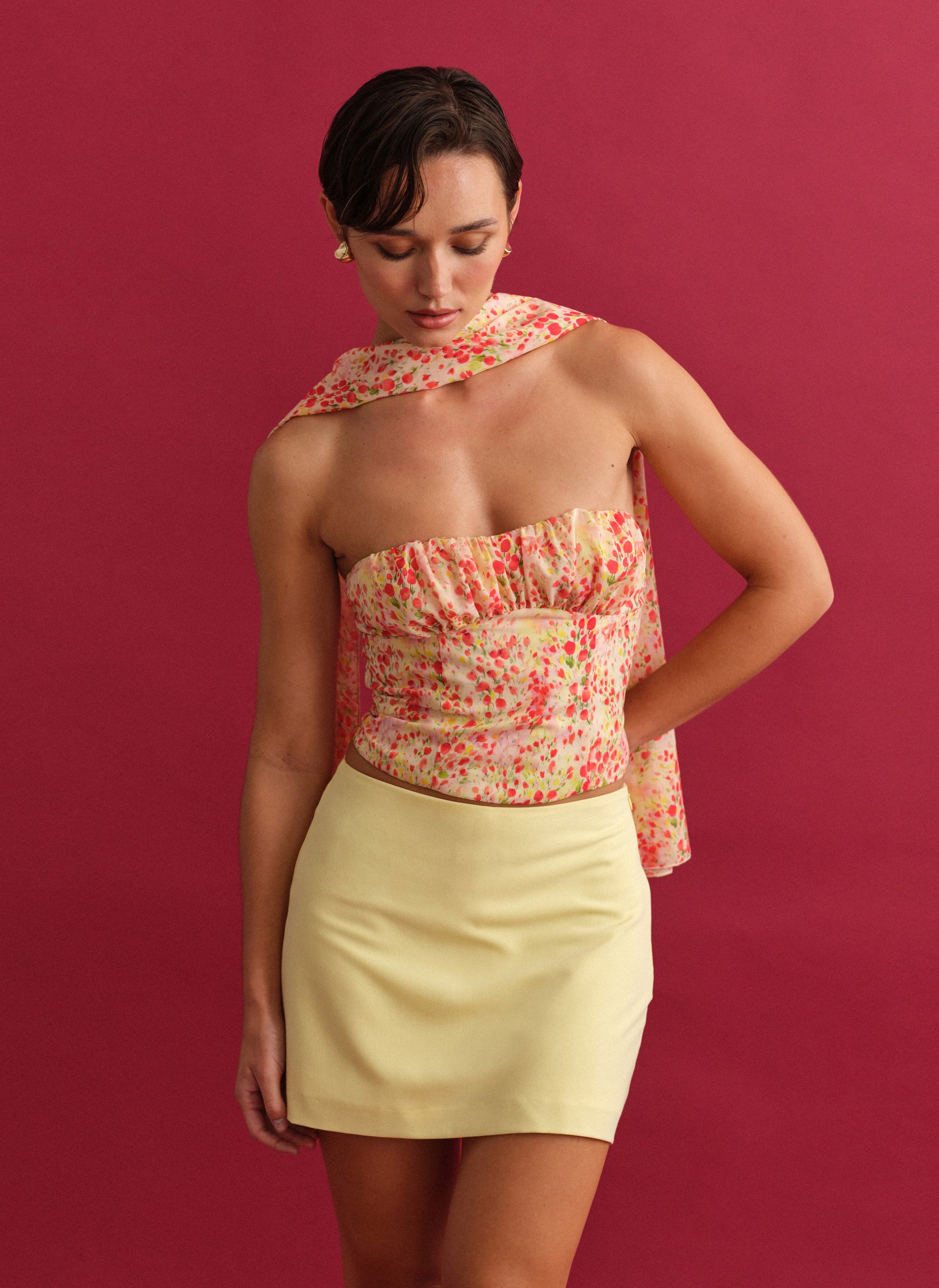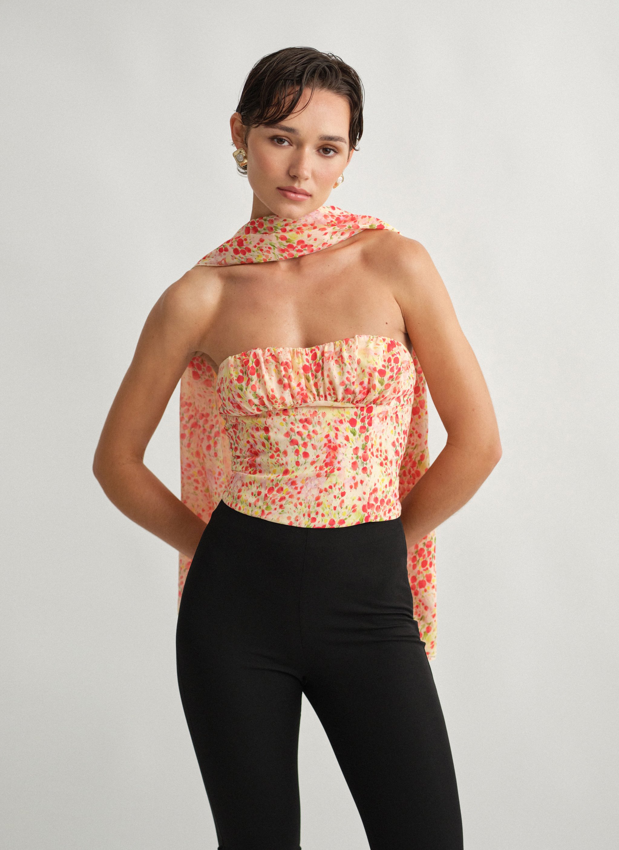 Εμπριμέ στράπλες τοπ με σούρες στο ντεκολτέ.