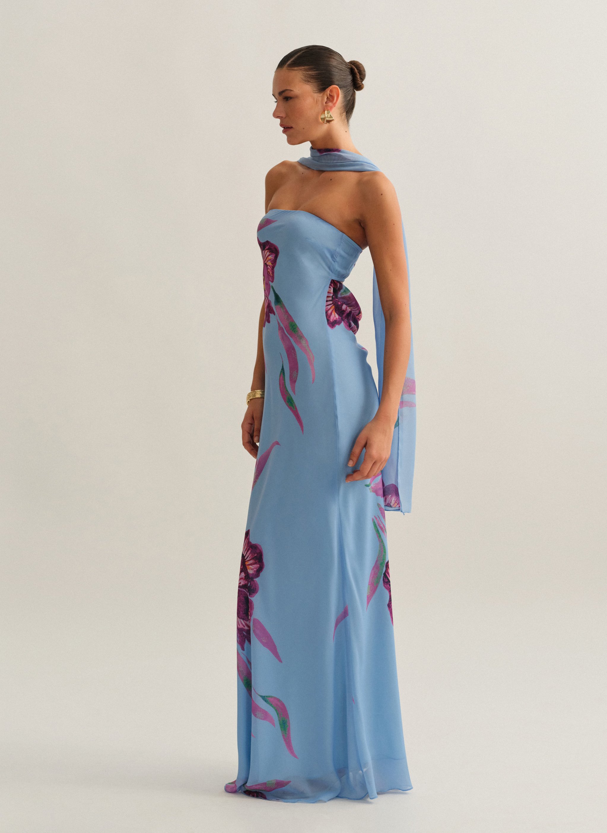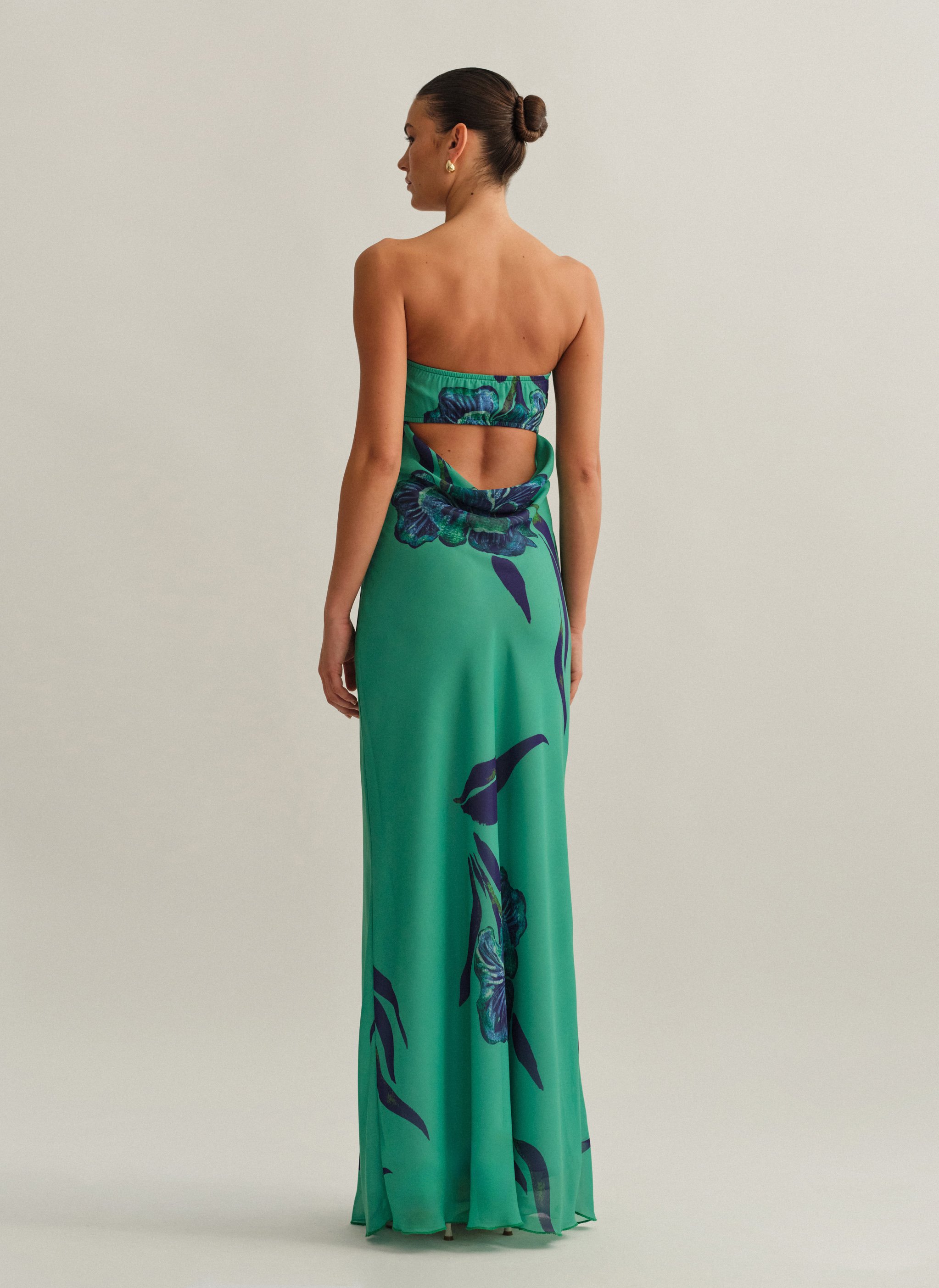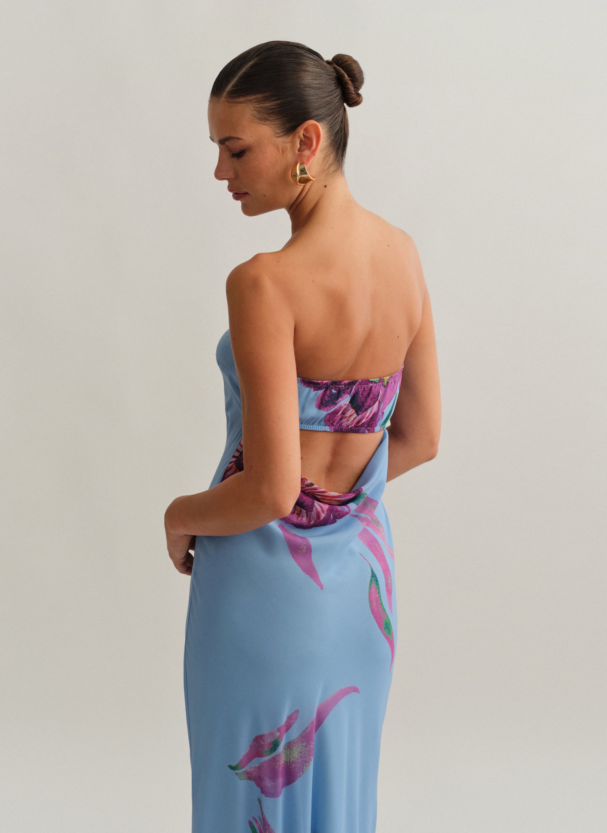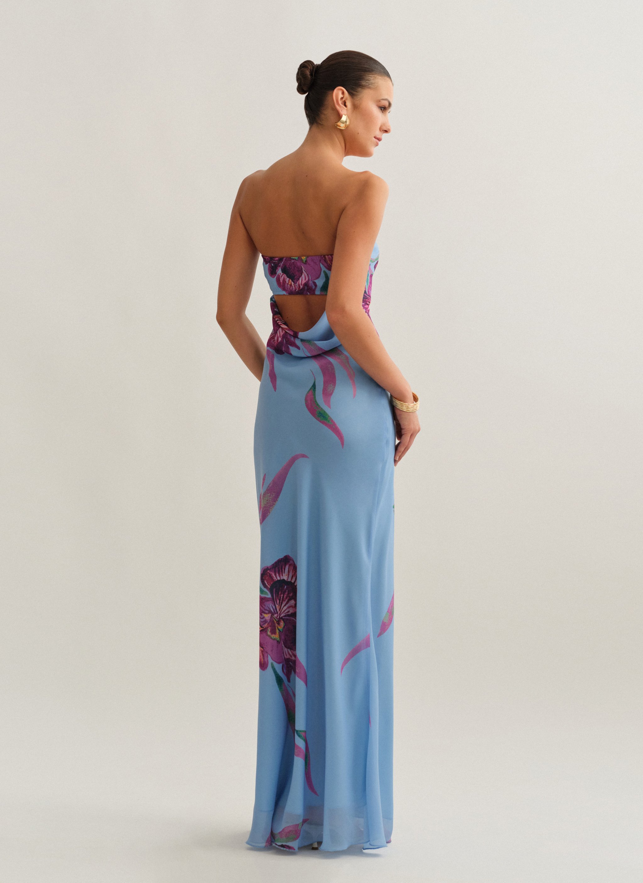 Eμπριμέ maxi στράπλες φόρεμα με φουλάρι και cut-out ντραπέ πλάτη.