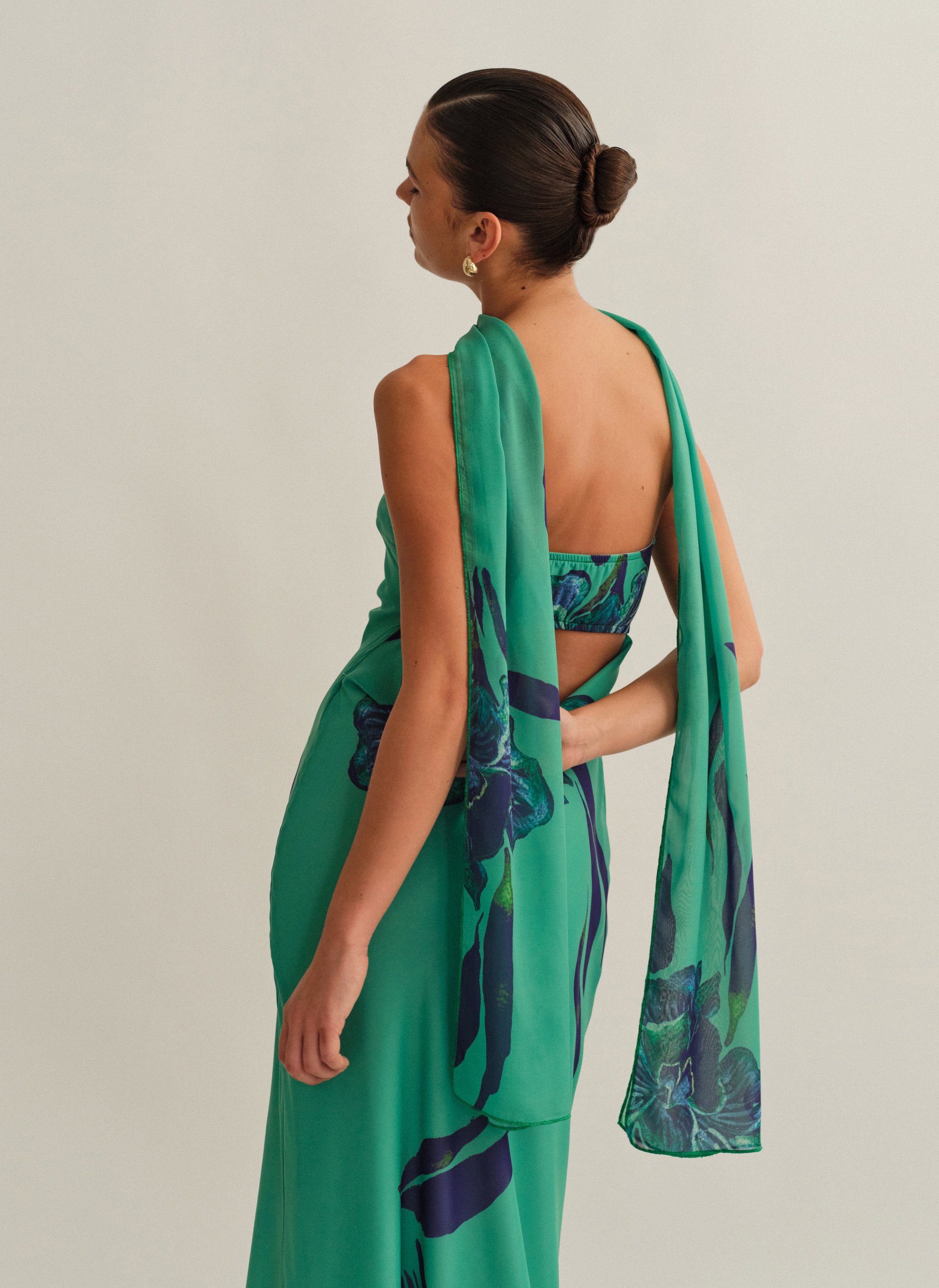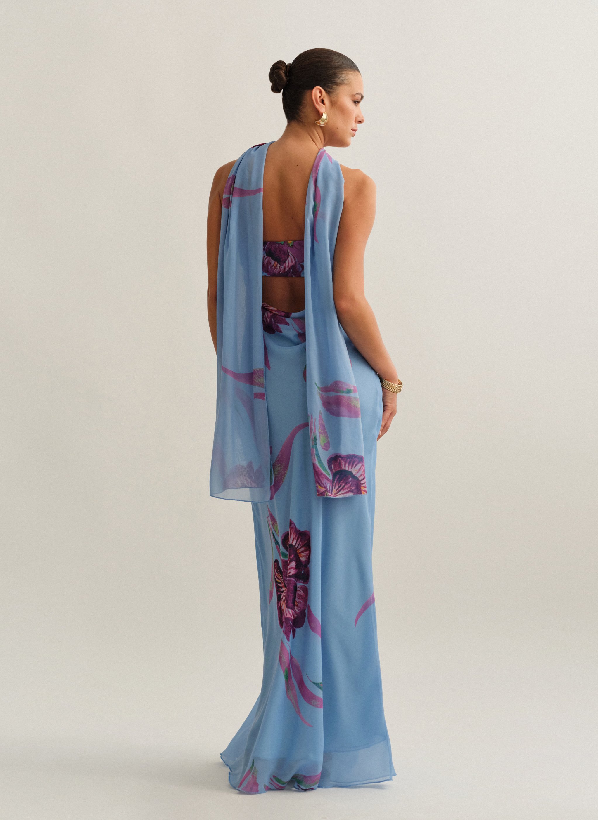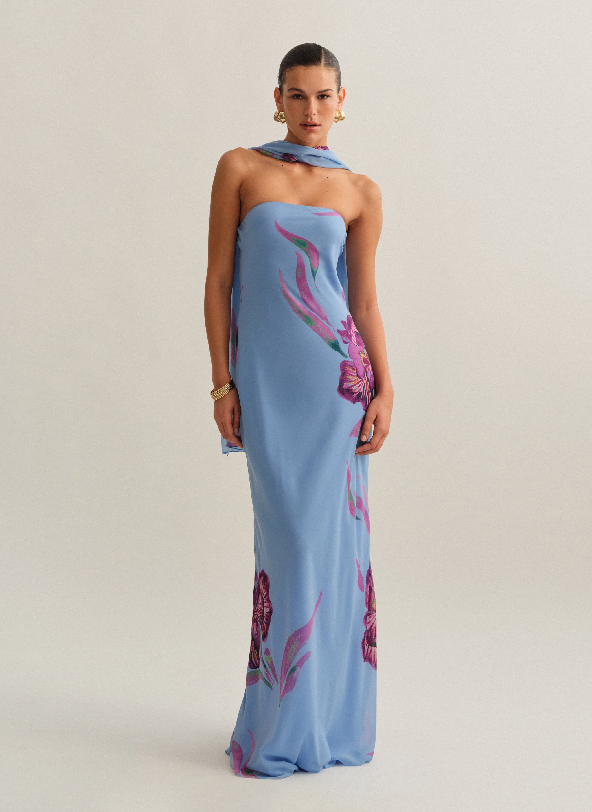 Eμπριμέ maxi στράπλες φόρεμα με φουλάρι και cut-out ντραπέ πλάτη.