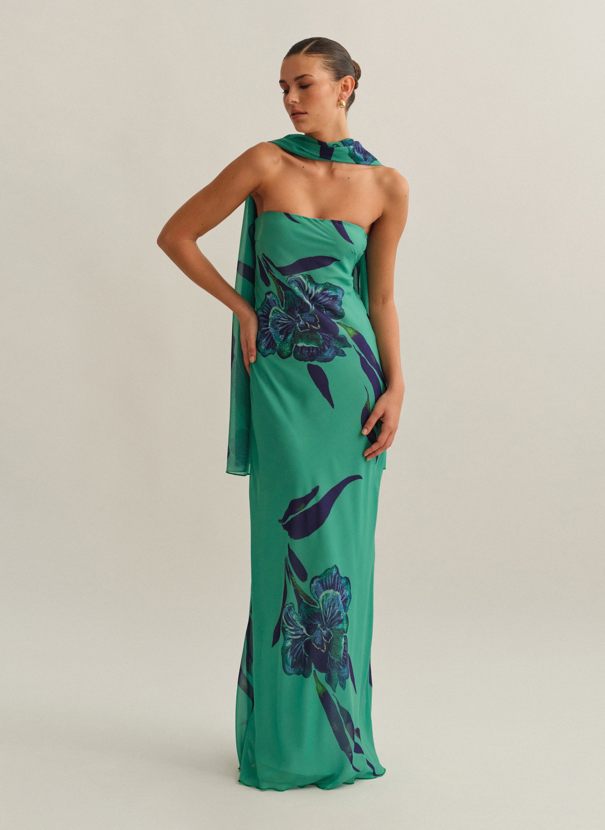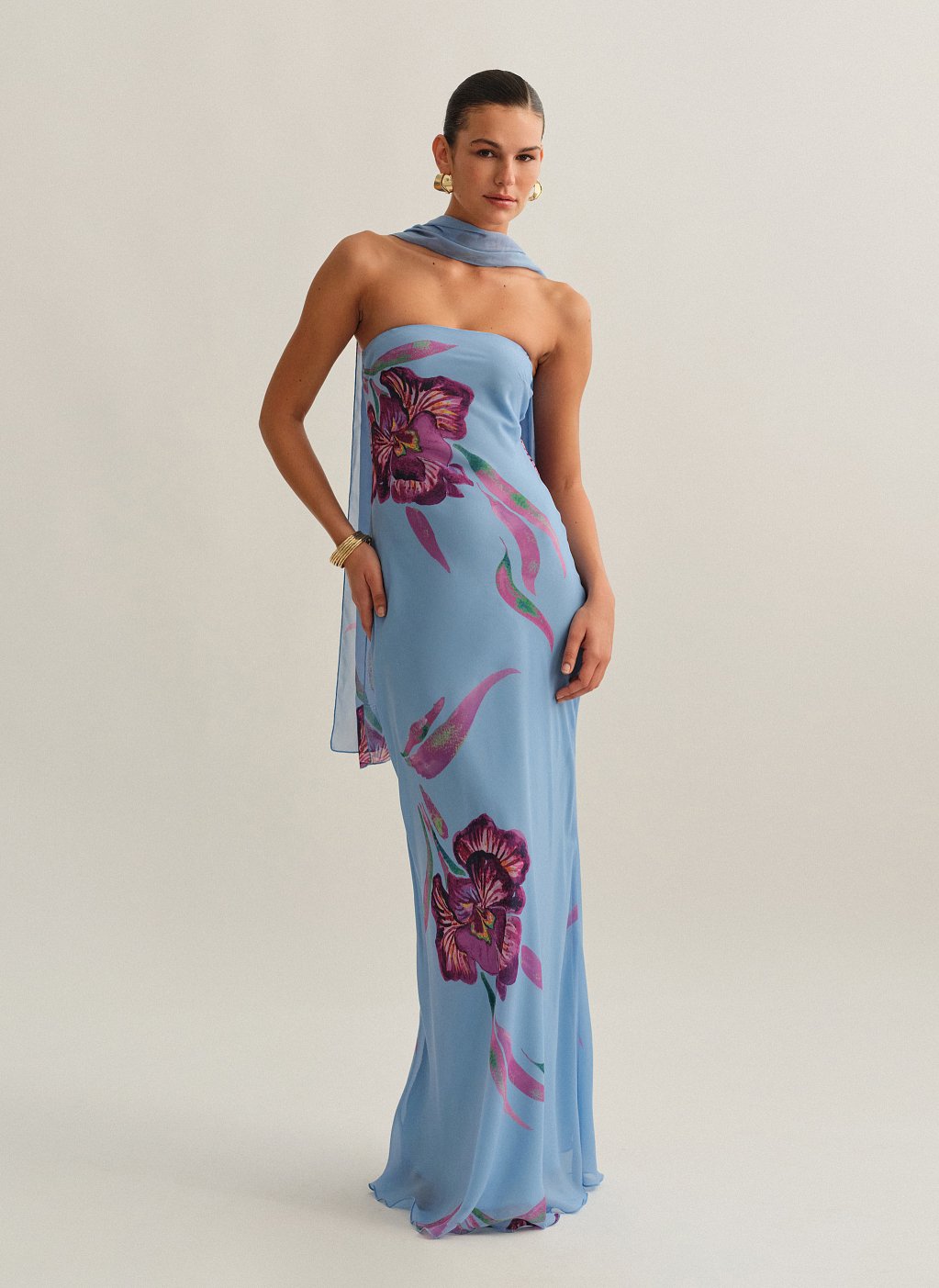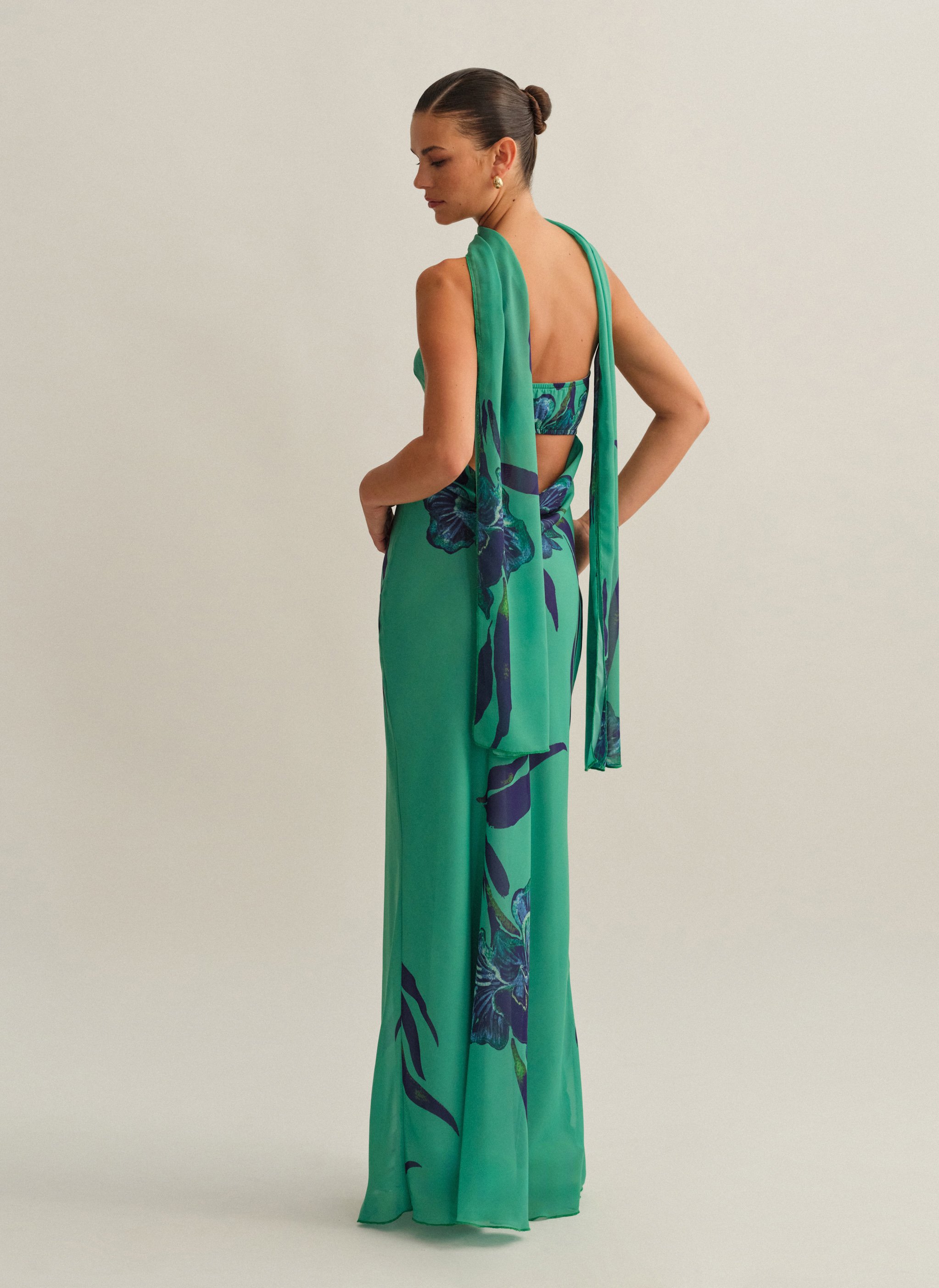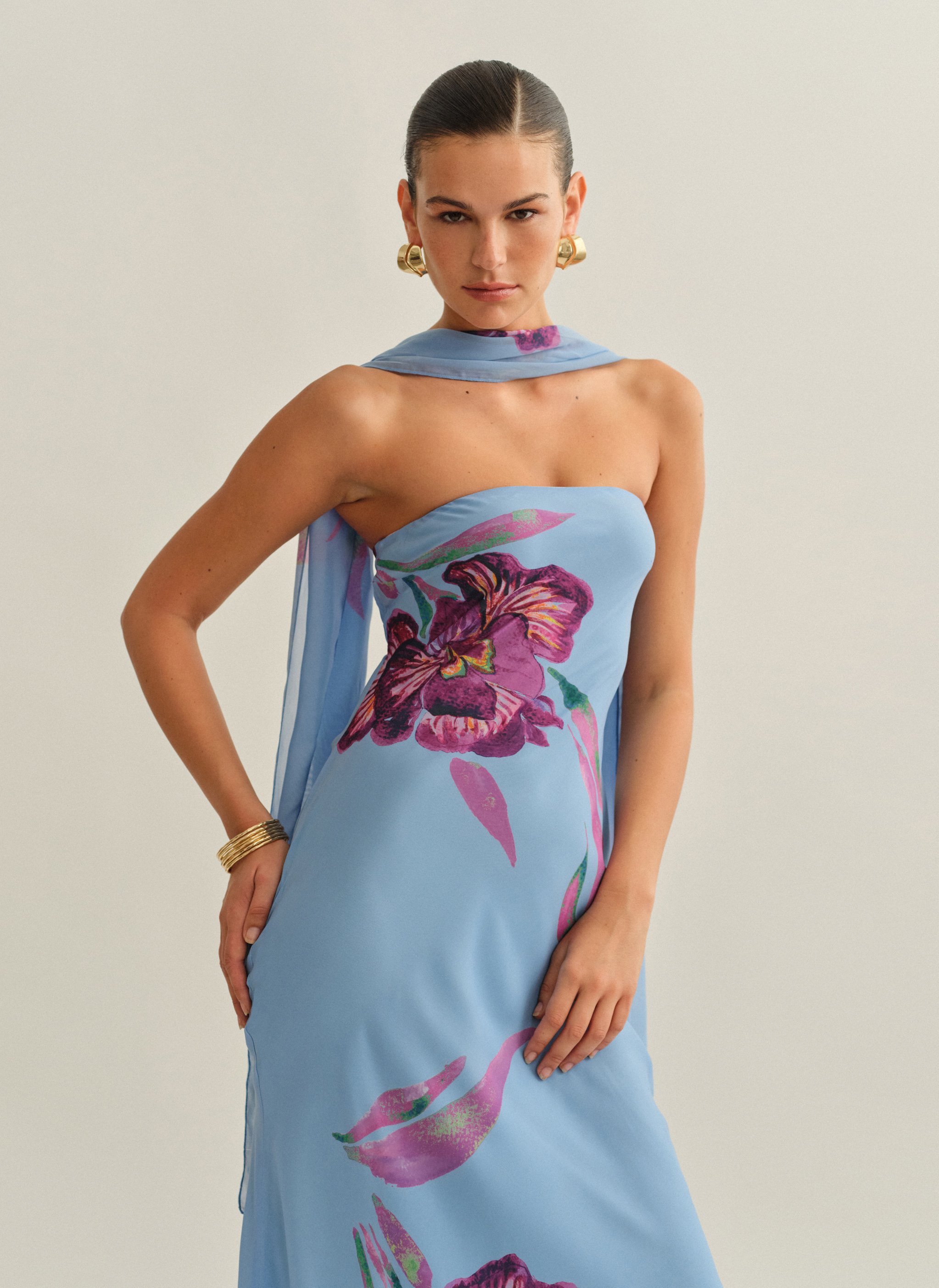 Eμπριμέ maxi στράπλες φόρεμα με φουλάρι και cut-out ντραπέ πλάτη.