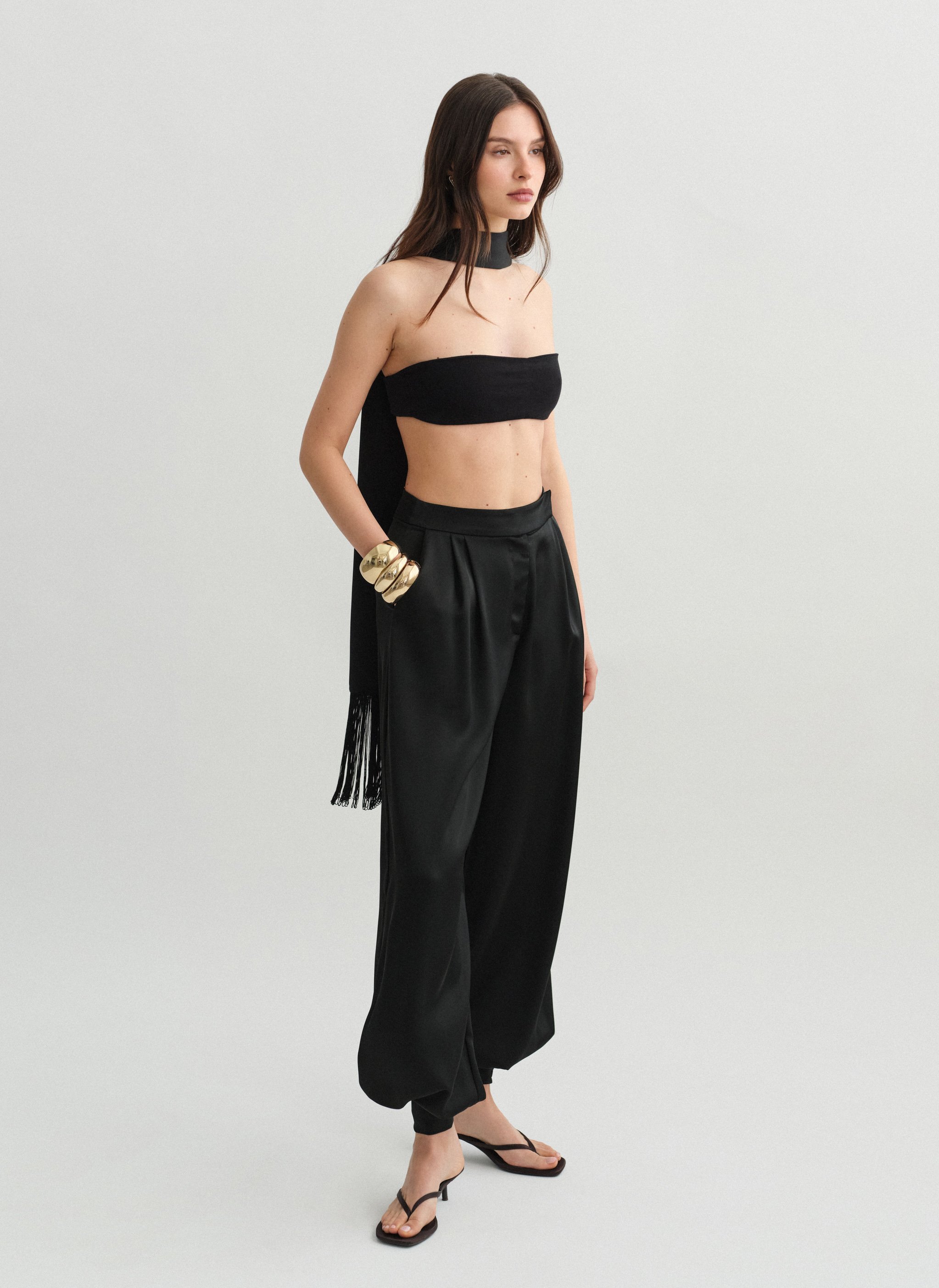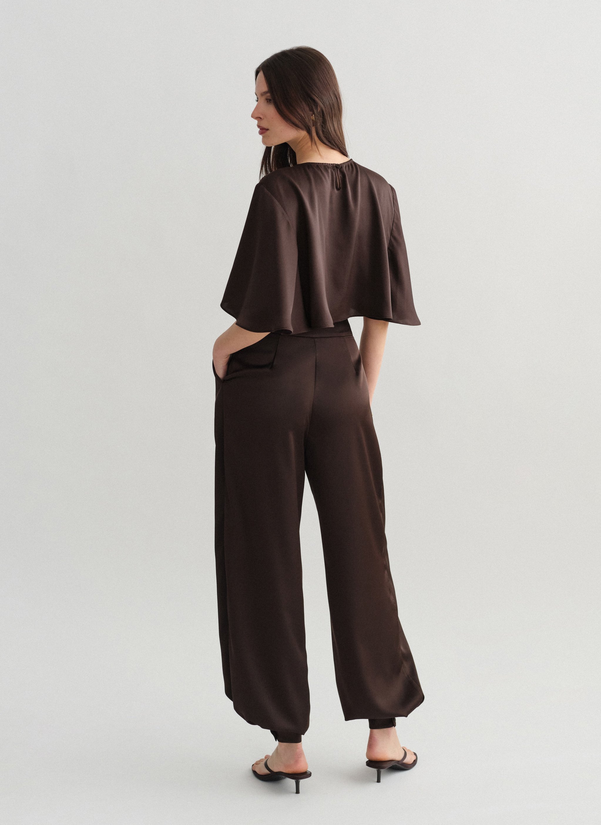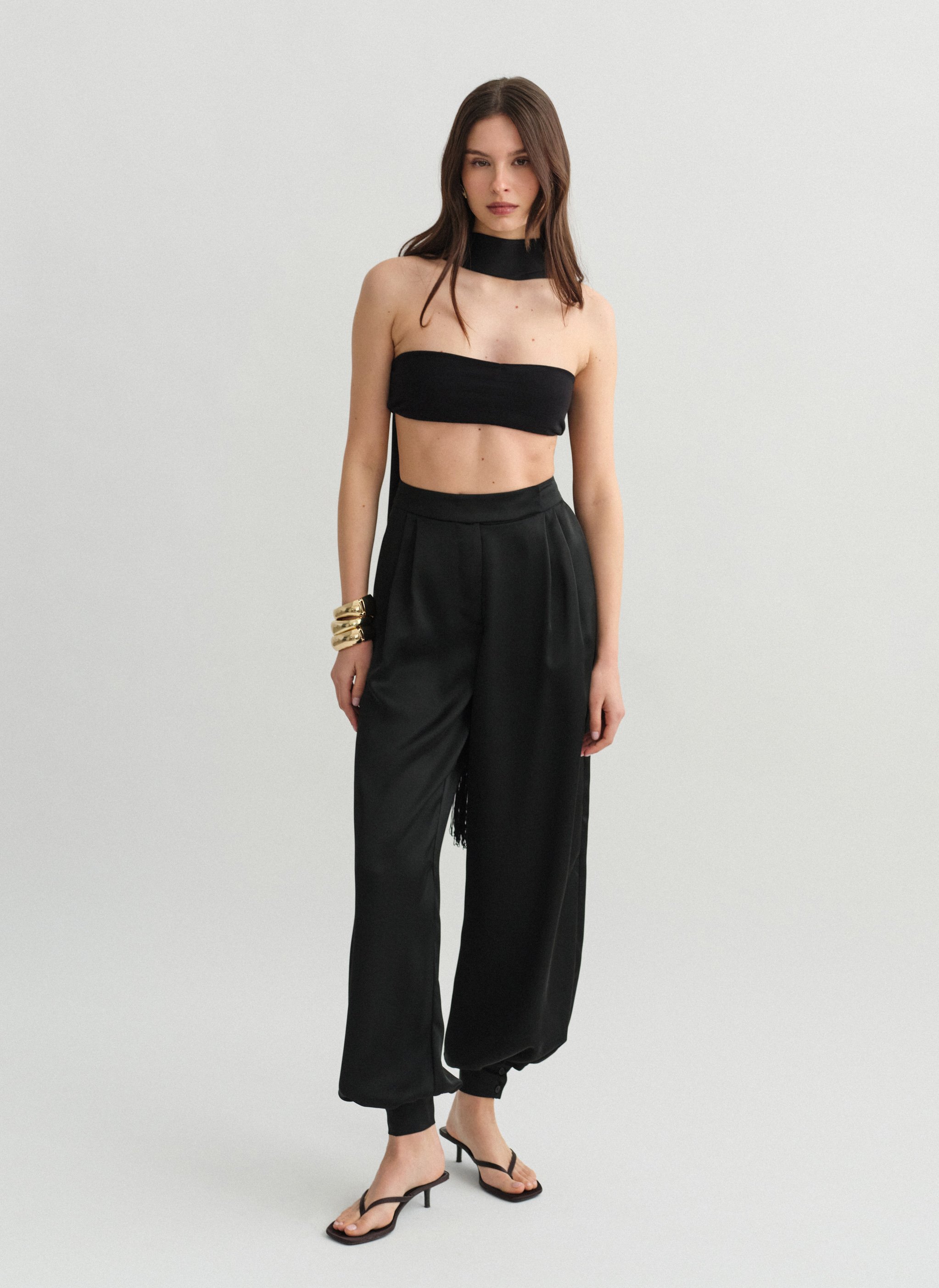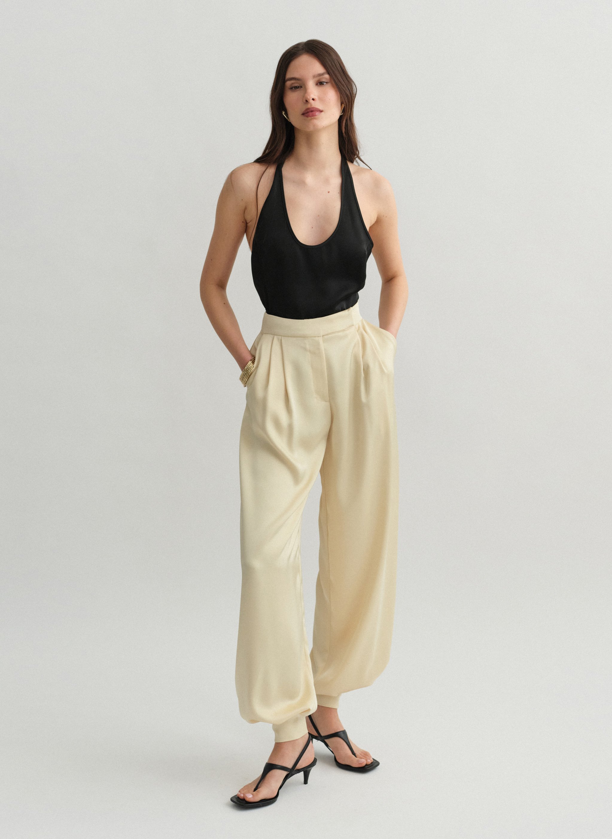 High-waisted darted satin balloon trousers with double-button leg fastening.