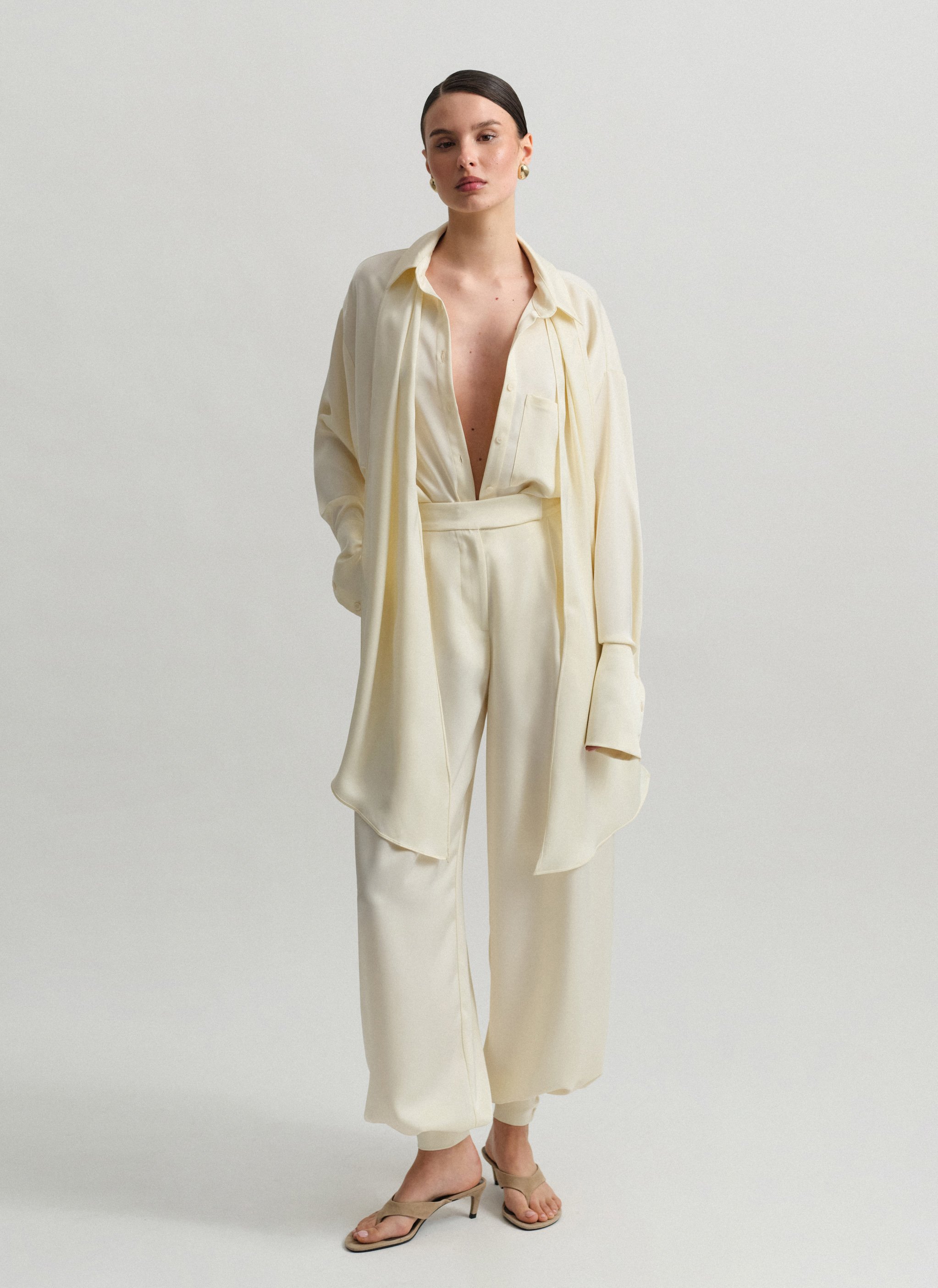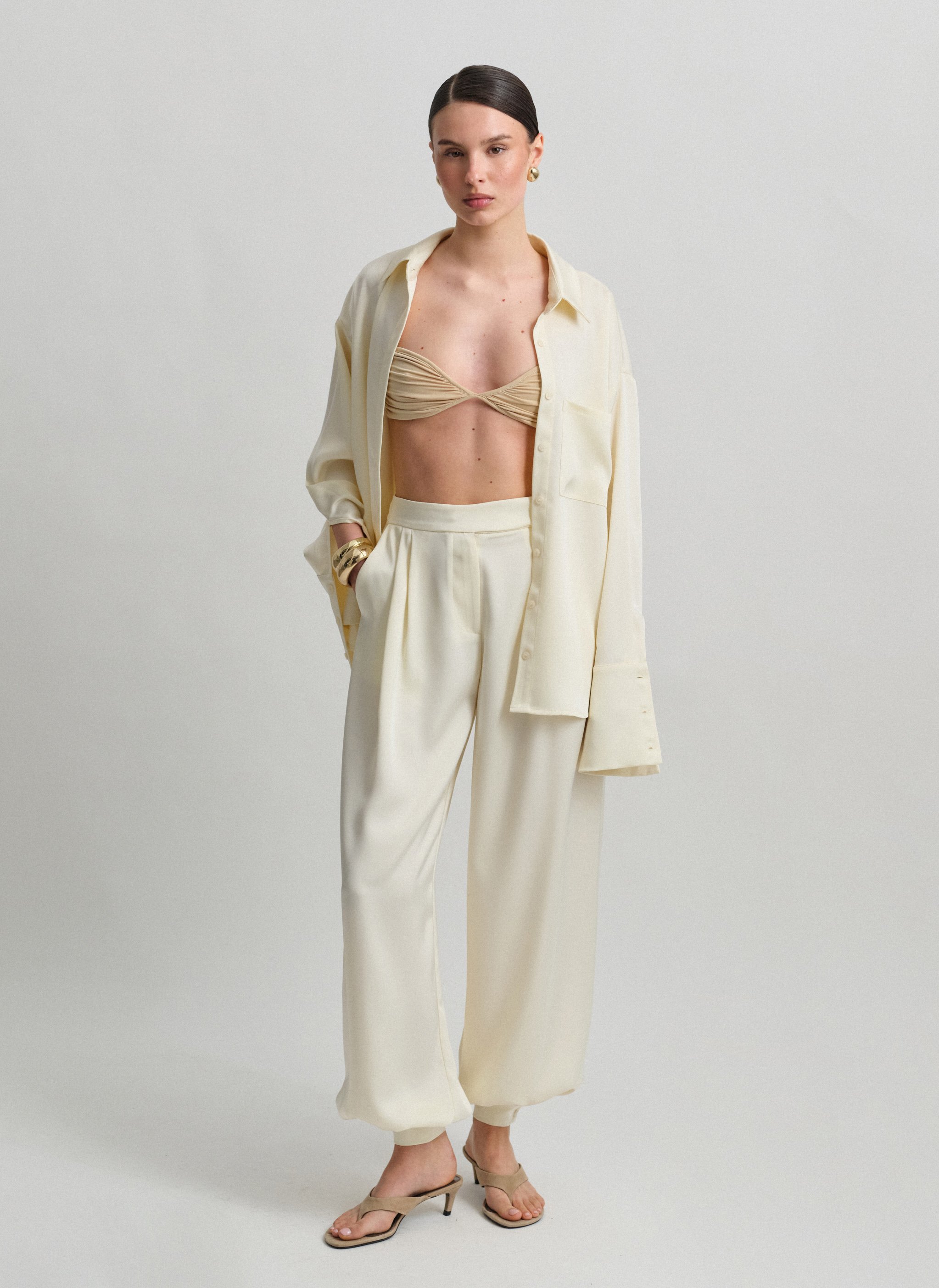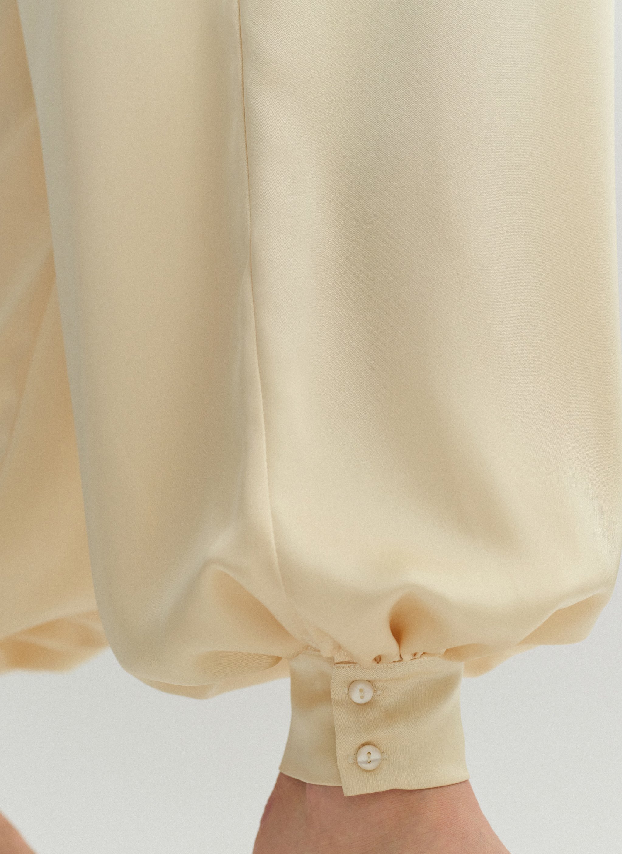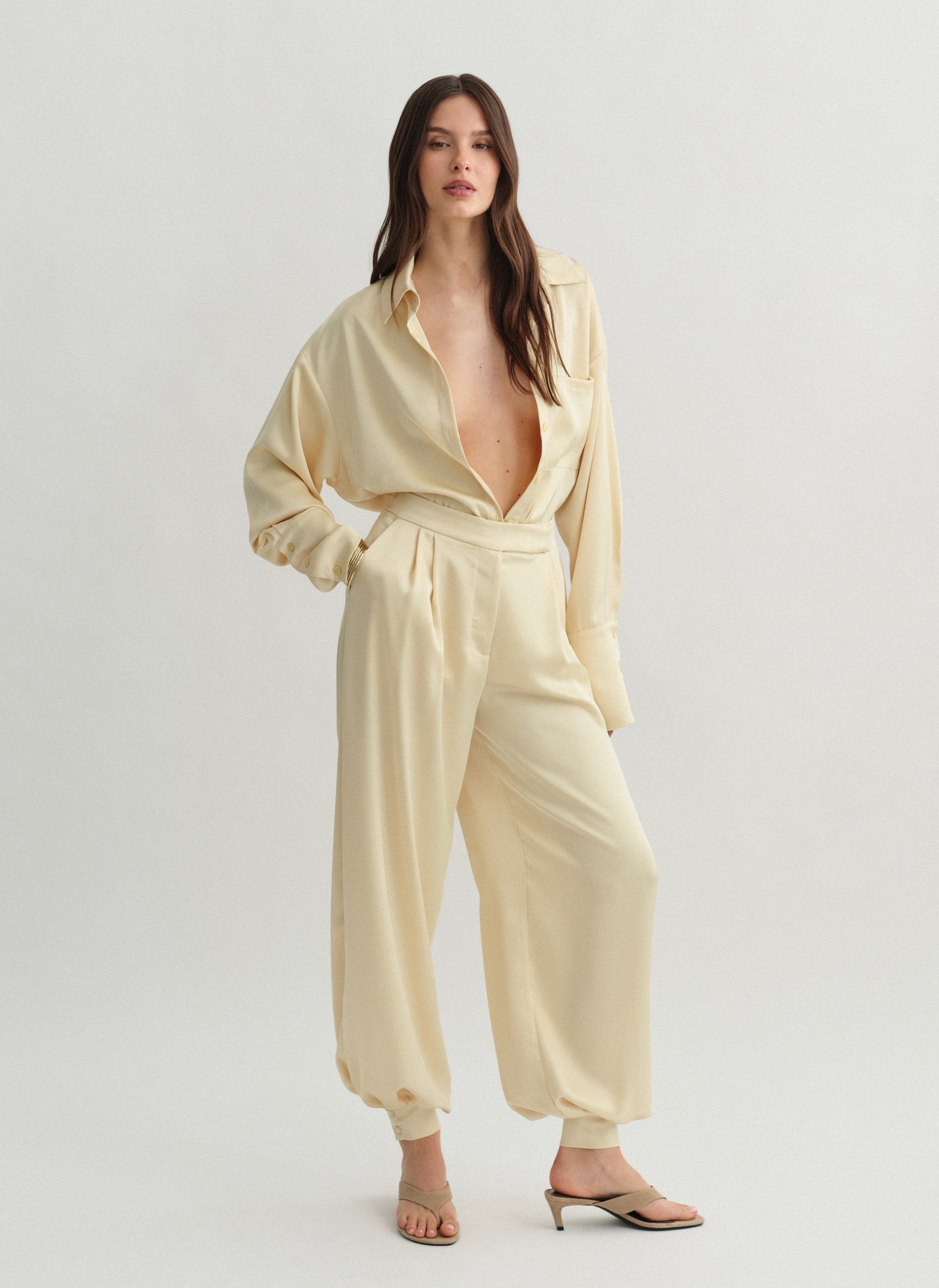 High-waisted darted satin balloon trousers with double-button leg fastening.
