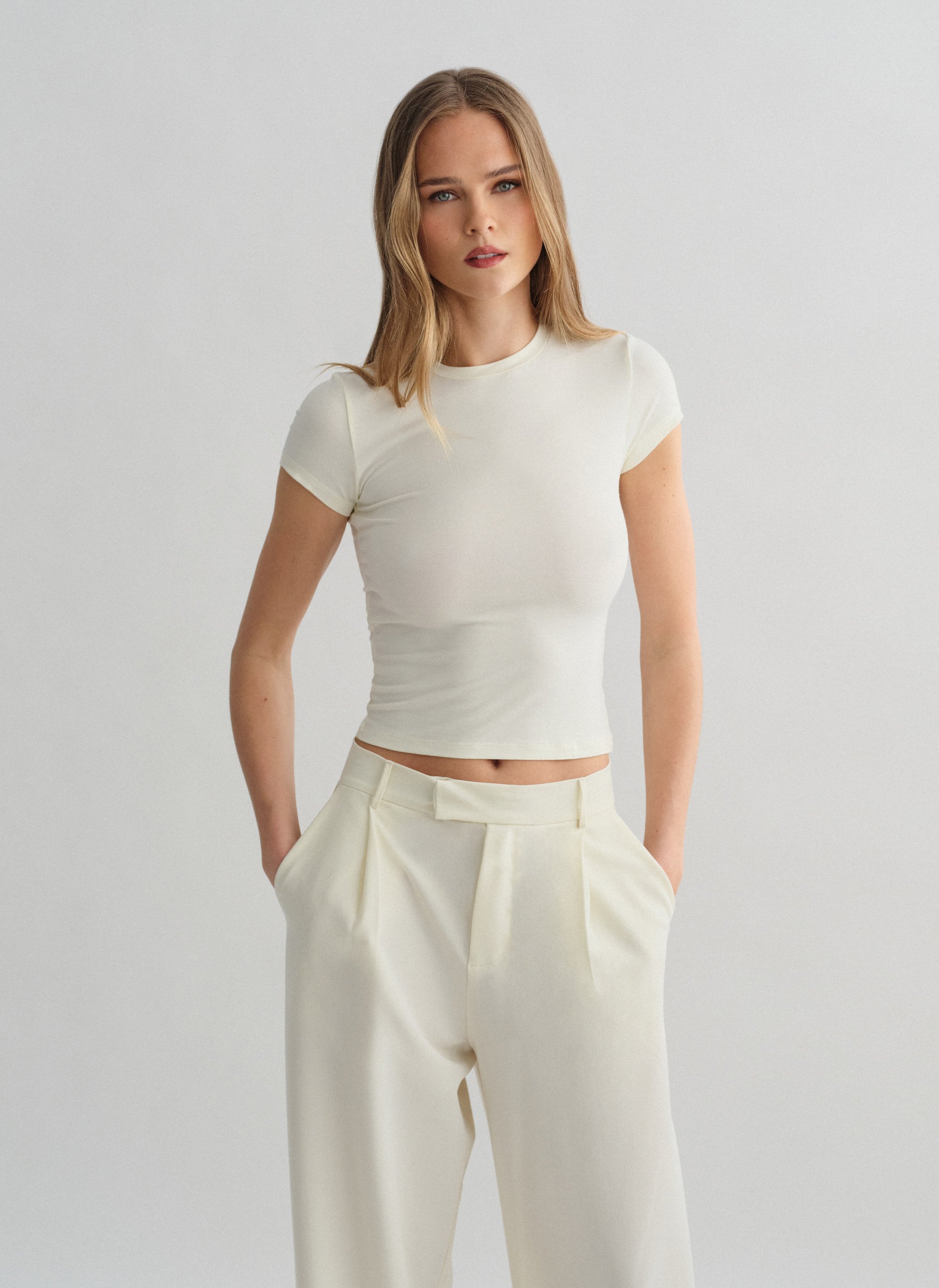 Bamboo elastic shorthsleeve basic top with round-cut neckline.