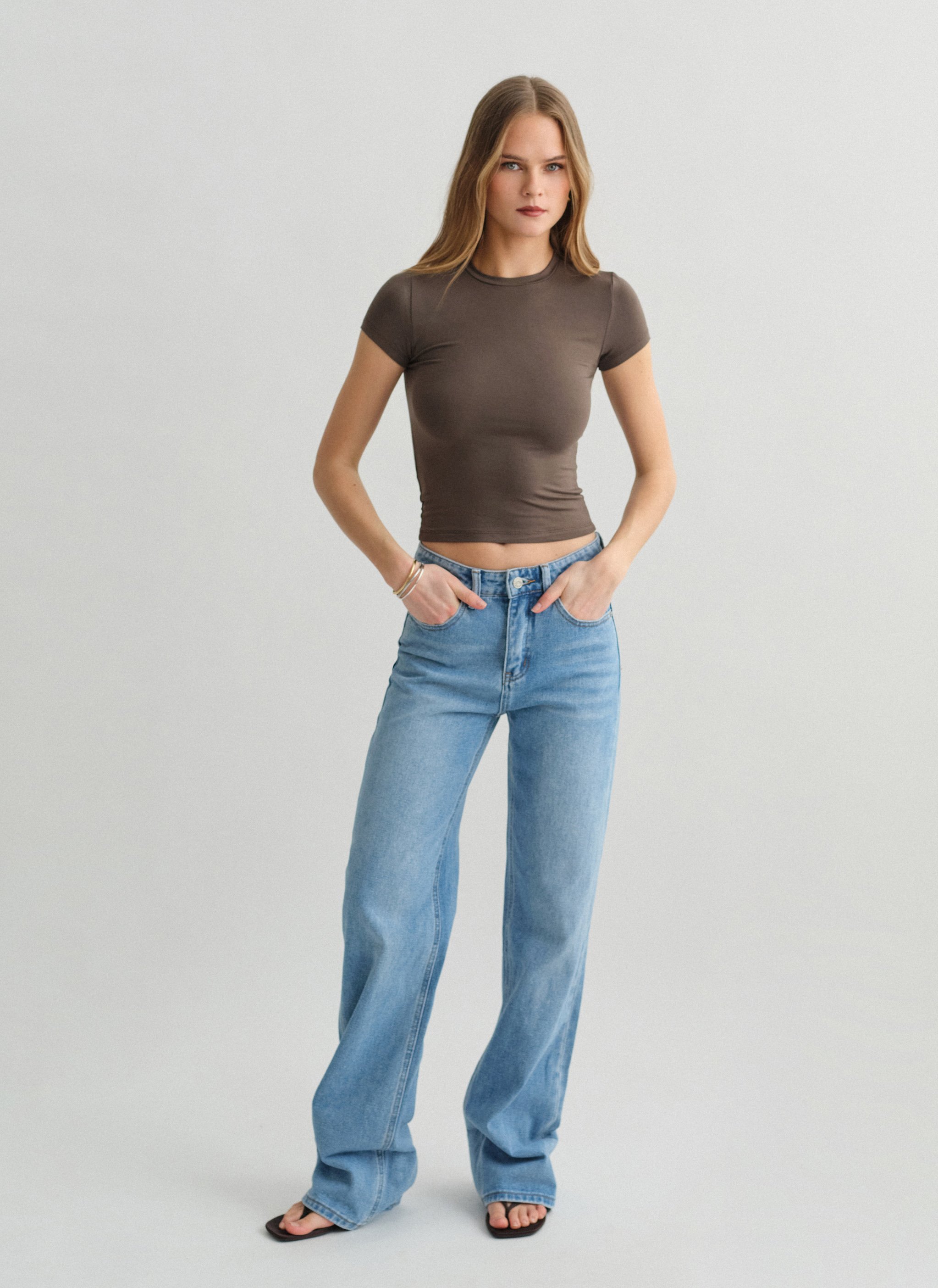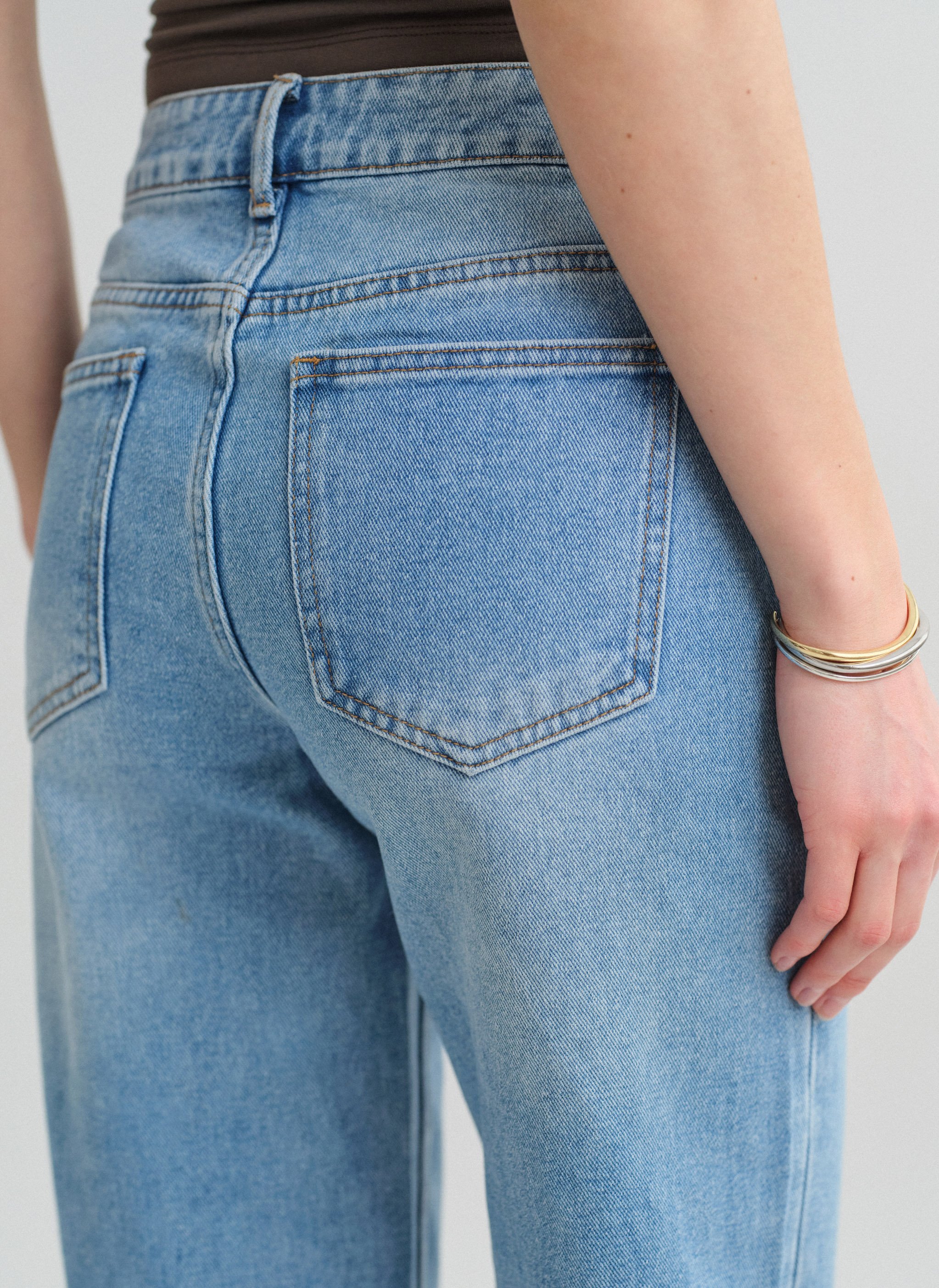 Light blue mid-rise jeans with straight trouser legs.