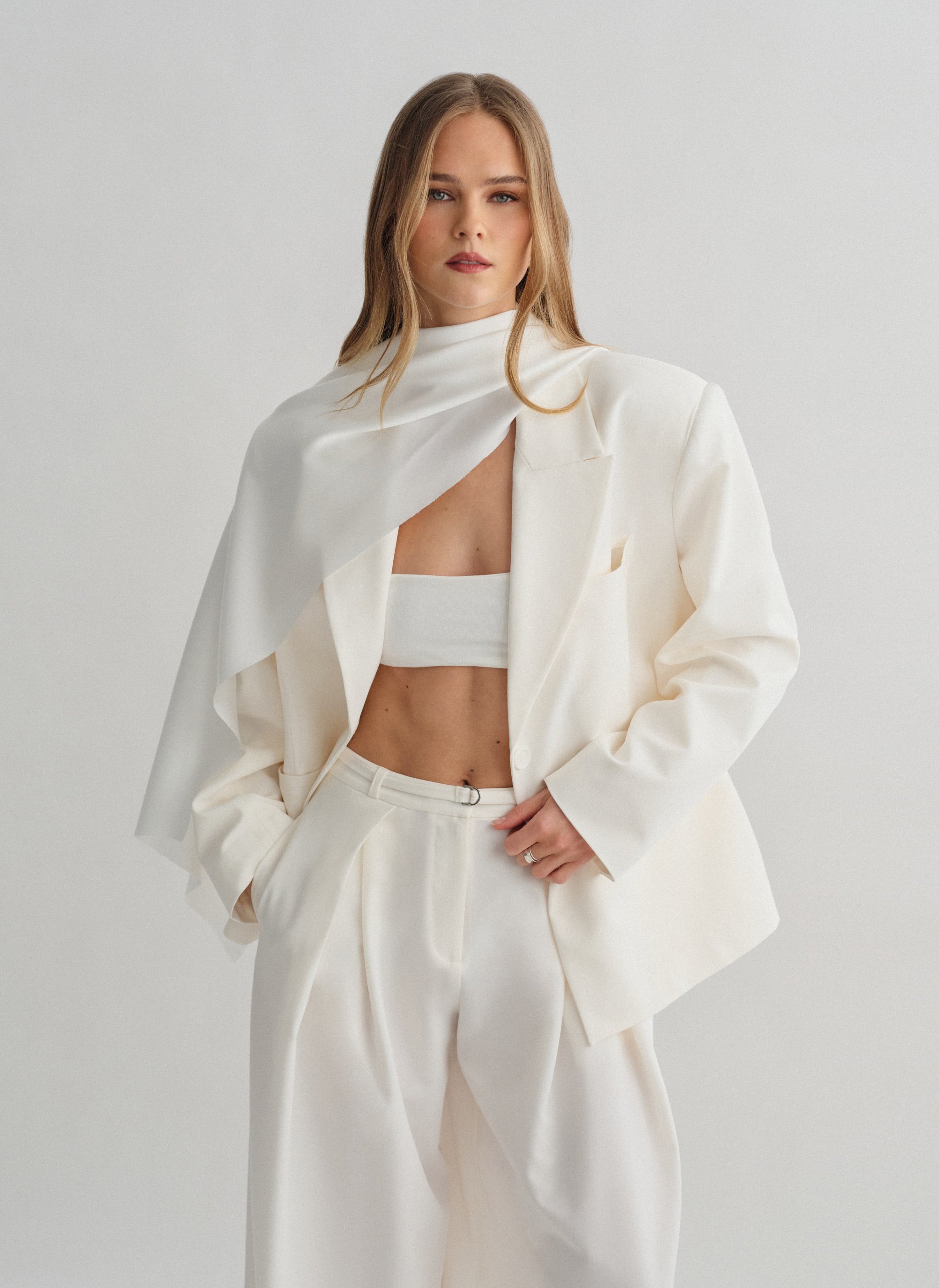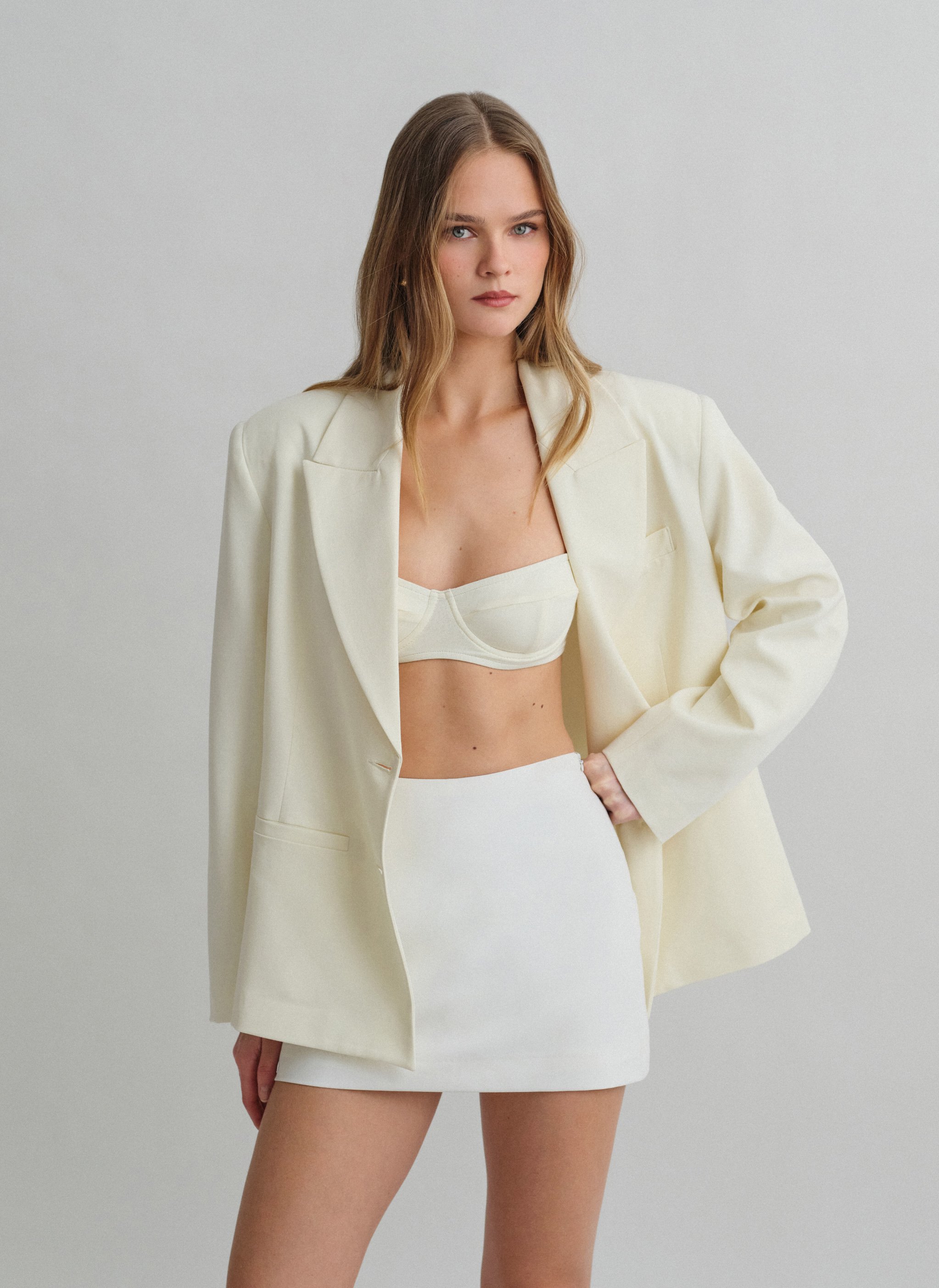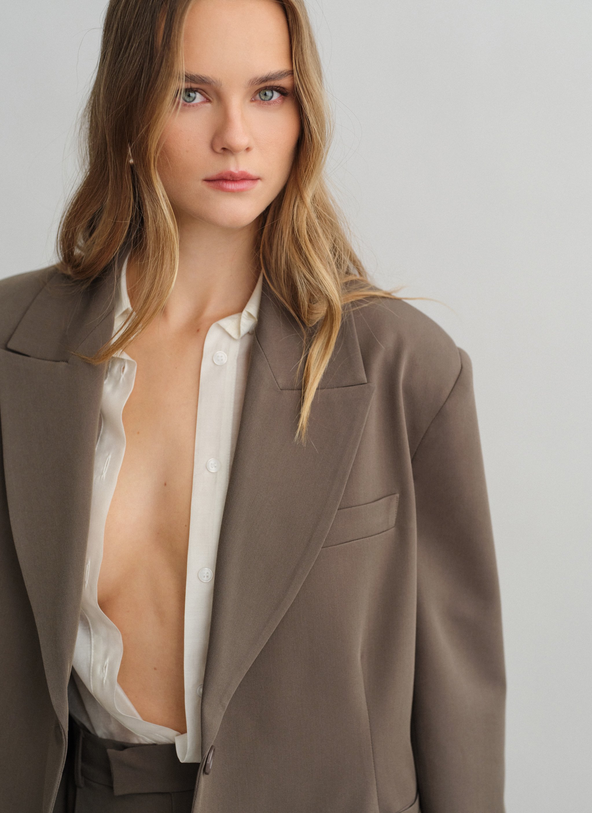 The product features straight line, with long sleeves with three buttons on the cuffs, double back slit, shoulder pads and lining.