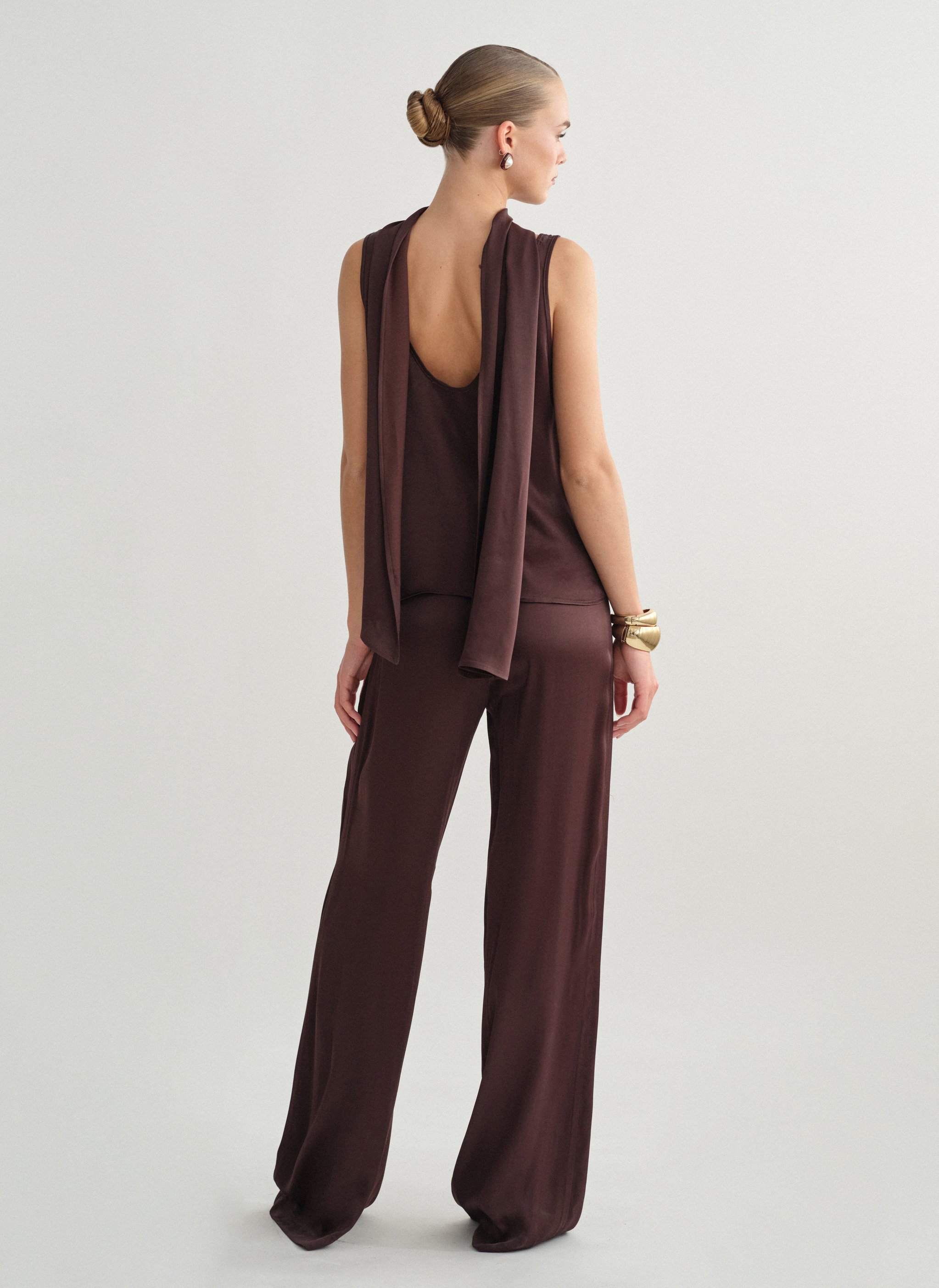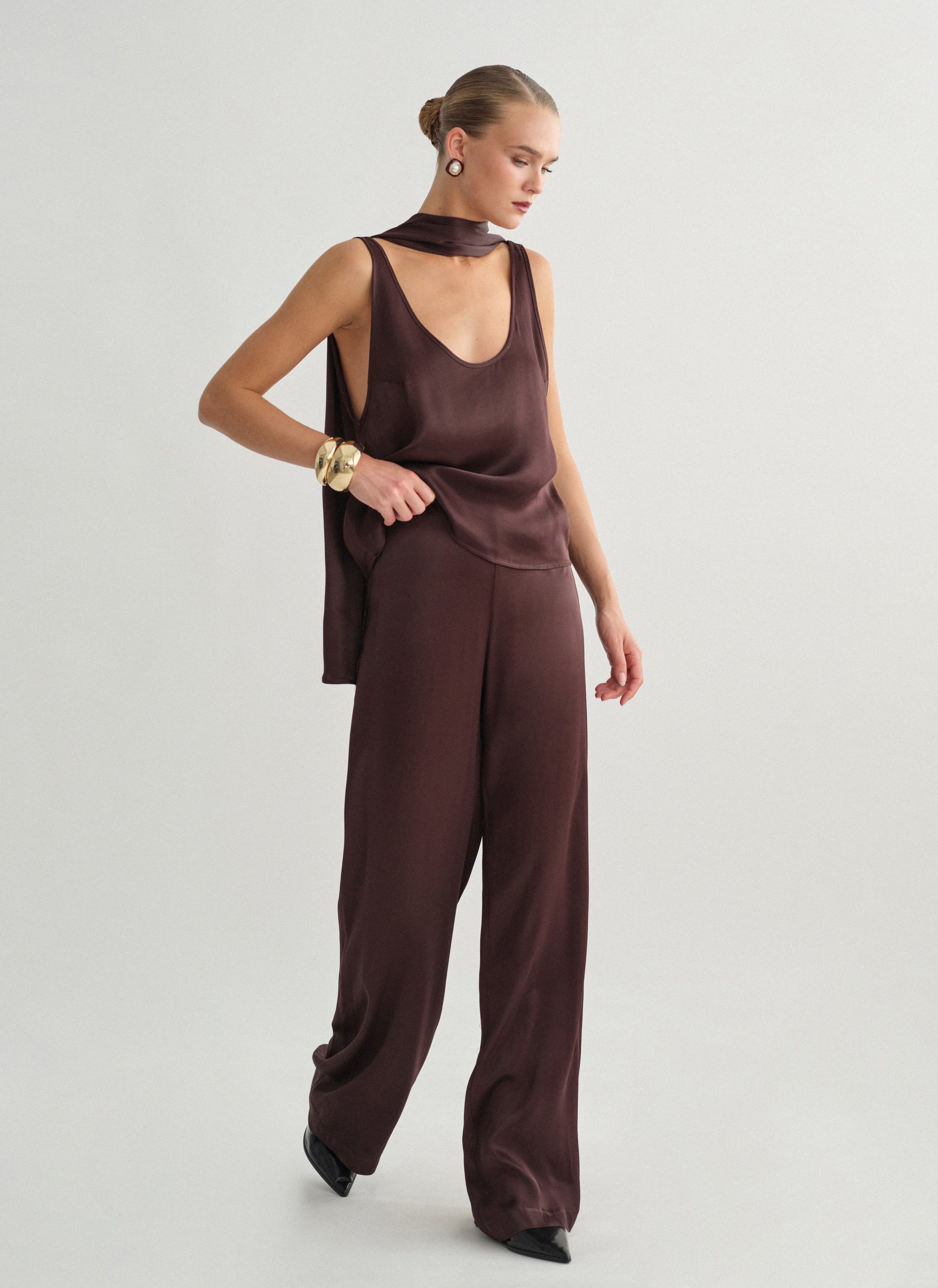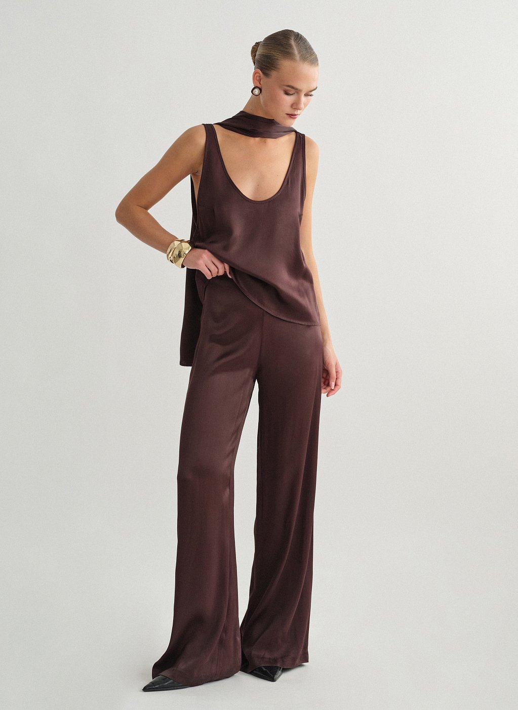 Ηigh-waist satin trousers with straight trouser legs.