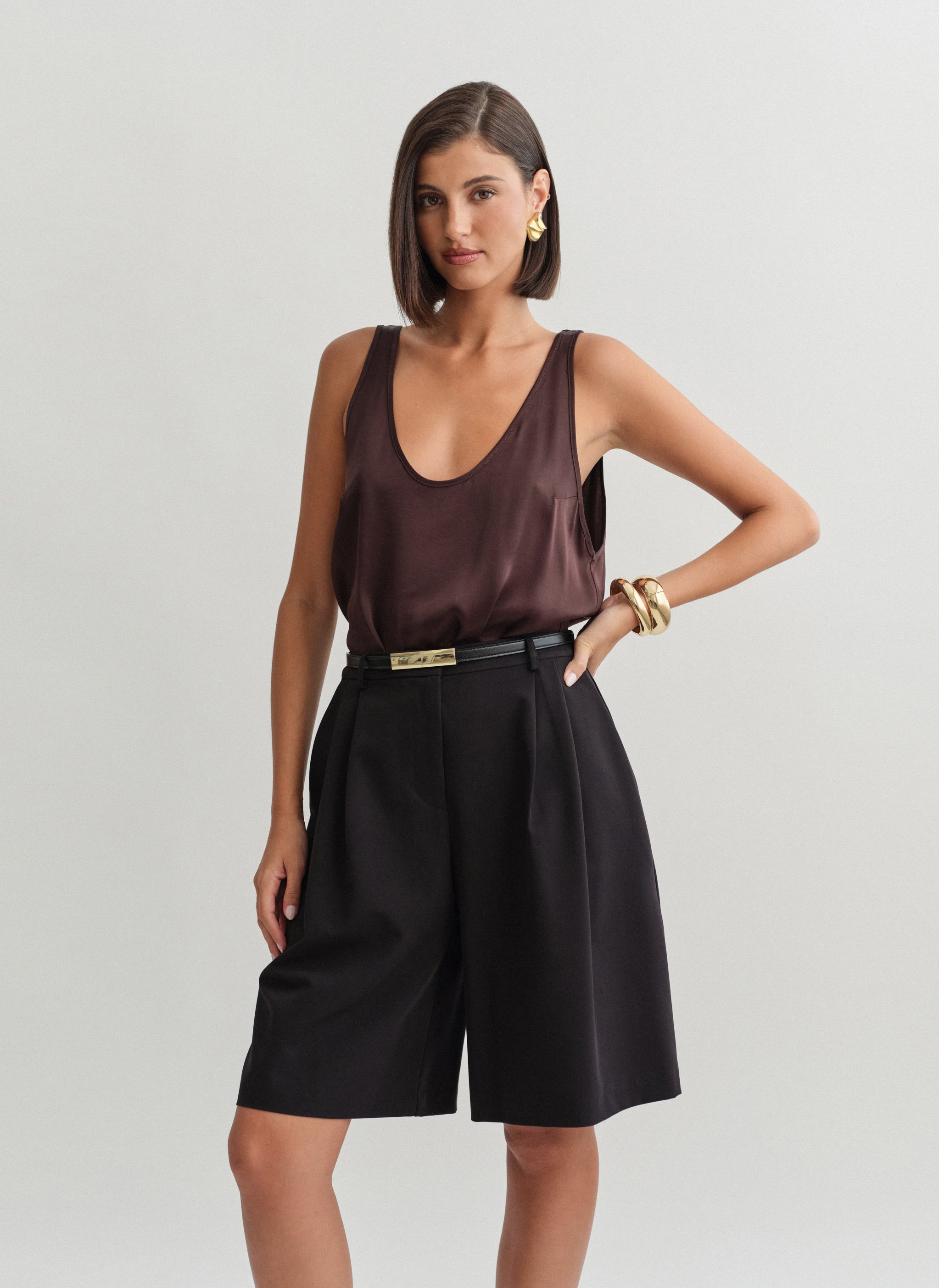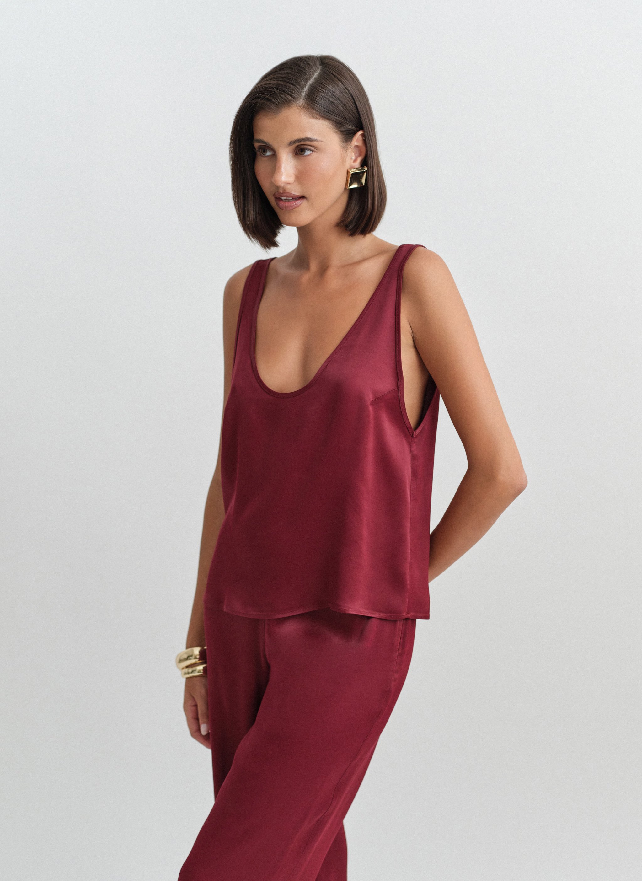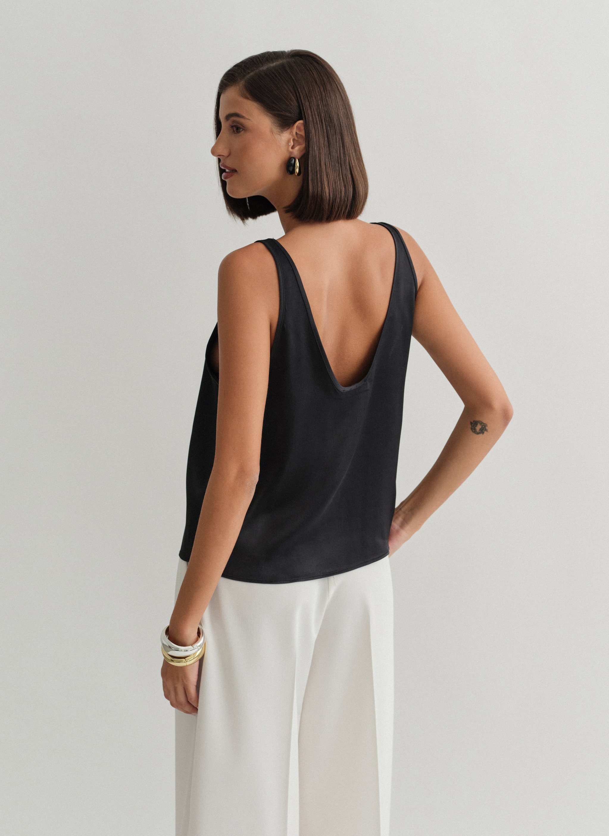 Loose satin sleeveless blouse with round-cut neckline.