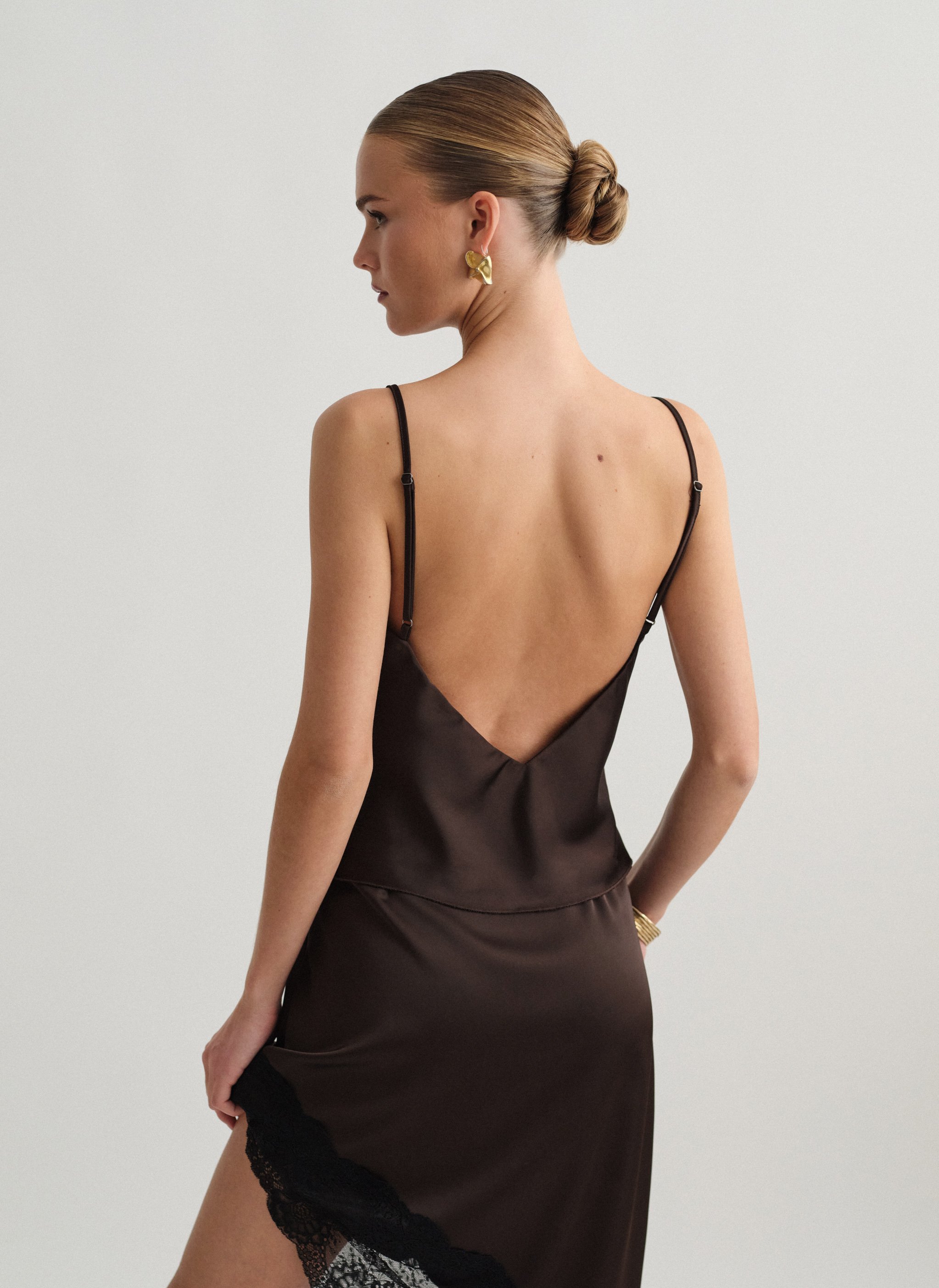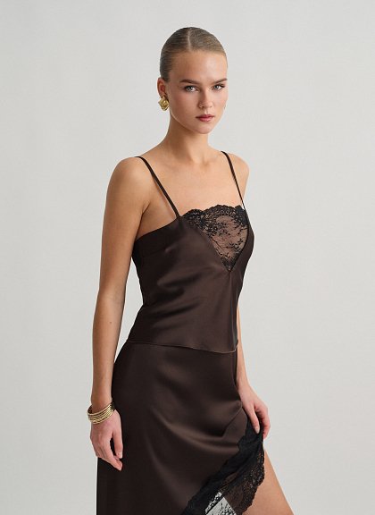 Sleeveless satin top with lace detail on the bust and thin adjustable straps.