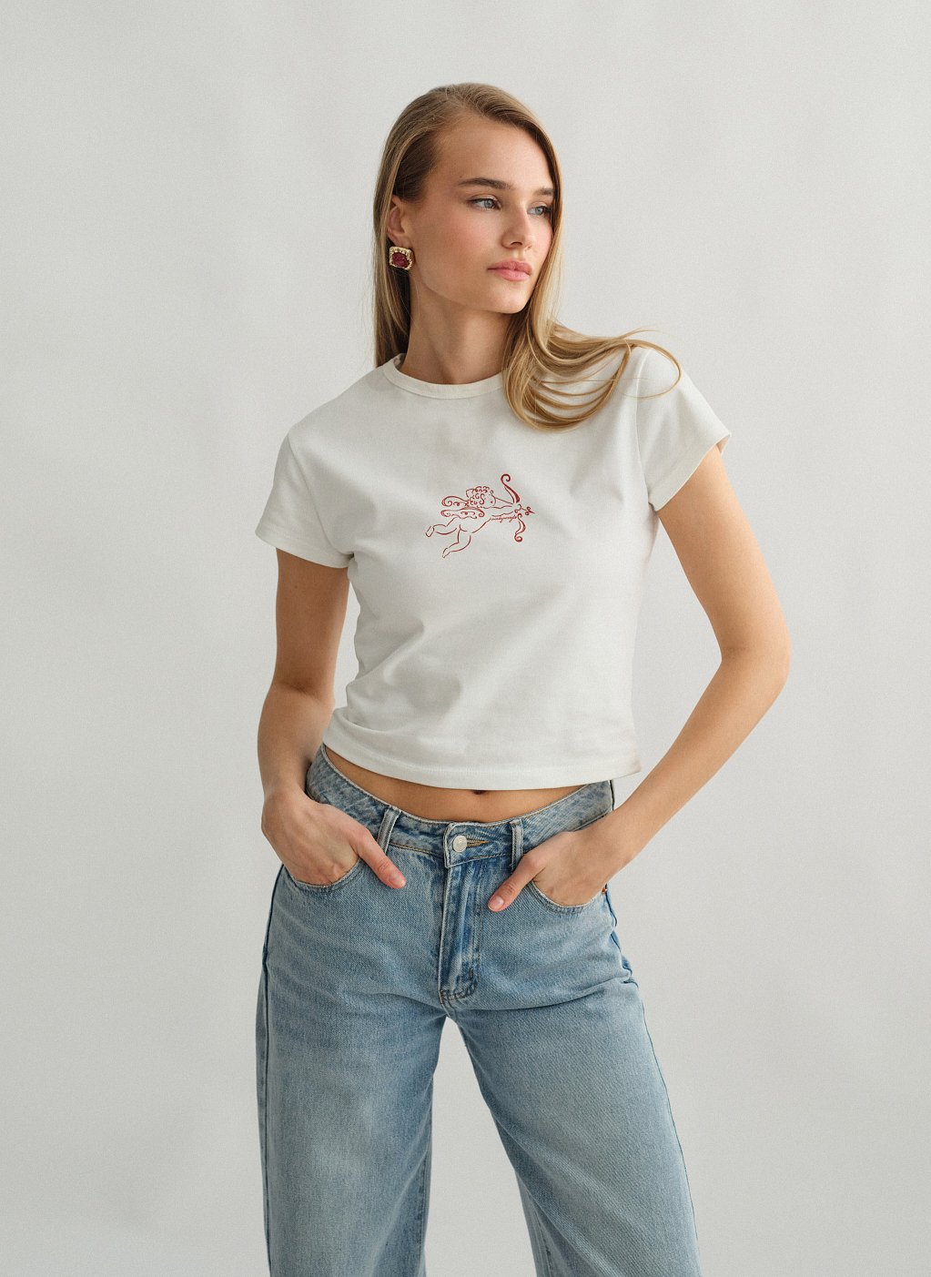 Cotton shortsleeve top with stamp and round-cut neckline.