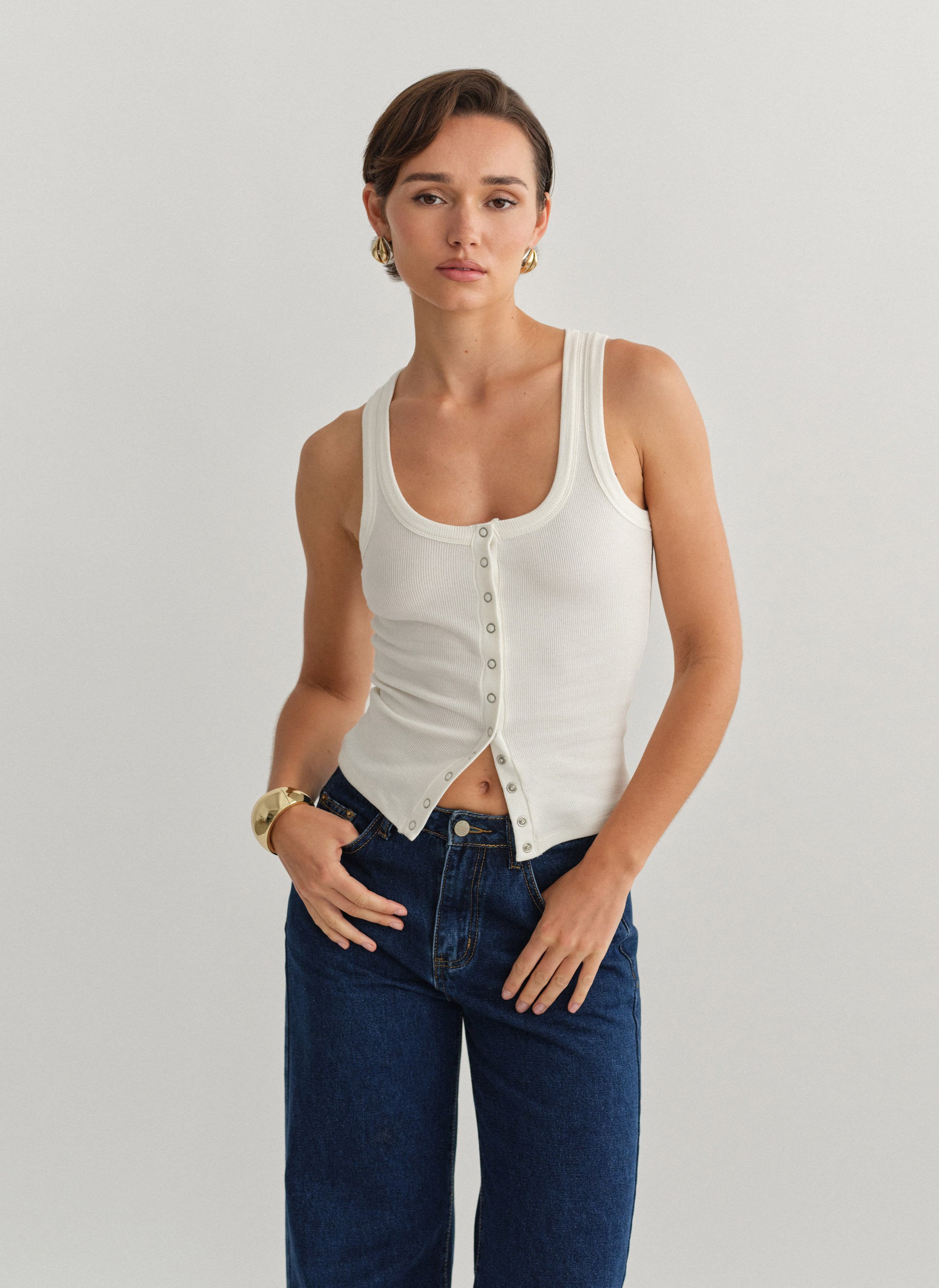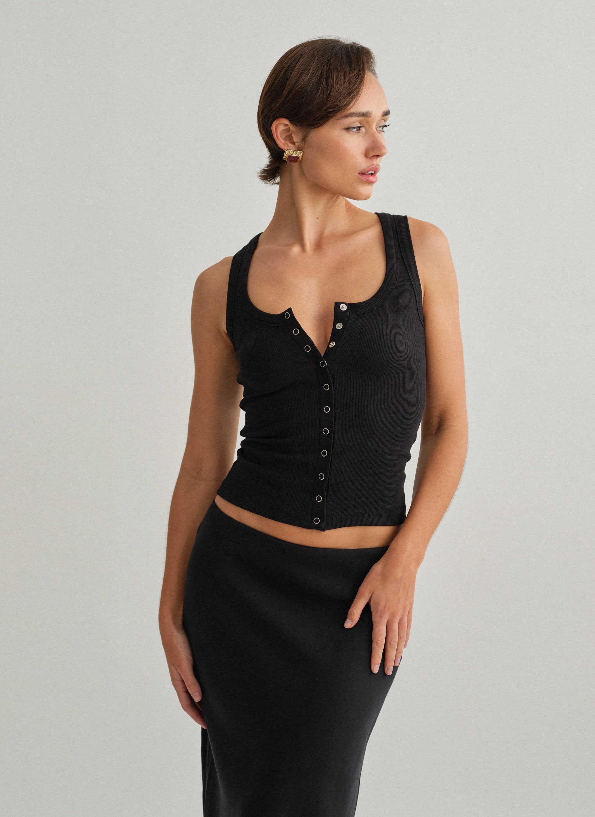 Elastic sleeveless ribbed top with round neckline and front fastening with bust darts.