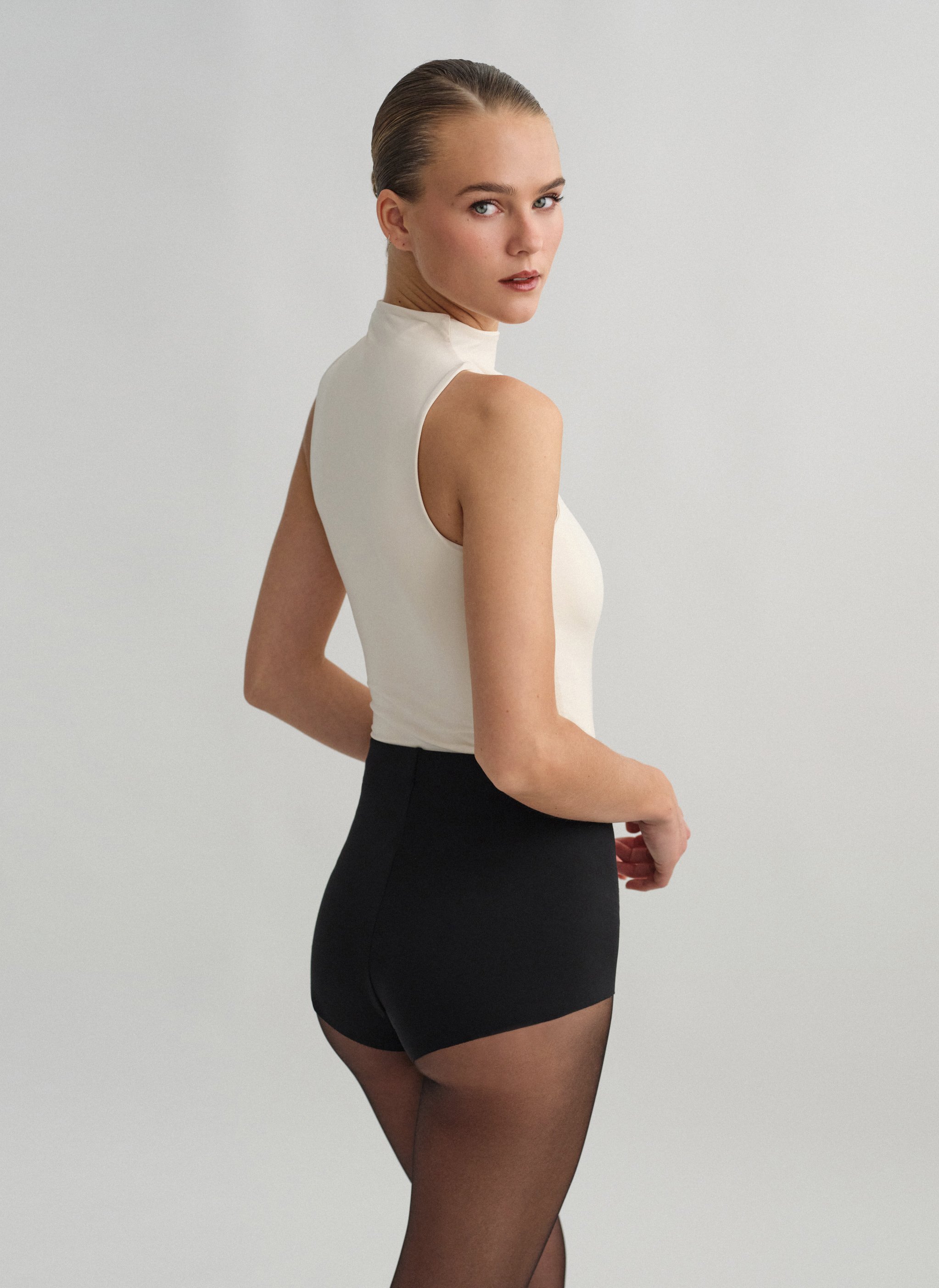Elastic sleeveless turtleneck top with detachable metallic detail.