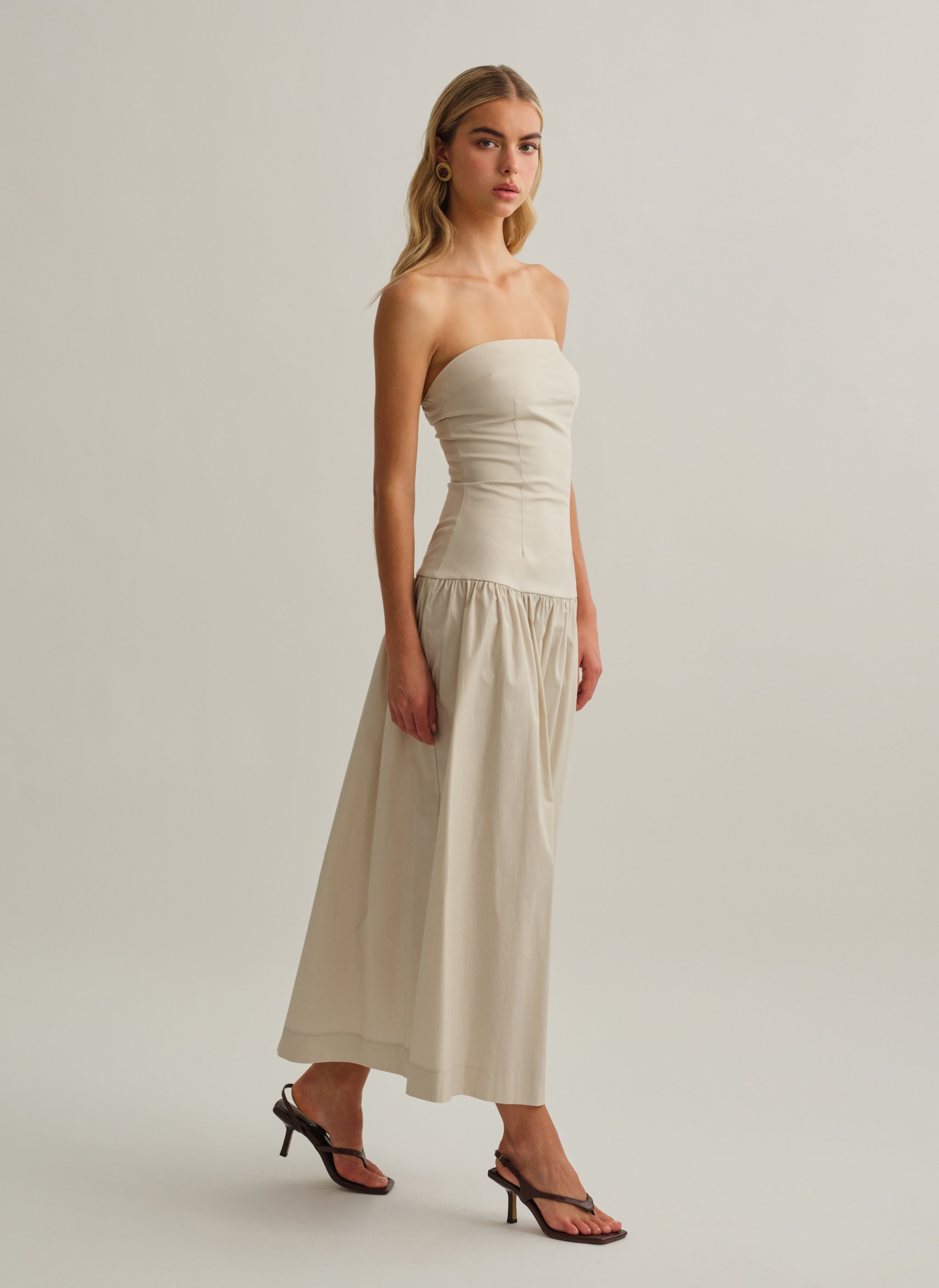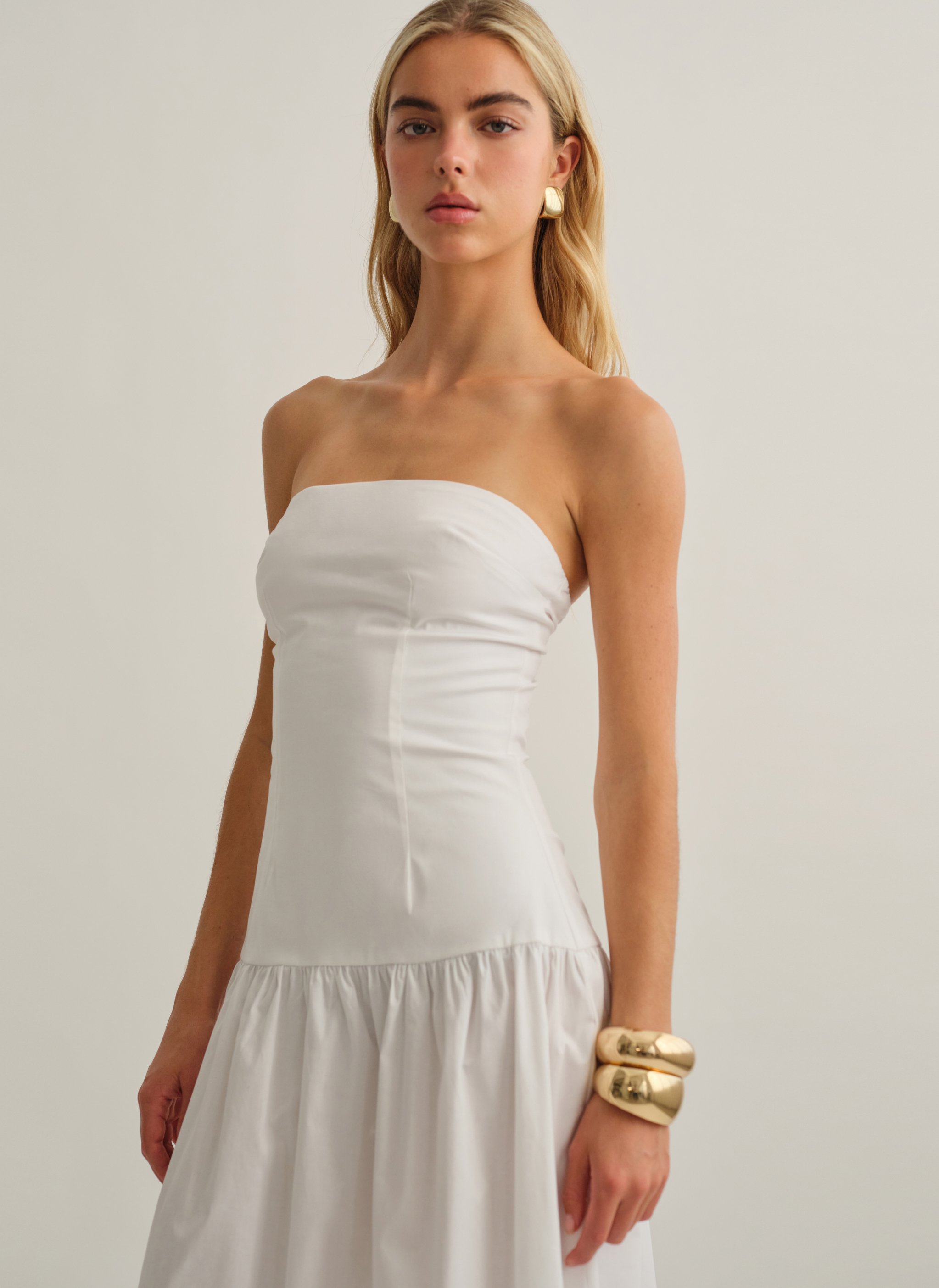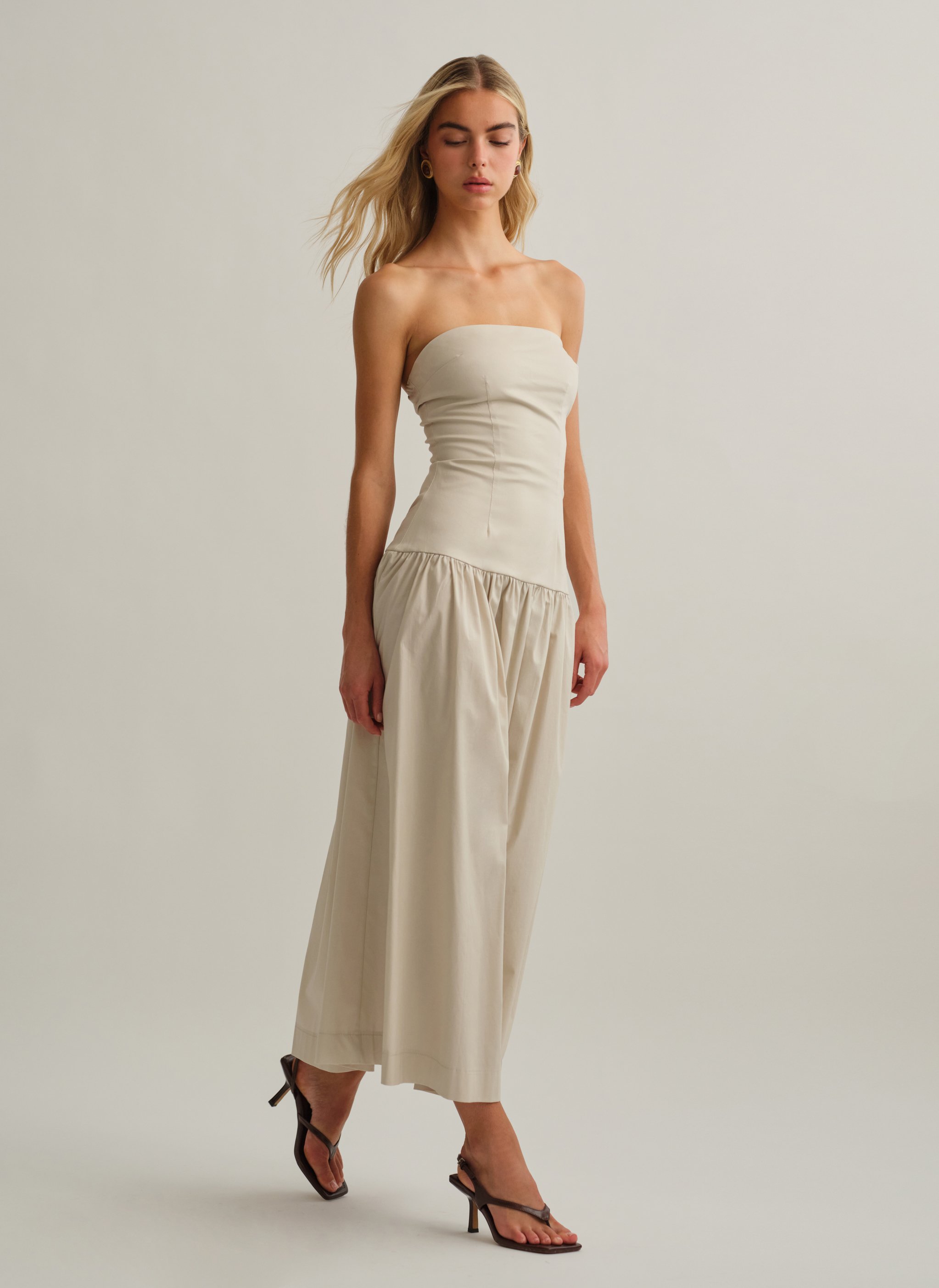 Τhe product features slight A-line, with back fastening with invisible zipper.