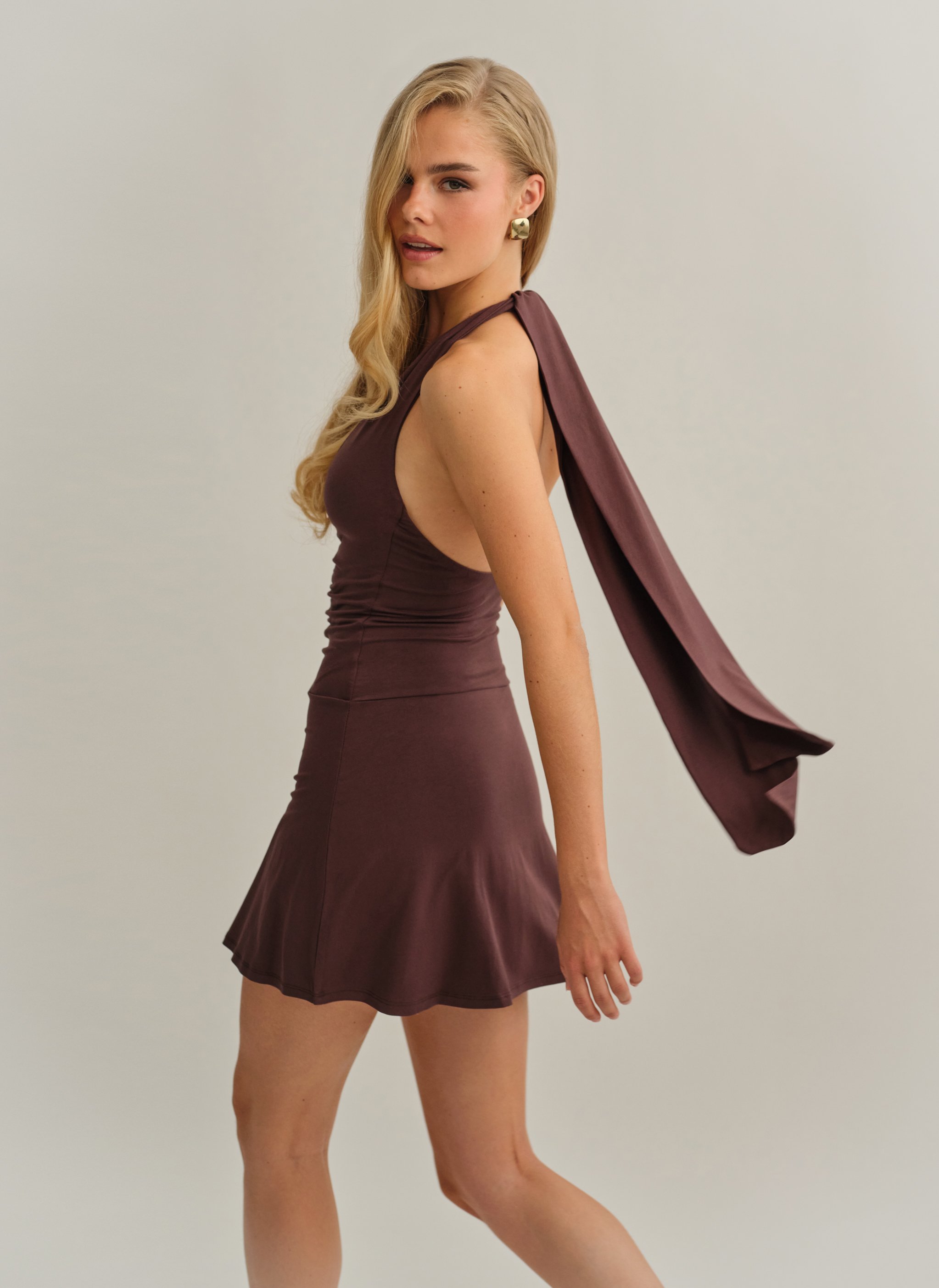 Ελαστικό halter μίνι φόρεμα με σούρες bamboo και βαθύ V ντεκολτέ.
