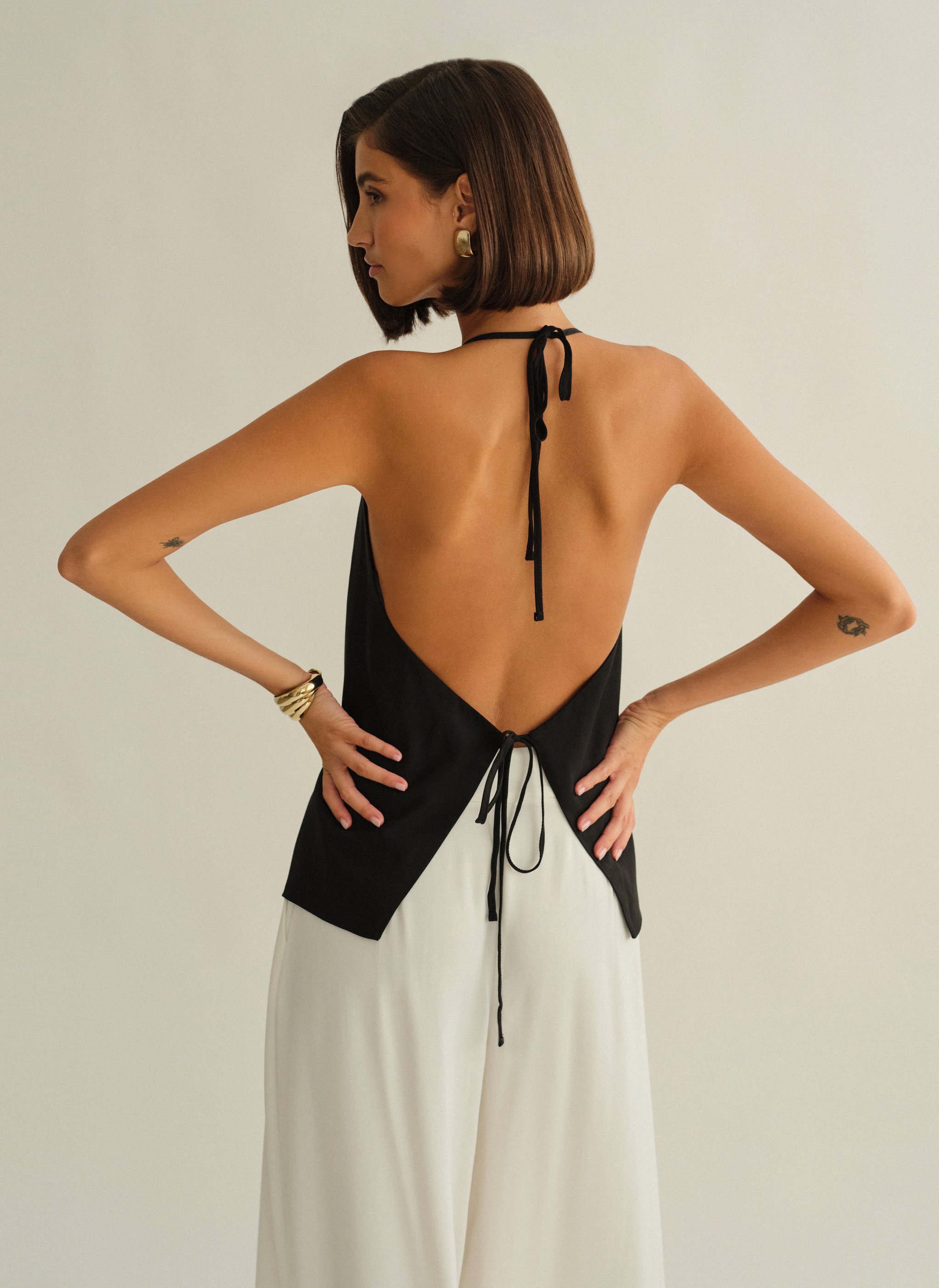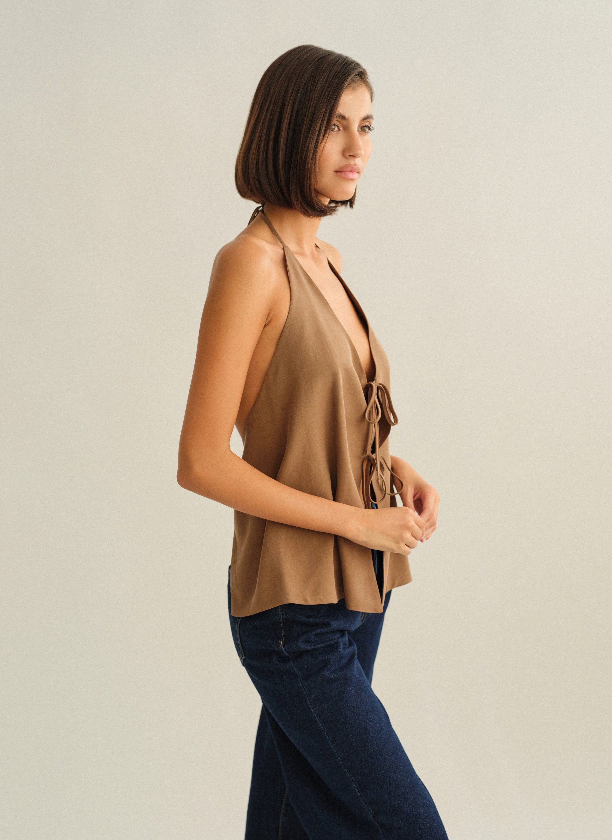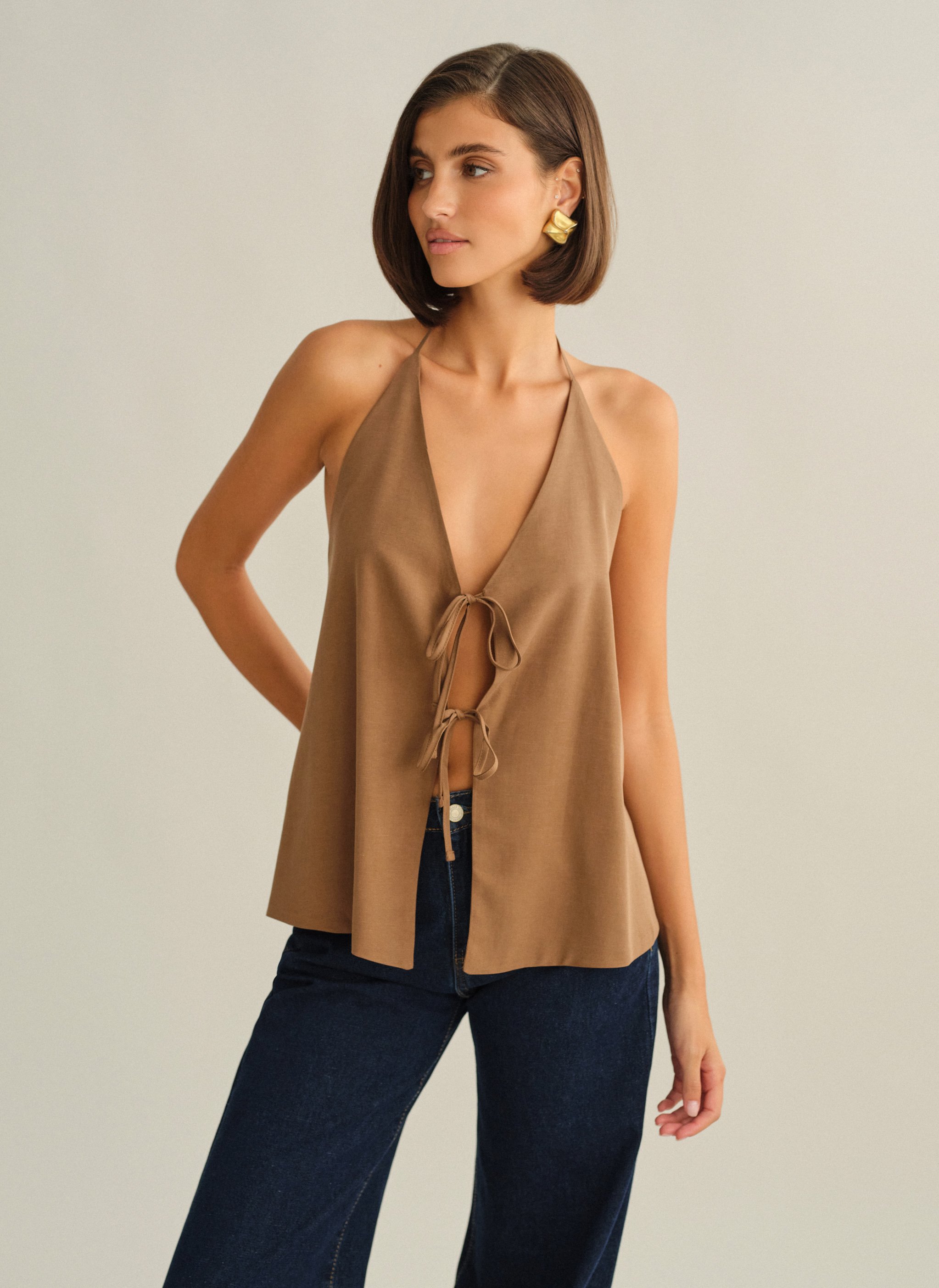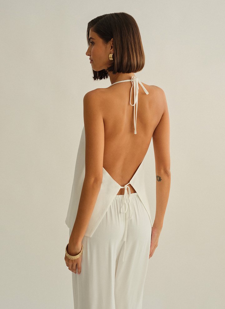 Υφασμάτινο halter τοπ με δέσιμο με διπλό δέσιμο εμπρός και ανοιχτή πλάτη.