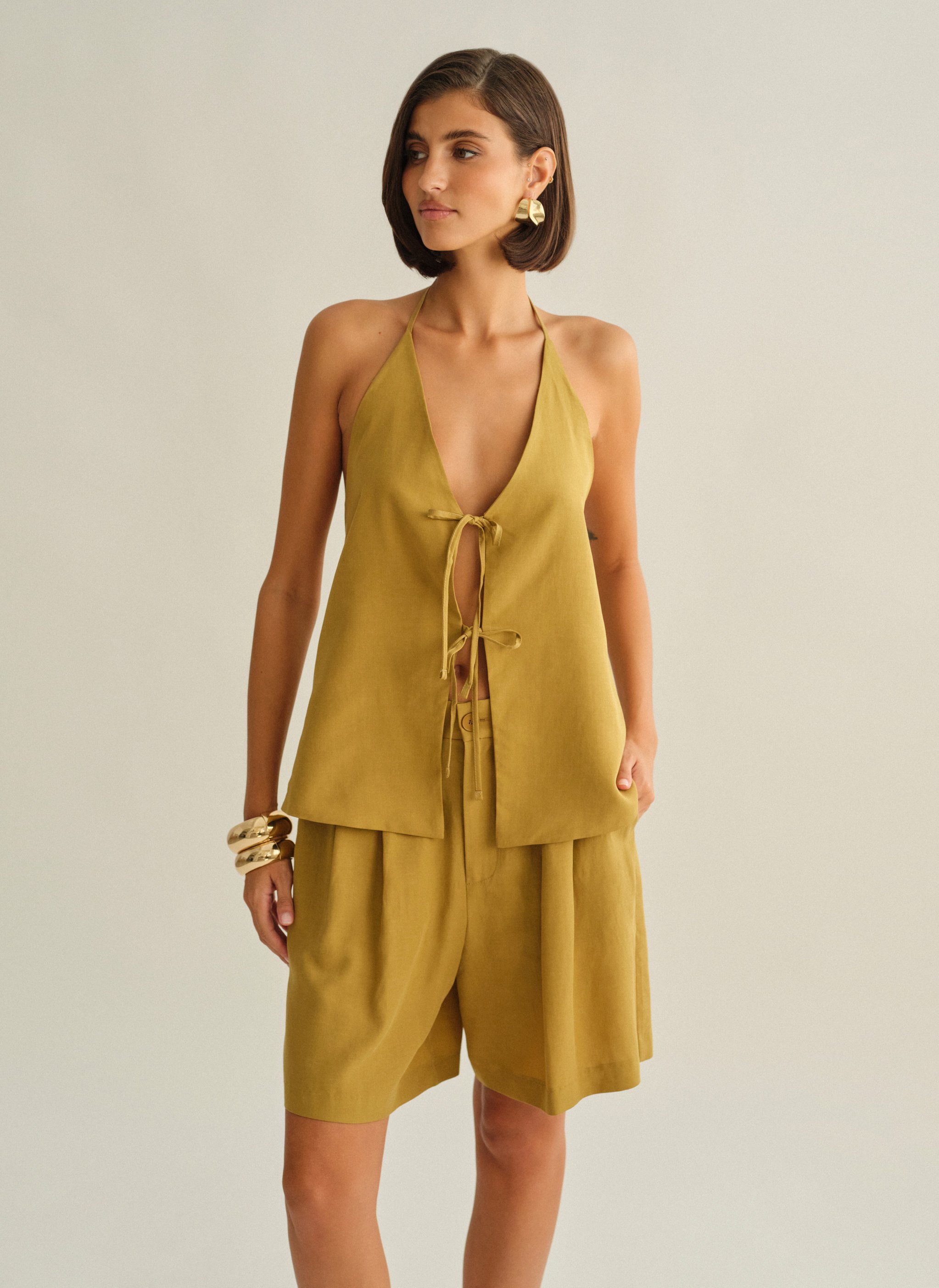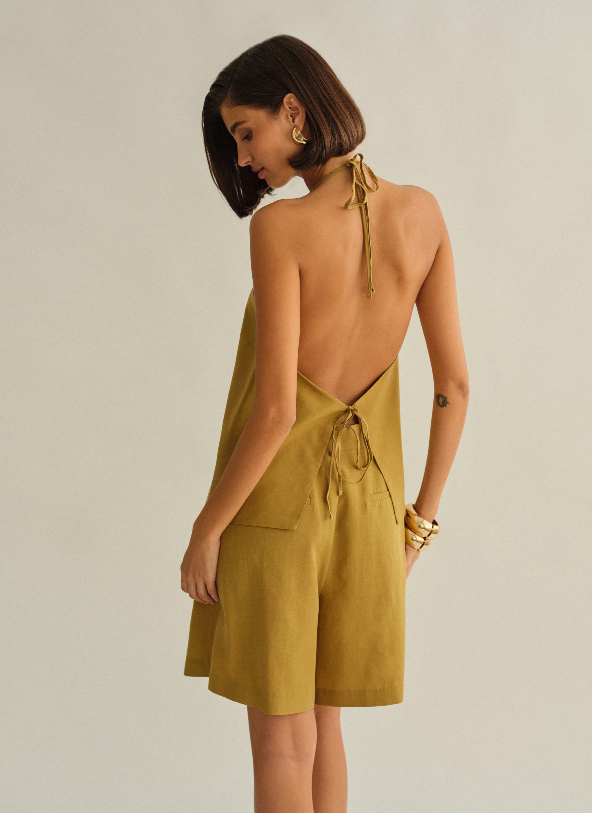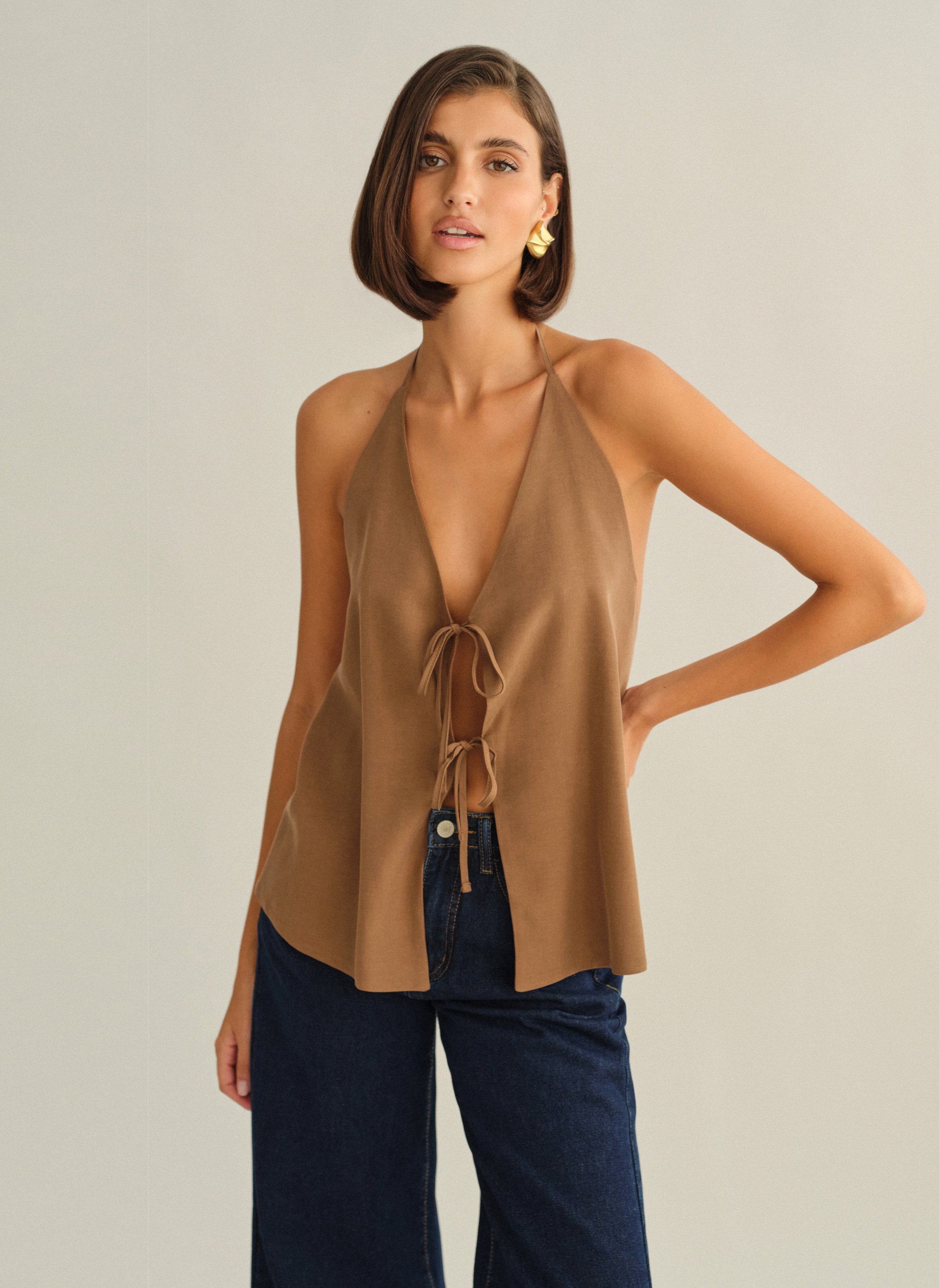 Υφασμάτινο halter τοπ με δέσιμο με διπλό δέσιμο εμπρός και ανοιχτή πλάτη.
