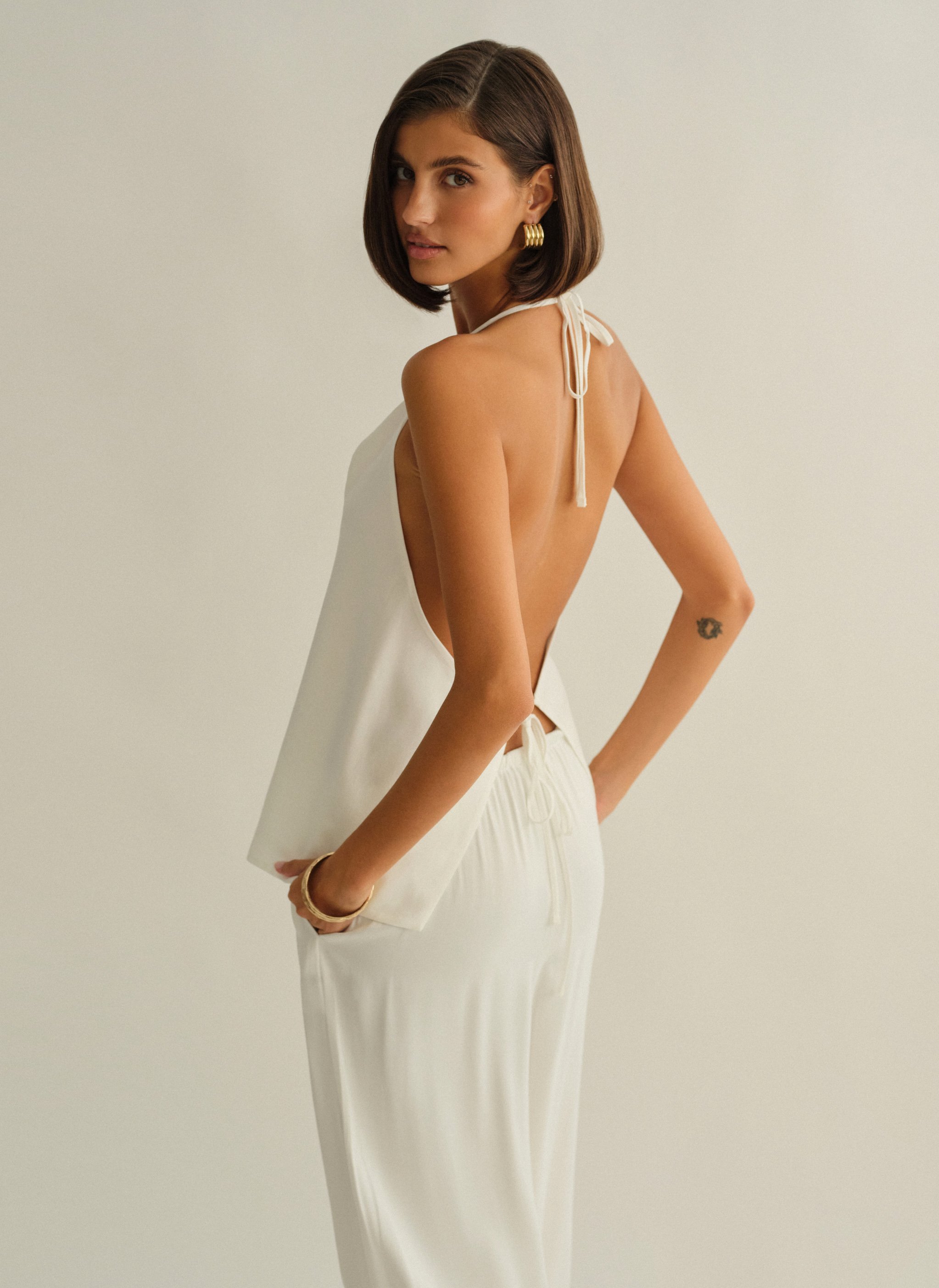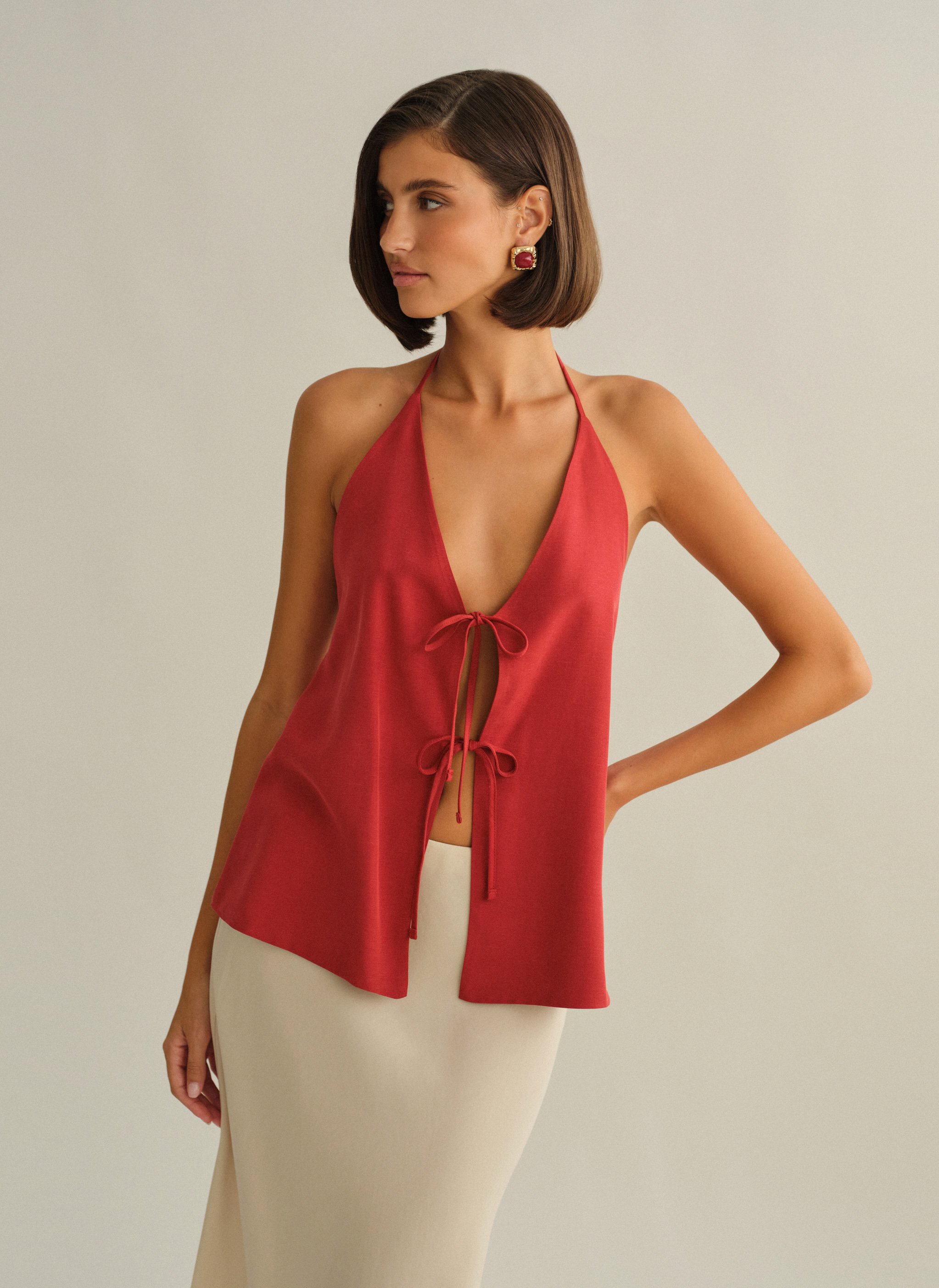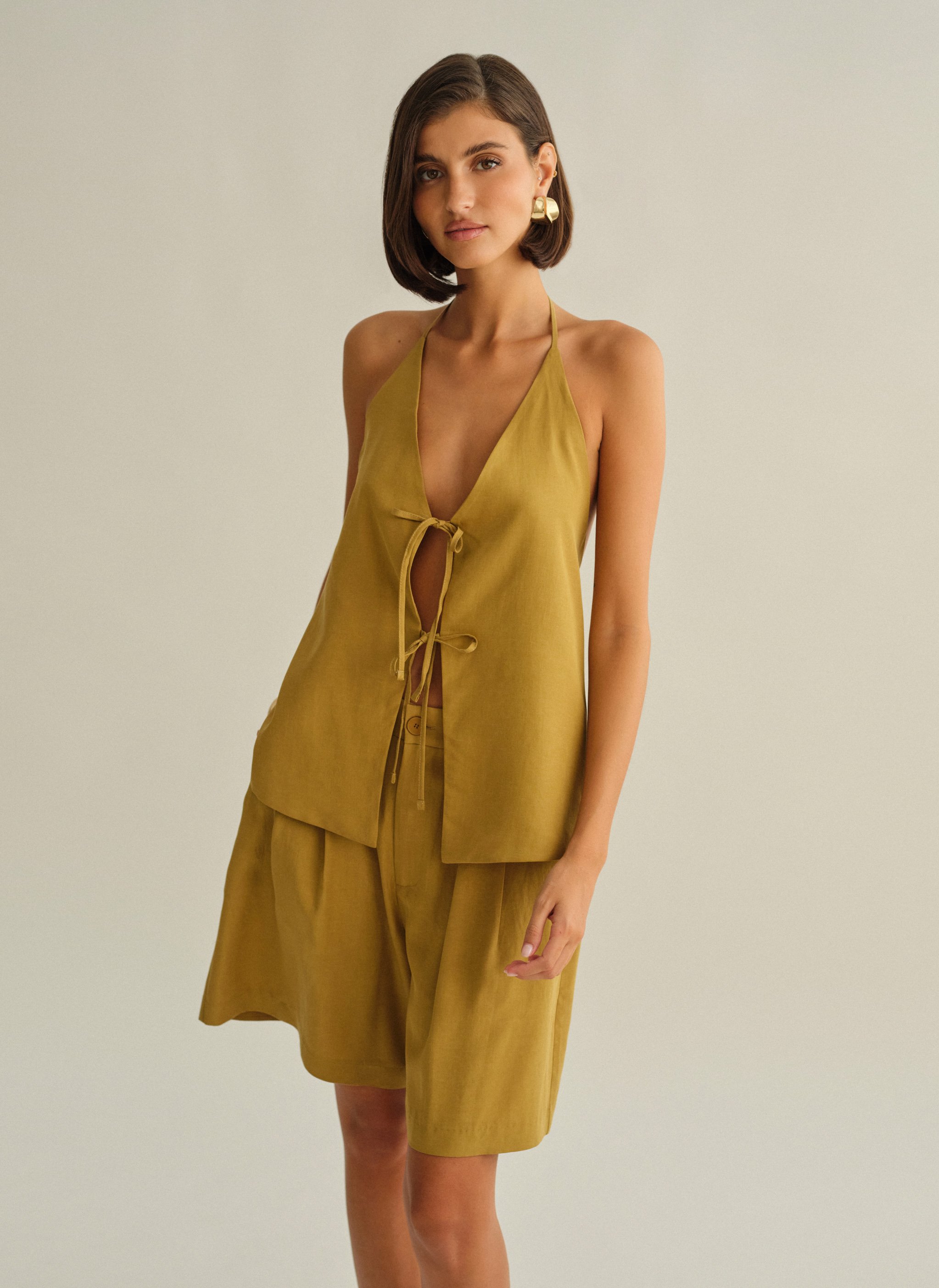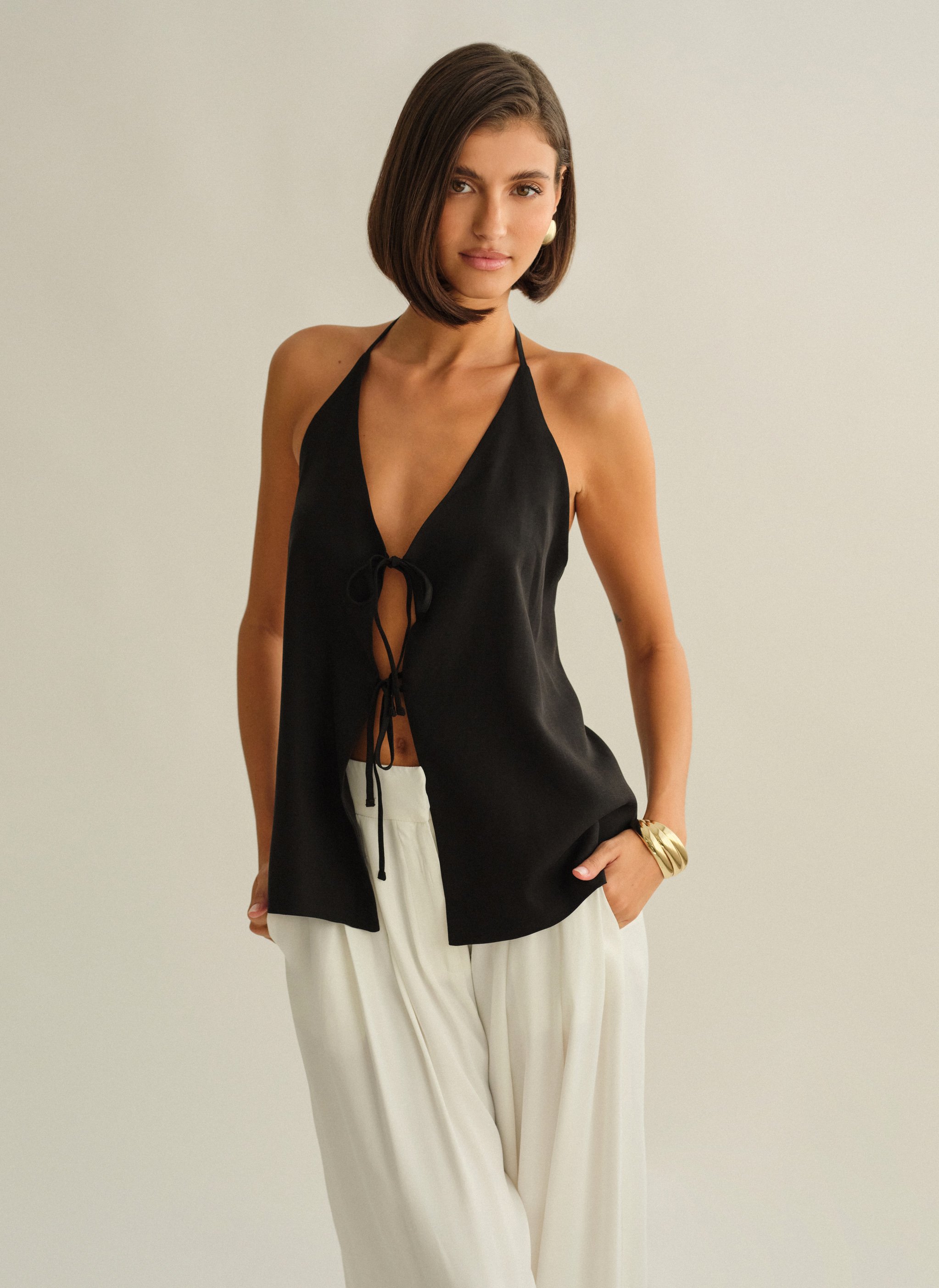 Υφασμάτινο halter τοπ με δέσιμο με διπλό δέσιμο εμπρός και ανοιχτή πλάτη.
