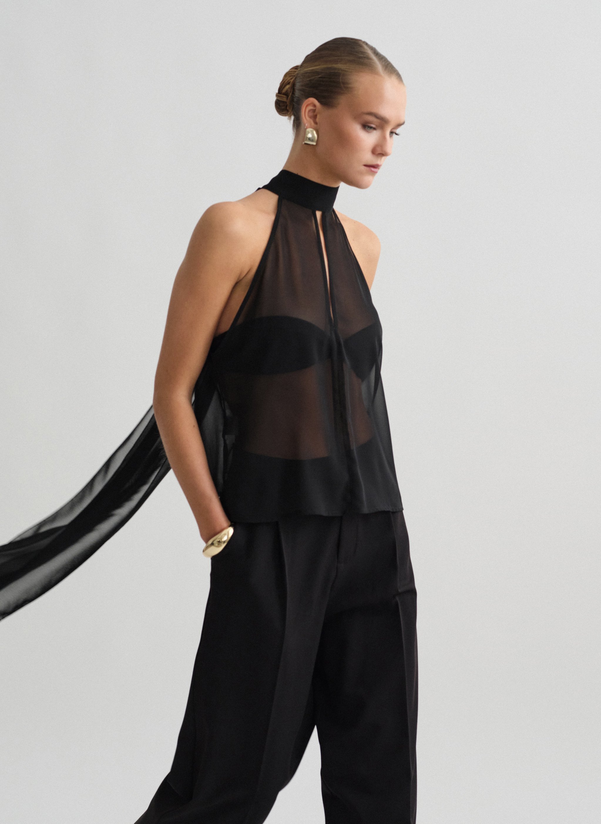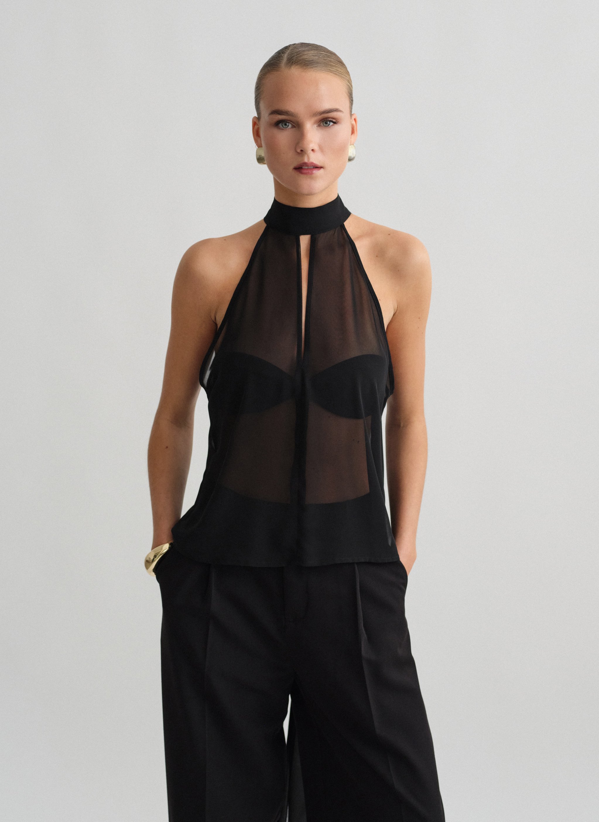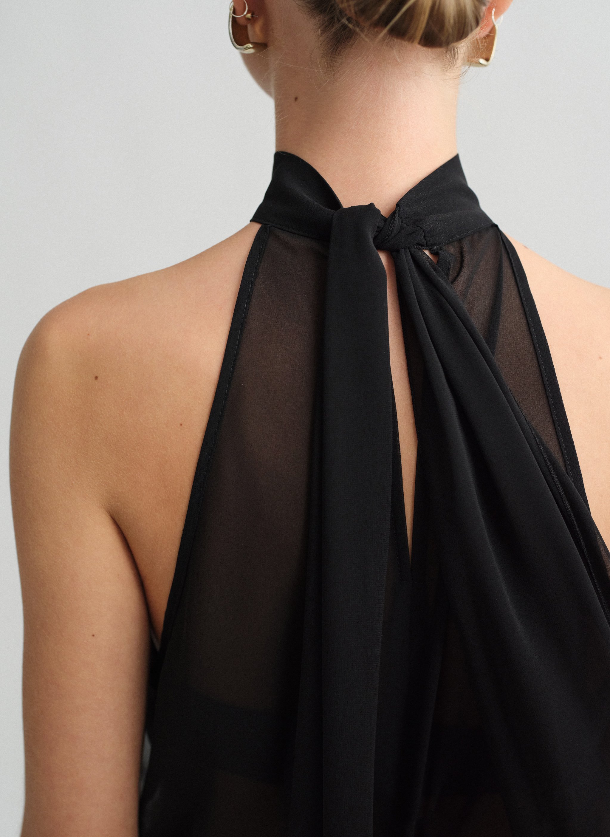 Αμάνικη ημιδιάφανη halter μπλούζα με δέσιμο στο λαιμό και άνοιγμα εμπρός.