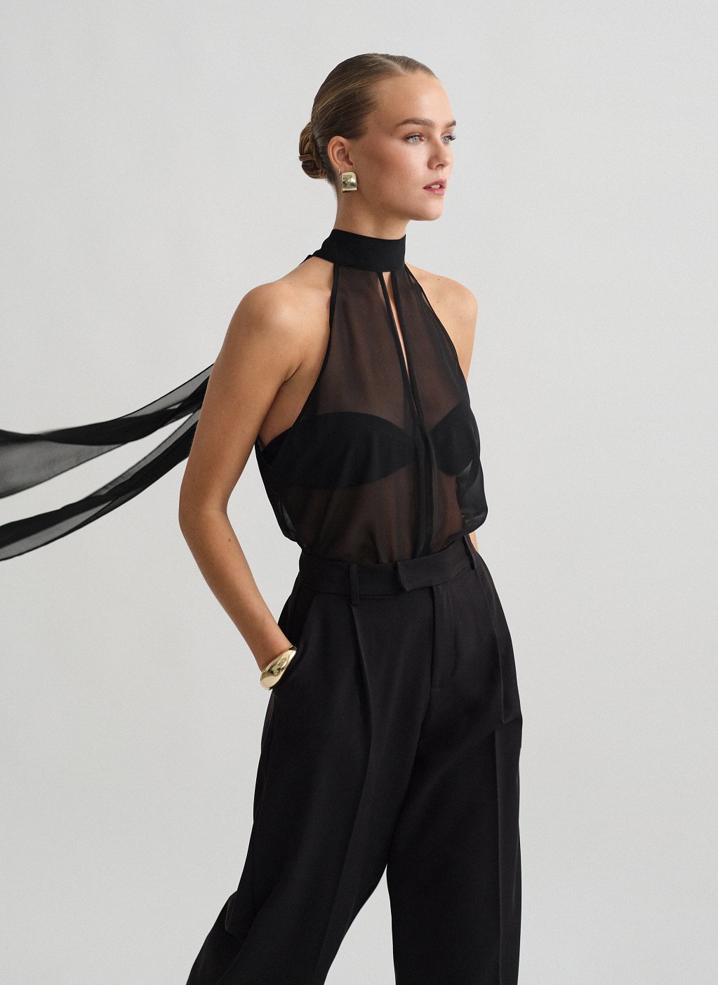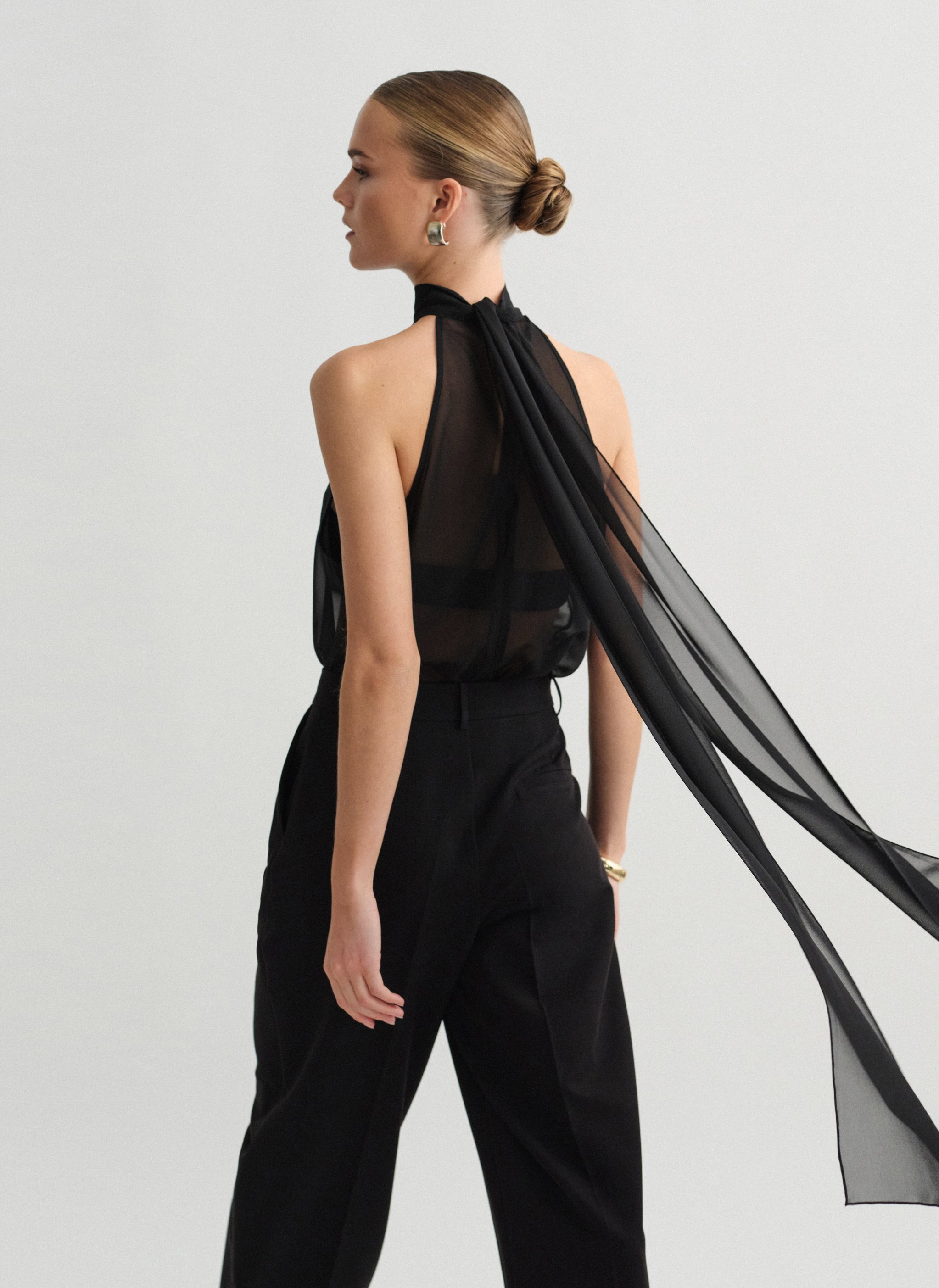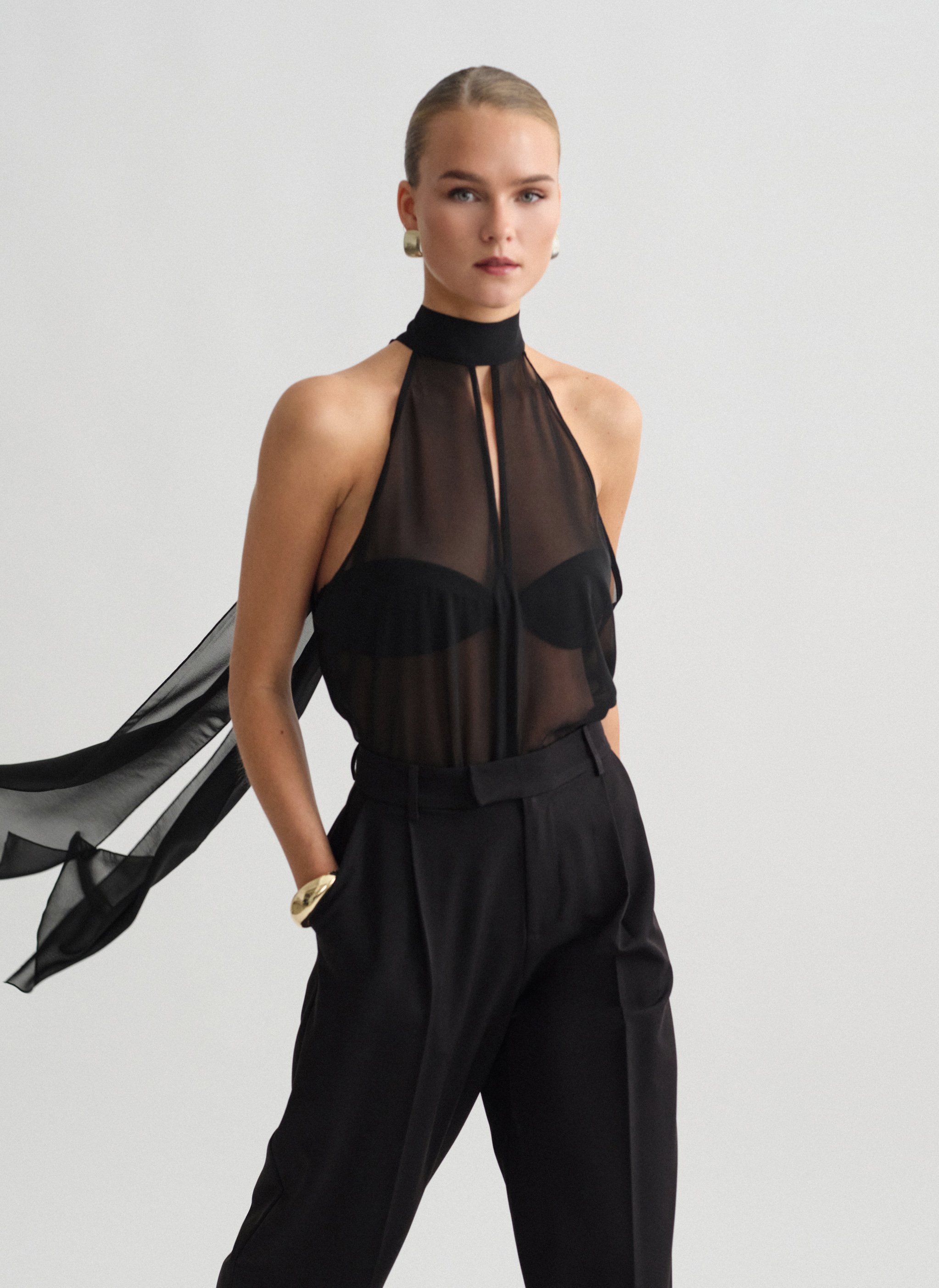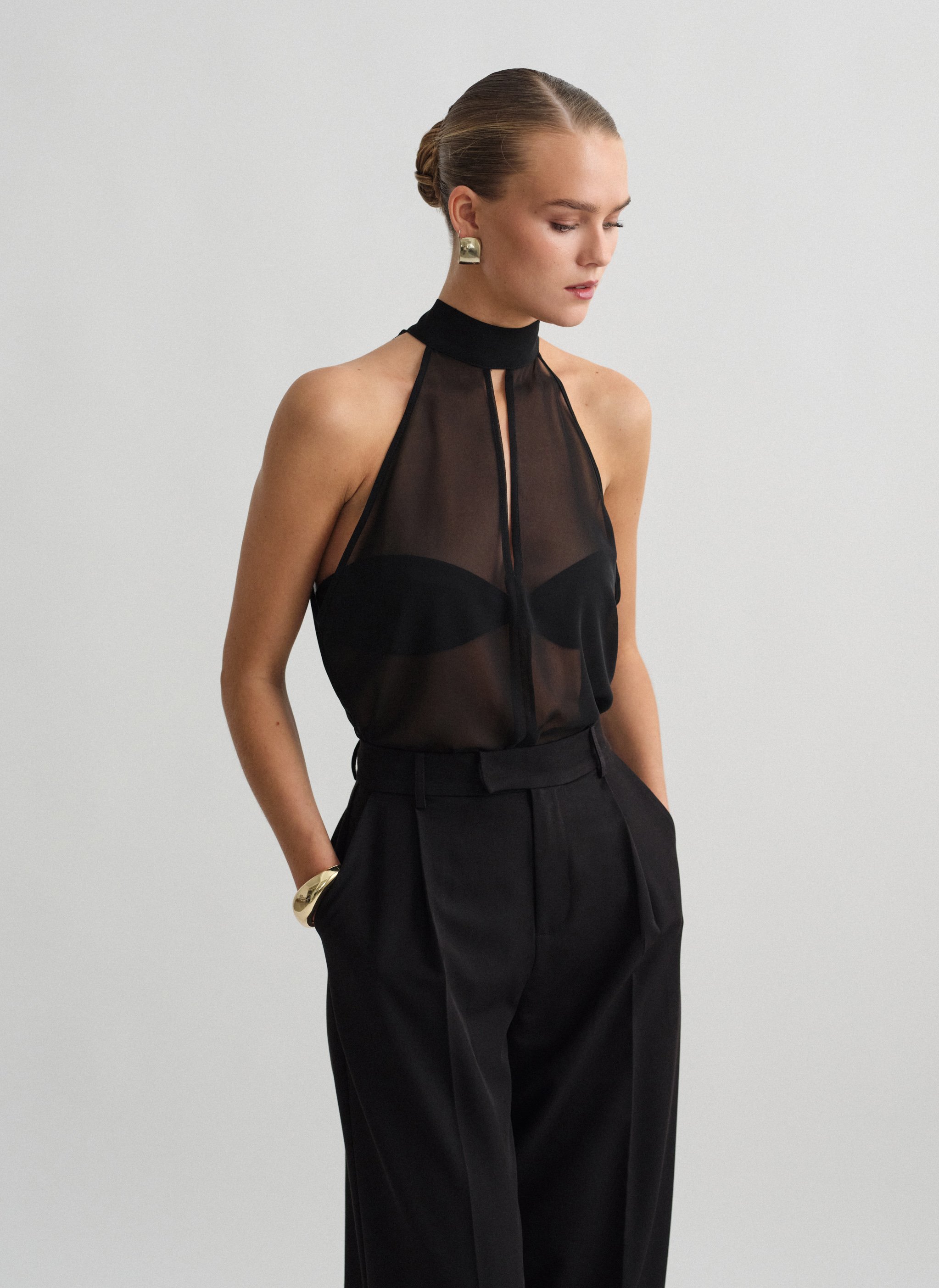 Αμάνικη ημιδιάφανη halter μπλούζα με δέσιμο στο λαιμό και άνοιγμα εμπρός.