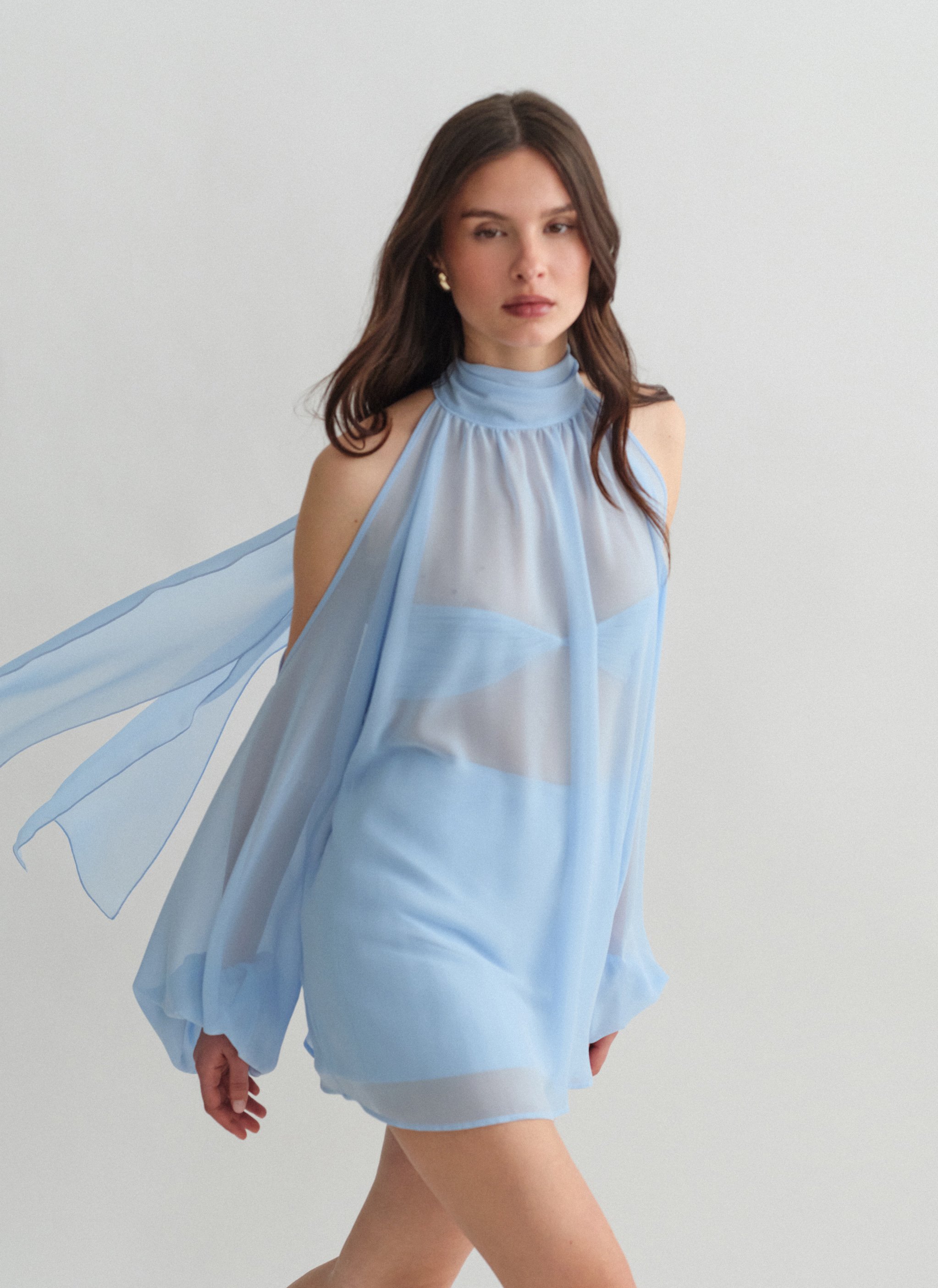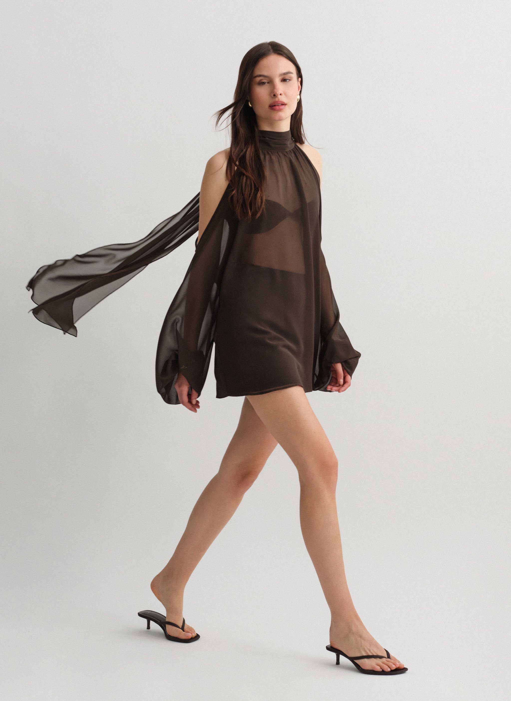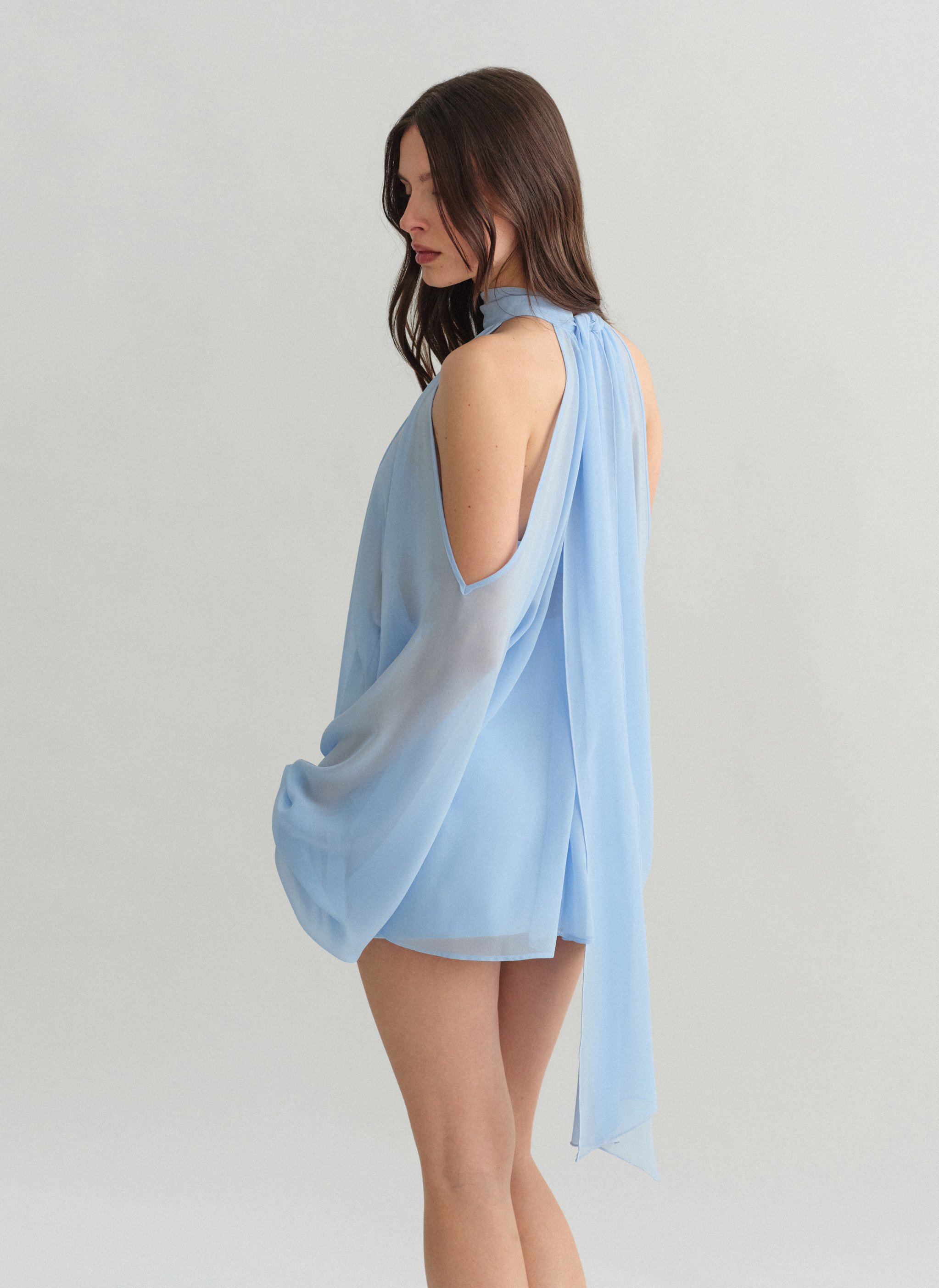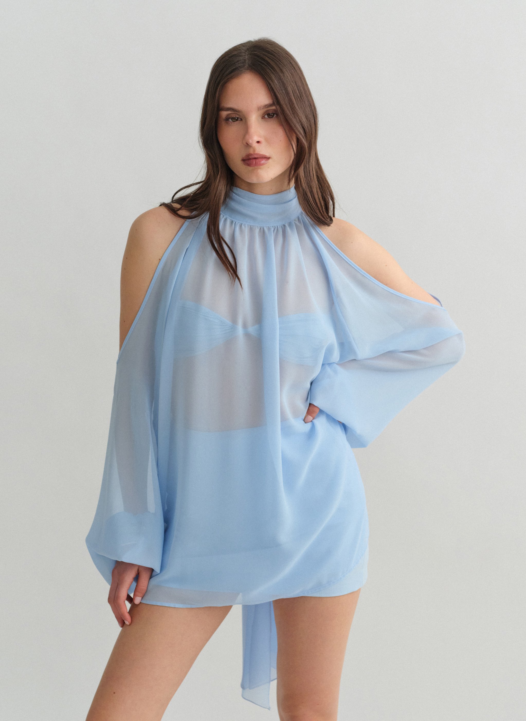 Μακρυμάνικο ημιδιάφανο cut-out μίνι φόρεμα με δέσιμο στον λαιμό.