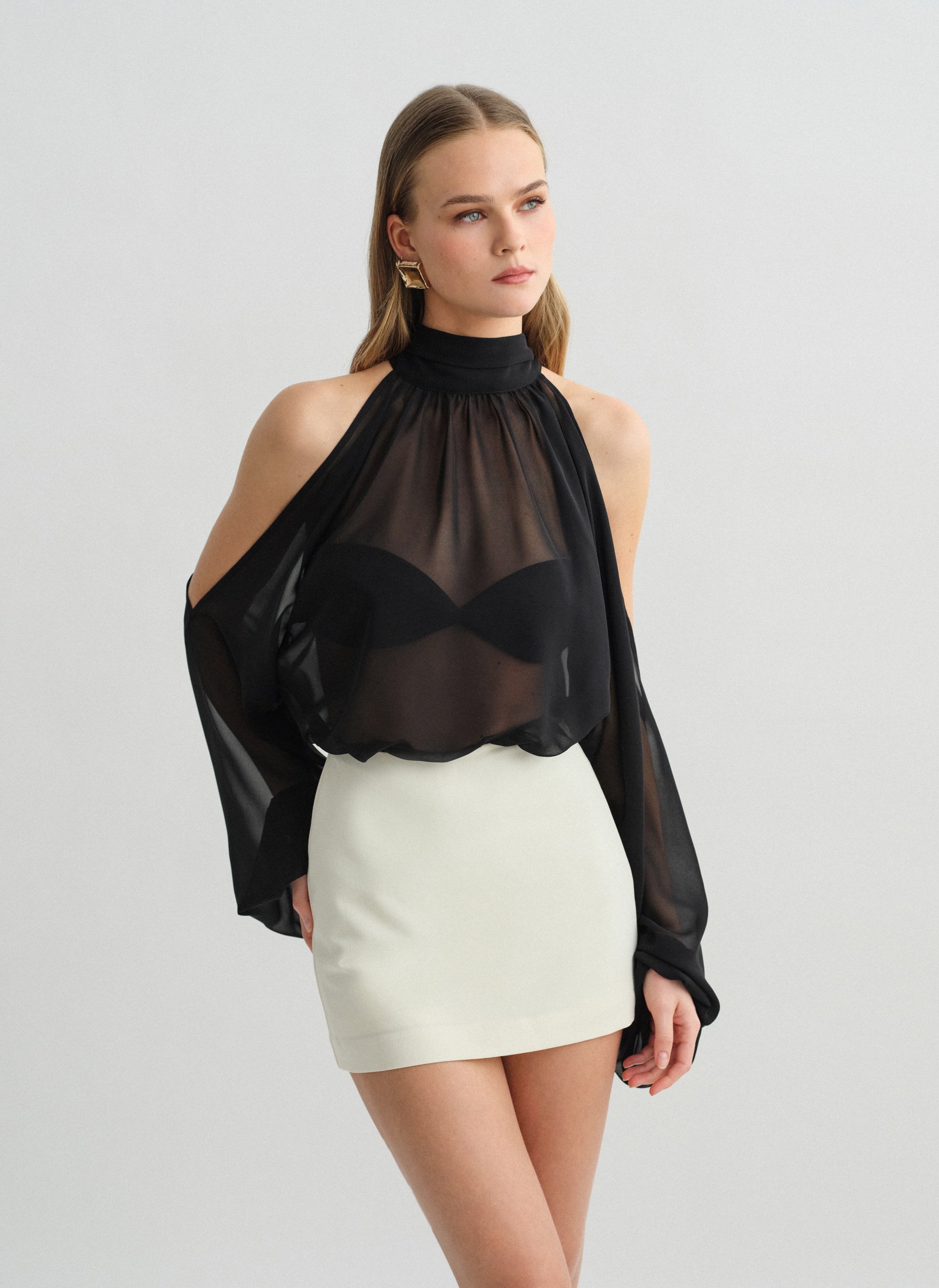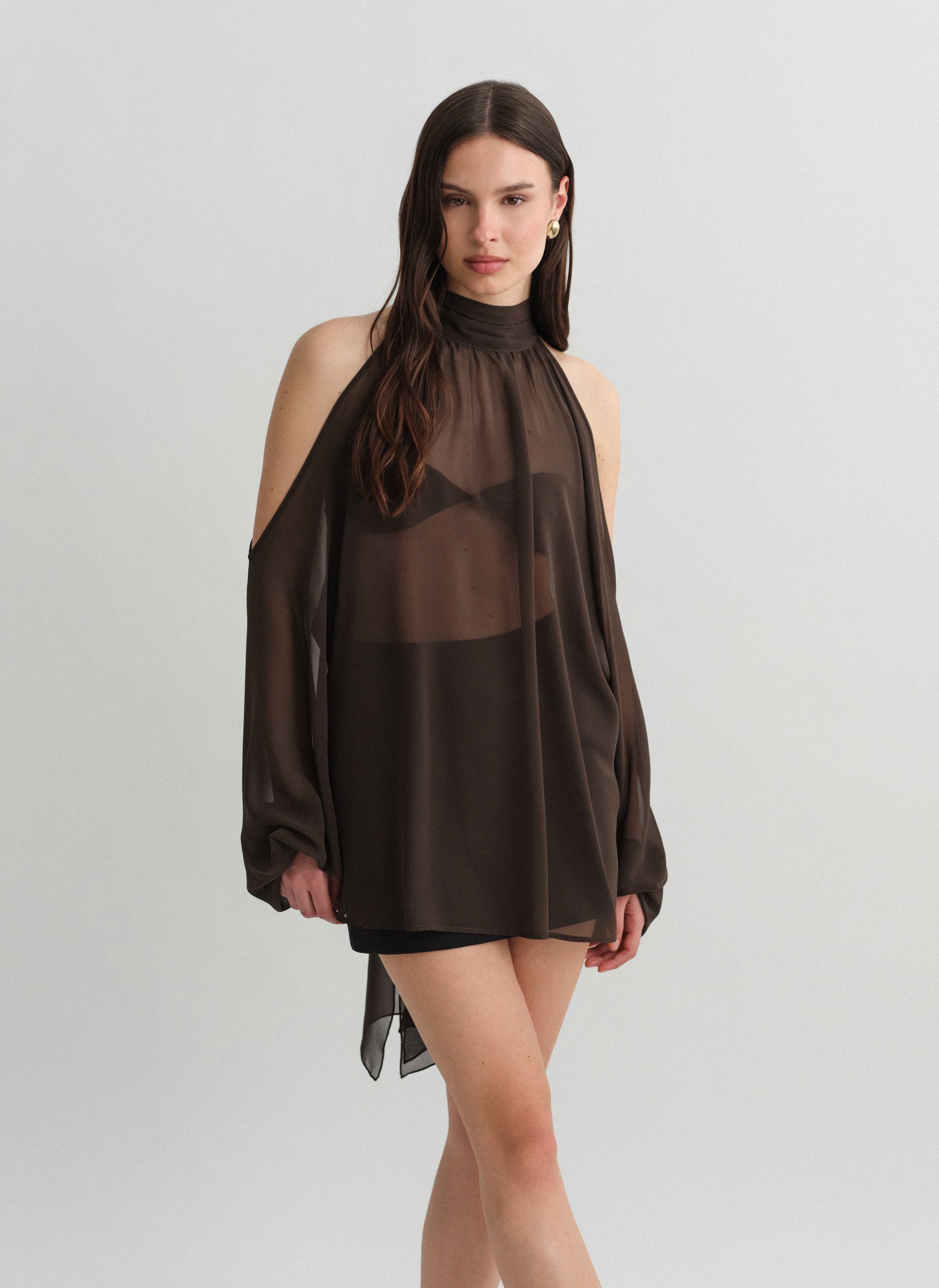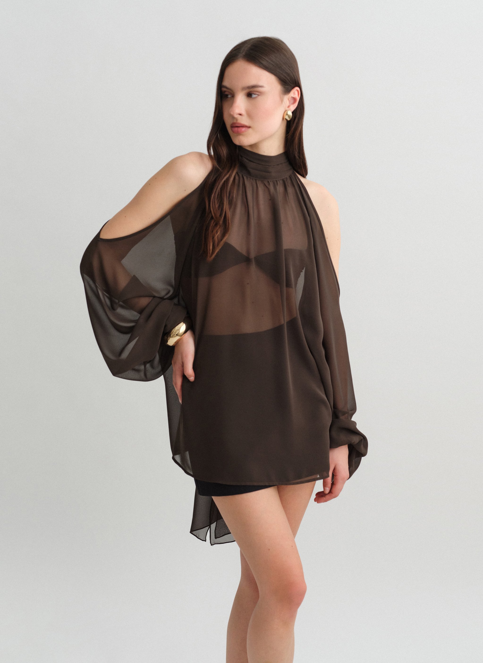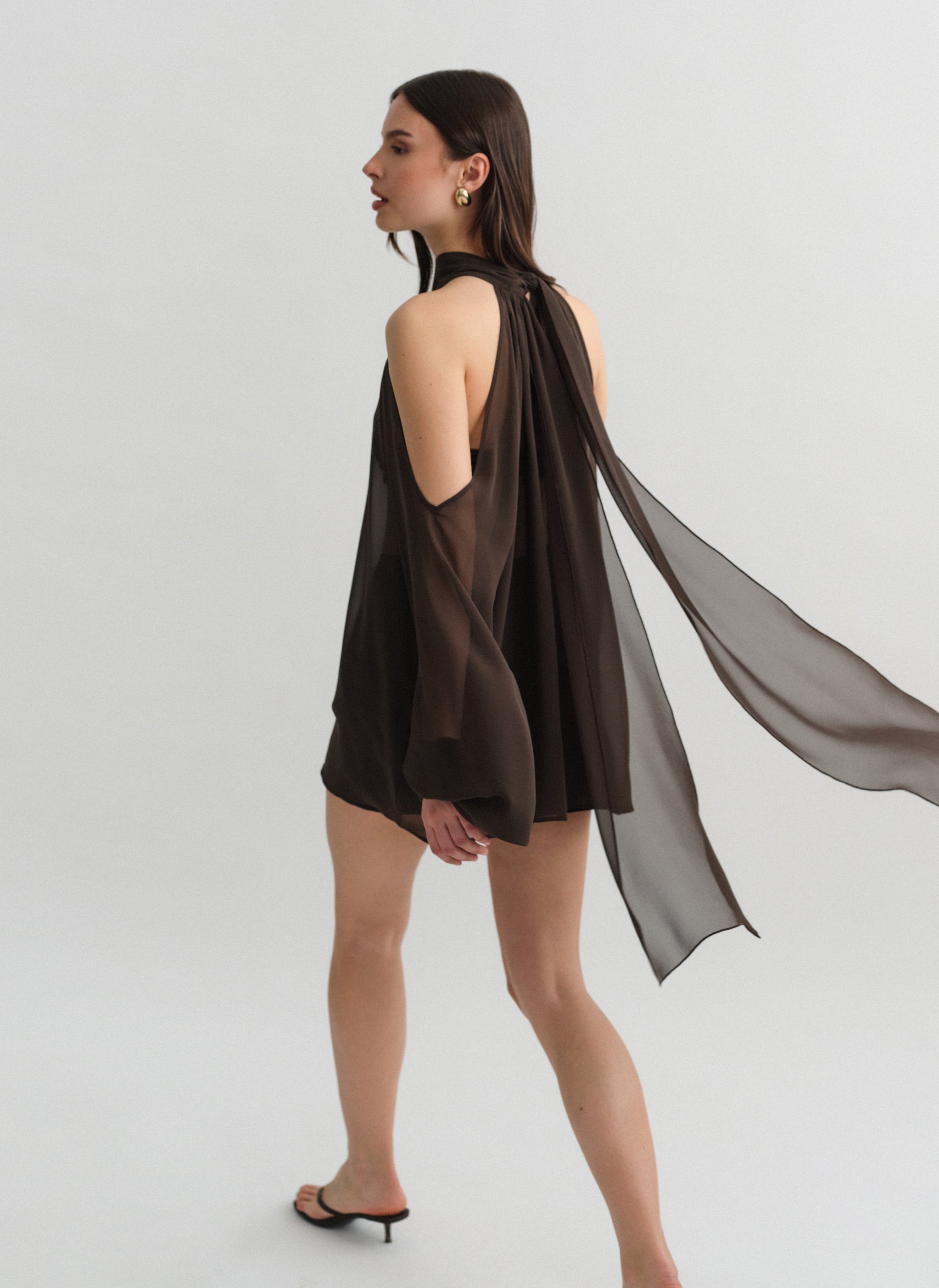Μακρυμάνικο ημιδιάφανο cut-out μίνι φόρεμα με δέσιμο στον λαιμό.