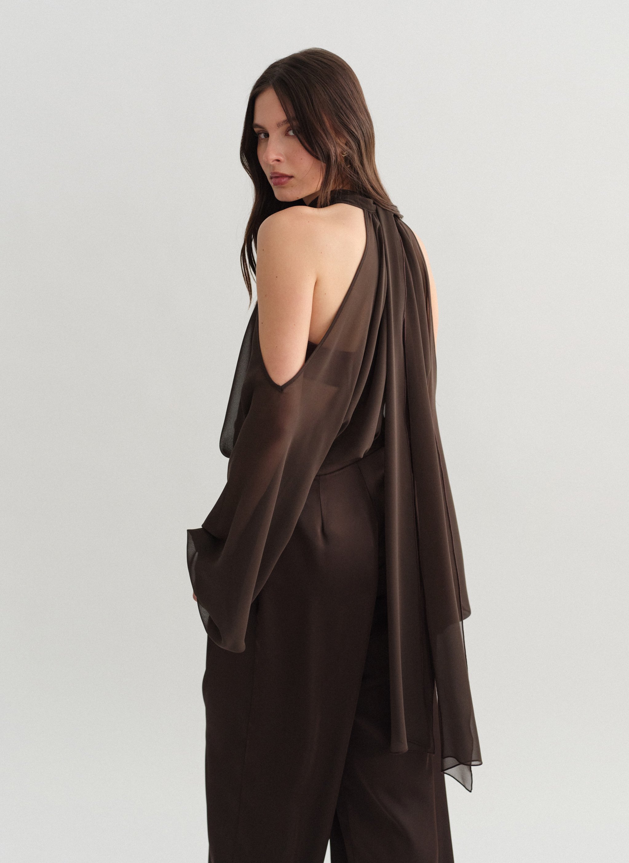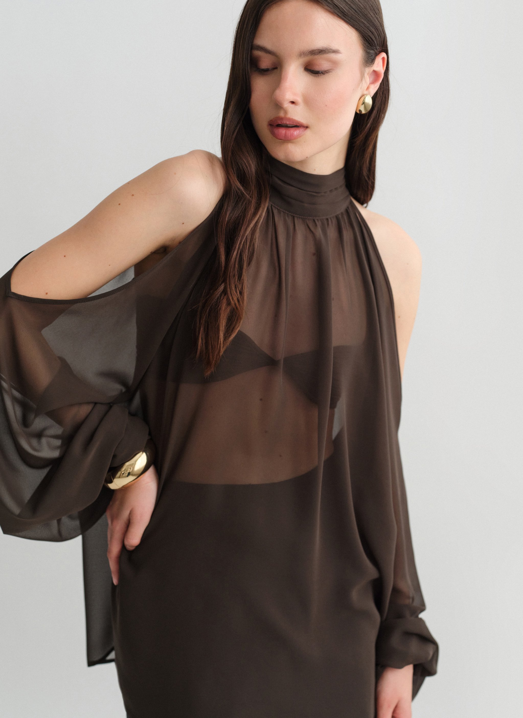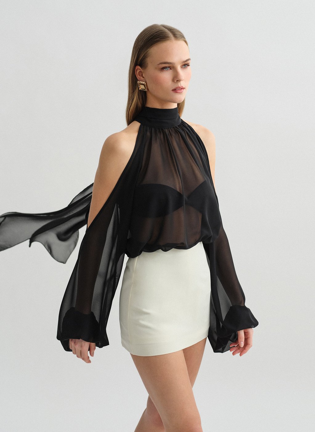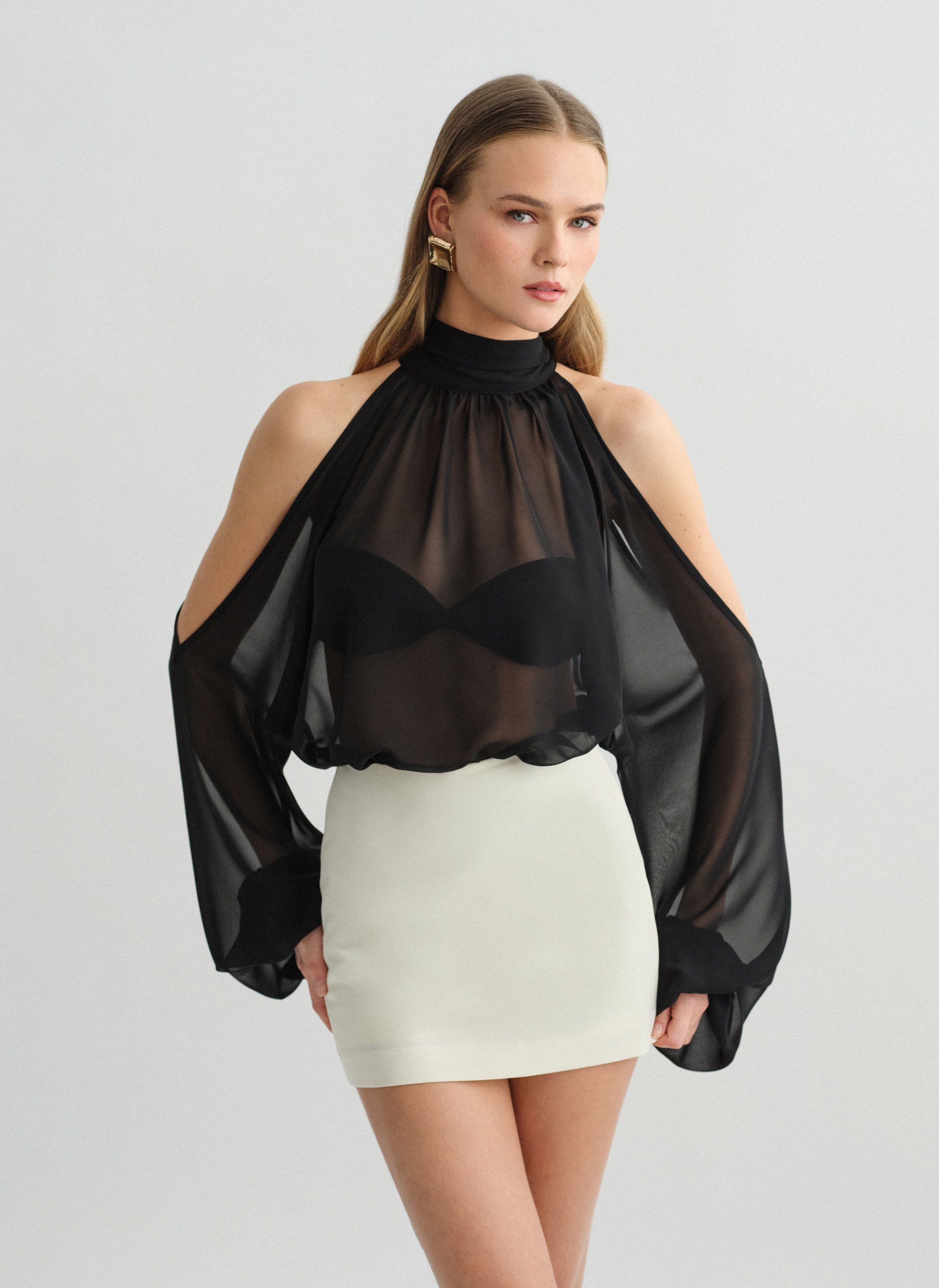 Μακρυμάνικο ημιδιάφανο cut-out μίνι φόρεμα με δέσιμο στον λαιμό.