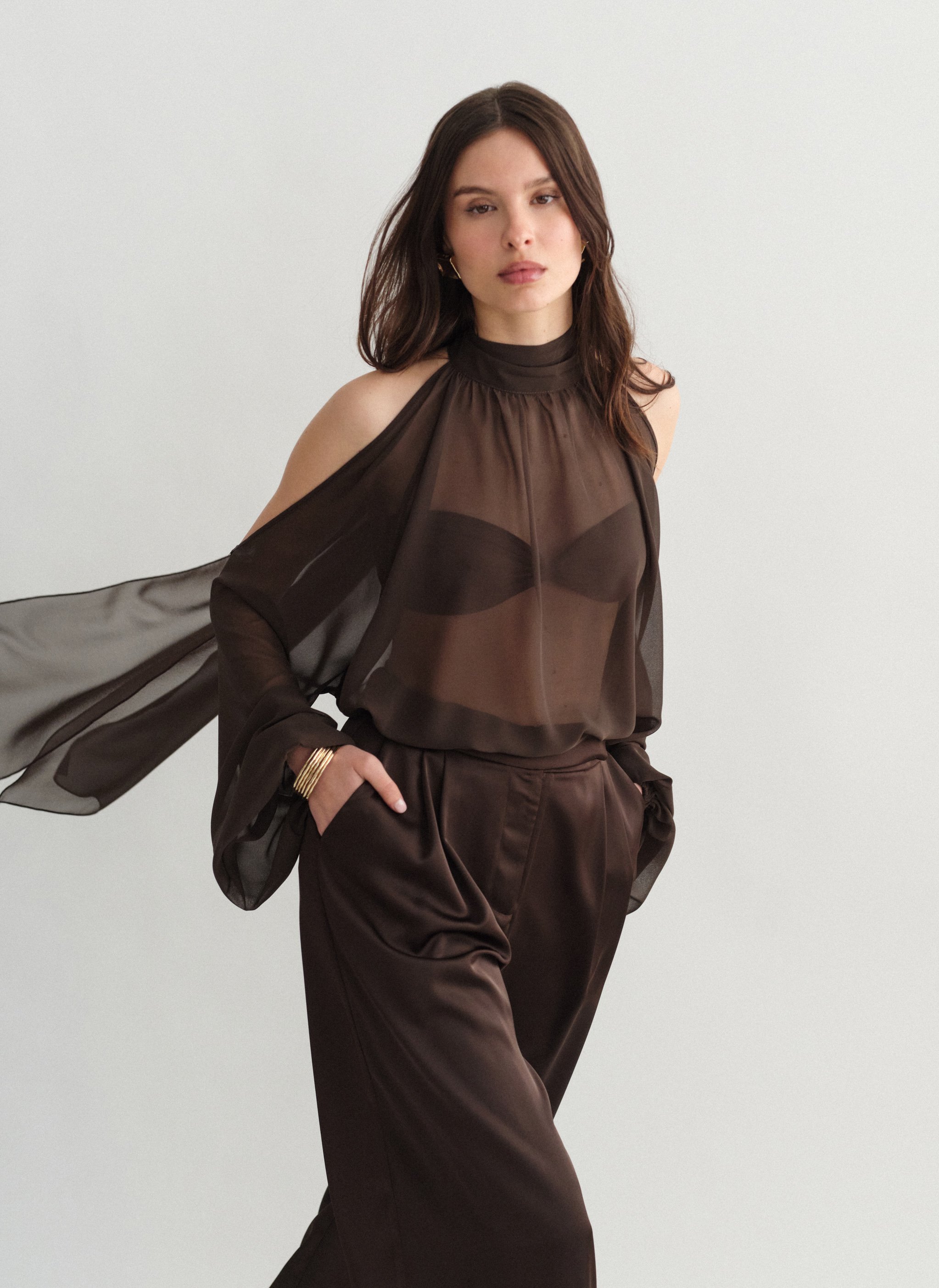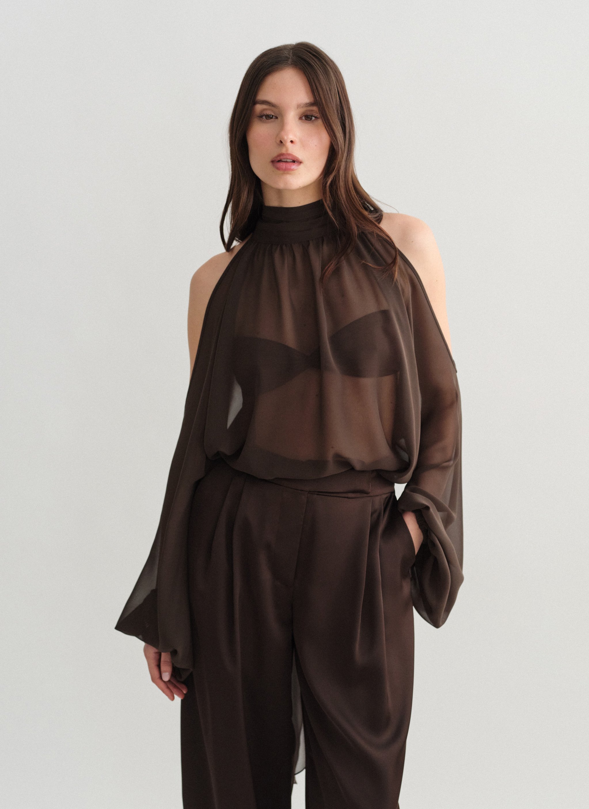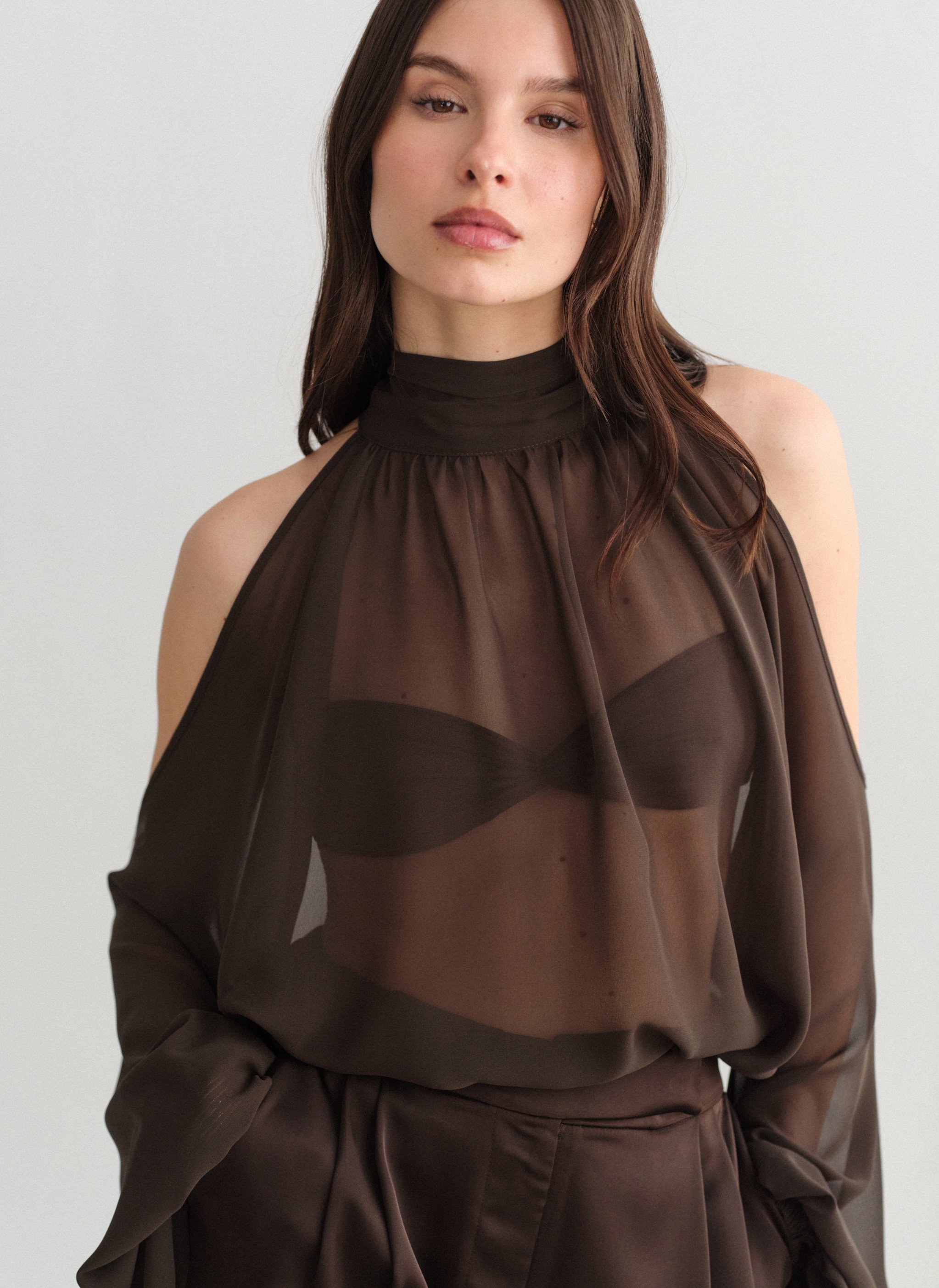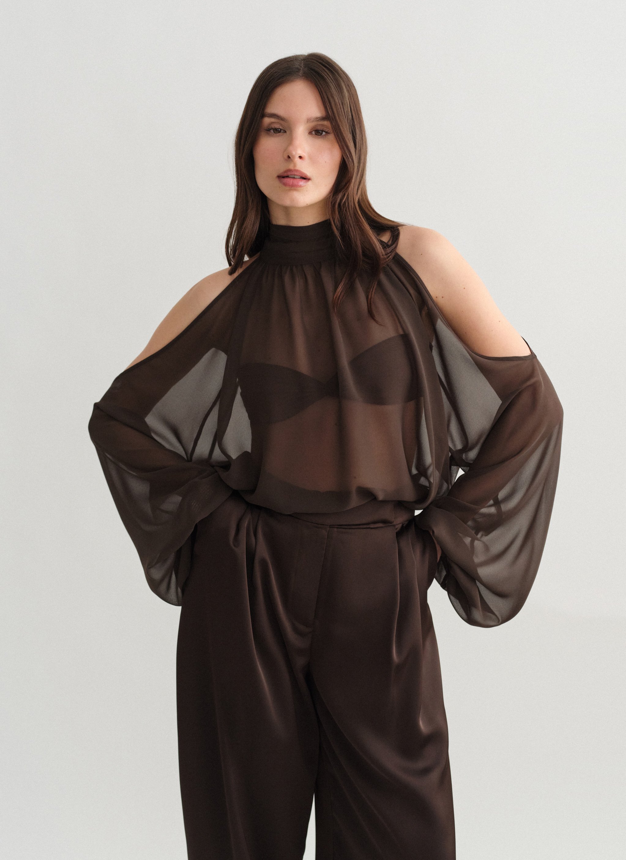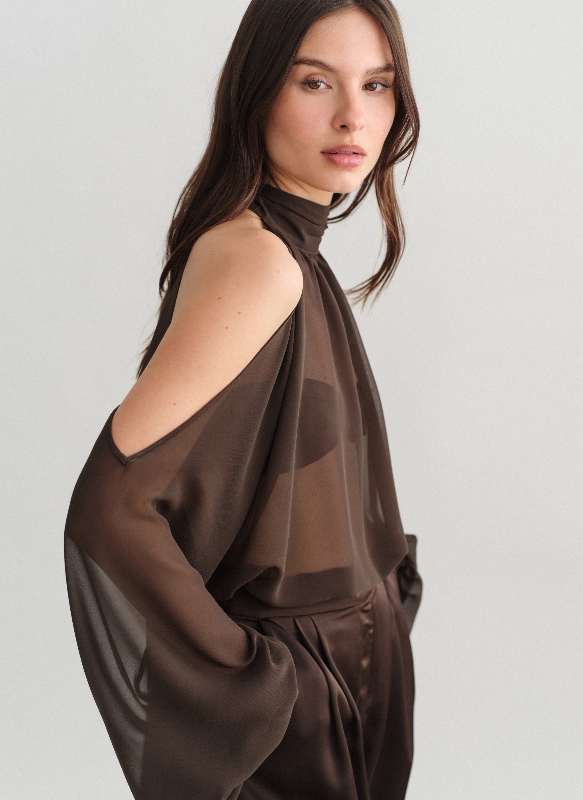 Tο προϊόν διαθέτει ελαφρώς άλφα γραμμή και ριχτή εφαρμογή, με ψηλό λαιμό με σούρες και φουσκωτά μανίκια με λάστιχο στο τελείωμα.