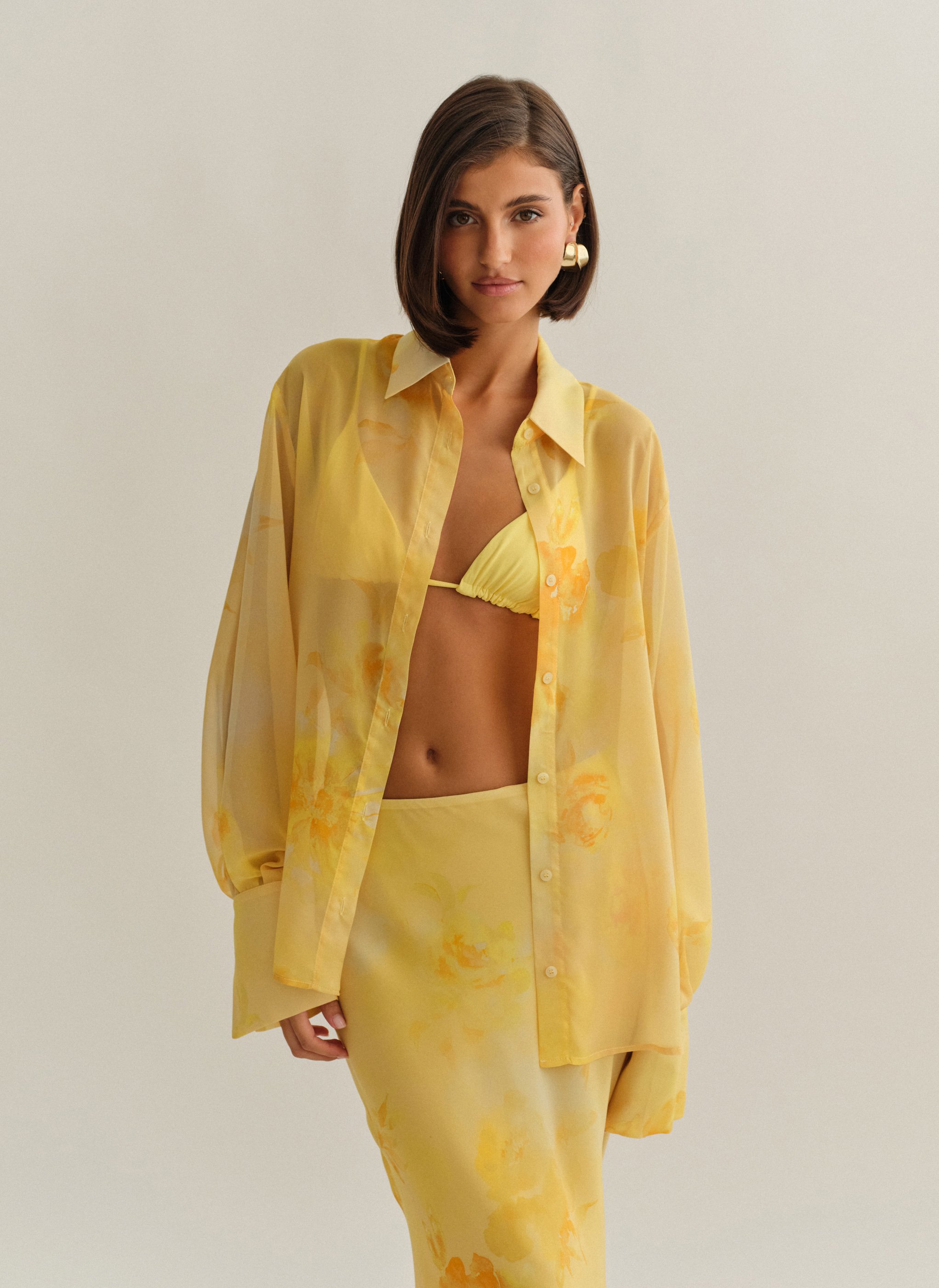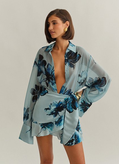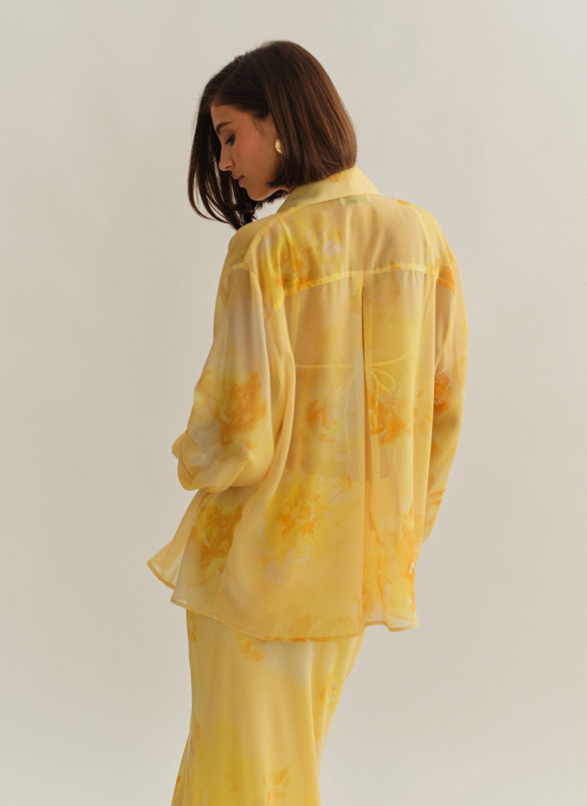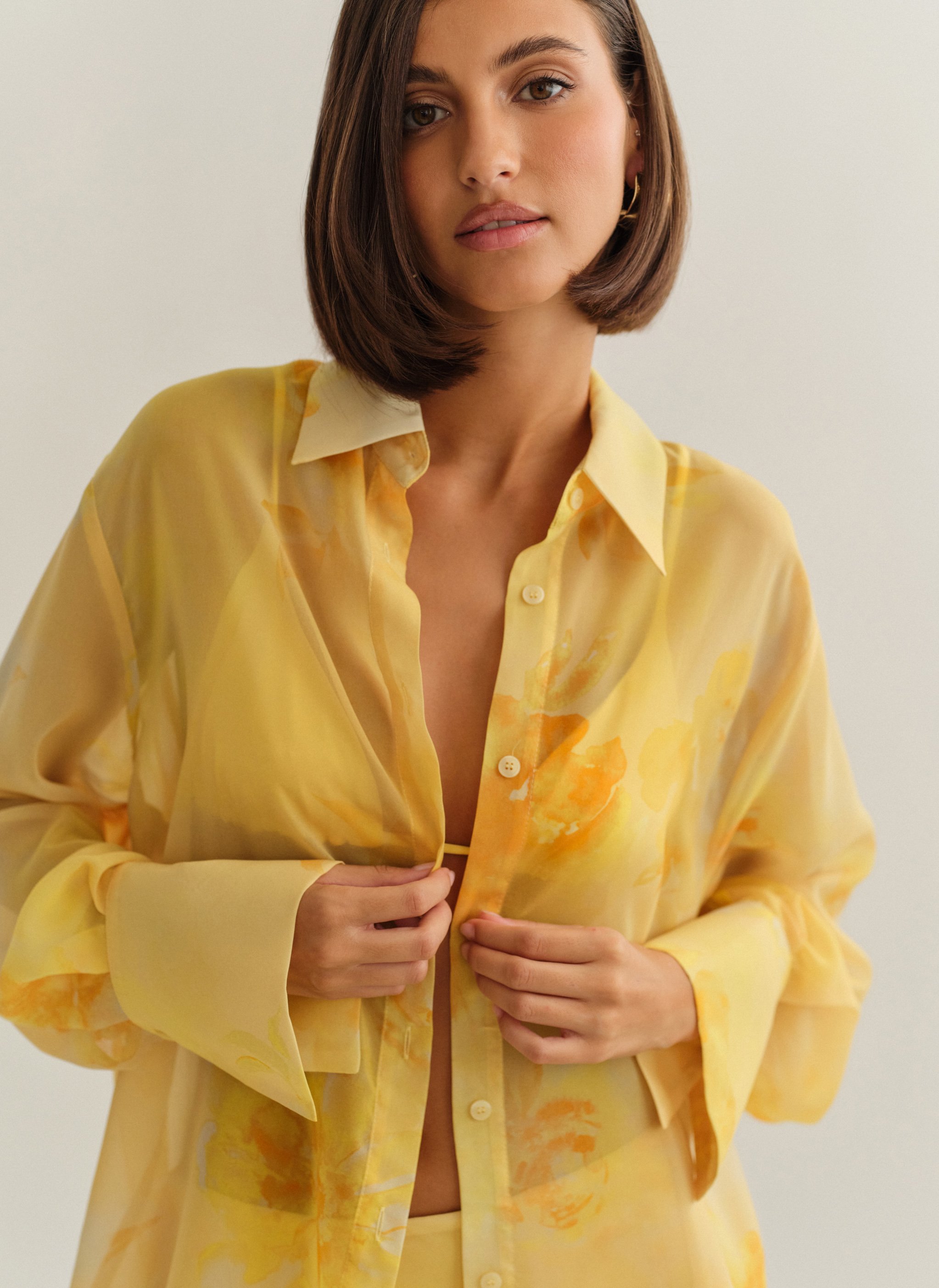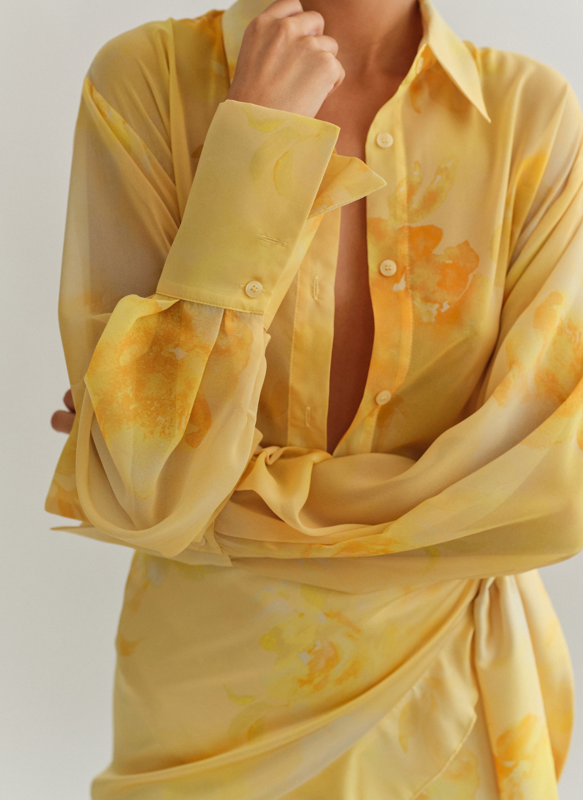 Oversized ημιδιάφανο εμπριμέ πουκάμισο με φαρδιά μανσέτα.