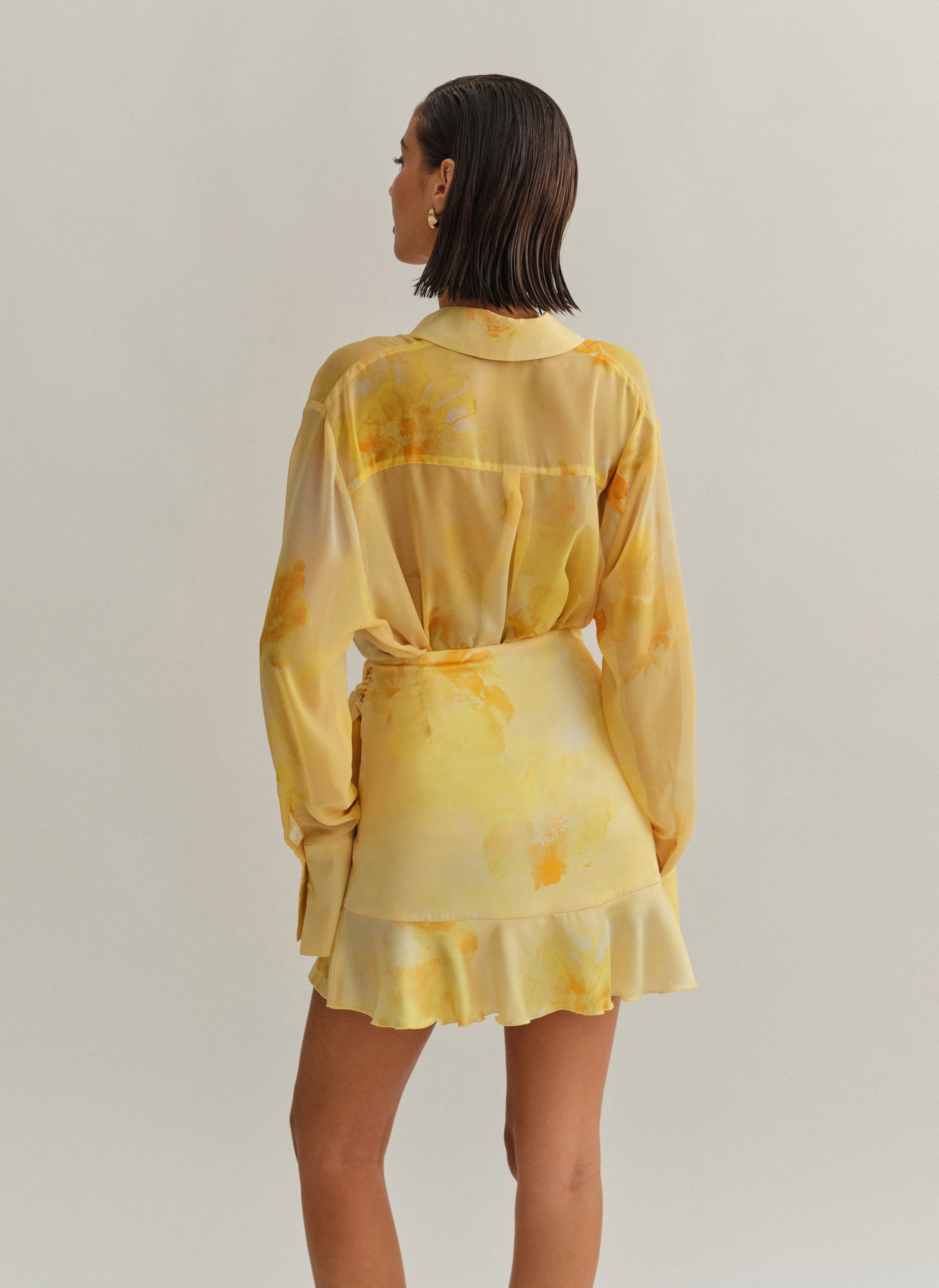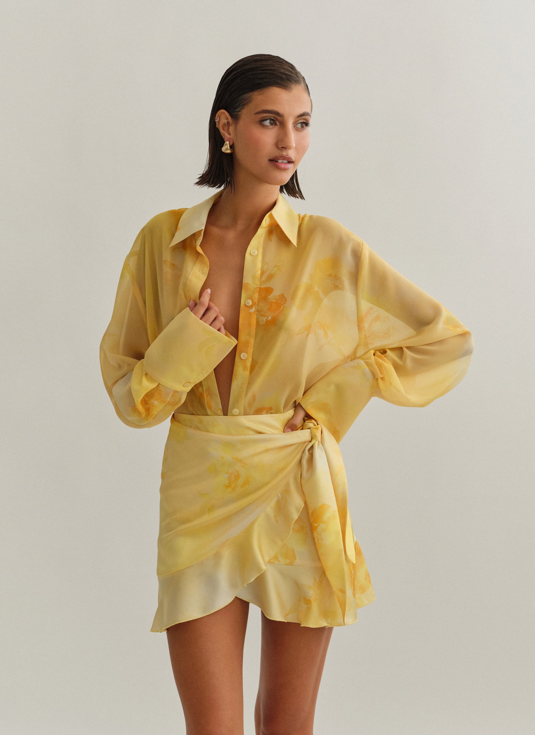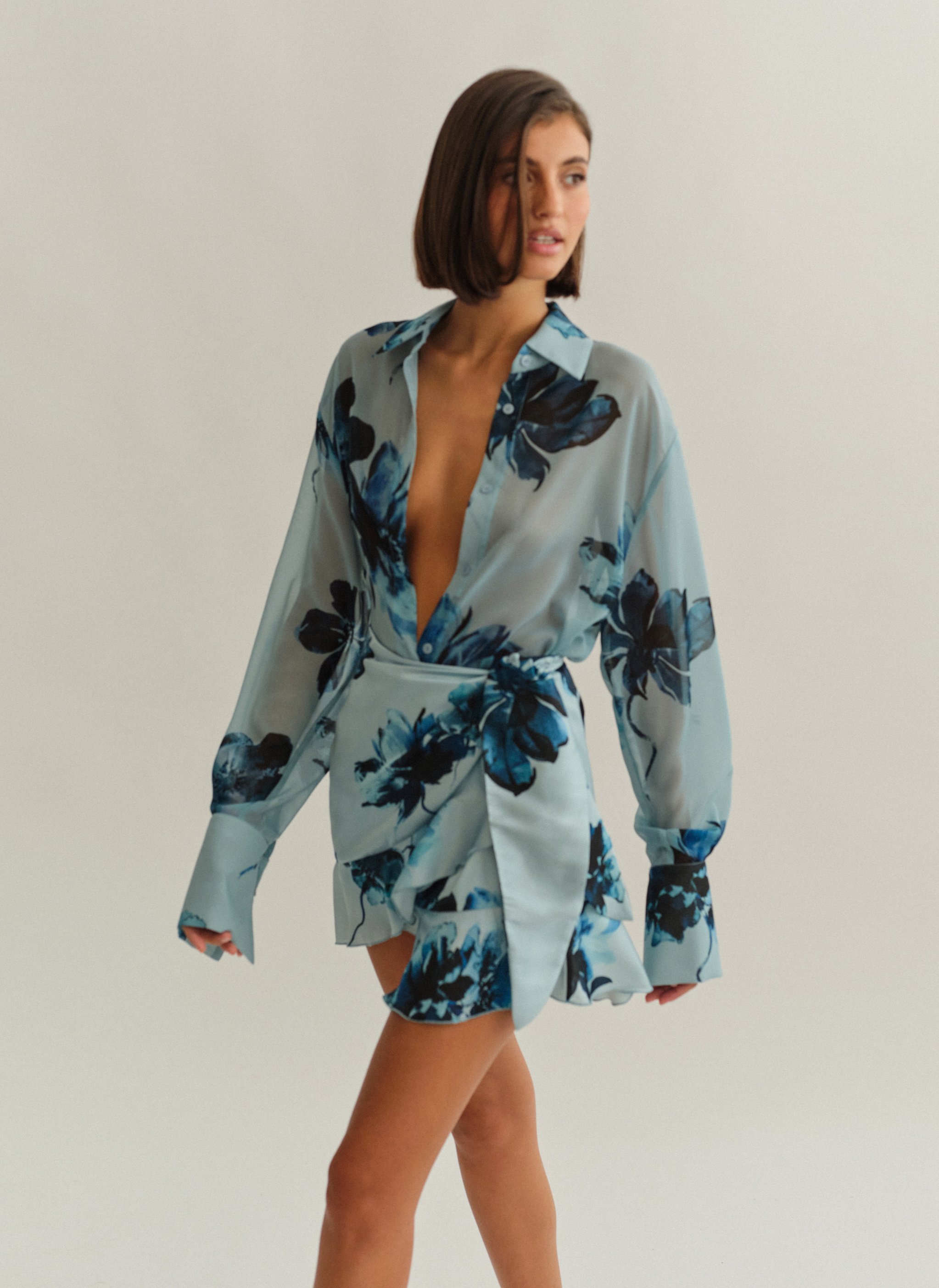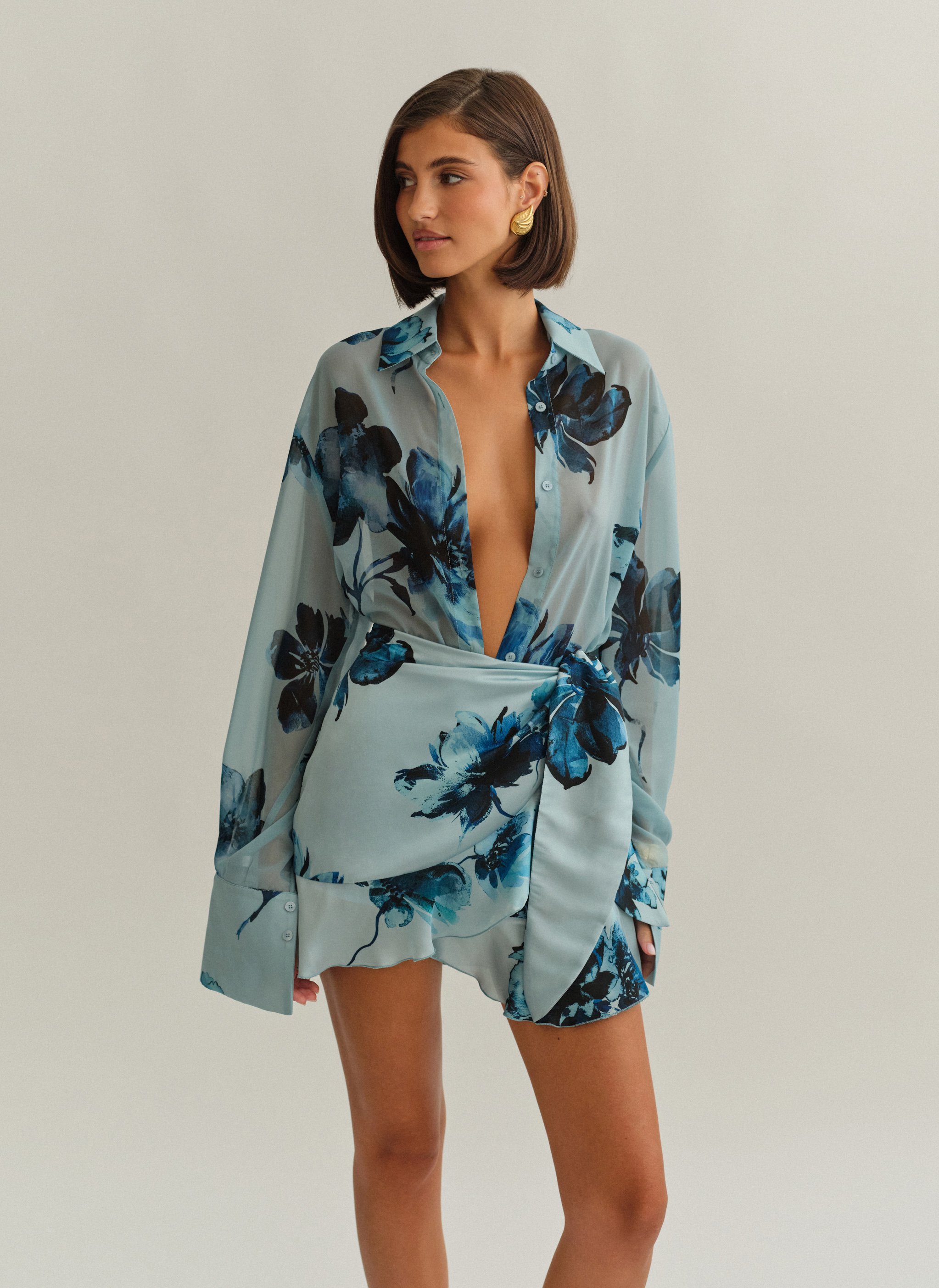 Oversized ημιδιάφανο εμπριμέ πουκάμισο με φαρδιά μανσέτα.